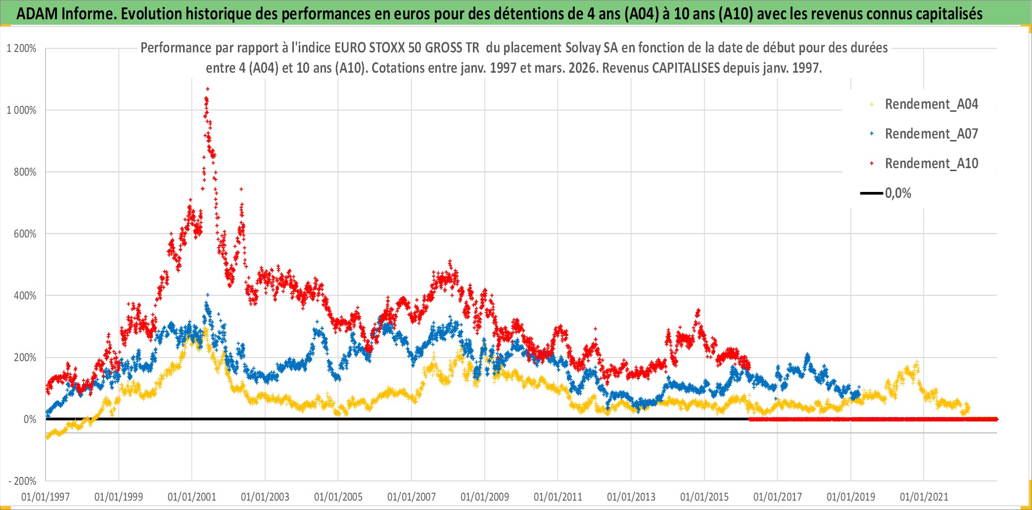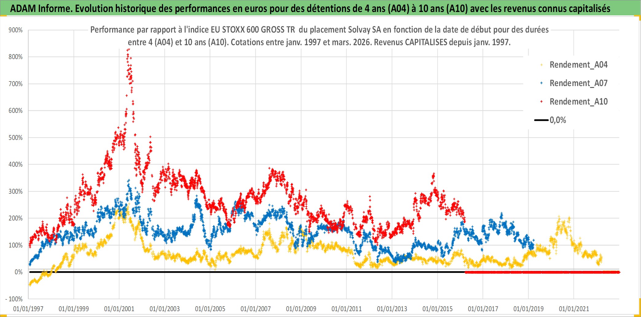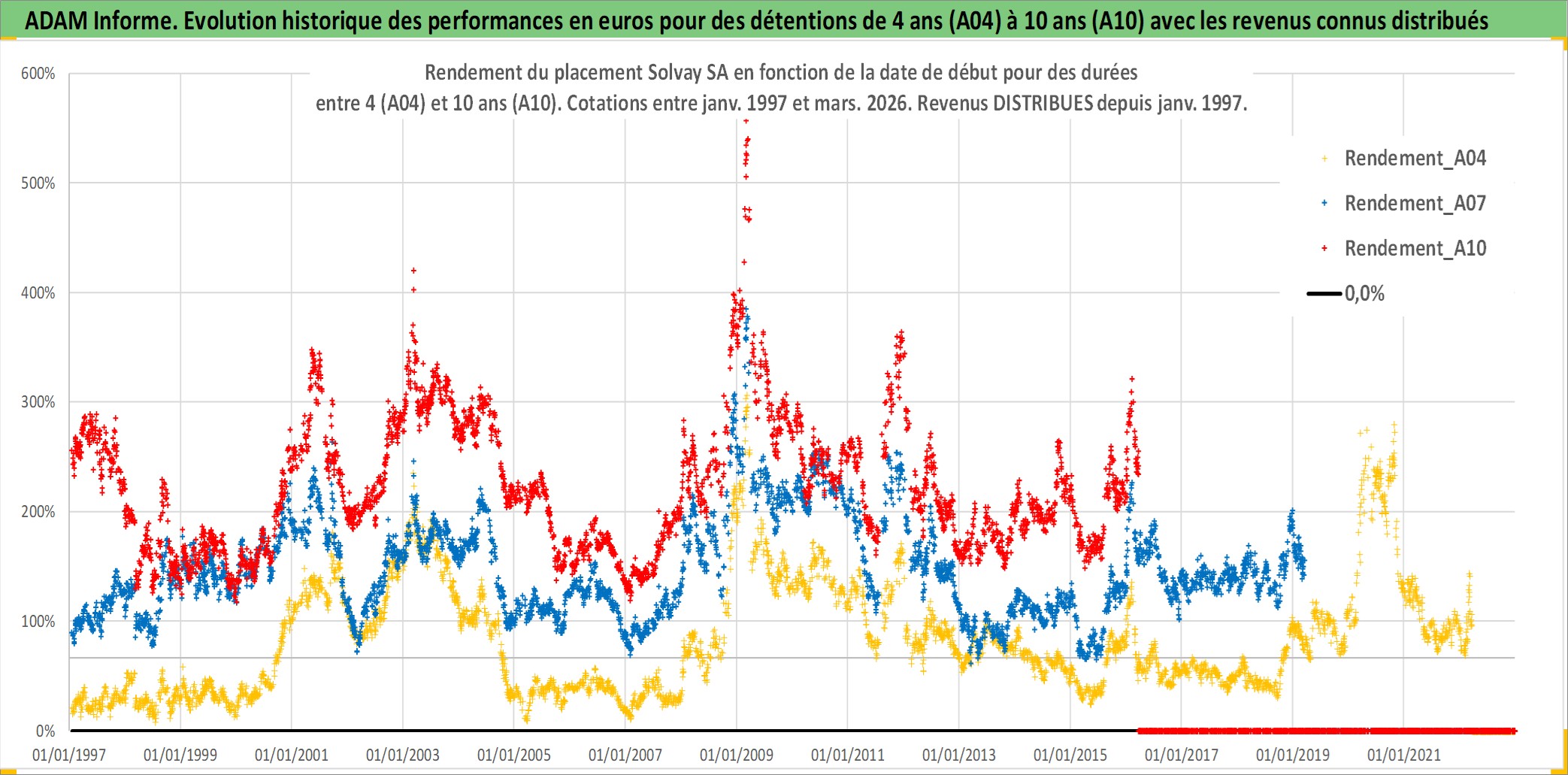 Site dédié aux investisseursPage dédiée sur site financeAnalyse des valorisations hebdomadaires de l'action Solvay SA. Cet actif est cote en EUR. Les valorisations couvrent les semaines 1997W01 a 2026W13. Les revenus de cet actif financier sont pris en compte depuis la semaine 1997W04. La note globale ESG de cet actif est estimee a 8.0 (apres rebasage entre 0 et 20).