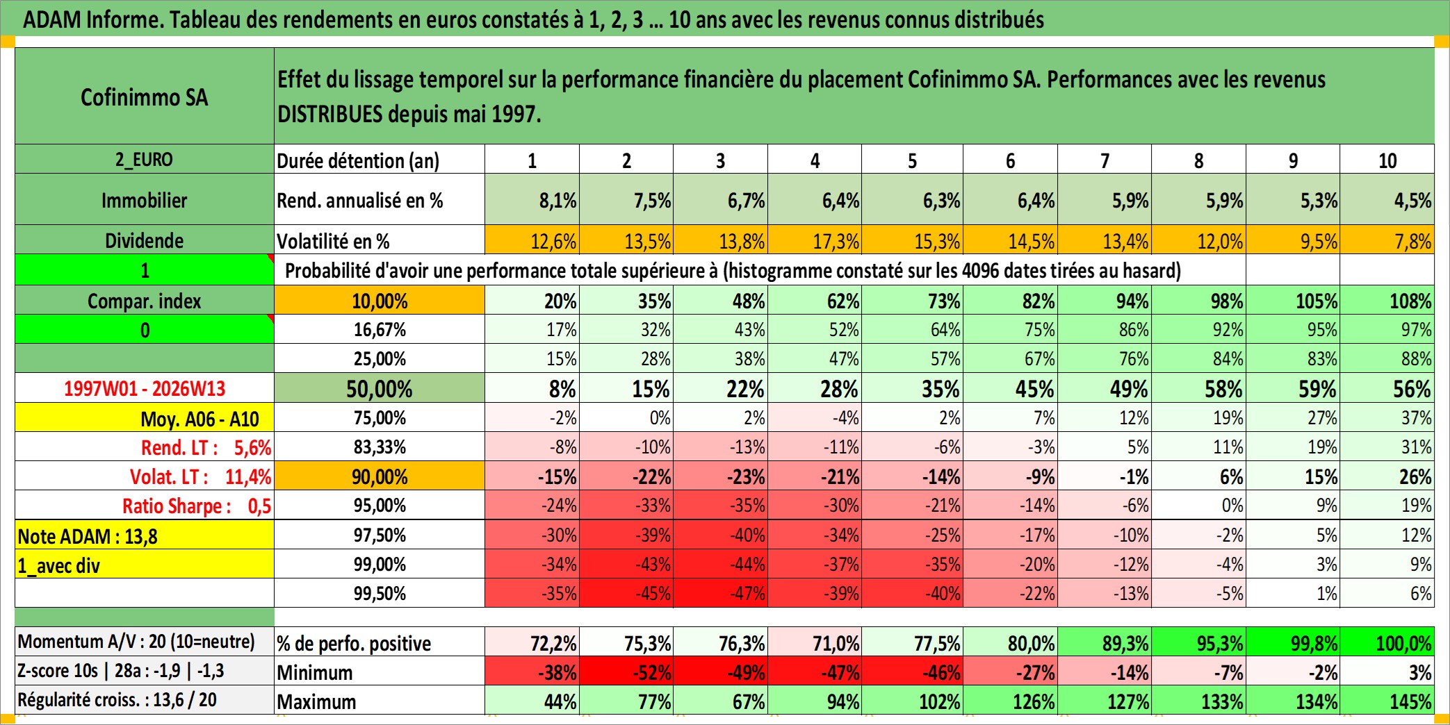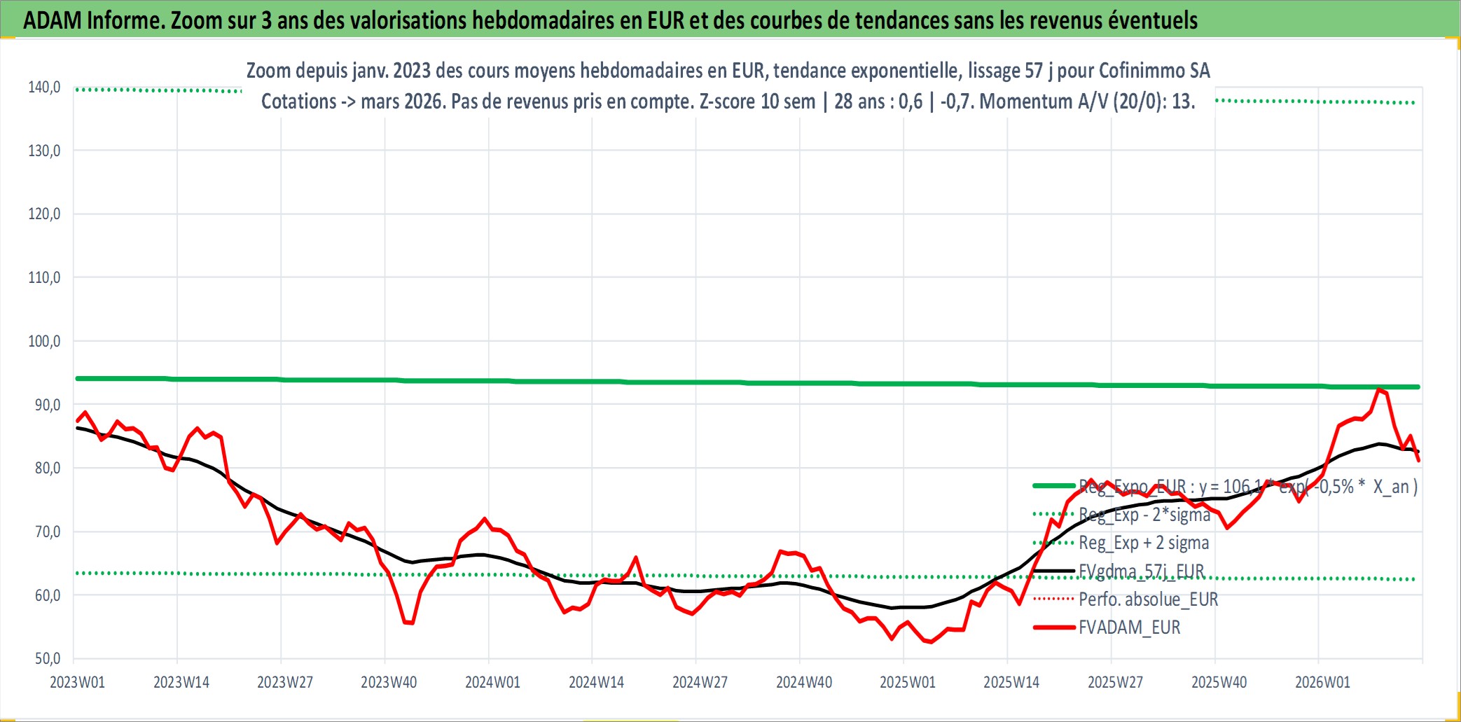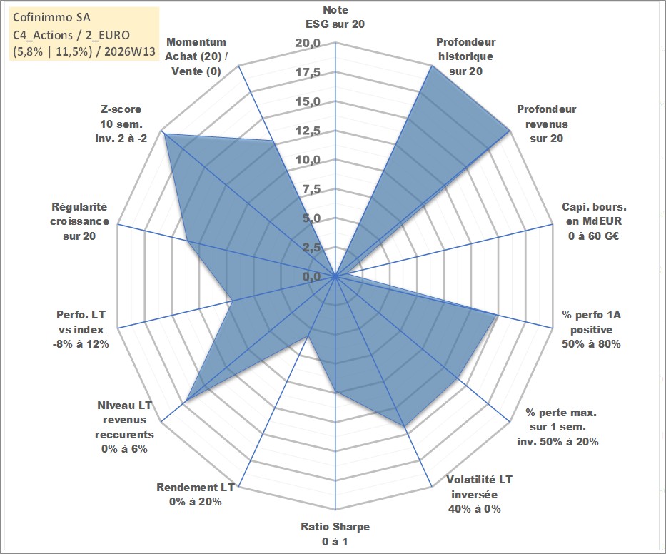 Site dédié aux investisseursPage dédiée sur site financeAnalyse des valorisations hebdomadaires de l'action Cofinimmo SA. Cet actif est cote en EUR. Les valorisations couvrent les semaines 1997W01 a 2026W13. Les revenus de cet actif financier sont pris en compte depuis la semaine 1997W19. La note ESG de cet actif n'est pas connue.
