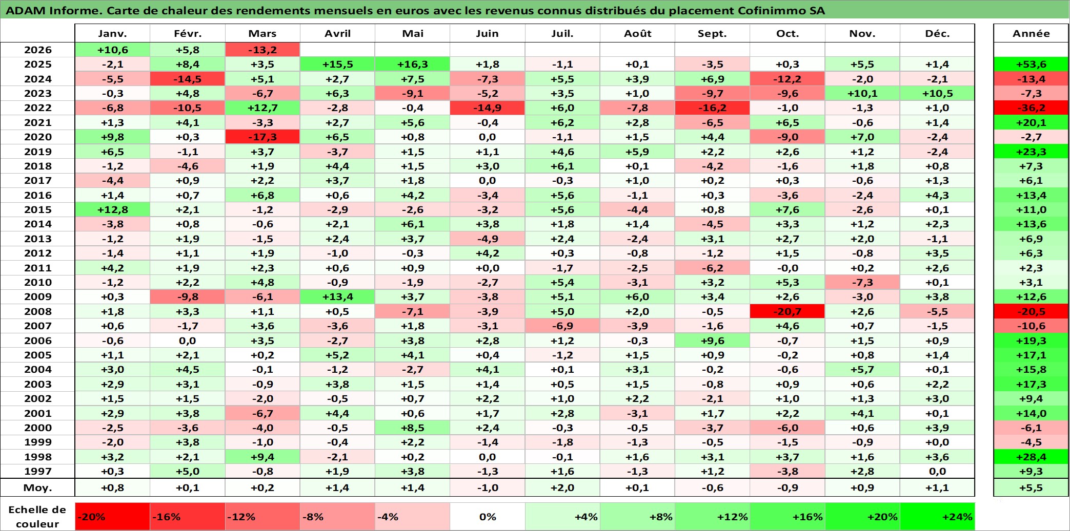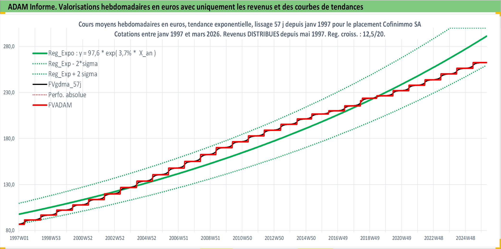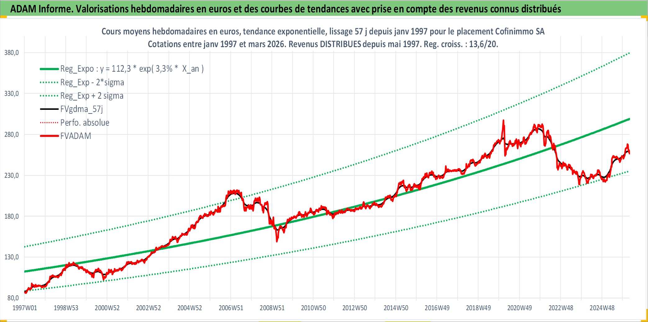 Site dédié aux investisseursPage dédiée sur site financeAnalyse des valorisations hebdomadaires de l'action Cofinimmo SA. Cet actif est cote en EUR. Les valorisations couvrent les semaines 1997W01 a 2026W13. Les revenus de cet actif financier sont pris en compte depuis la semaine 1997W19. La note ESG de cet actif n'est pas connue.