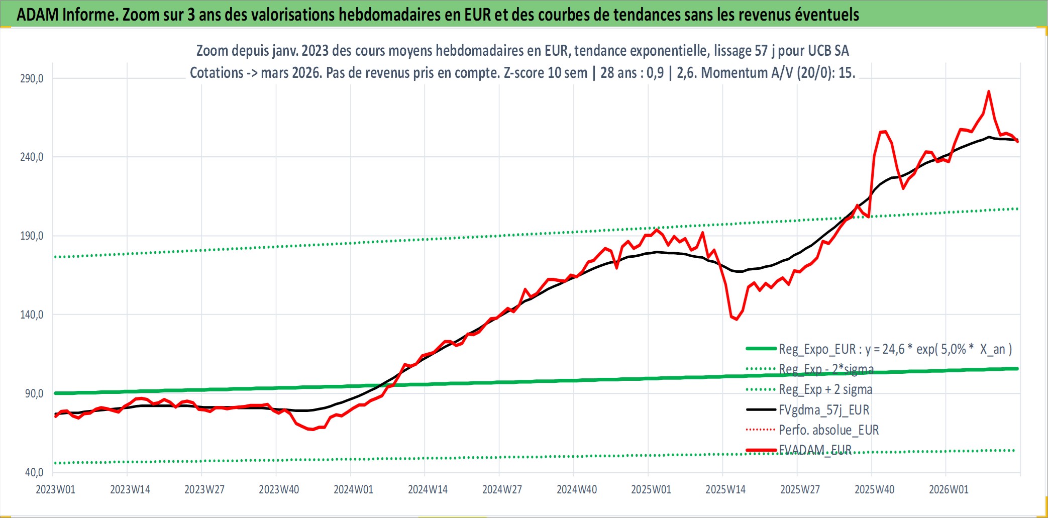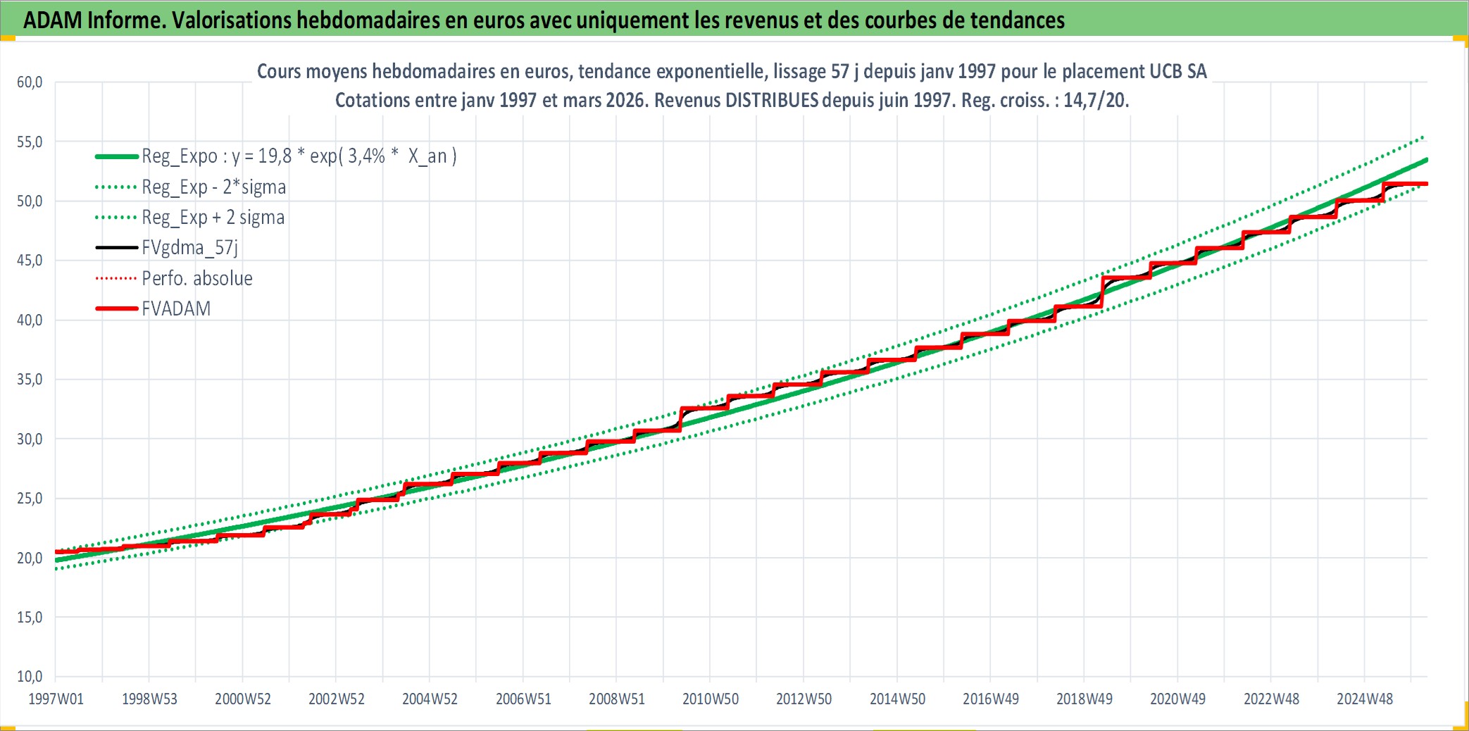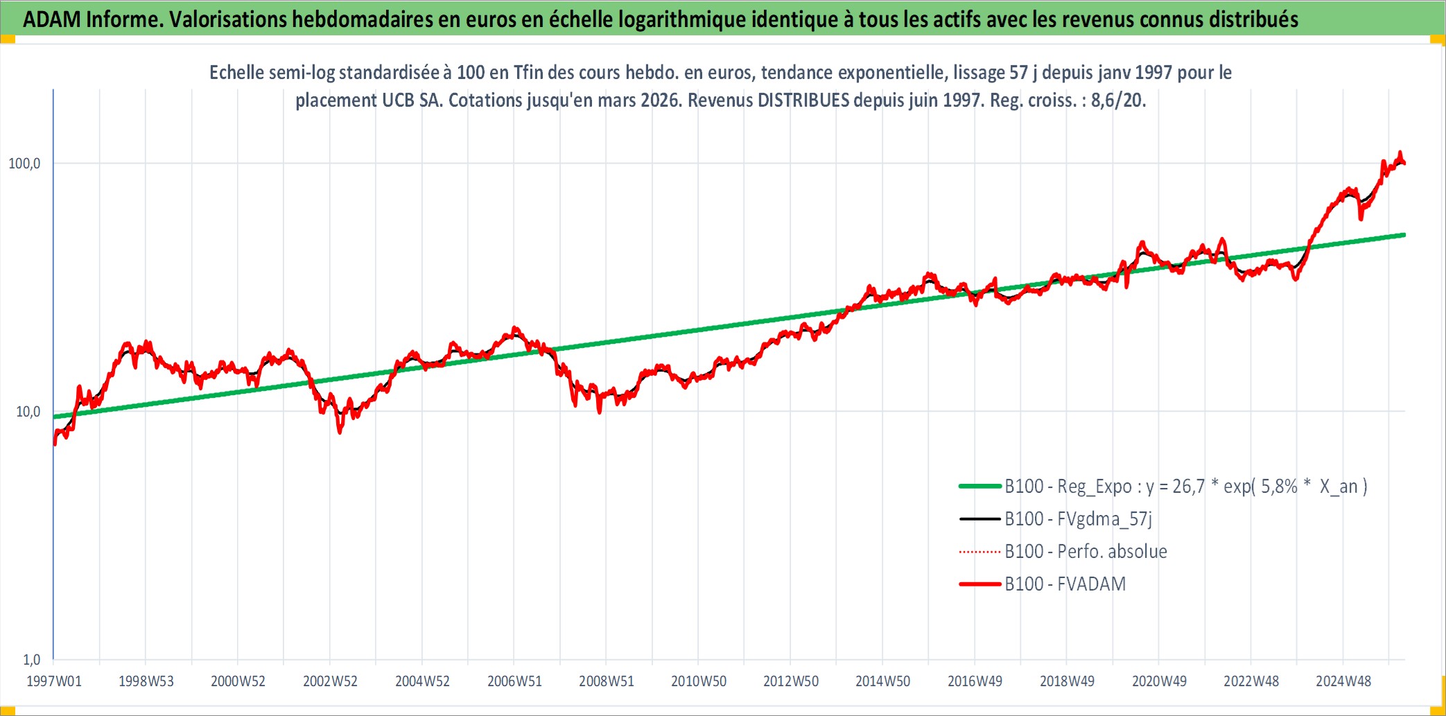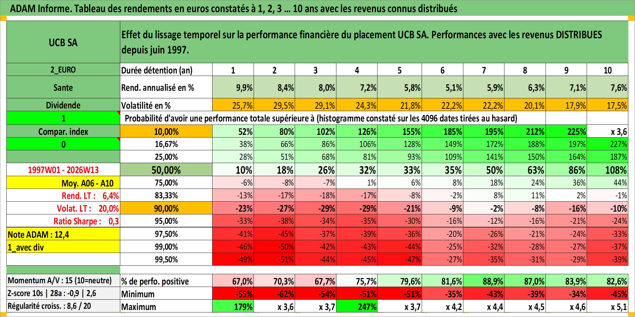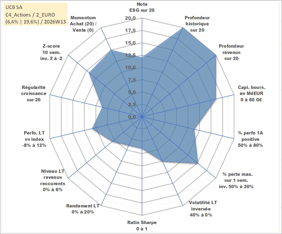Site dédié aux investisseursPage dédiée sur site financeAnalyse des valorisations hebdomadaires de l'action UCB SA. Cet actif est cote en EUR. Les valorisations couvrent les semaines 1997W01 a 2026W13. Les revenus de cet actif financier sont pris en compte depuis la semaine 1997W26. La note globale ESG de cet actif est estimee a 12.0 (apres rebasage entre 0 et 20).
