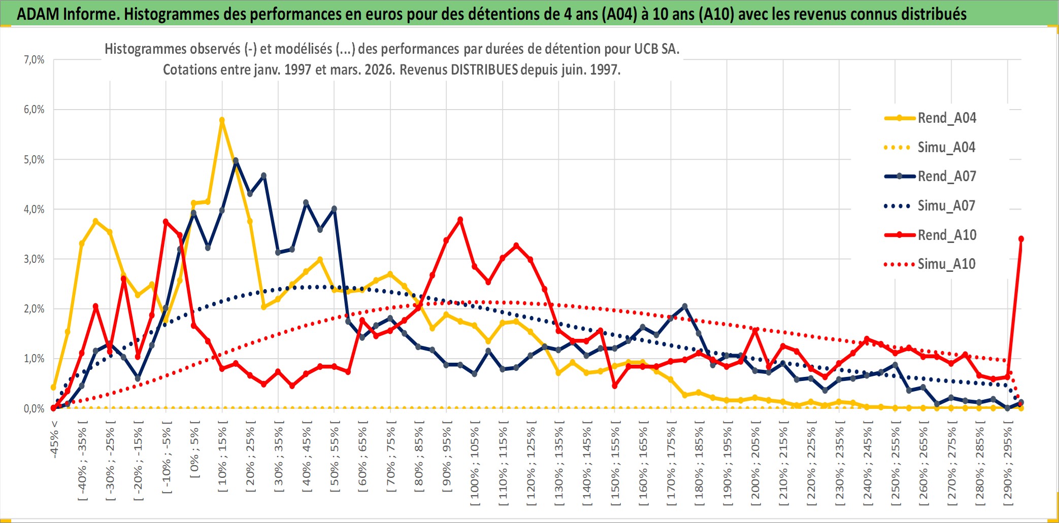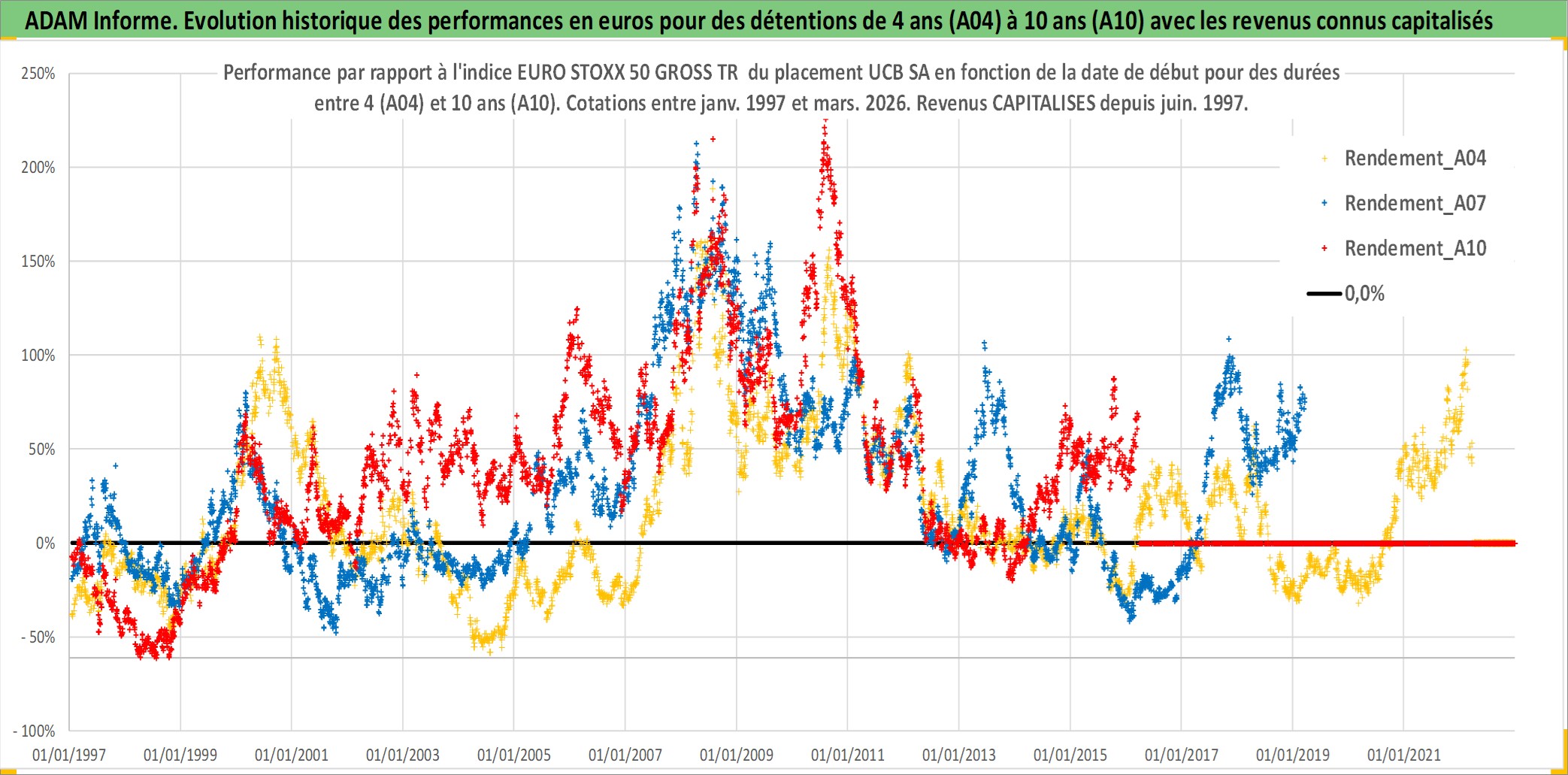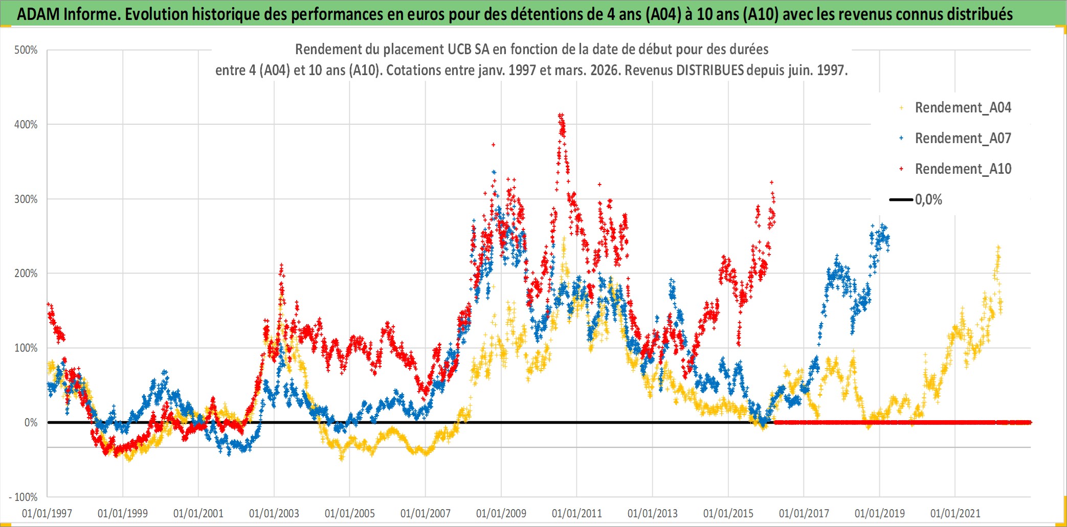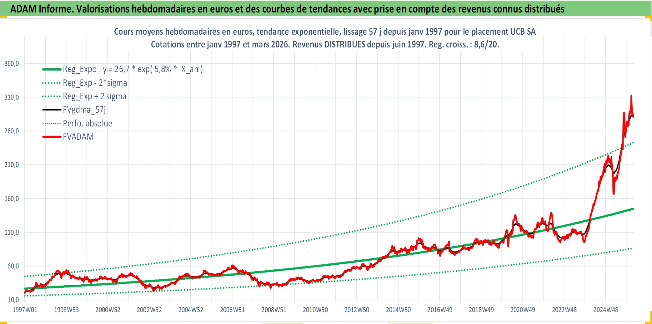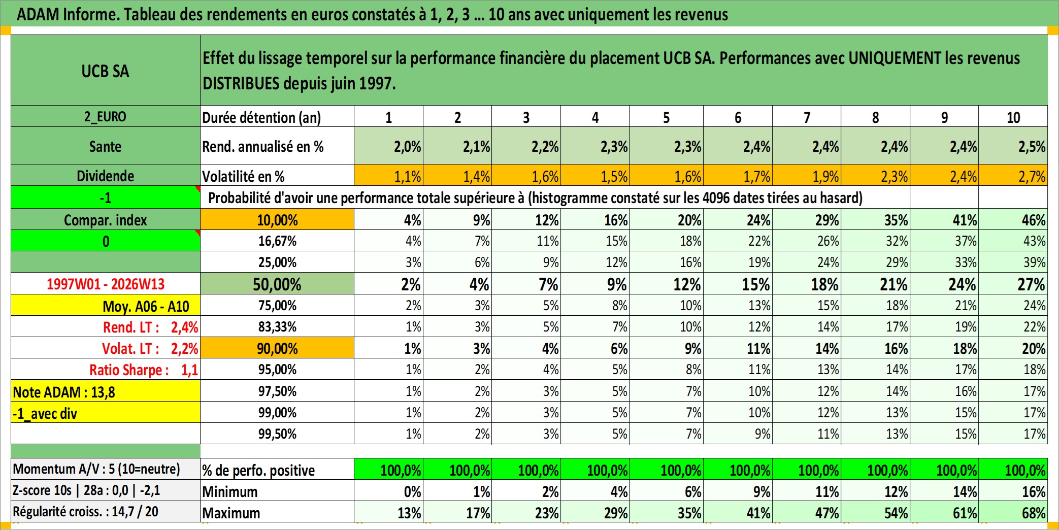 Site dédié aux investisseursPage dédiée sur site financeAnalyse des valorisations hebdomadaires de l'action UCB SA. Cet actif est cote en EUR. Les valorisations couvrent les semaines 1997W01 a 2026W13. Les revenus de cet actif financier sont pris en compte depuis la semaine 1997W26. La note globale ESG de cet actif est estimee a 12.0 (apres rebasage entre 0 et 20).
