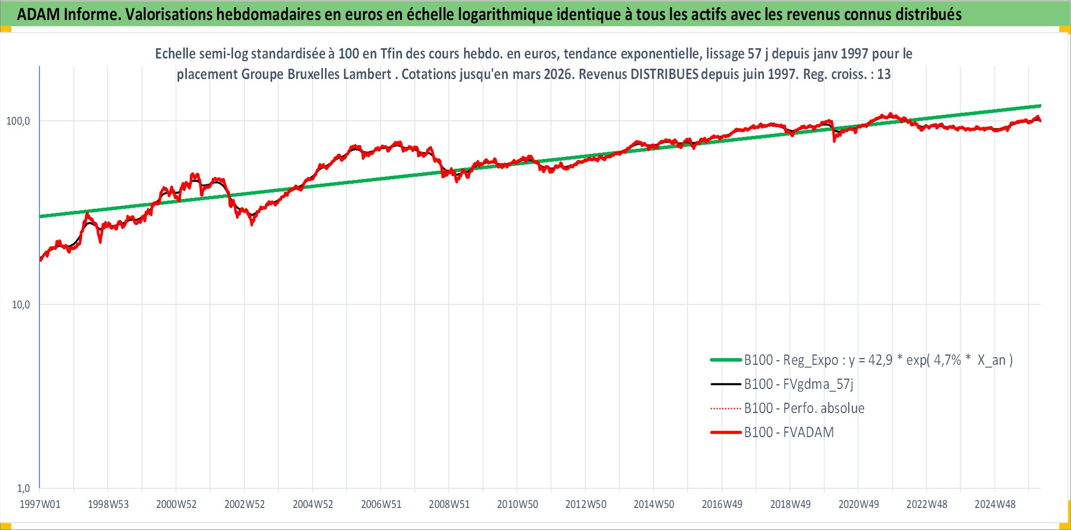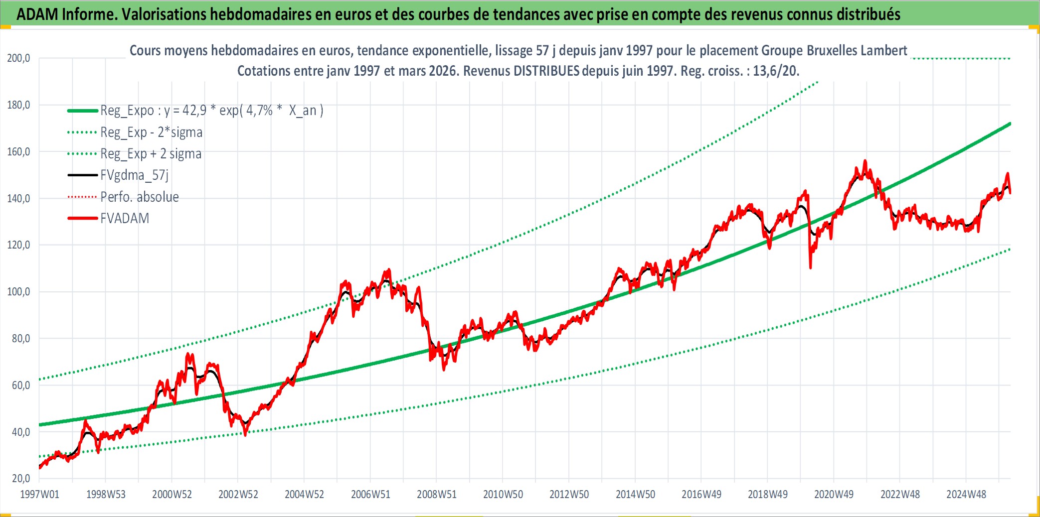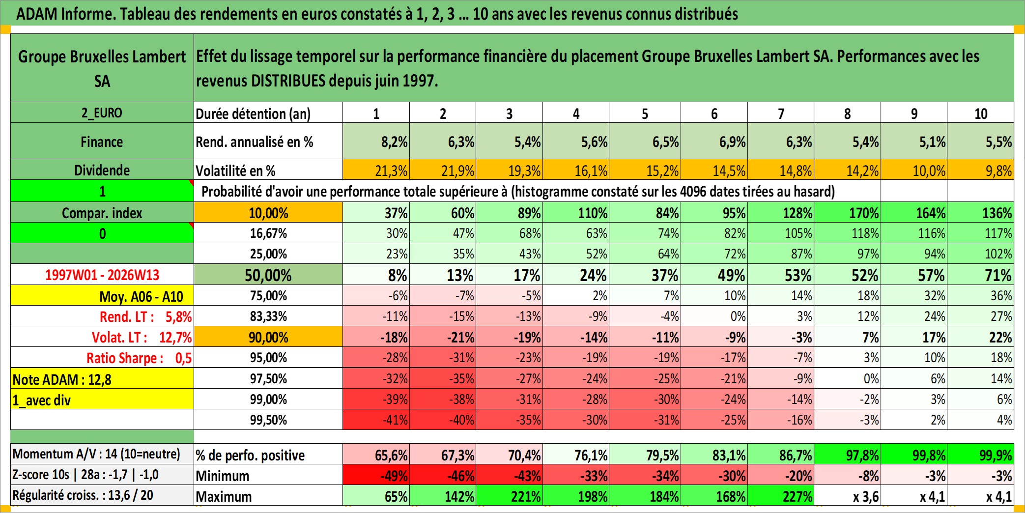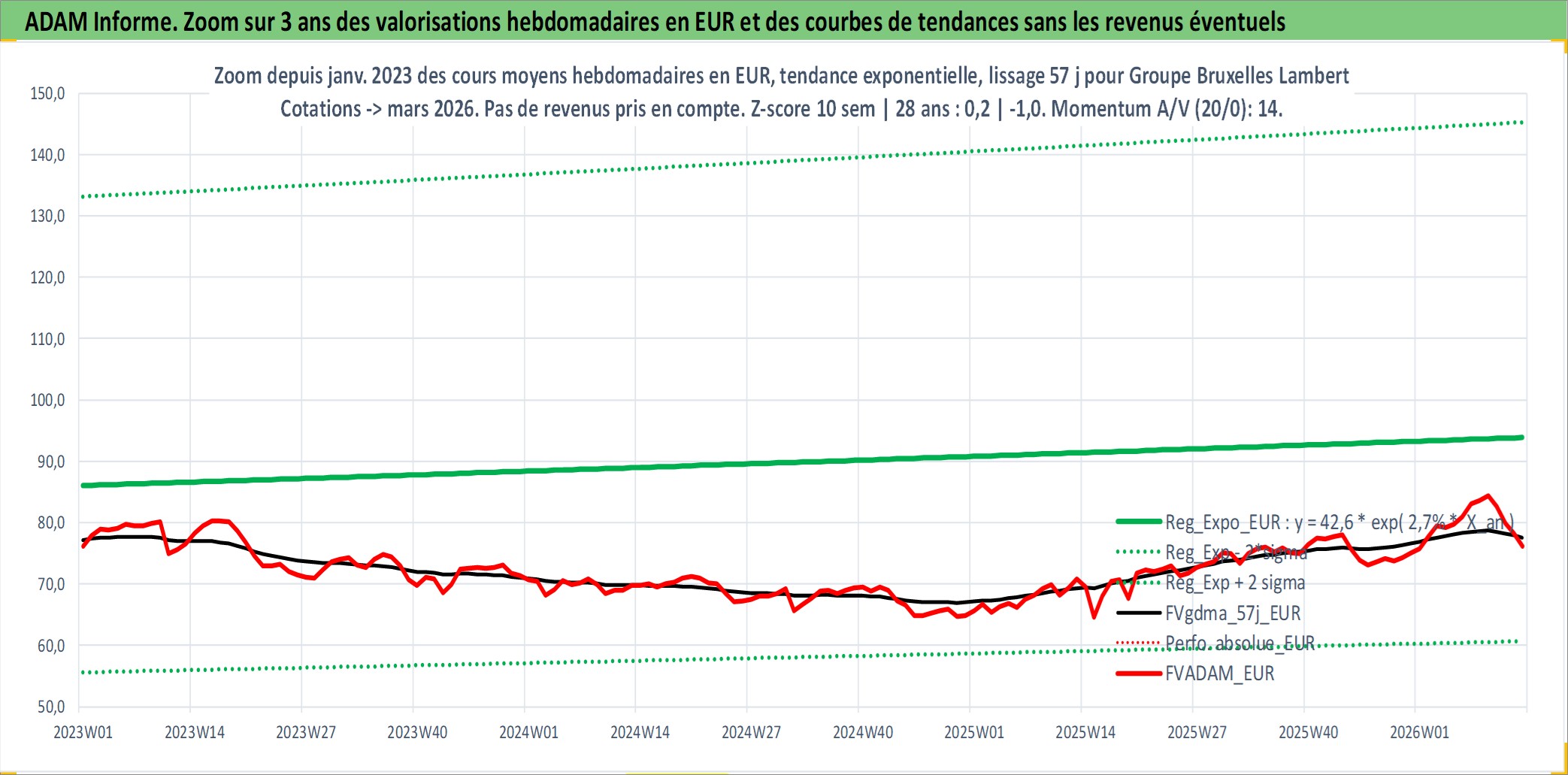 Site dédié aux investisseursPage dédiée sur site financeAnalyse des valorisations hebdomadaires de l'action Groupe Bruxelles Lambert SA. Cet actif est cote en EUR. Les valorisations couvrent les semaines 1997W01 a 2026W13. Les revenus de cet actif financier sont pris en compte depuis la semaine 1997W26. La note globale ESG de cet actif est estimee a 18.0 (apres rebasage entre 0 et 20).