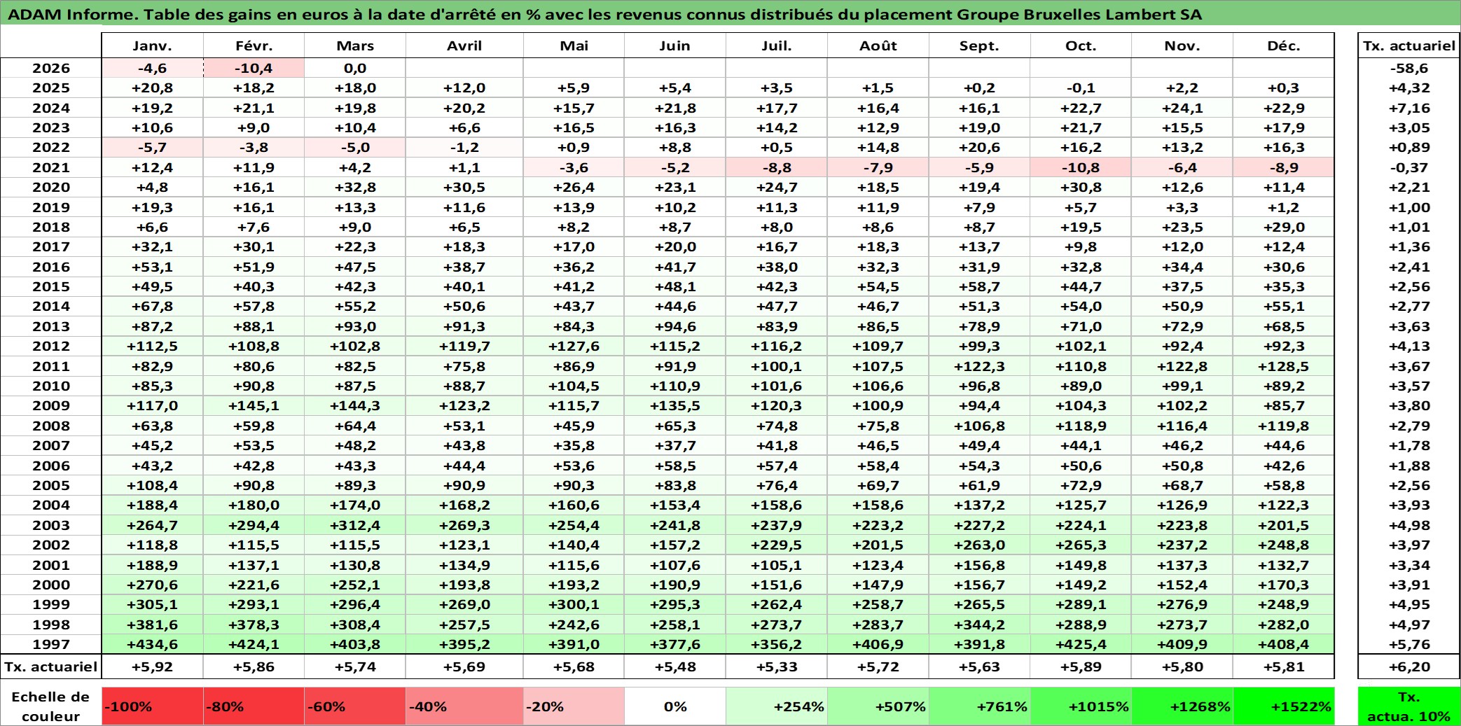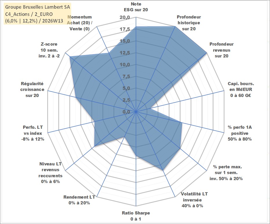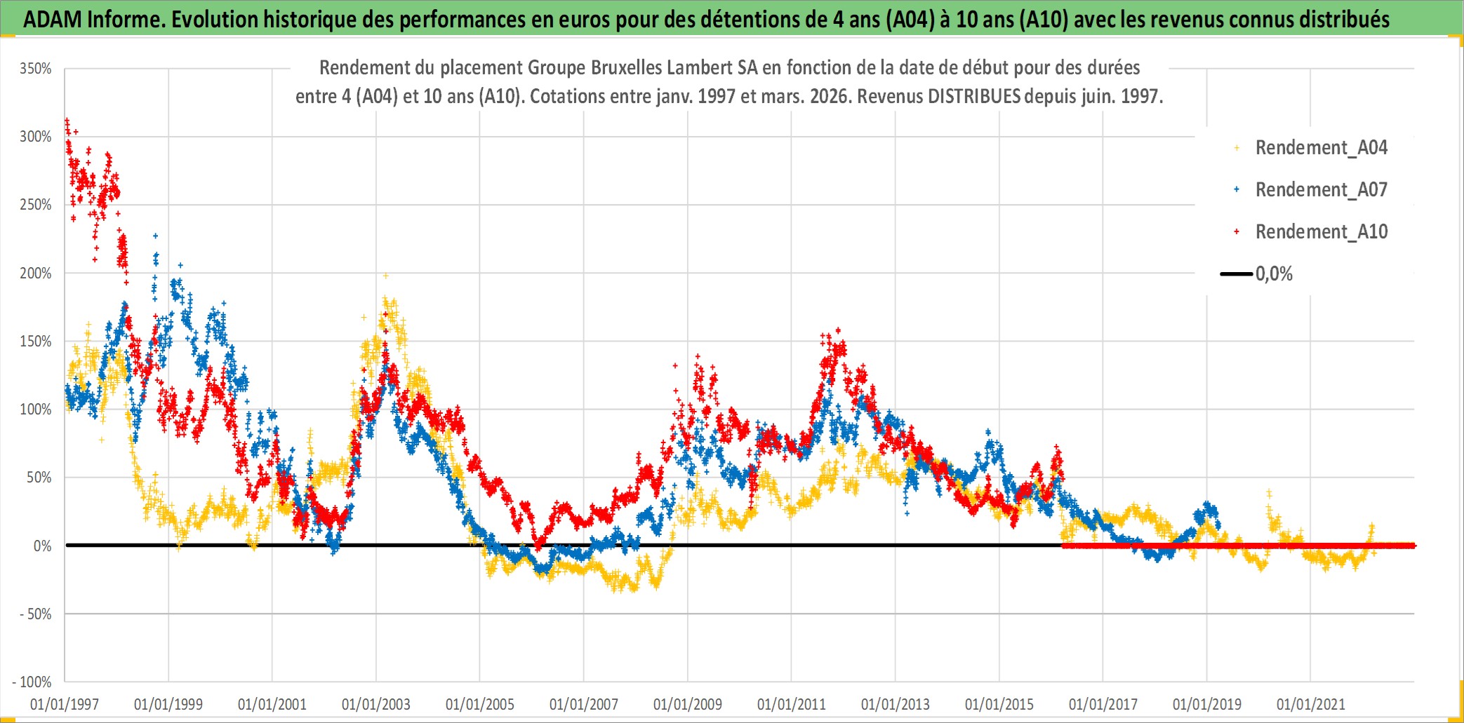 Site dédié aux investisseursPage dédiée sur site financeAnalyse des valorisations hebdomadaires de l'action Groupe Bruxelles Lambert SA. Cet actif est cote en EUR. Les valorisations couvrent les semaines 1997W01 a 2026W13. Les revenus de cet actif financier sont pris en compte depuis la semaine 1997W26. La note globale ESG de cet actif est estimee a 18.0 (apres rebasage entre 0 et 20).