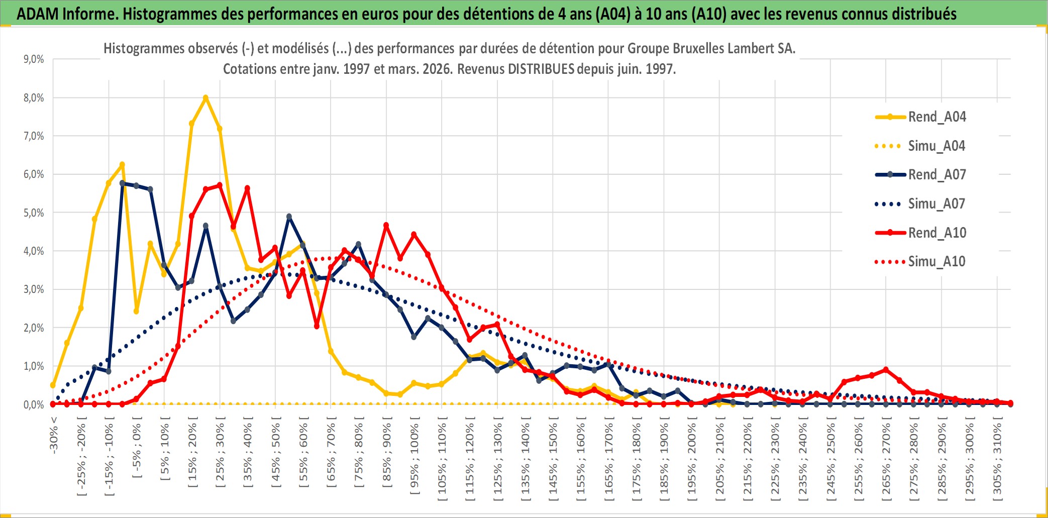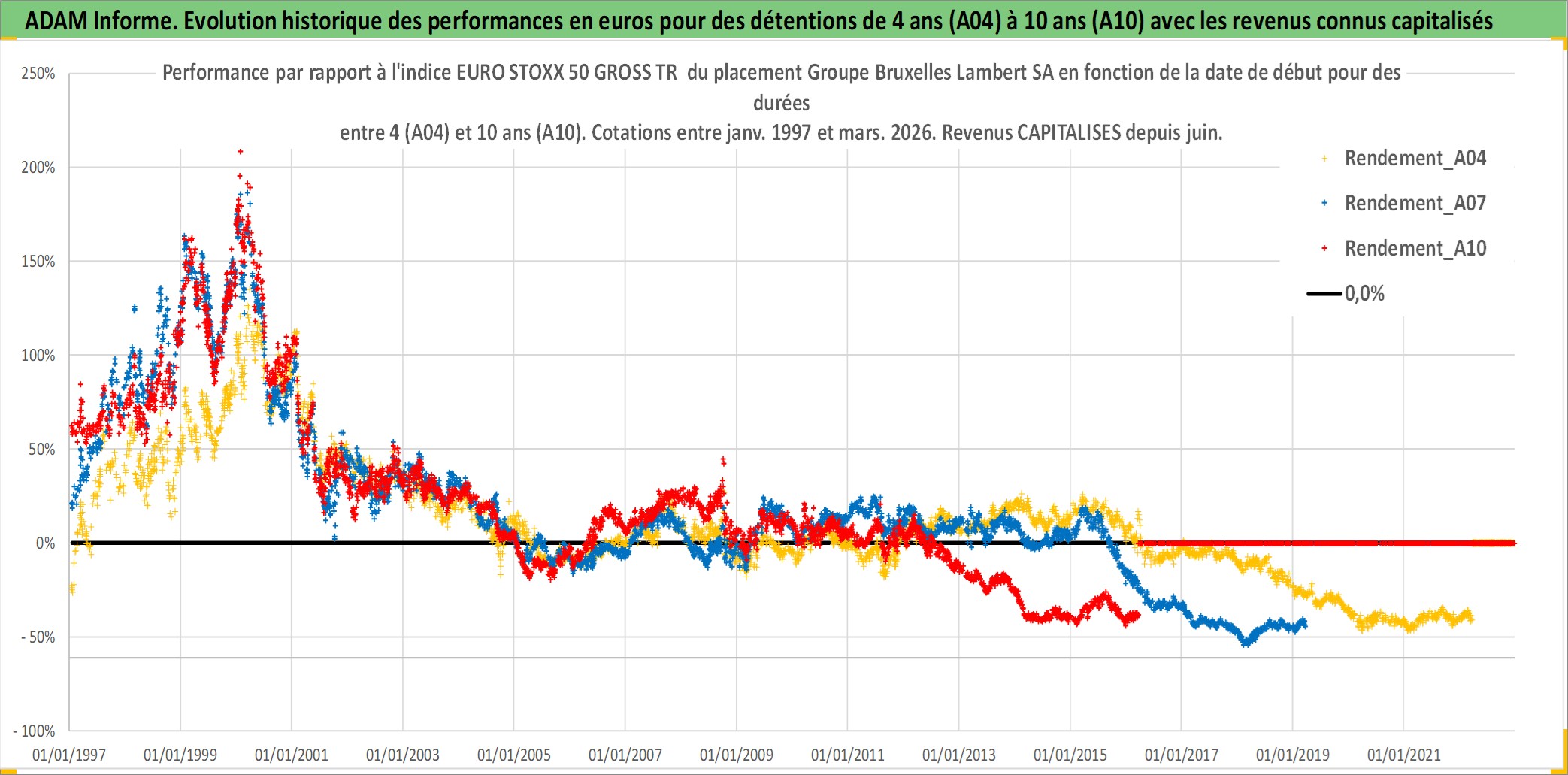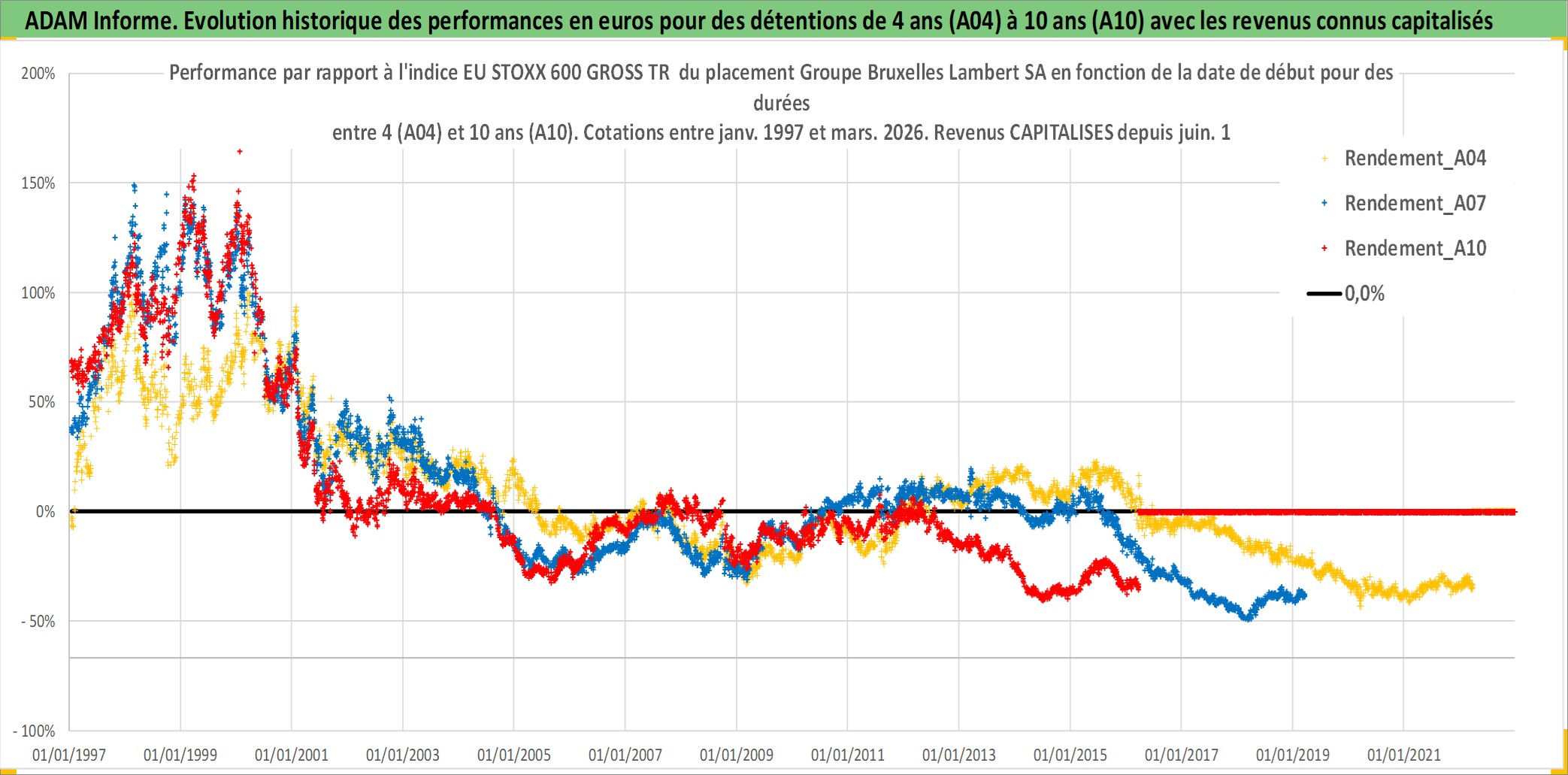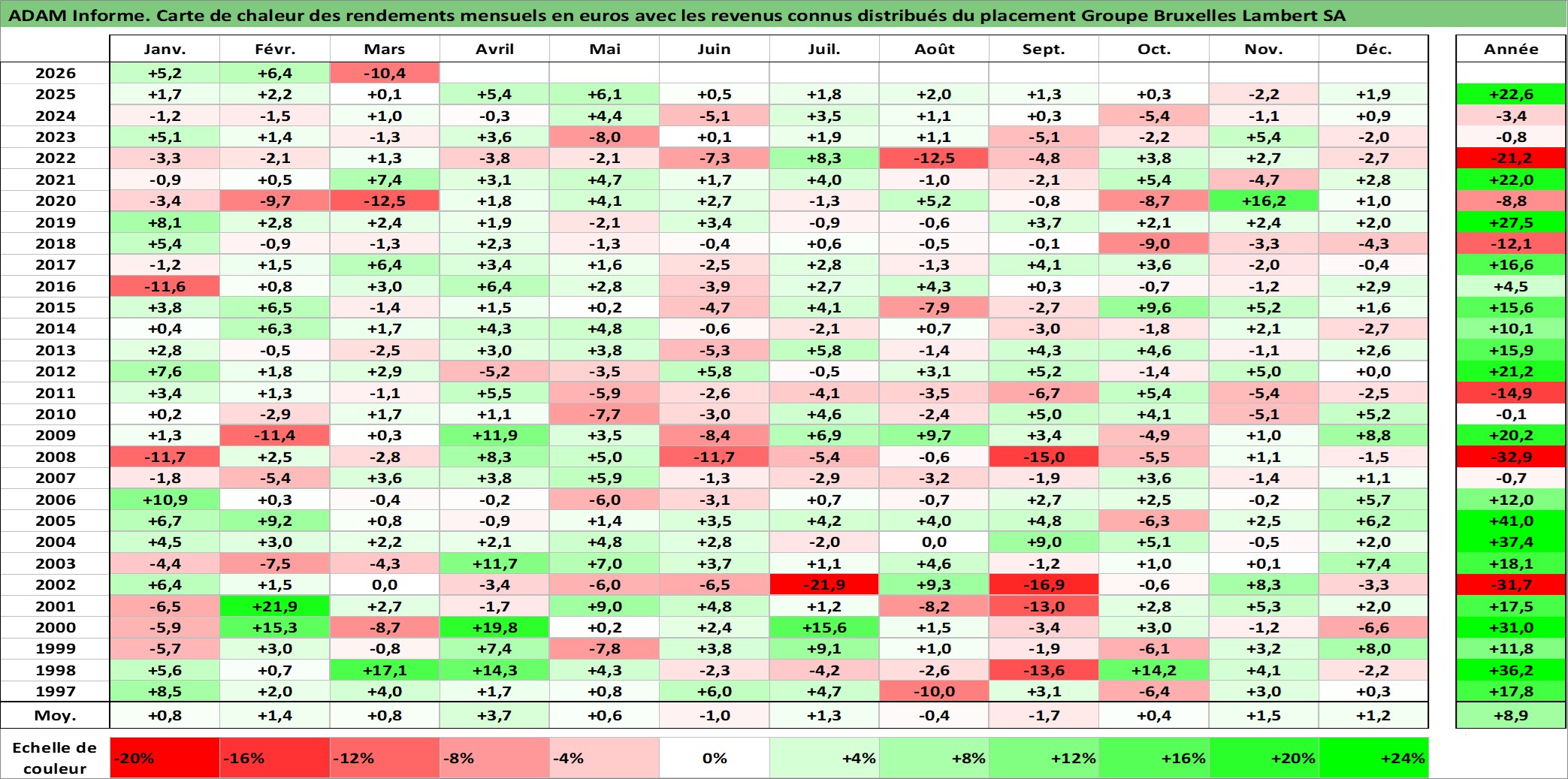 Site dédié aux investisseursPage dédiée sur site financeAnalyse des valorisations hebdomadaires de l'action Groupe Bruxelles Lambert SA. Cet actif est cote en EUR. Les valorisations couvrent les semaines 1997W01 a 2026W13. Les revenus de cet actif financier sont pris en compte depuis la semaine 1997W26. La note globale ESG de cet actif est estimee a 18.0 (apres rebasage entre 0 et 20).