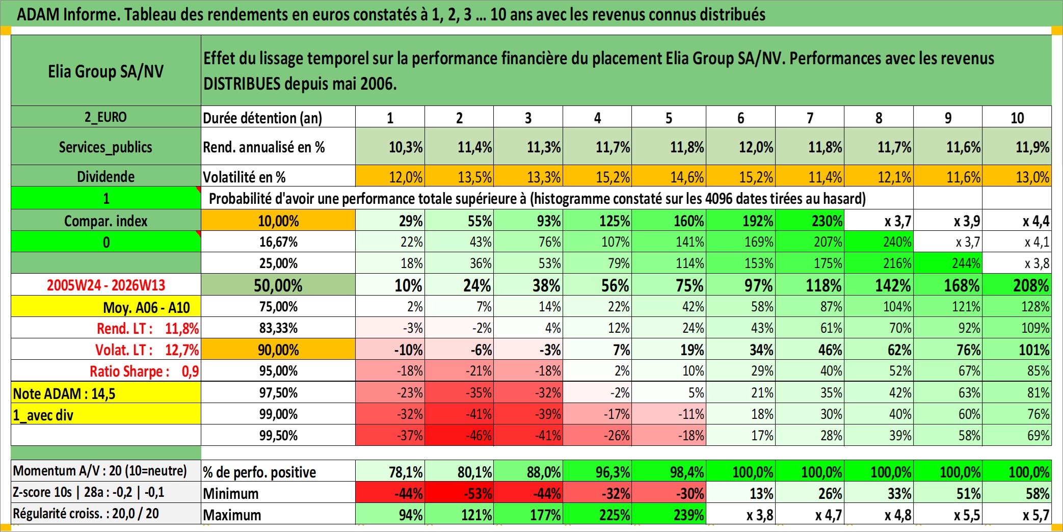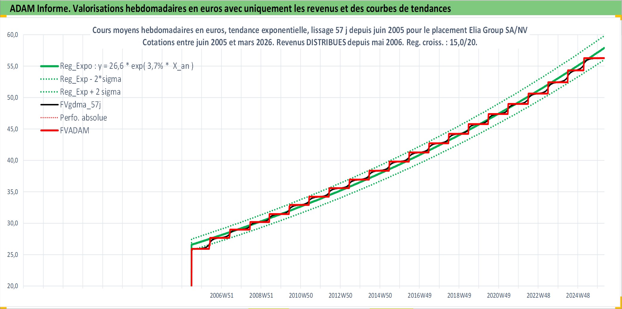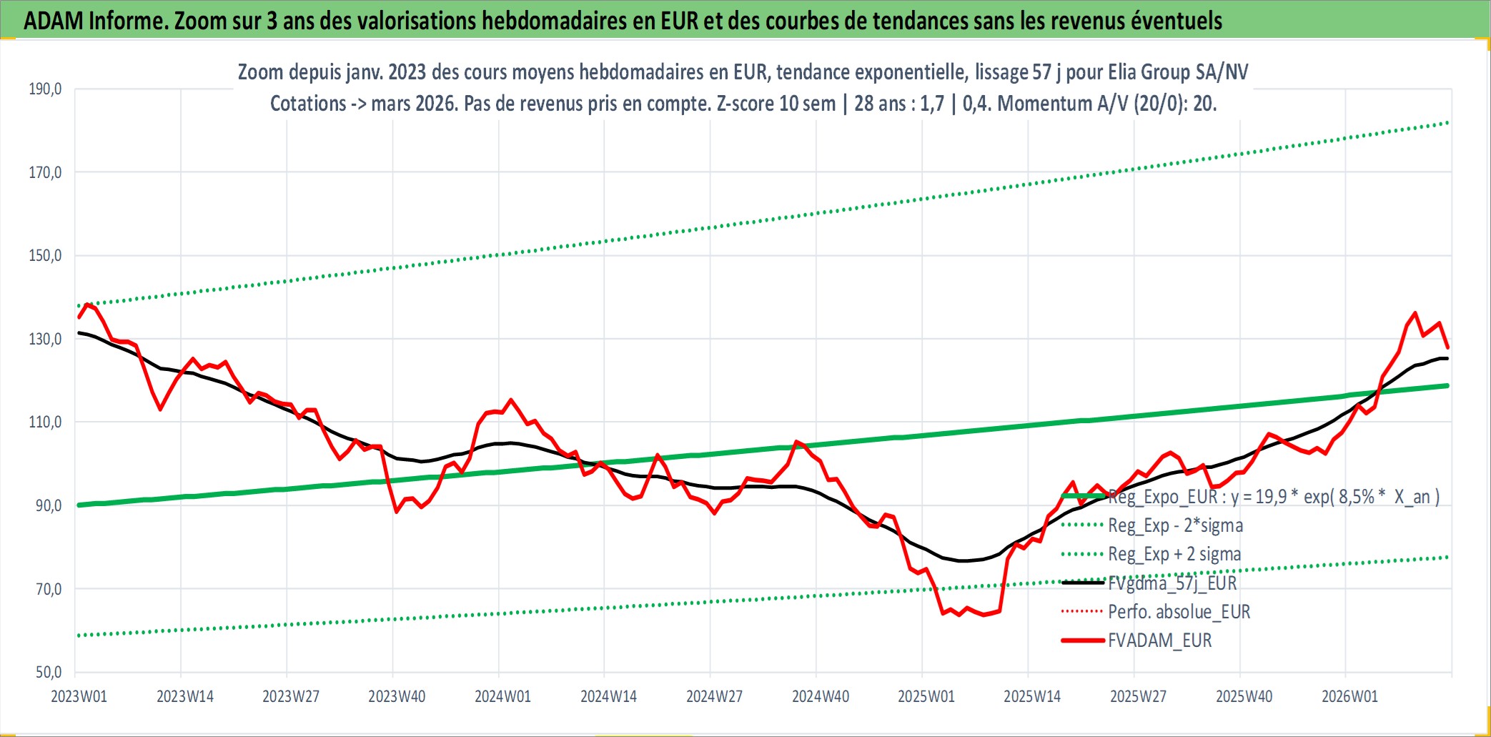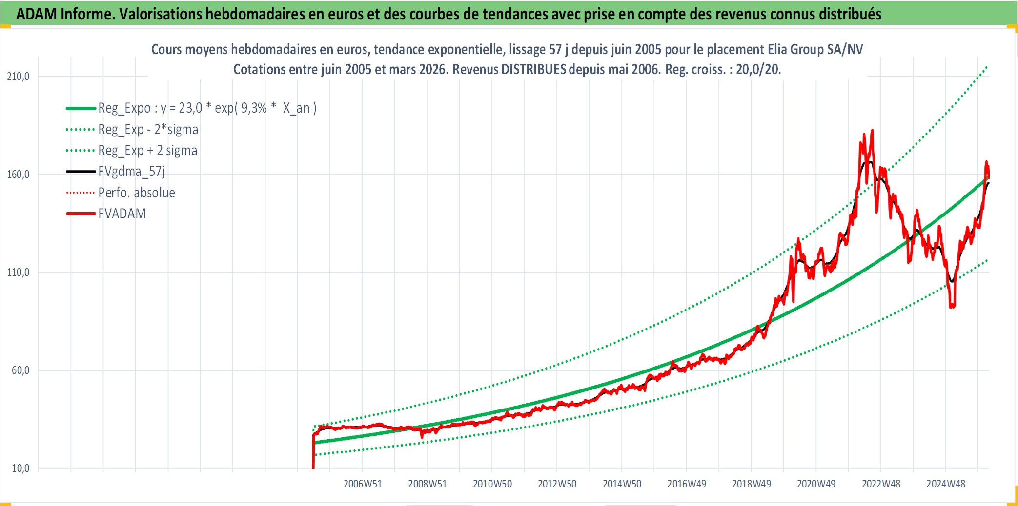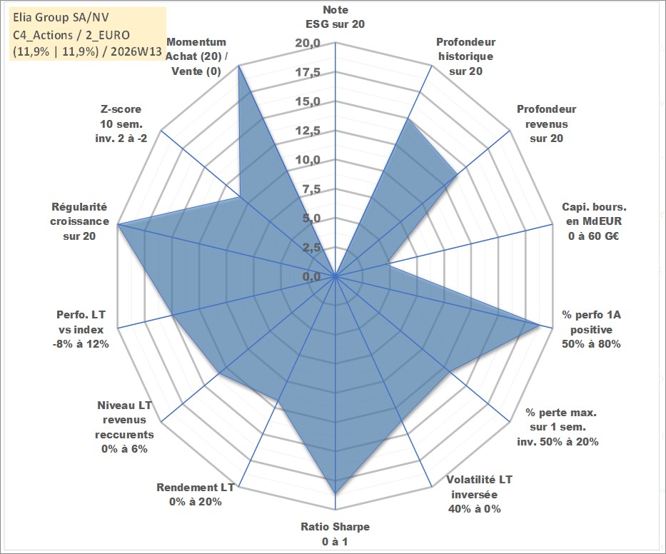Site dédié aux investisseursPage dédiée sur site financeAnalyse des valorisations hebdomadaires de l'action Elia Group SA/NV. Cet actif est cote en EUR. Les valorisations couvrent les semaines 2005W24 a 2026W13. Les revenus de cet actif financier sont pris en compte depuis la semaine 2006W19. La note ESG de cet actif n'est pas connue.