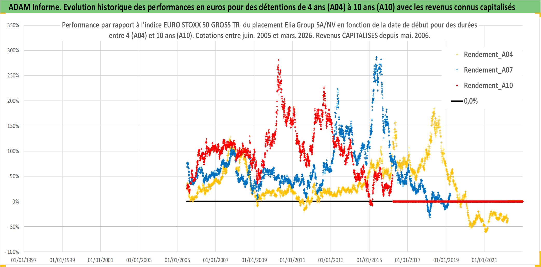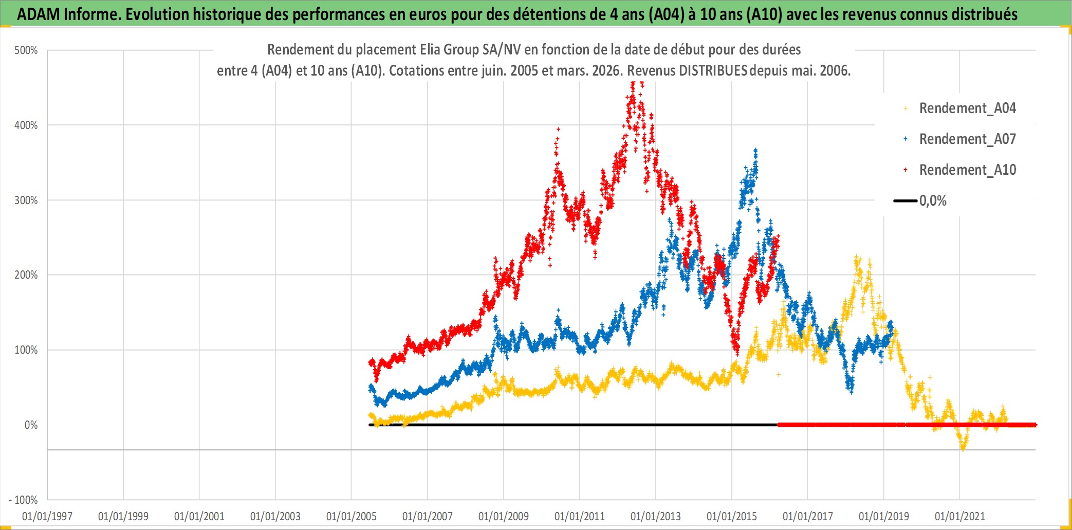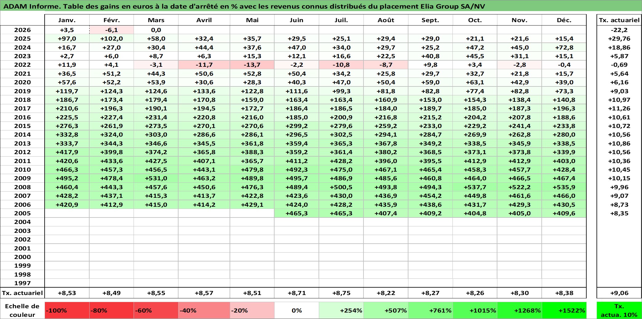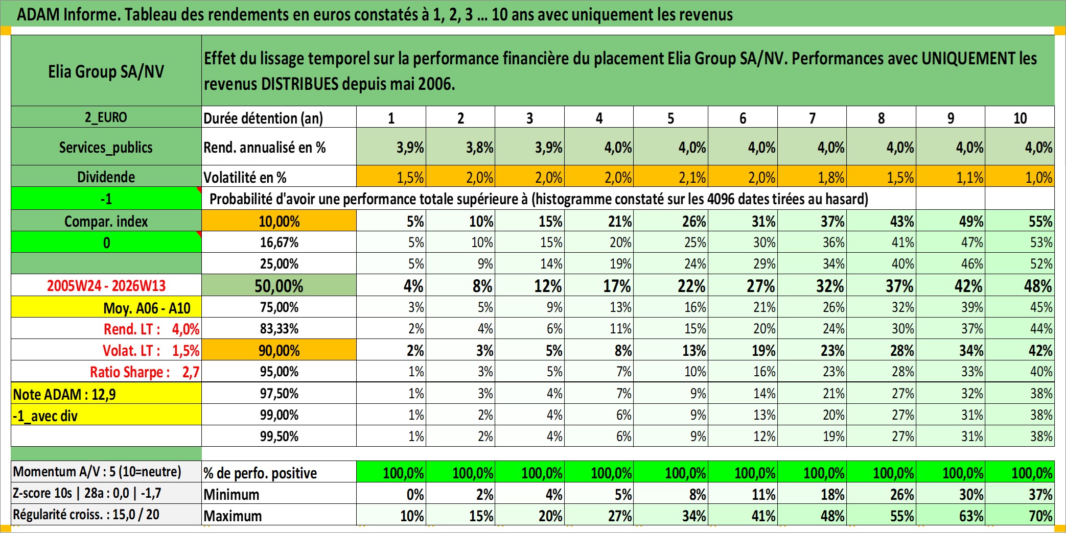 Site dédié aux investisseursPage dédiée sur site financeAnalyse des valorisations hebdomadaires de l'action Elia Group SA/NV. Cet actif est cote en EUR. Les valorisations couvrent les semaines 2005W24 a 2026W13. Les revenus de cet actif financier sont pris en compte depuis la semaine 2006W19. La note ESG de cet actif n'est pas connue.
