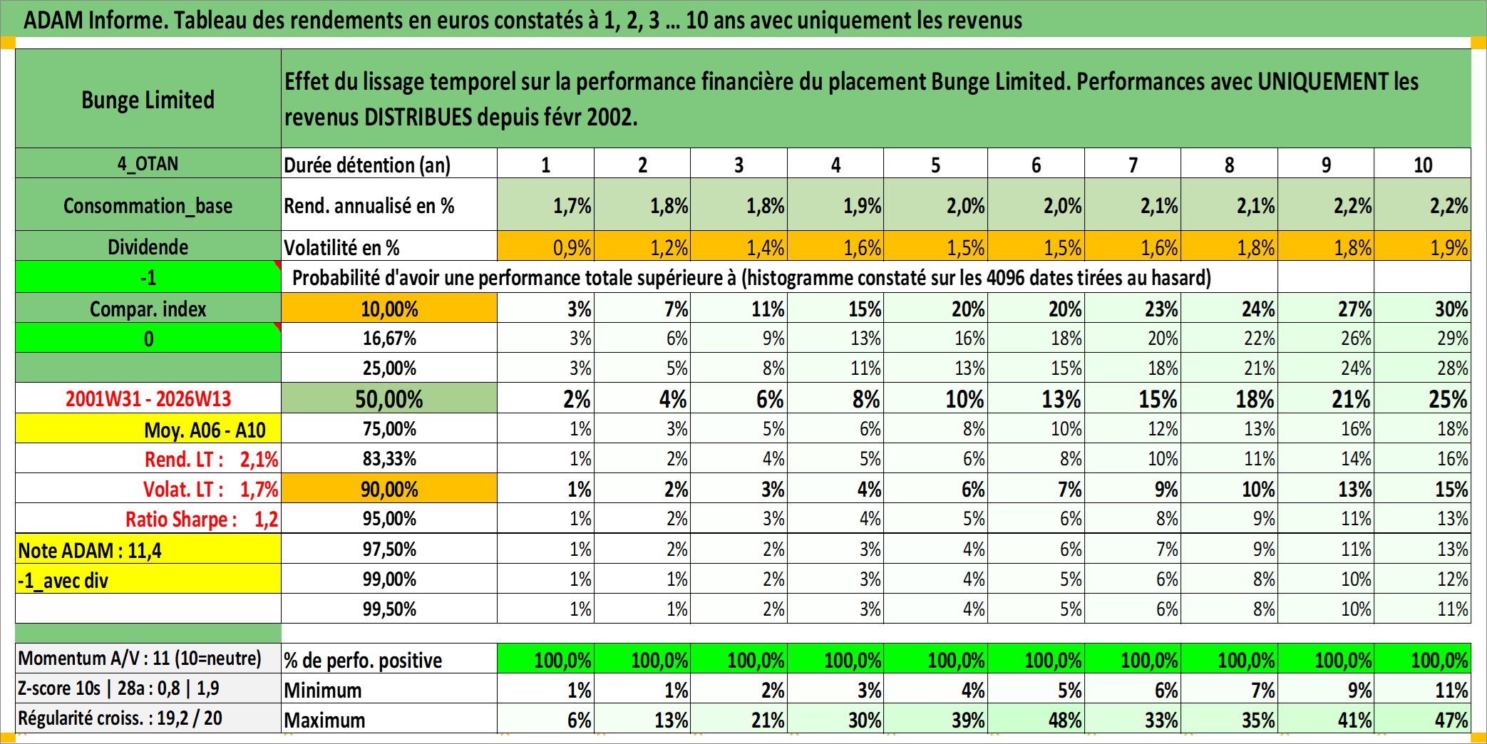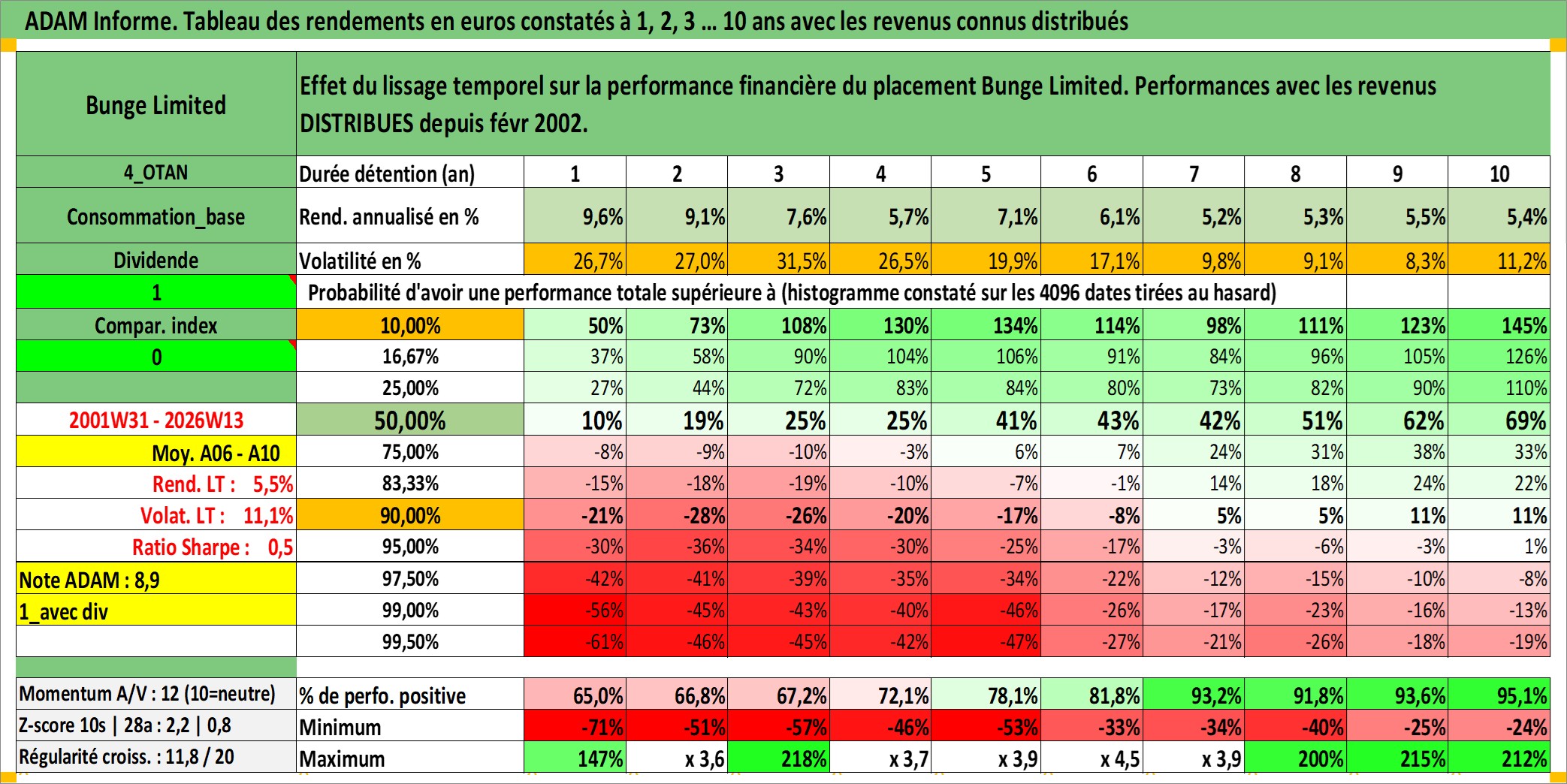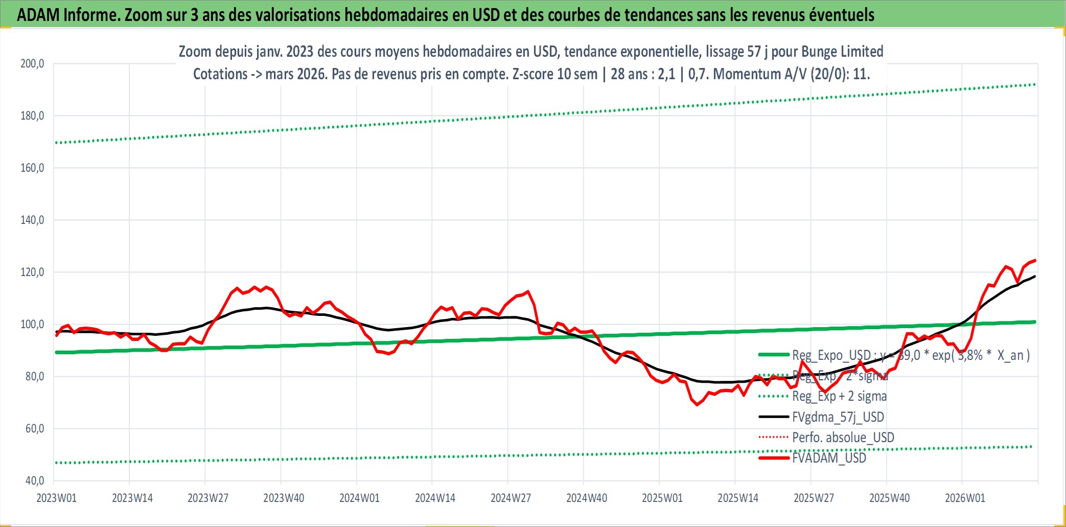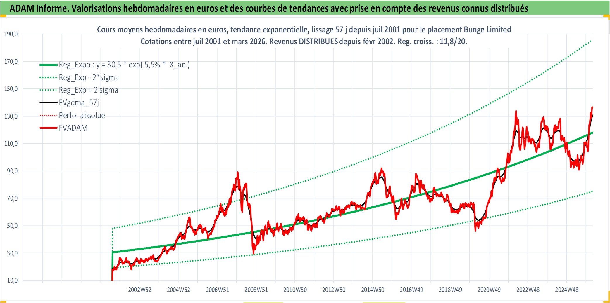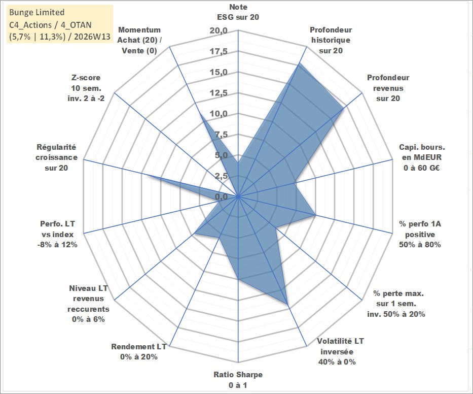 Site dédié aux investisseursPage dédiée sur site financeAnalyse des valorisations hebdomadaires de l'action Bunge Limited. Cet actif est cote en USD. Les valorisations sont en contrevaleur EURO et couvrent les semaines 2001W31 a 2026W13. Les revenus de cet actif financier sont pris en compte depuis la semaine 2002W06. La note globale ESG de cet actif est estimee a 4.0 (apres rebasage entre 0 et 20).
