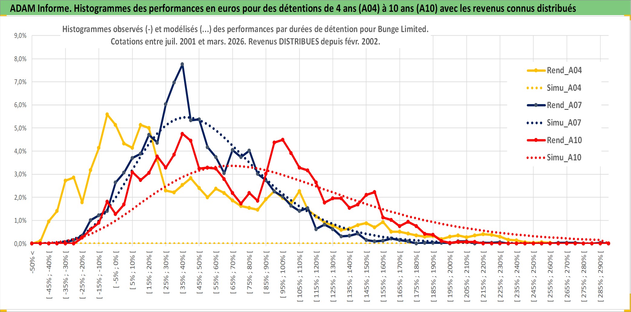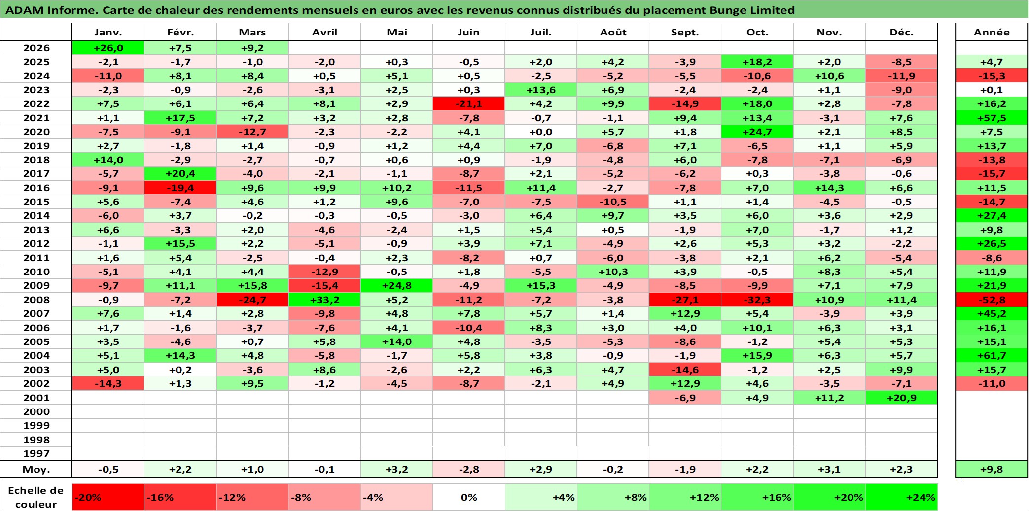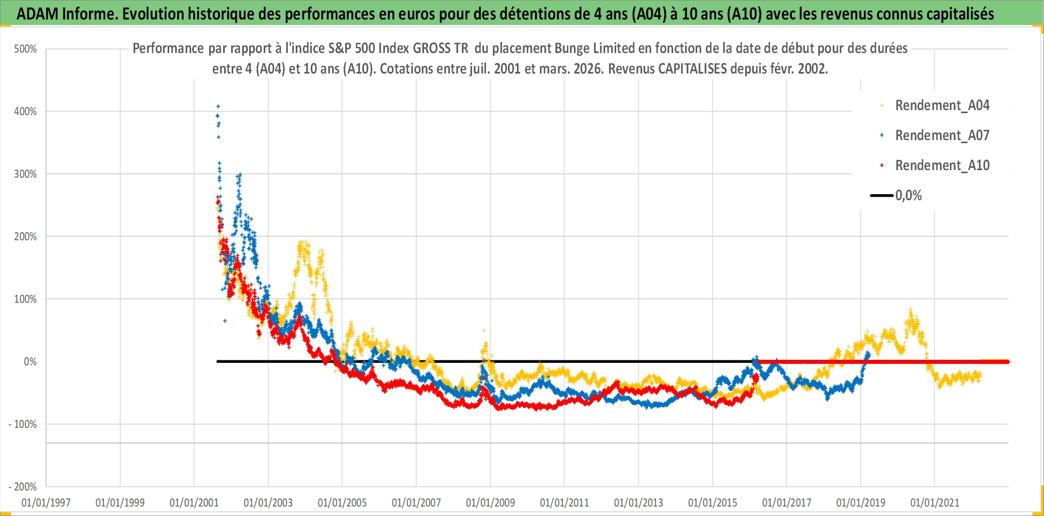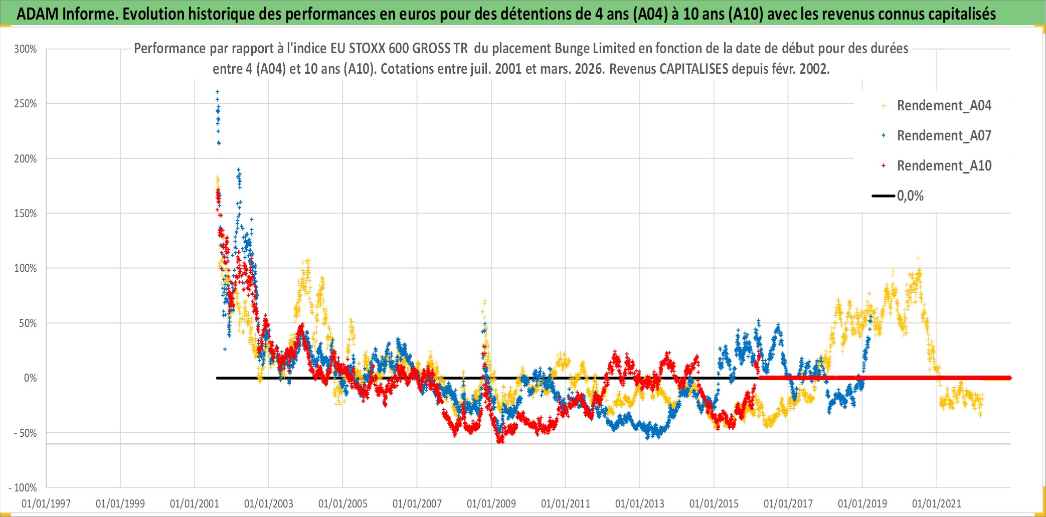 Site dédié aux investisseursPage dédiée sur site financeAnalyse des valorisations hebdomadaires de l'action Bunge Limited. Cet actif est cote en USD. Les valorisations sont en contrevaleur EURO et couvrent les semaines 2001W31 a 2026W13. Les revenus de cet actif financier sont pris en compte depuis la semaine 2002W06. La note globale ESG de cet actif est estimee a 4.0 (apres rebasage entre 0 et 20).