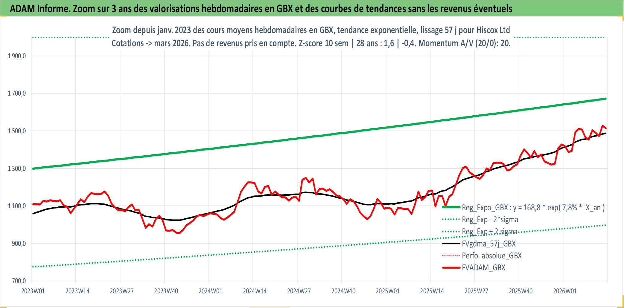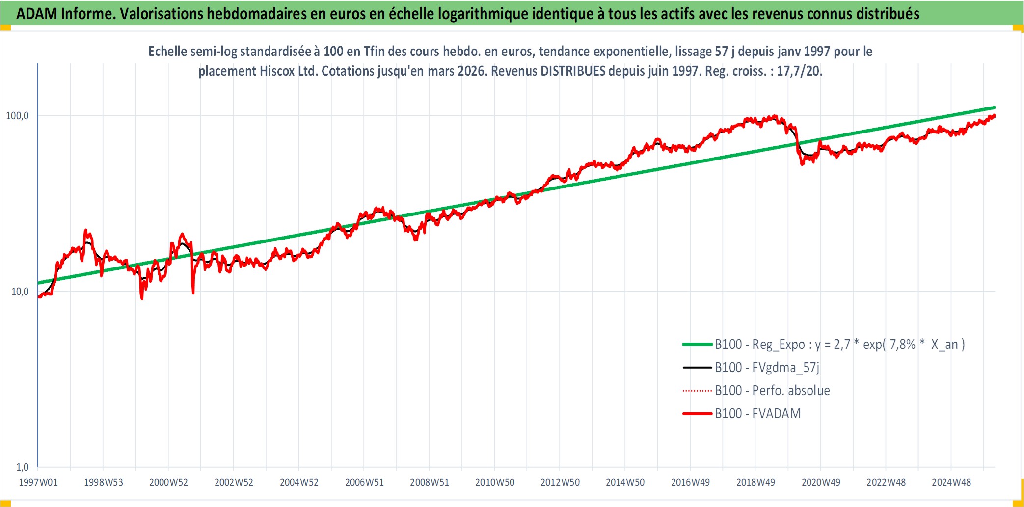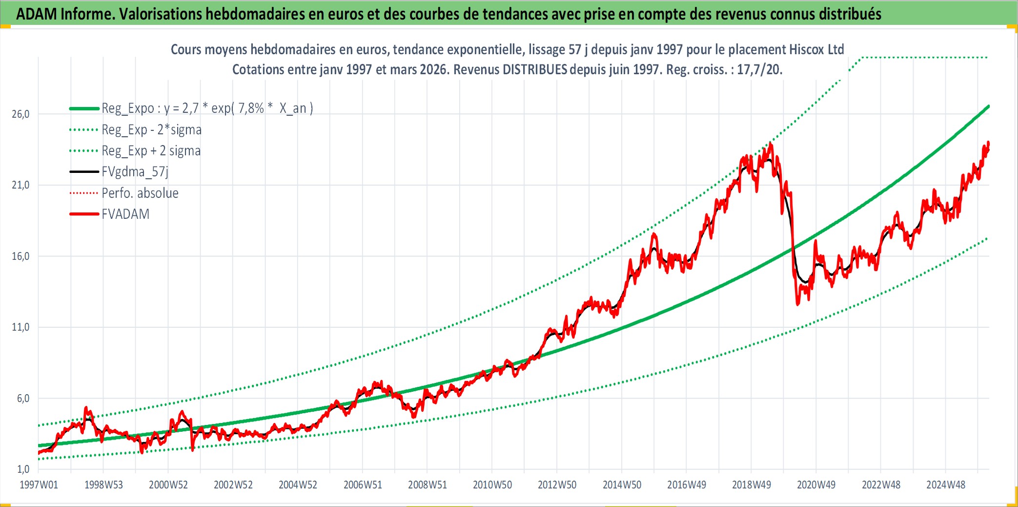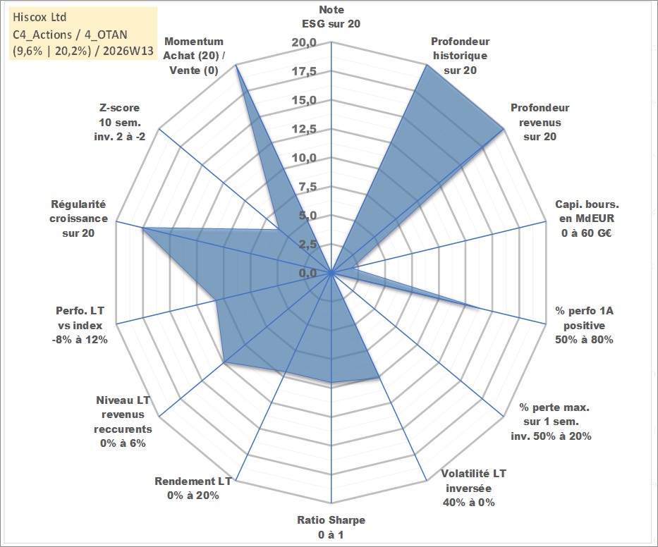 Site dédié aux investisseursPage dédiée sur site financeAnalyse des valorisations hebdomadaires de l'action Hiscox Ltd. Cet actif est cote en GBX. Les valorisations sont en contrevaleur EURO et couvrent les semaines 1997W01 a 2026W13. Les revenus de cet actif financier sont pris en compte depuis la semaine 1997W24. La note ESG de cet actif n'est pas connue.