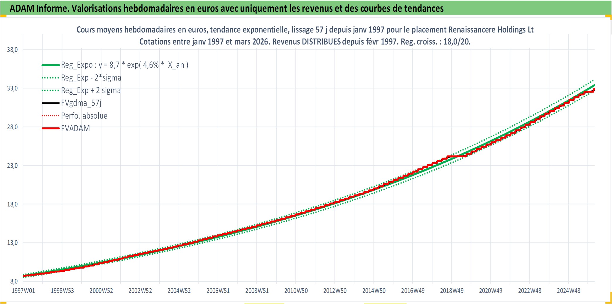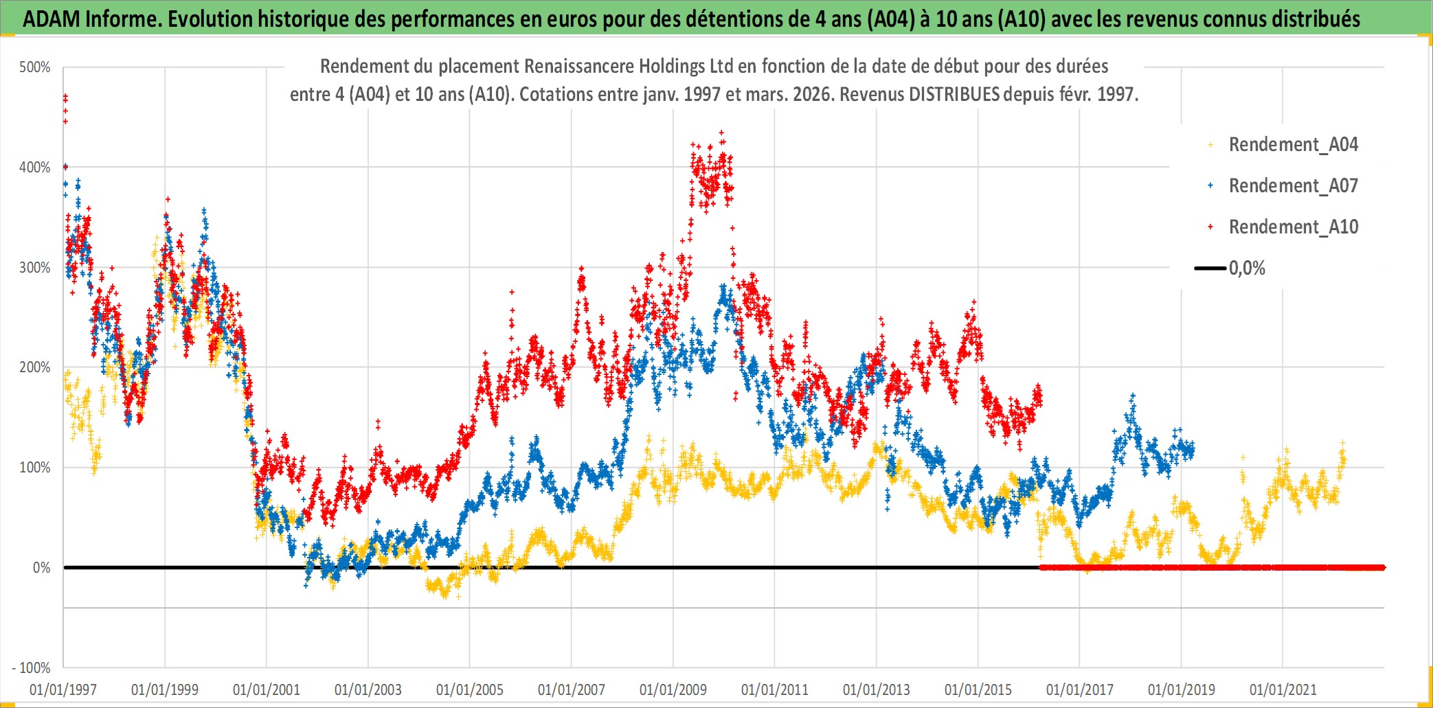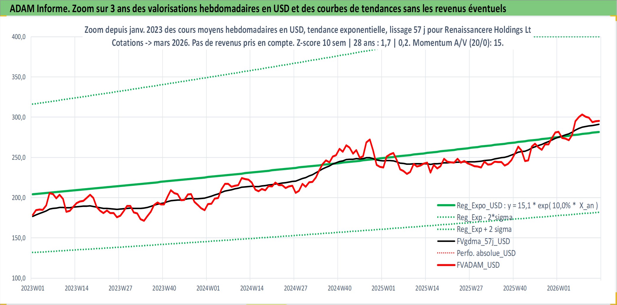 Site dédié aux investisseursPage dédiée sur site financeAnalyse des valorisations hebdomadaires de l'action Renaissancere Holdings Ltd. Cet actif est cote en USD. Les valorisations sont en contrevaleur EURO et couvrent les semaines 1997W01 a 2026W13. Les revenus de cet actif financier sont pris en compte depuis la semaine 1997W07. La note globale ESG de cet actif est estimee a 7.0 (apres rebasage entre 0 et 20).
