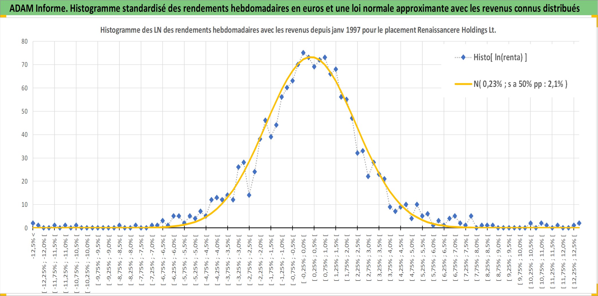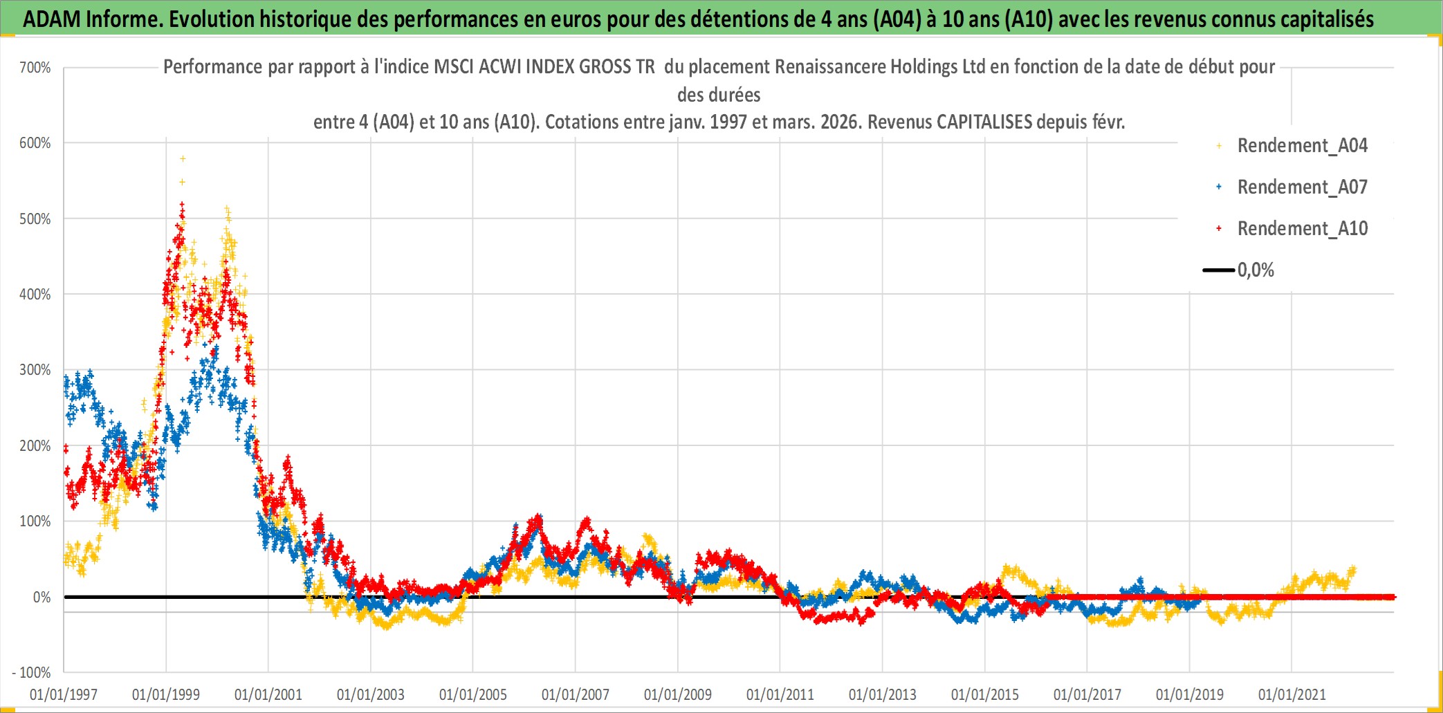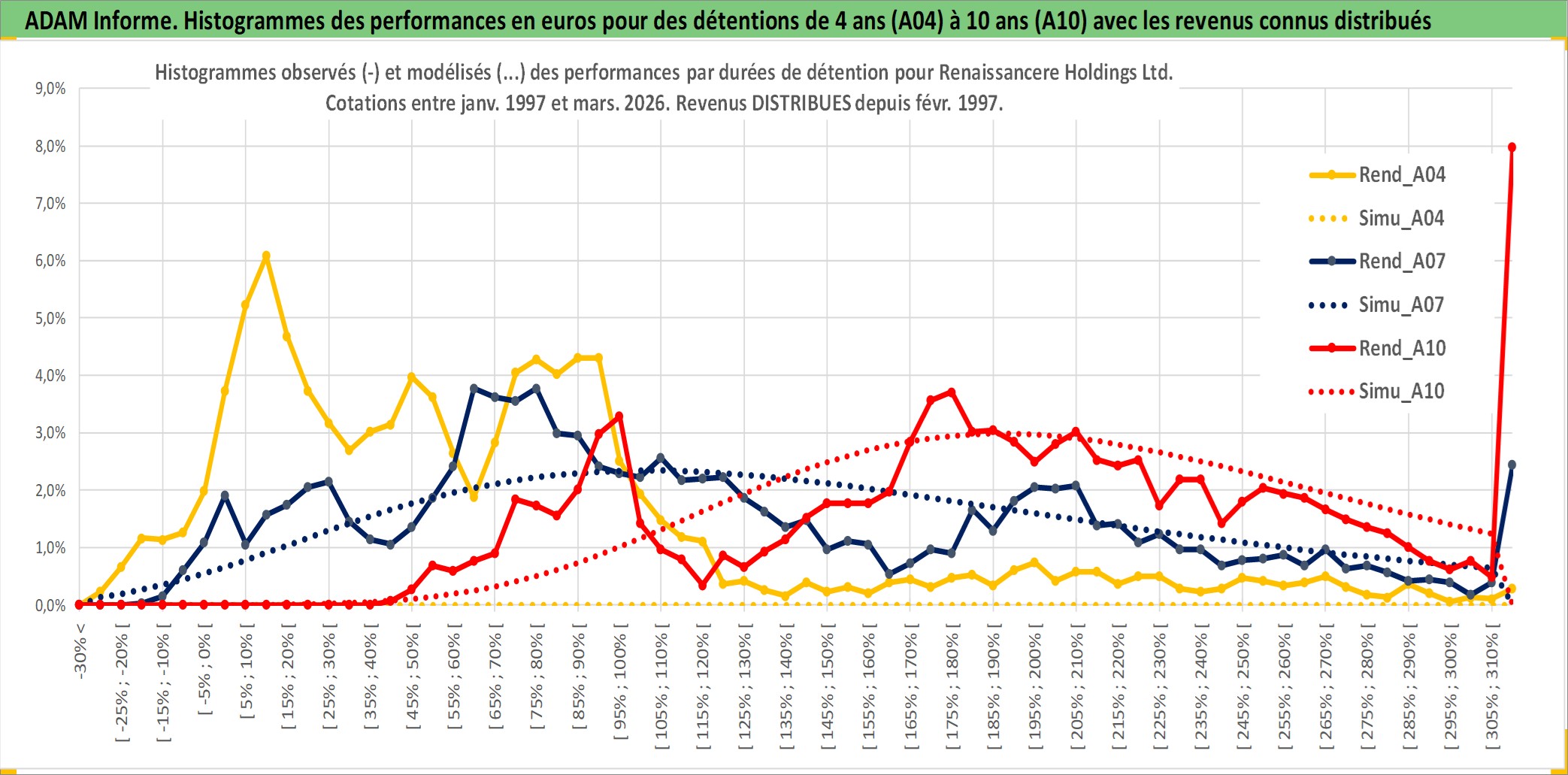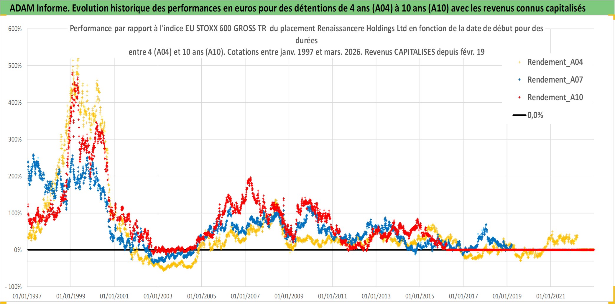 Site dédié aux investisseursPage dédiée sur site financeAnalyse des valorisations hebdomadaires de l'action Renaissancere Holdings Ltd. Cet actif est cote en USD. Les valorisations sont en contrevaleur EURO et couvrent les semaines 1997W01 a 2026W13. Les revenus de cet actif financier sont pris en compte depuis la semaine 1997W07. La note globale ESG de cet actif est estimee a 7.0 (apres rebasage entre 0 et 20).