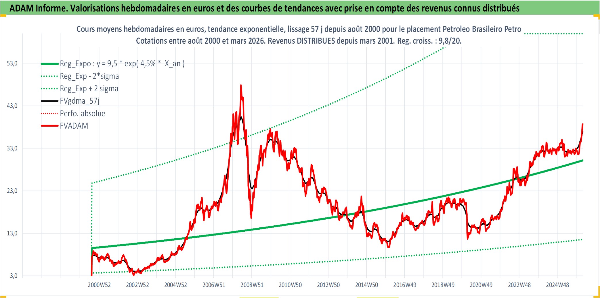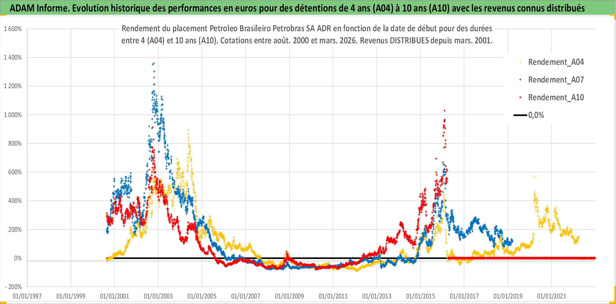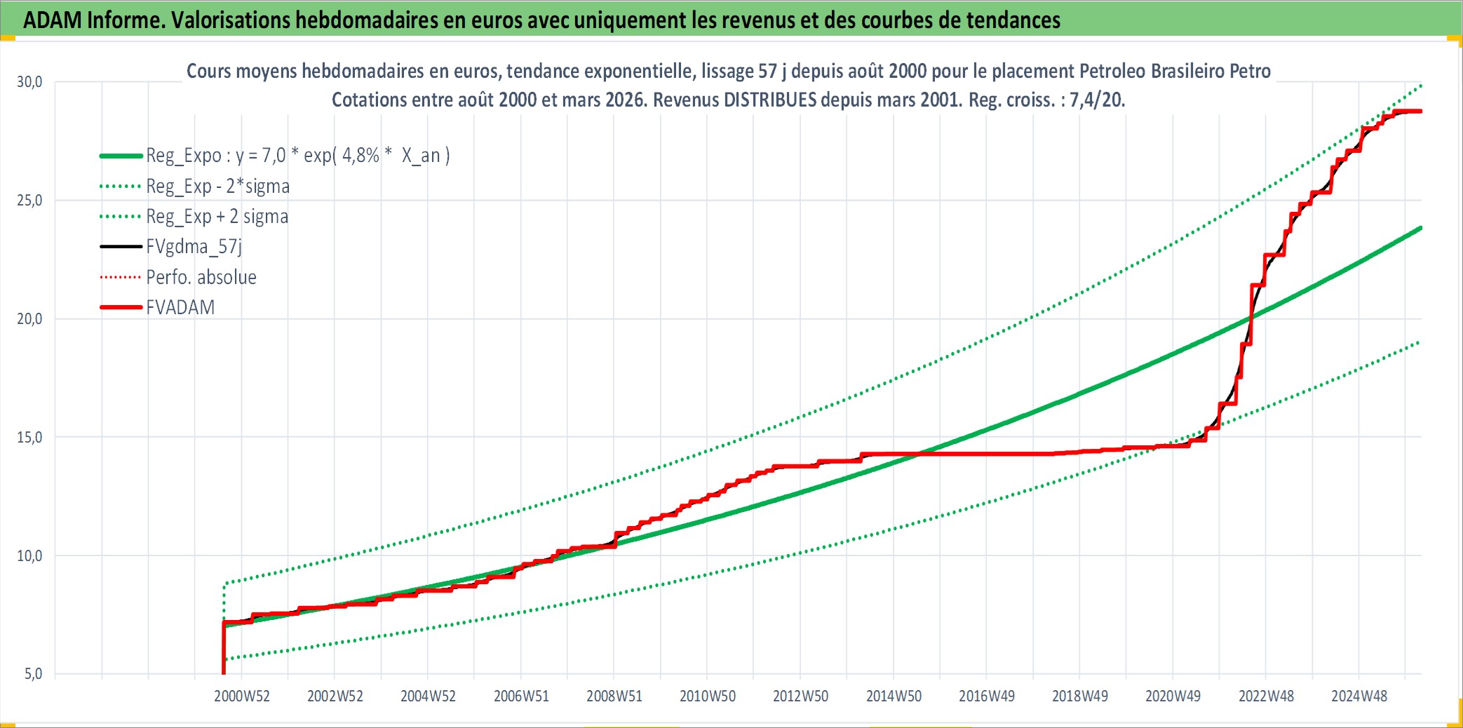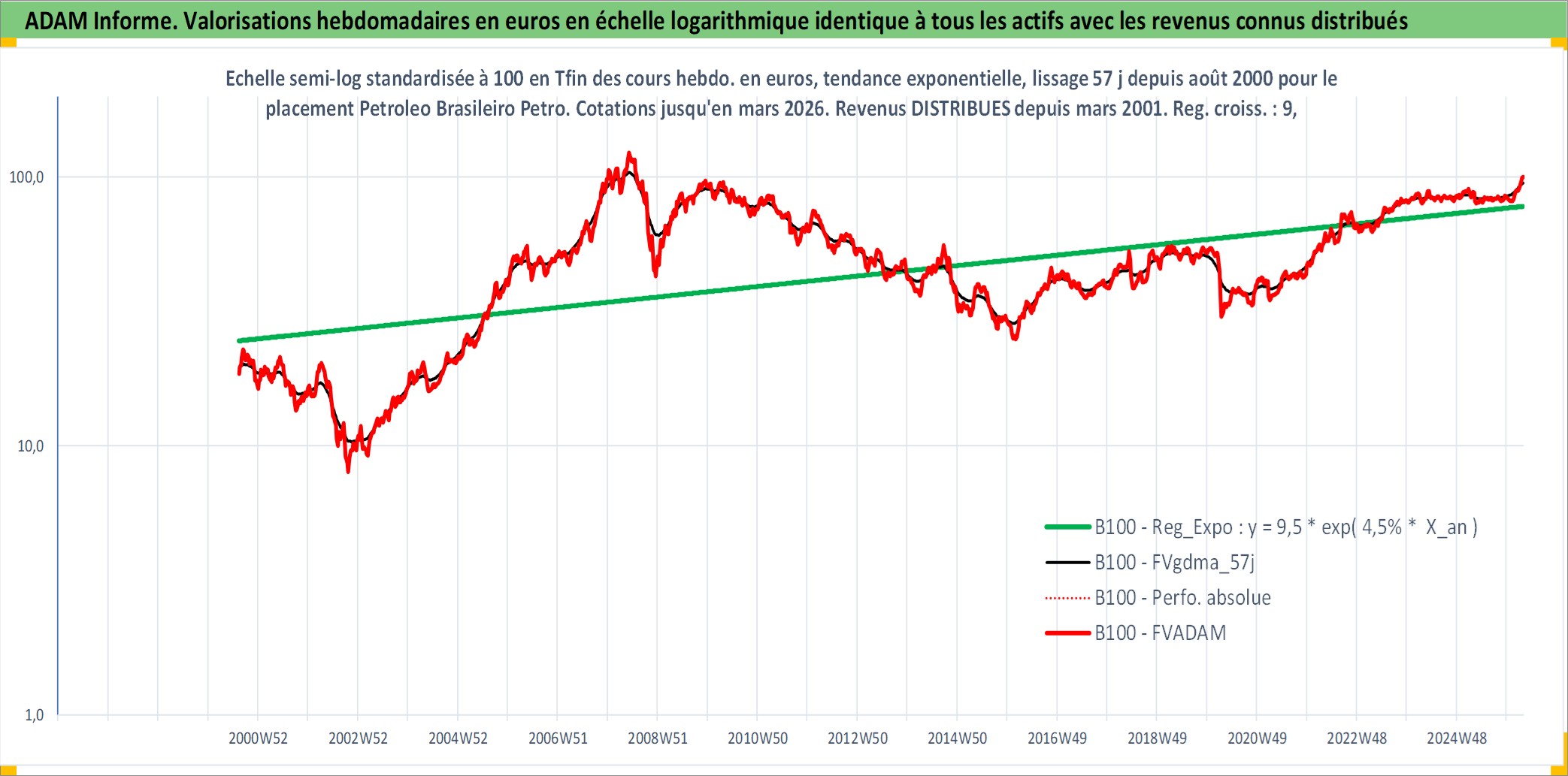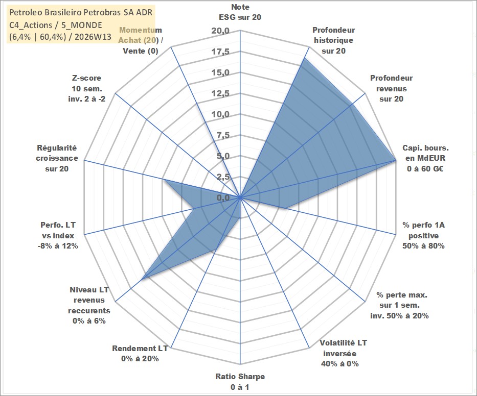 Site dédié aux investisseursPage dédiée sur site financeAnalyse des valorisations hebdomadaires de l'action Petroleo Brasileiro Petrobras SA ADR. Cet actif est cote en USD. Les valorisations sont en contrevaleur EURO et couvrent les semaines 2000W32 a 2026W13. Les revenus de cet actif financier sont pris en compte depuis la semaine 2001W12. La note ESG de cet actif n'est pas connue.