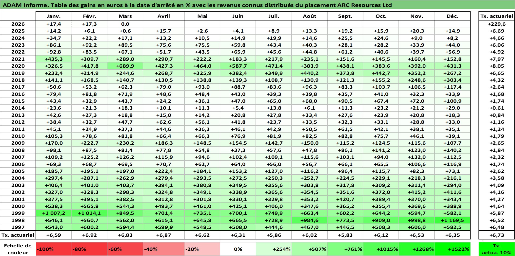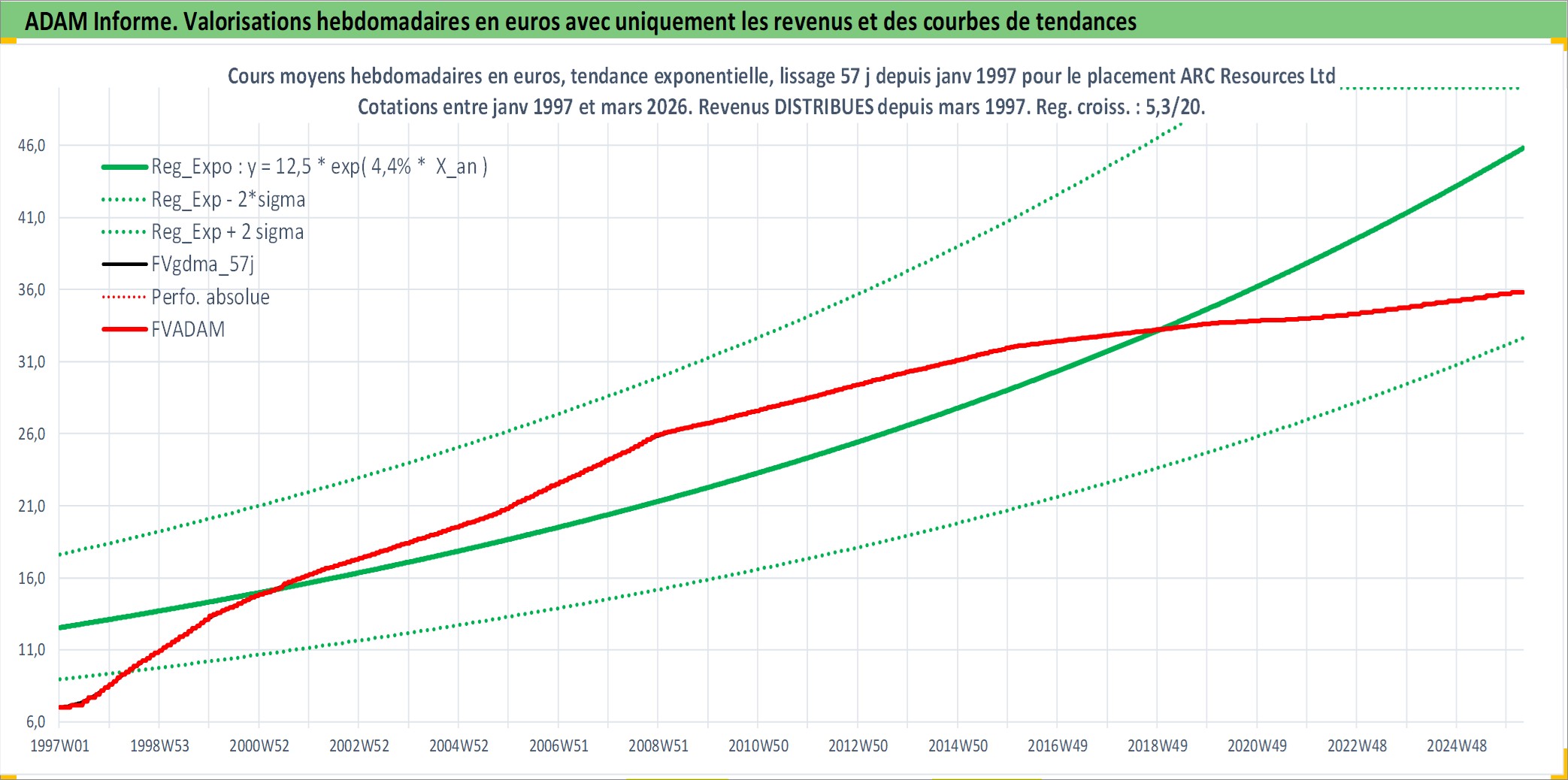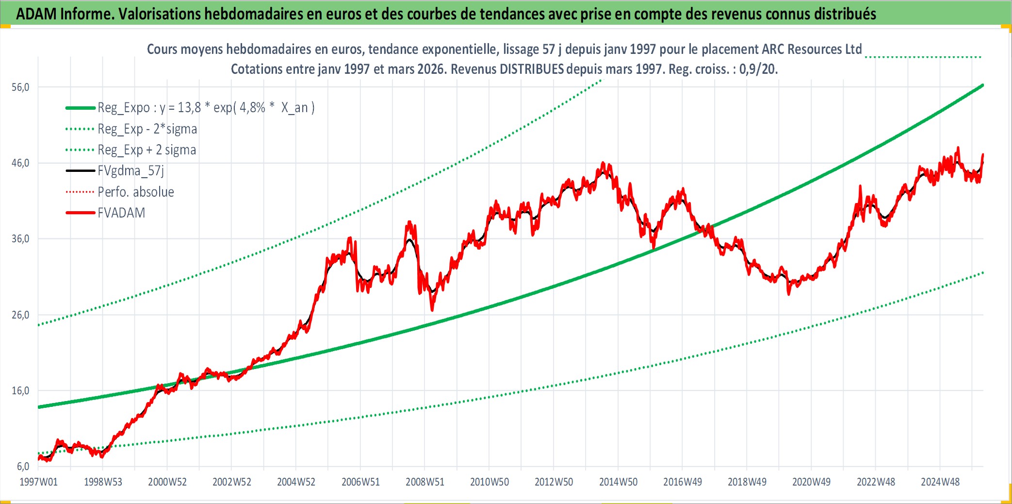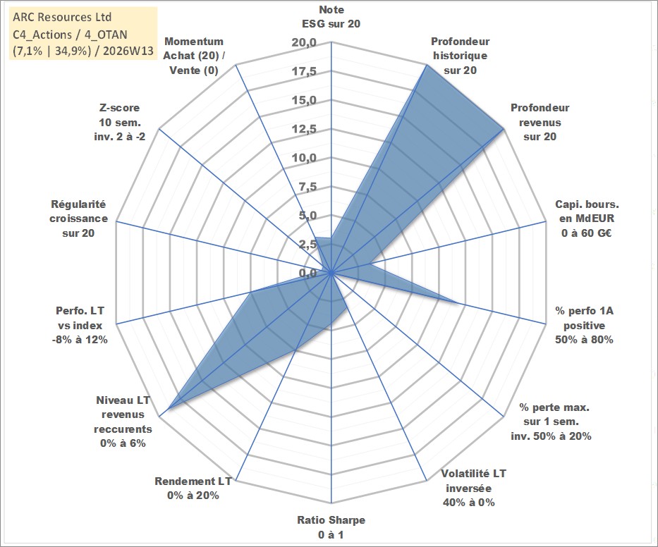 Site dédié aux investisseursPage dédiée sur site financeAnalyse des valorisations hebdomadaires de l'action ARC Resources Ltd. Cet actif est cote en CAD. Les valorisations sont en contrevaleur EURO et couvrent les semaines 1997W01 a 2026W13. Les revenus de cet actif financier sont pris en compte depuis la semaine 1997W13. La note globale ESG de cet actif est estimee a 3.0 (apres rebasage entre 0 et 20).
