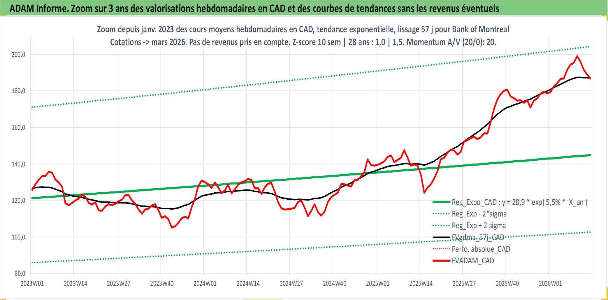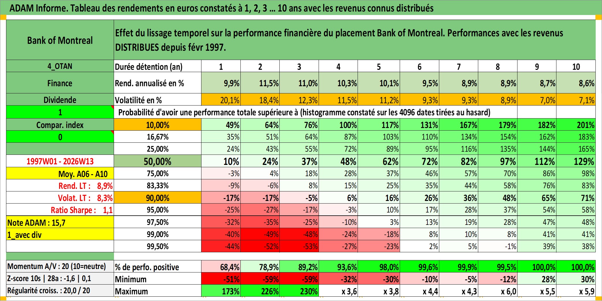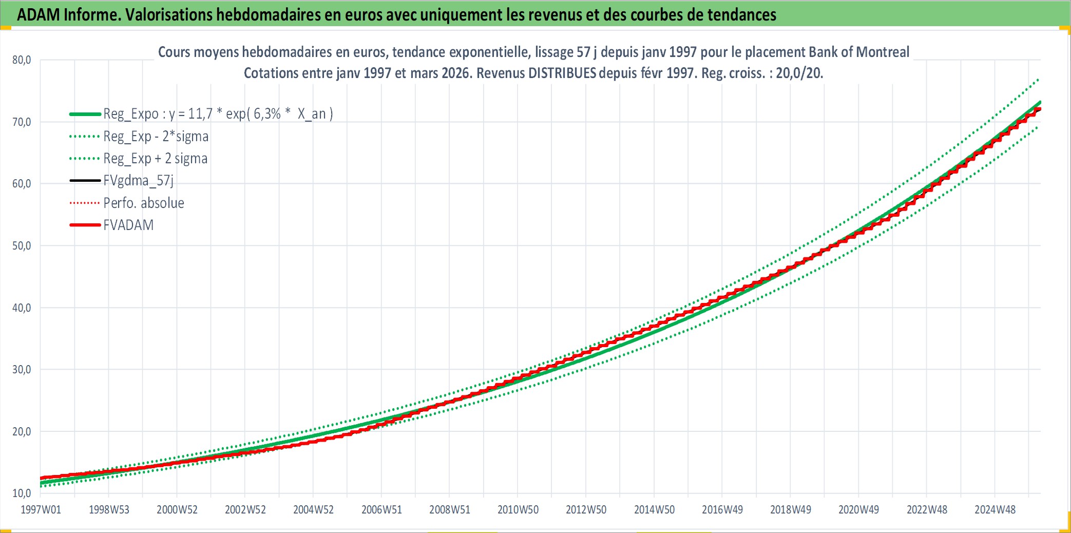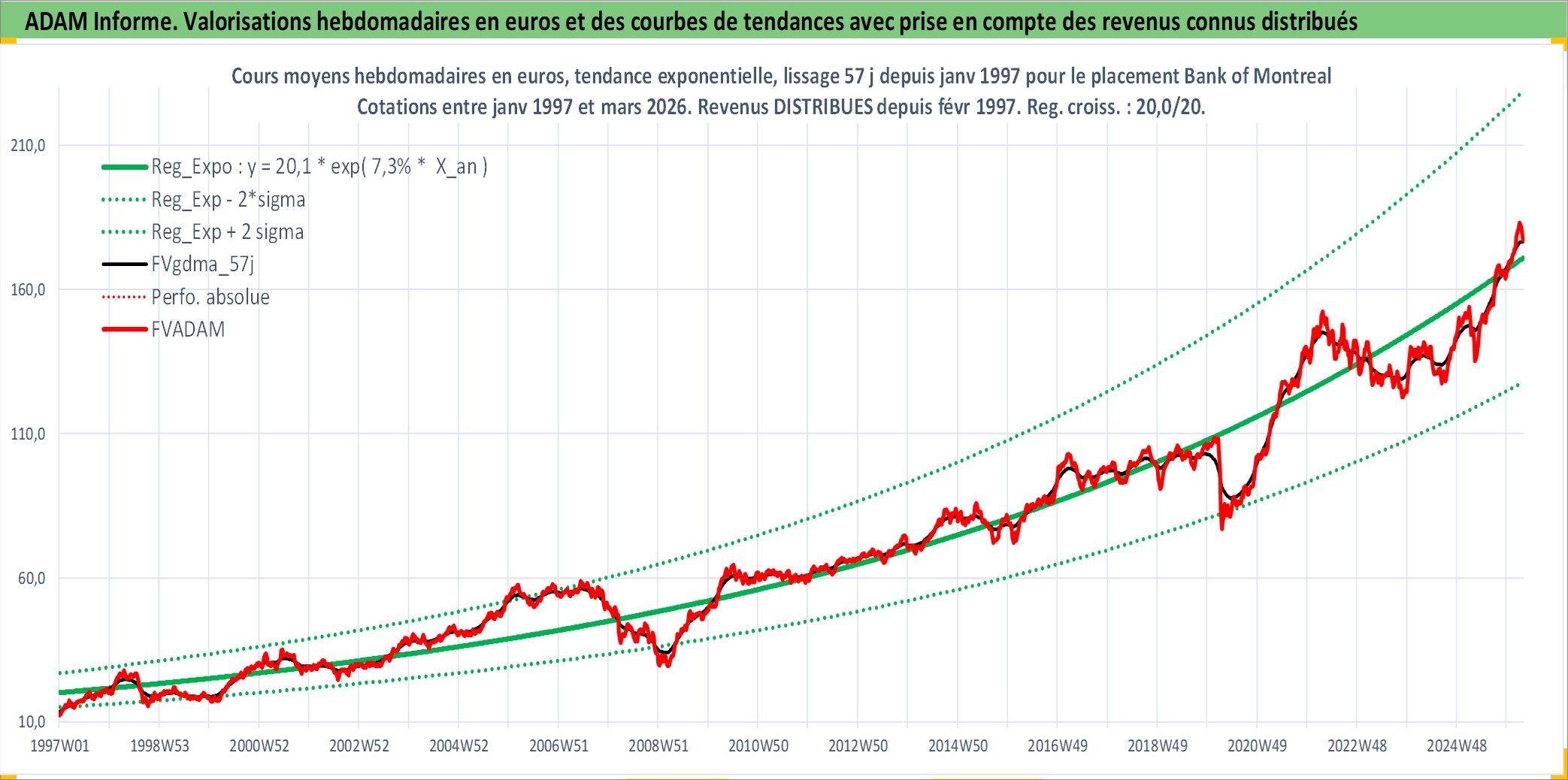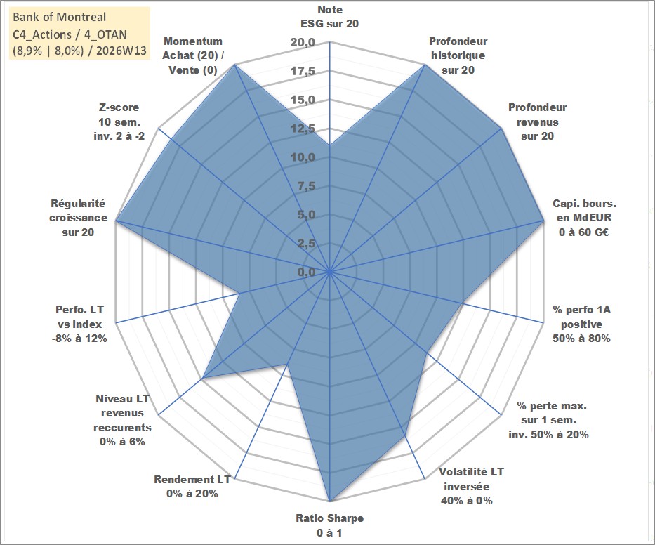 Site dédié aux investisseursPage dédiée sur site financeAnalyse des valorisations hebdomadaires de l'action Bank of Montreal. Cet actif est cote en CAD. Les valorisations sont en contrevaleur EURO et couvrent les semaines 1997W01 a 2026W13. Les revenus de cet actif financier sont pris en compte depuis la semaine 1997W06. La note globale ESG de cet actif est estimee a 11.0 (apres rebasage entre 0 et 20).