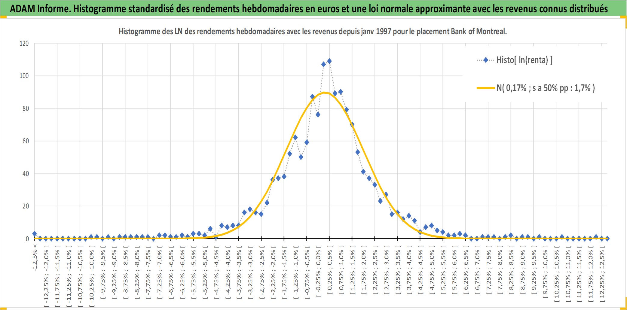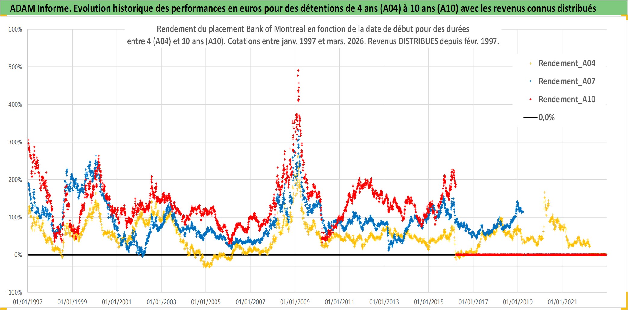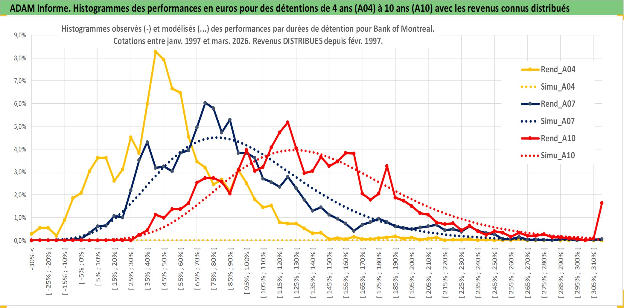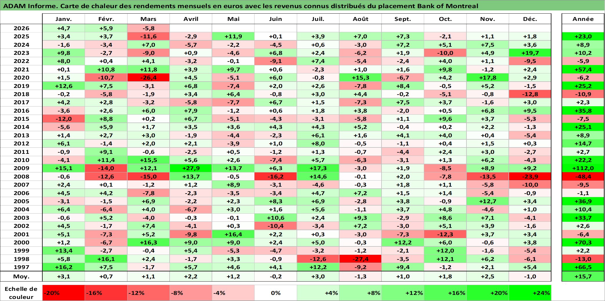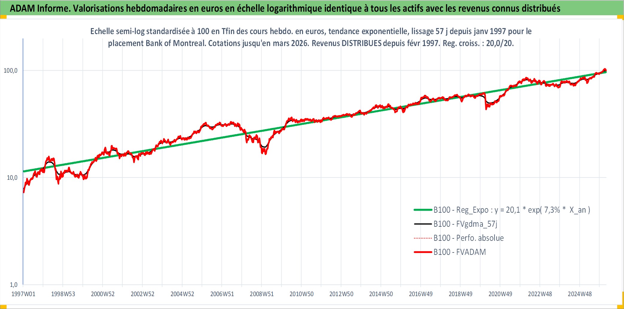 Site dédié aux investisseursPage dédiée sur site financeAnalyse des valorisations hebdomadaires de l'action Bank of Montreal. Cet actif est cote en CAD. Les valorisations sont en contrevaleur EURO et couvrent les semaines 1997W01 a 2026W13. Les revenus de cet actif financier sont pris en compte depuis la semaine 1997W06. La note globale ESG de cet actif est estimee a 11.0 (apres rebasage entre 0 et 20).