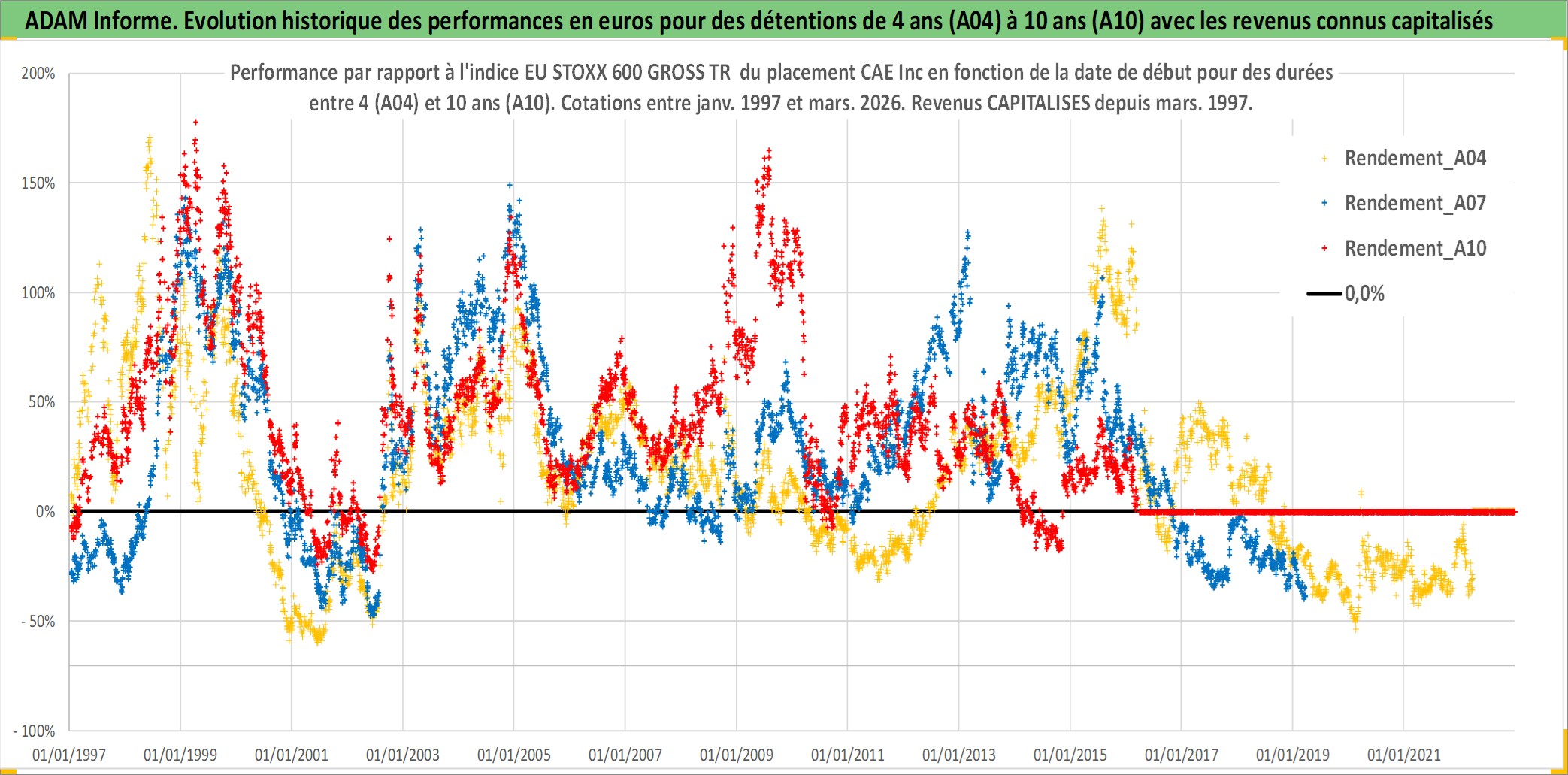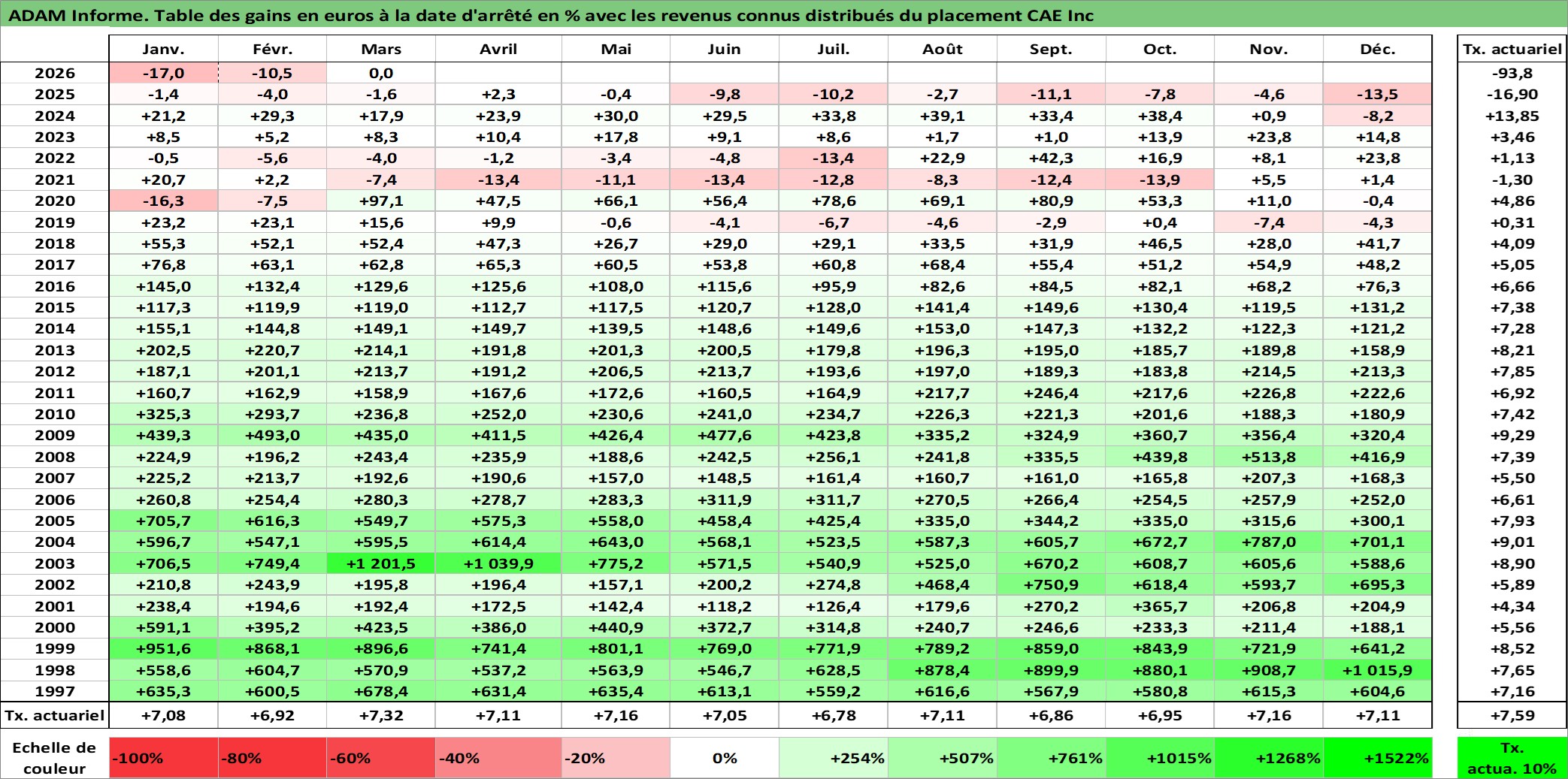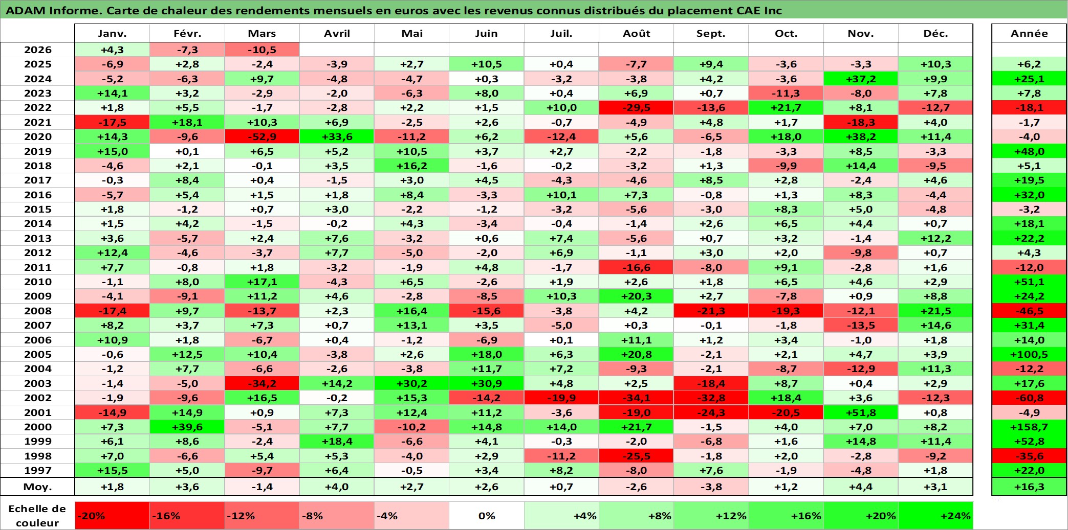 Site dédié aux investisseursPage dédiée sur site financeAnalyse des valorisations hebdomadaires de l'action CAE Inc. Cet actif est cote en CAD. Les valorisations sont en contrevaleur EURO et couvrent les semaines 1997W01 a 2026W13. Les revenus de cet actif financier sont pris en compte depuis la semaine 1997W11. La note ESG de cet actif n'est pas connue.