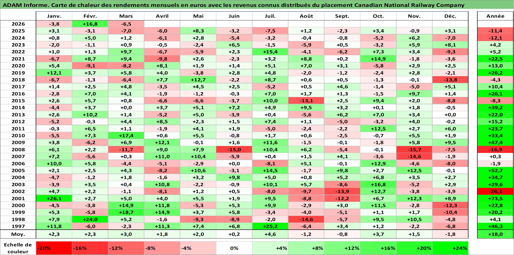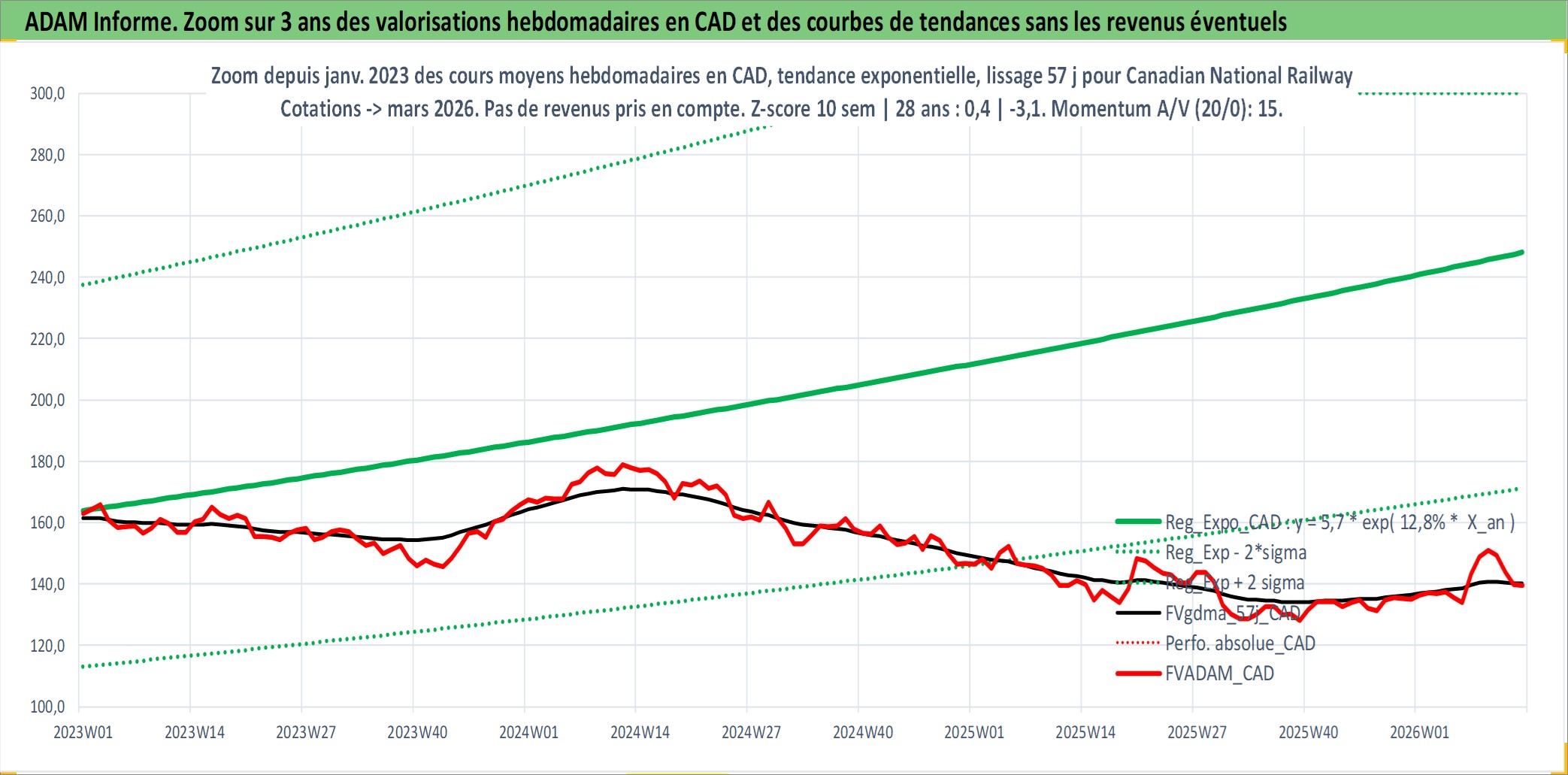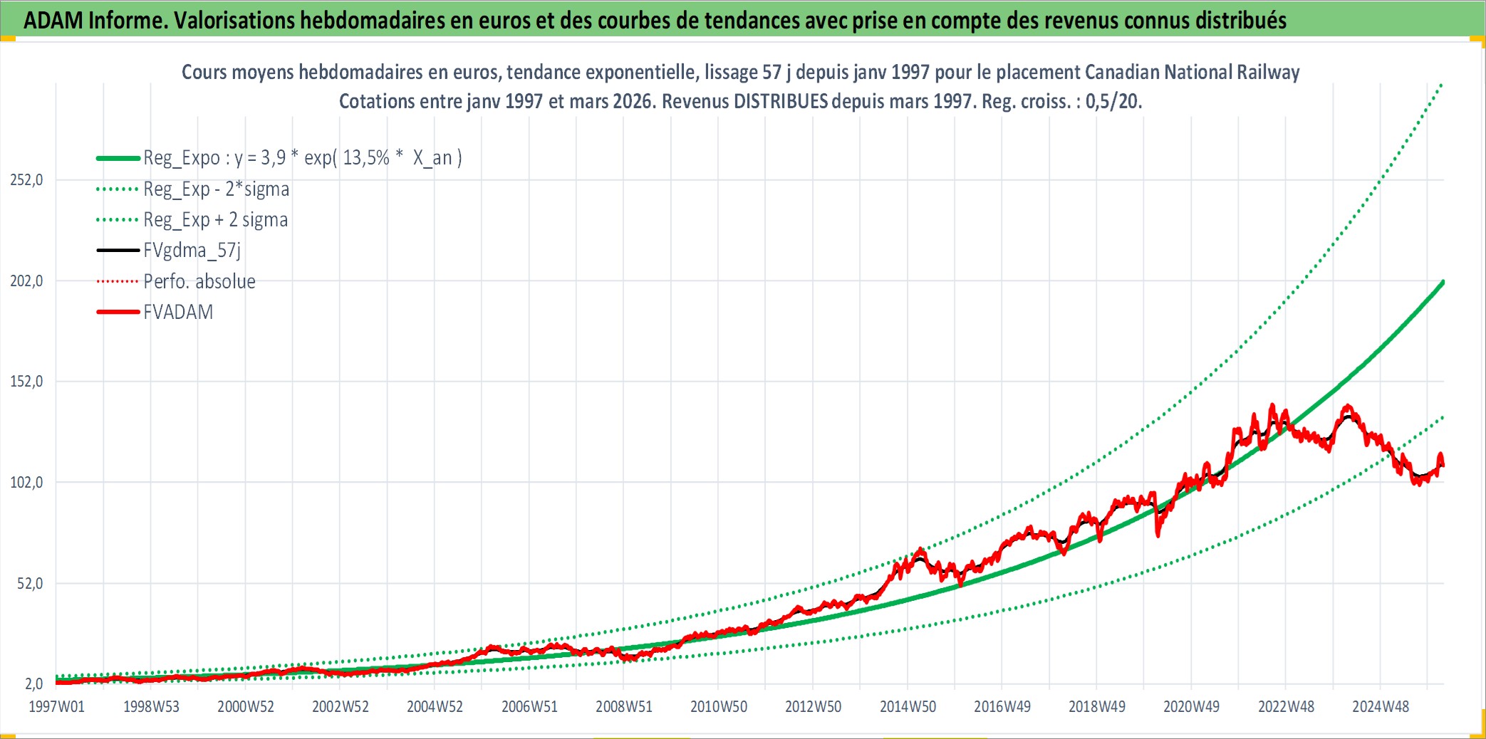Site dédié aux investisseursPage dédiée sur site financeAnalyse des valorisations hebdomadaires de l'action Canadian National Railway Company. Cet actif est cote en CAD. Les valorisations sont en contrevaleur EURO et couvrent les semaines 1997W01 a 2026W13. Les revenus de cet actif financier sont pris en compte depuis la semaine 1997W10. La note globale ESG de cet actif est estimee a 13.0 (apres rebasage entre 0 et 20).