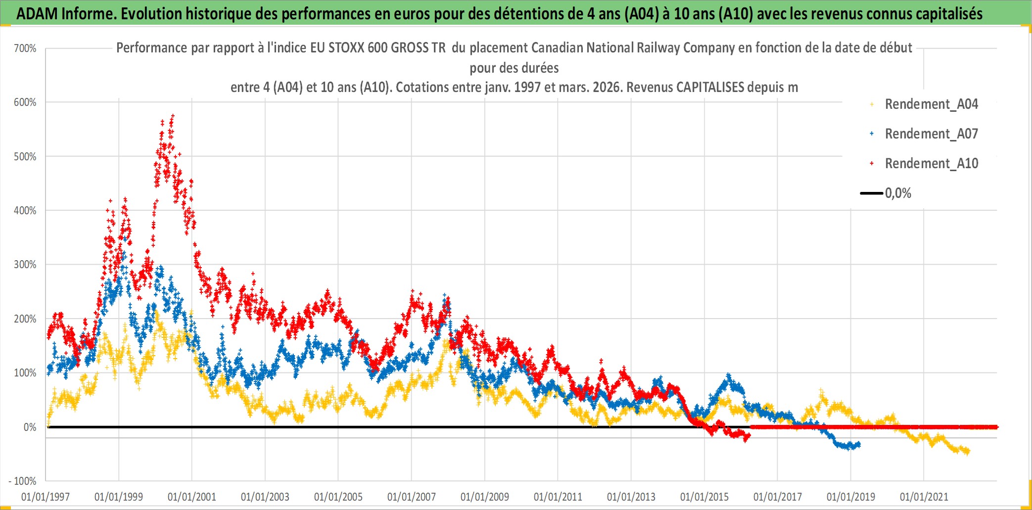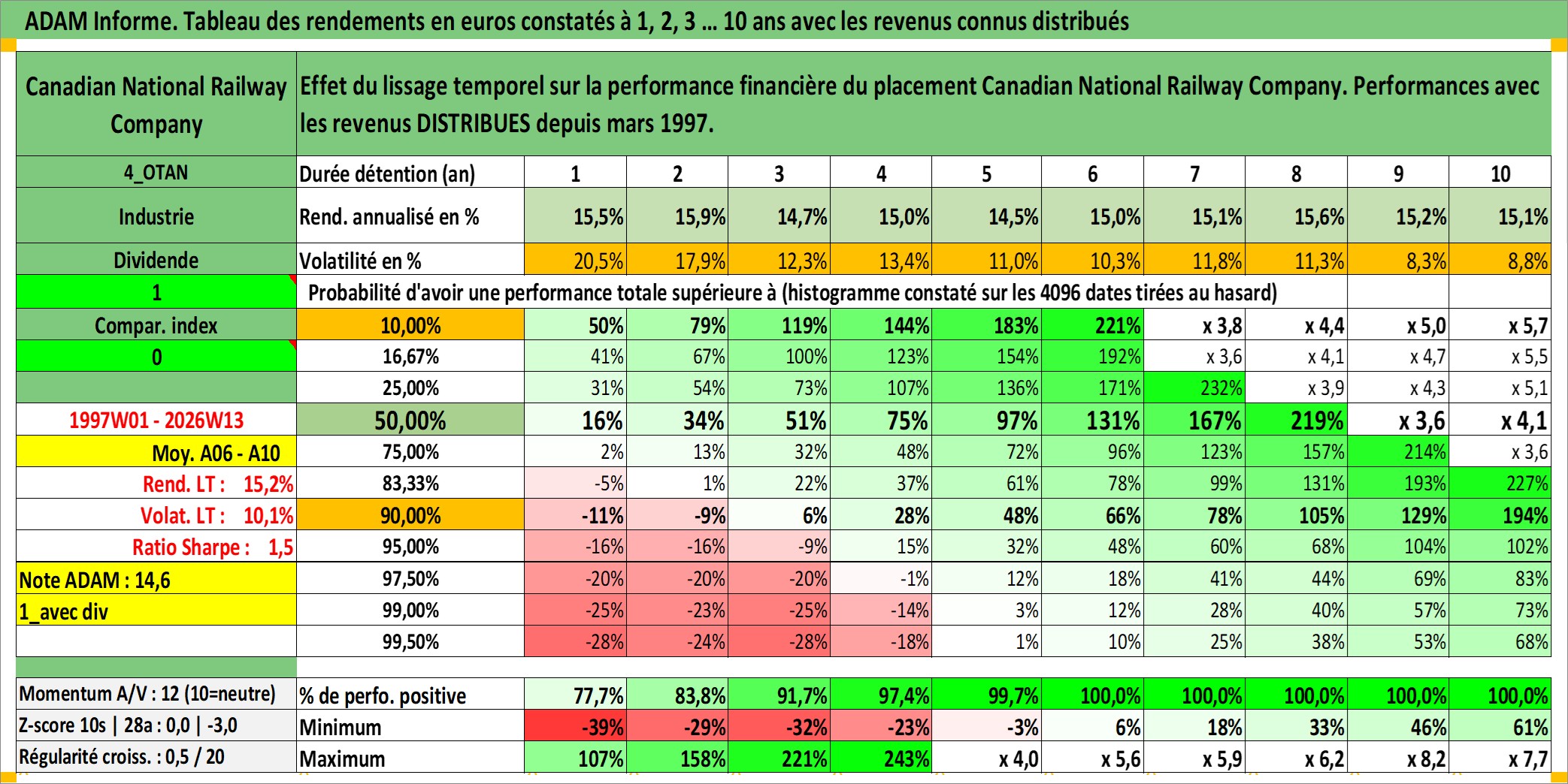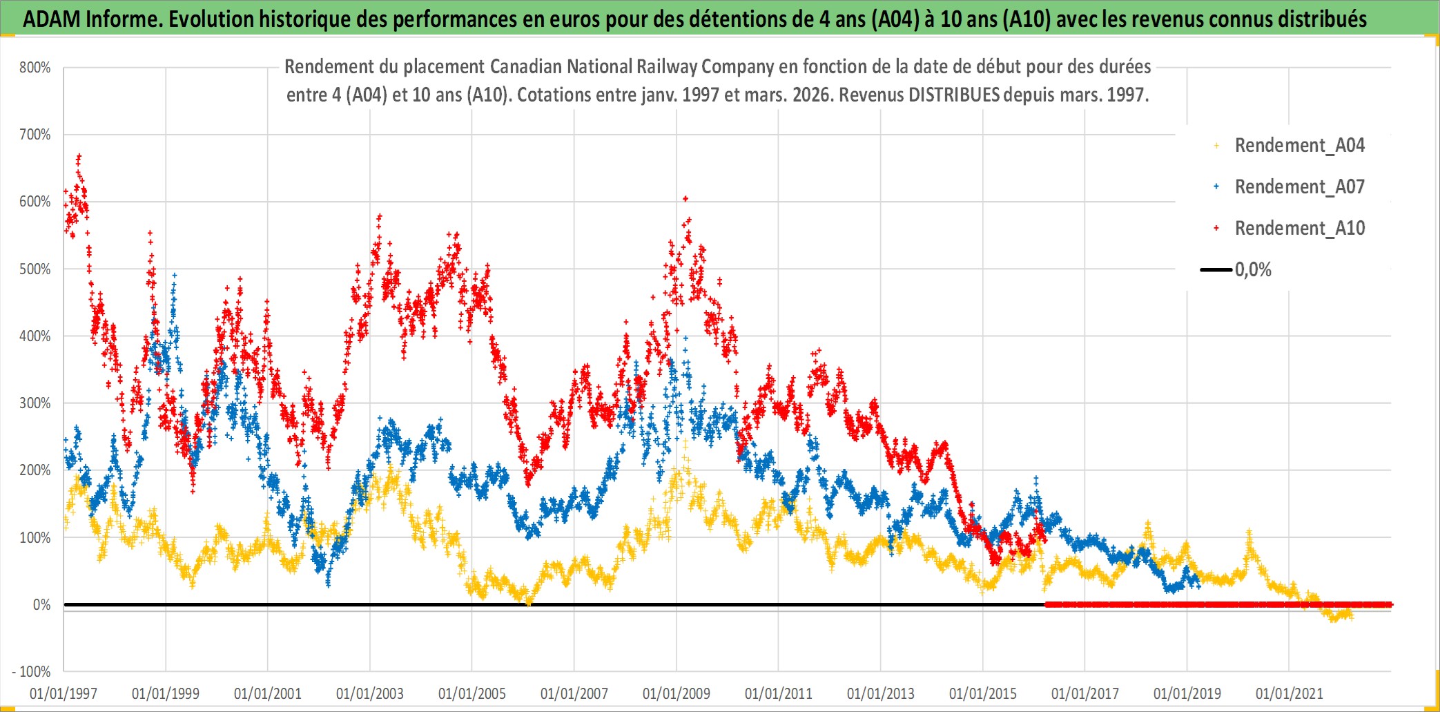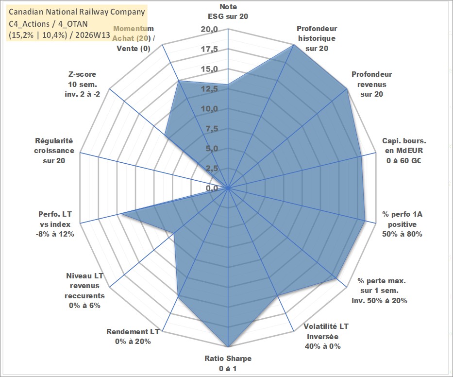 Site dédié aux investisseursPage dédiée sur site financeAnalyse des valorisations hebdomadaires de l'action Canadian National Railway Company. Cet actif est cote en CAD. Les valorisations sont en contrevaleur EURO et couvrent les semaines 1997W01 a 2026W13. Les revenus de cet actif financier sont pris en compte depuis la semaine 1997W10. La note globale ESG de cet actif est estimee a 13.0 (apres rebasage entre 0 et 20).