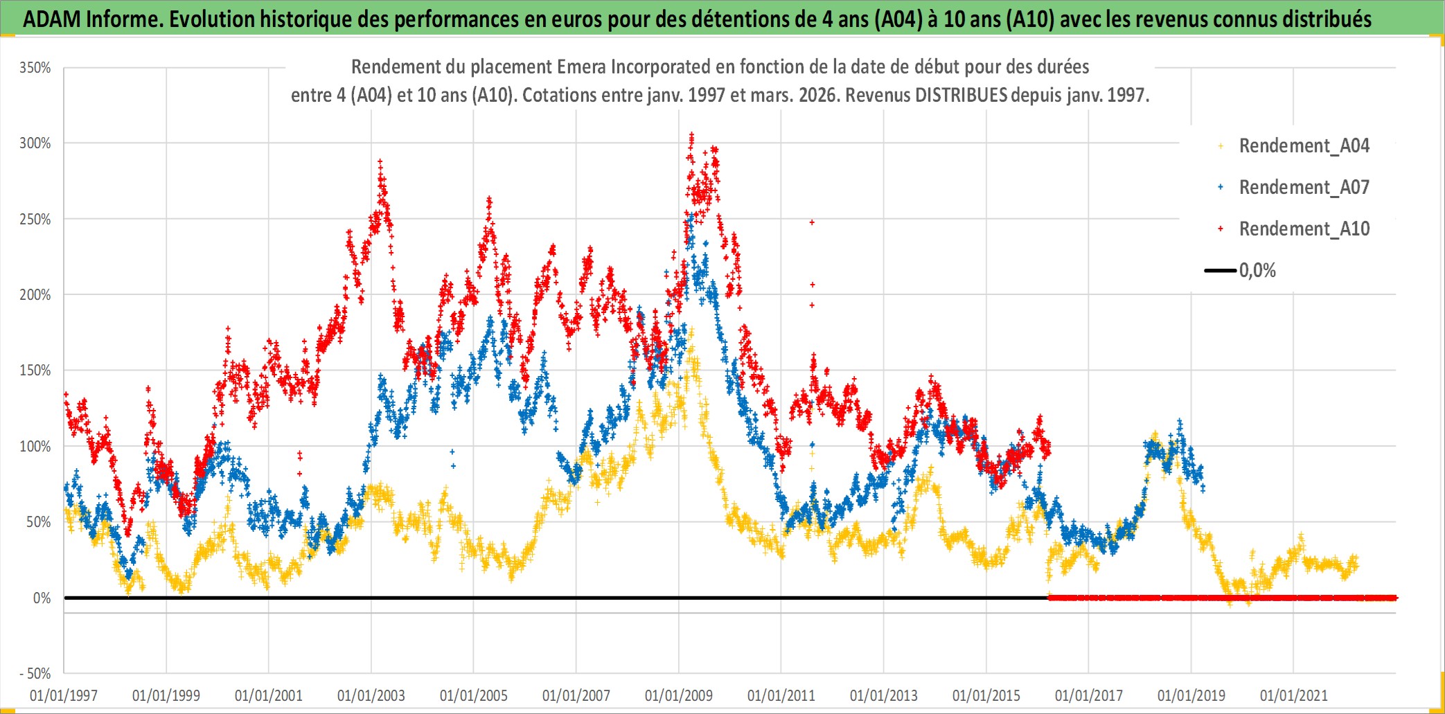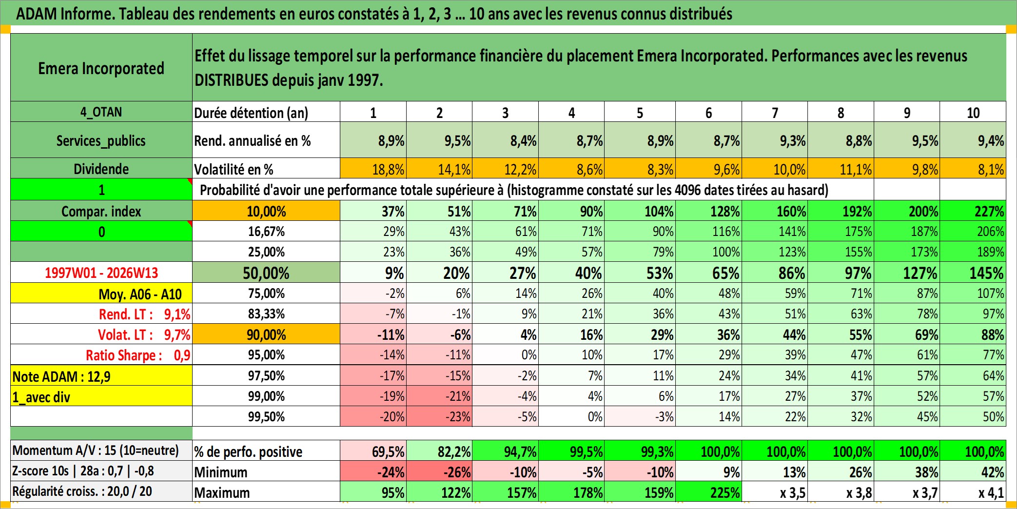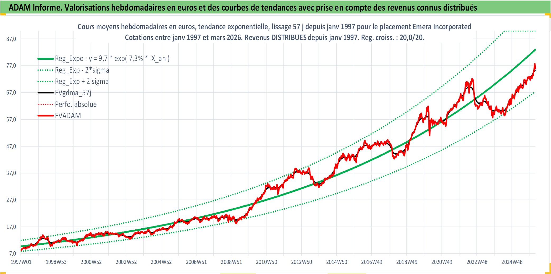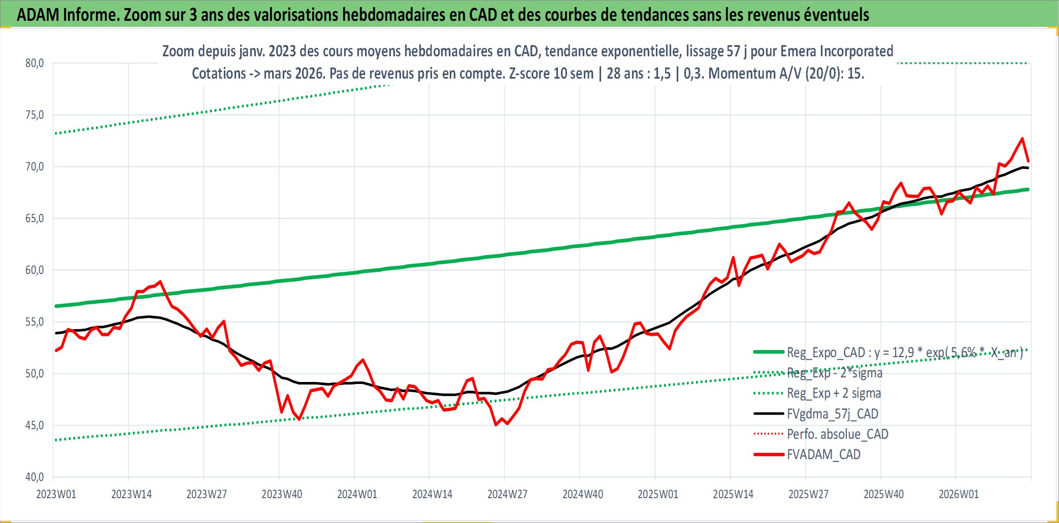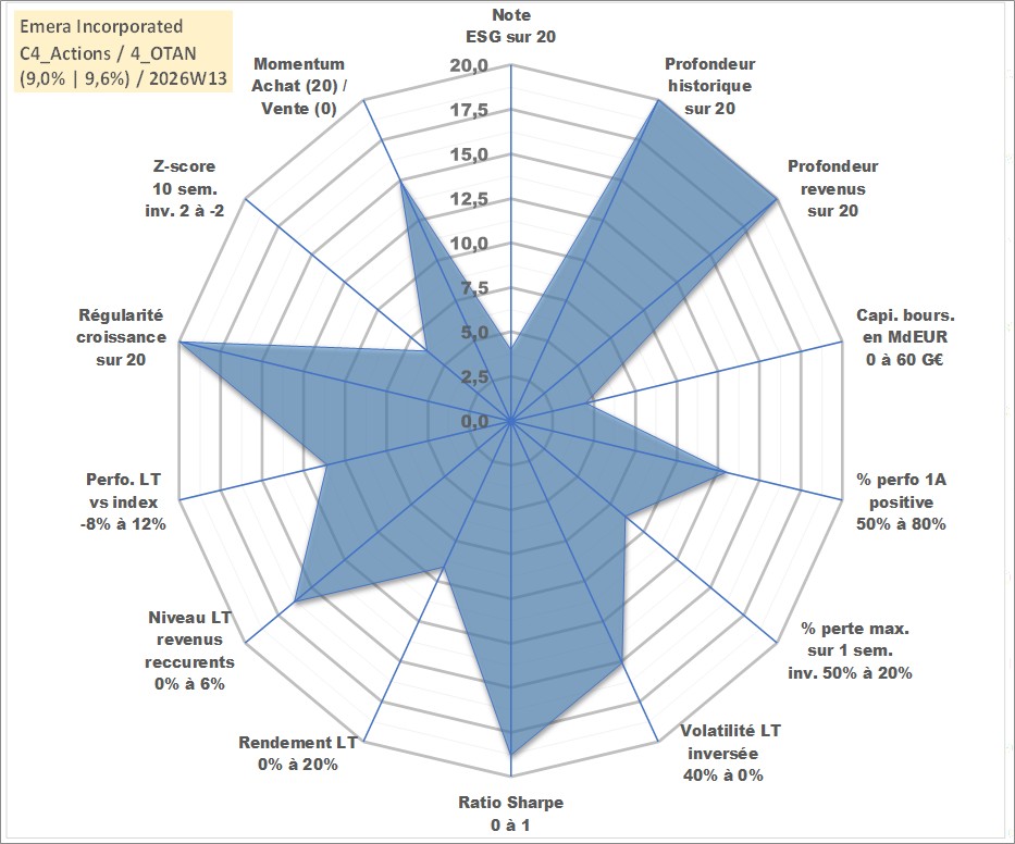 Site dédié aux investisseursPage dédiée sur site financeAnalyse des valorisations hebdomadaires de l'action Emera Incorporated. Cet actif est cote en CAD. Les valorisations sont en contrevaleur EURO et couvrent les semaines 1997W01 a 2026W13. Les revenus de cet actif financier sont pris en compte depuis la semaine 1997W05. La note globale ESG de cet actif est estimee a 4.0 (apres rebasage entre 0 et 20).