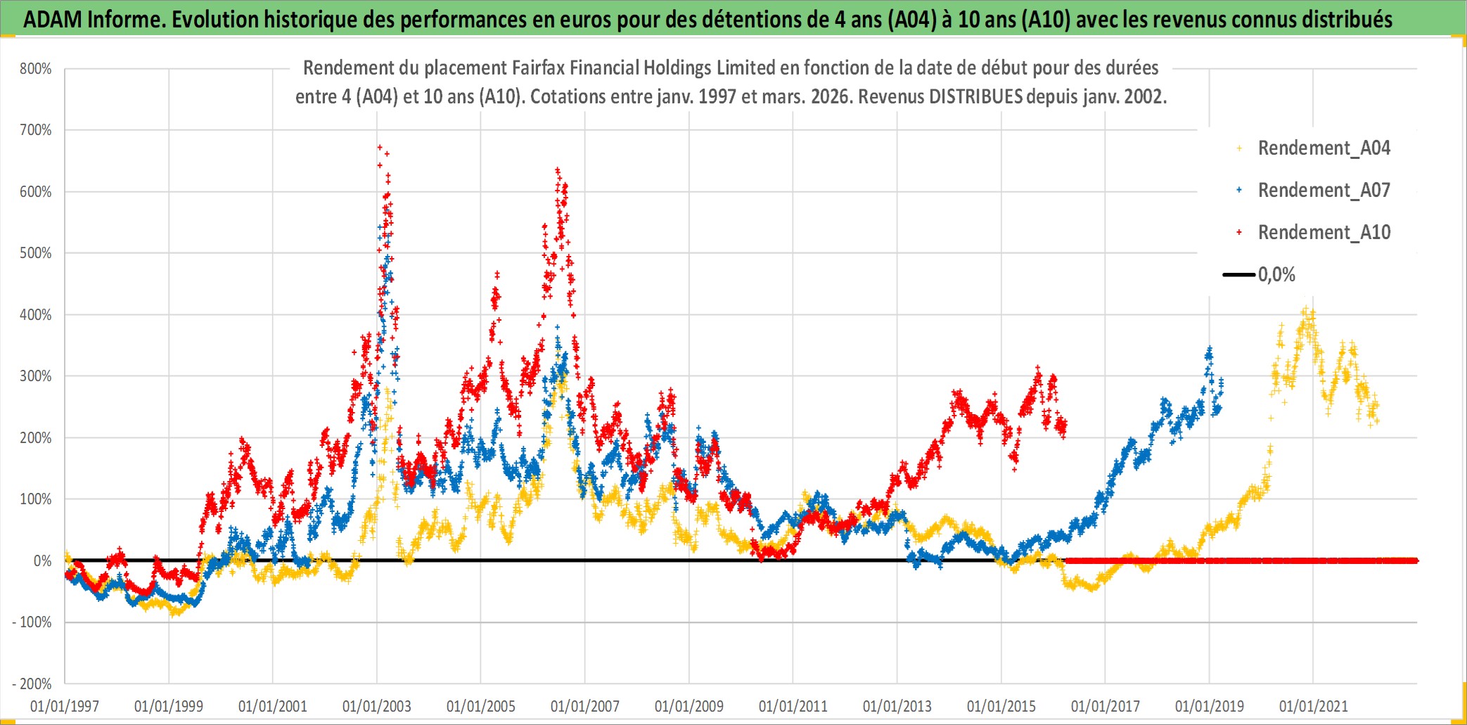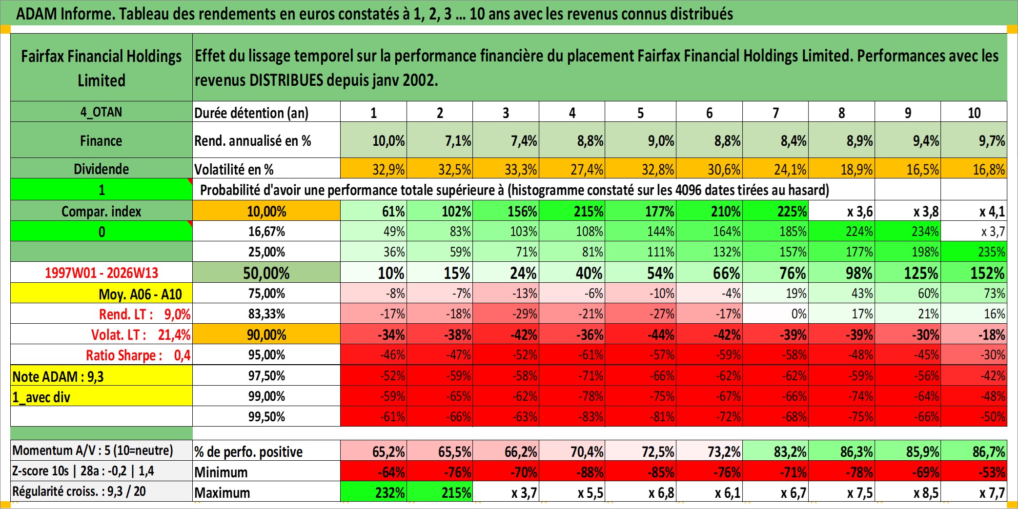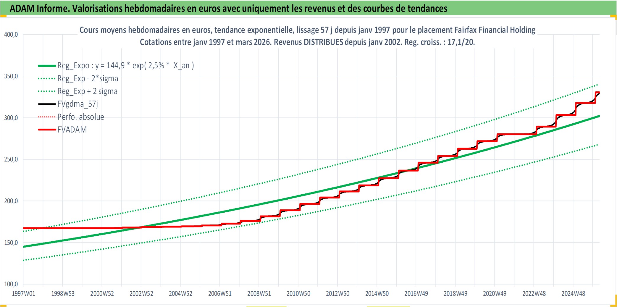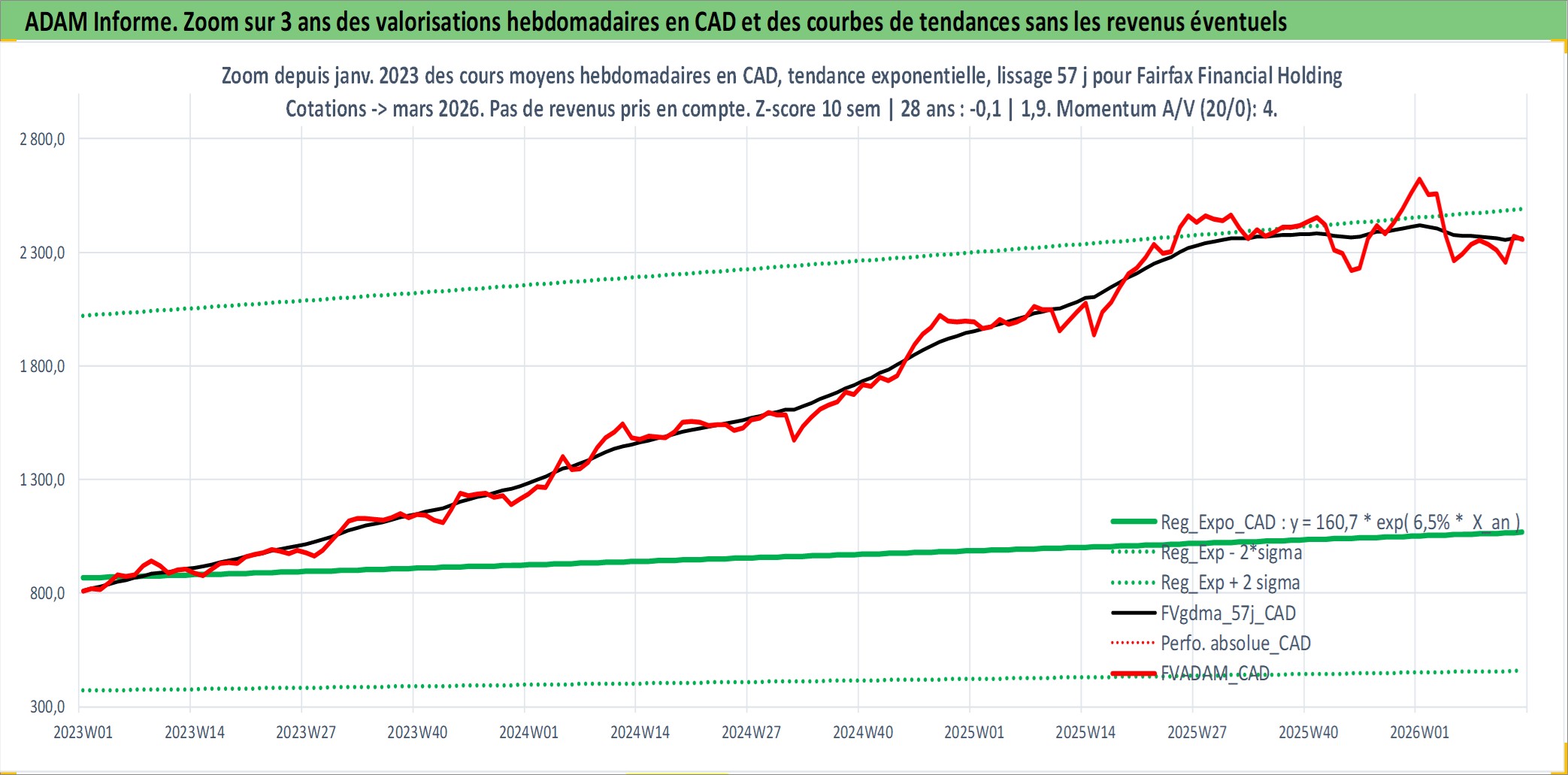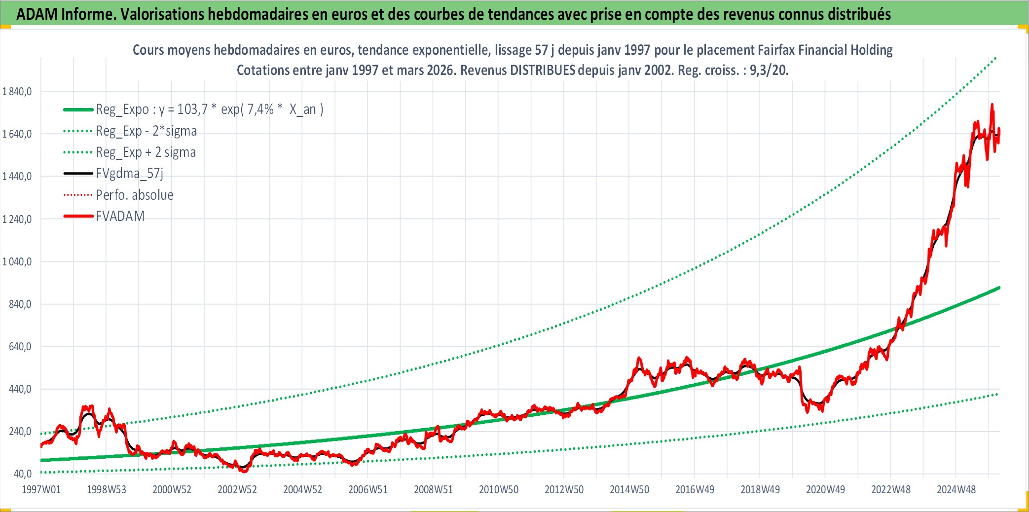 Site dédié aux investisseursPage dédiée sur site financeAnalyse des valorisations hebdomadaires de l'action Fairfax Financial Holdings Limited. Cet actif est cote en CAD. Les valorisations sont en contrevaleur EURO et couvrent les semaines 1997W01 a 2026W13. Les revenus de cet actif financier sont pris en compte depuis la semaine 2002W02. La note globale ESG de cet actif est estimee a 6.0 (apres rebasage entre 0 et 20).