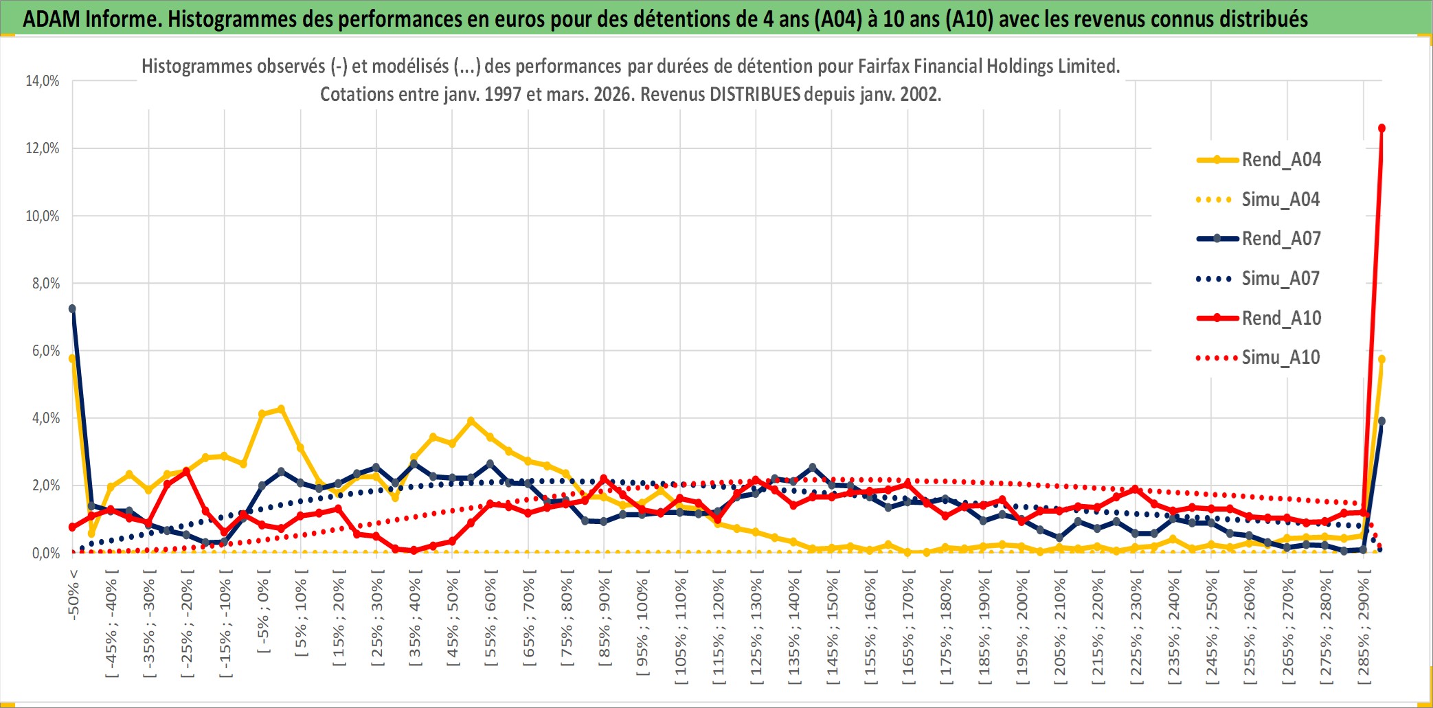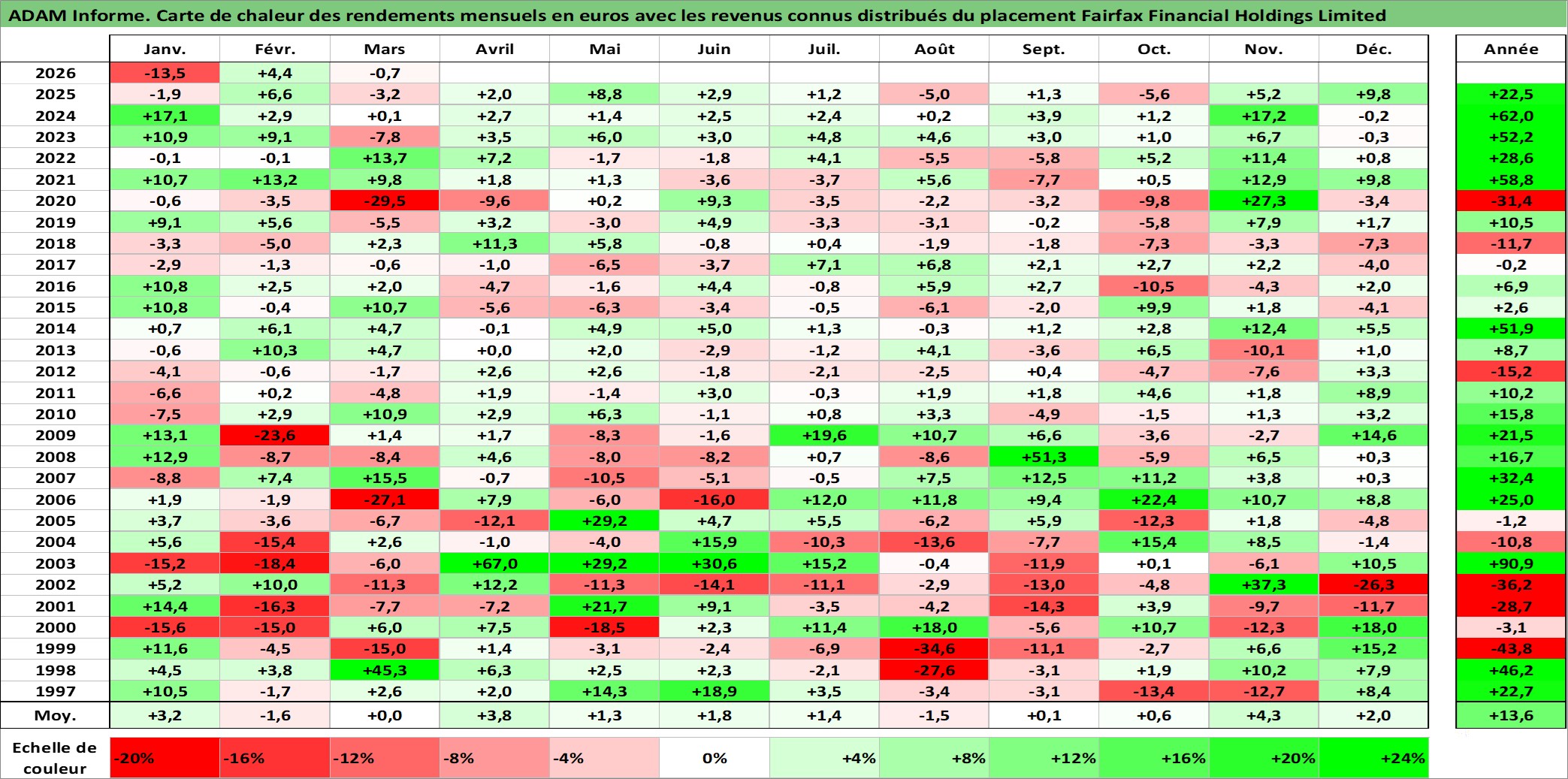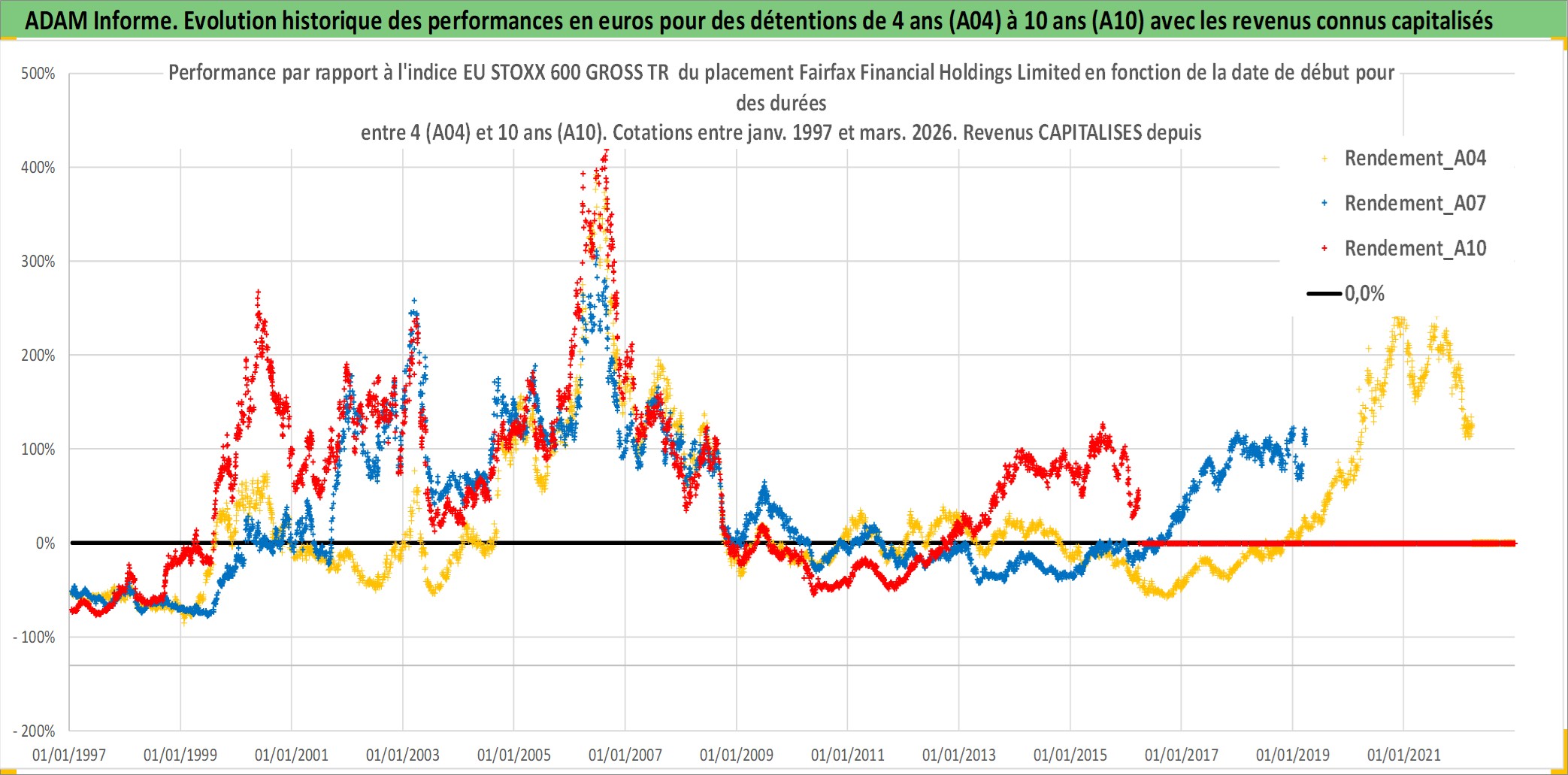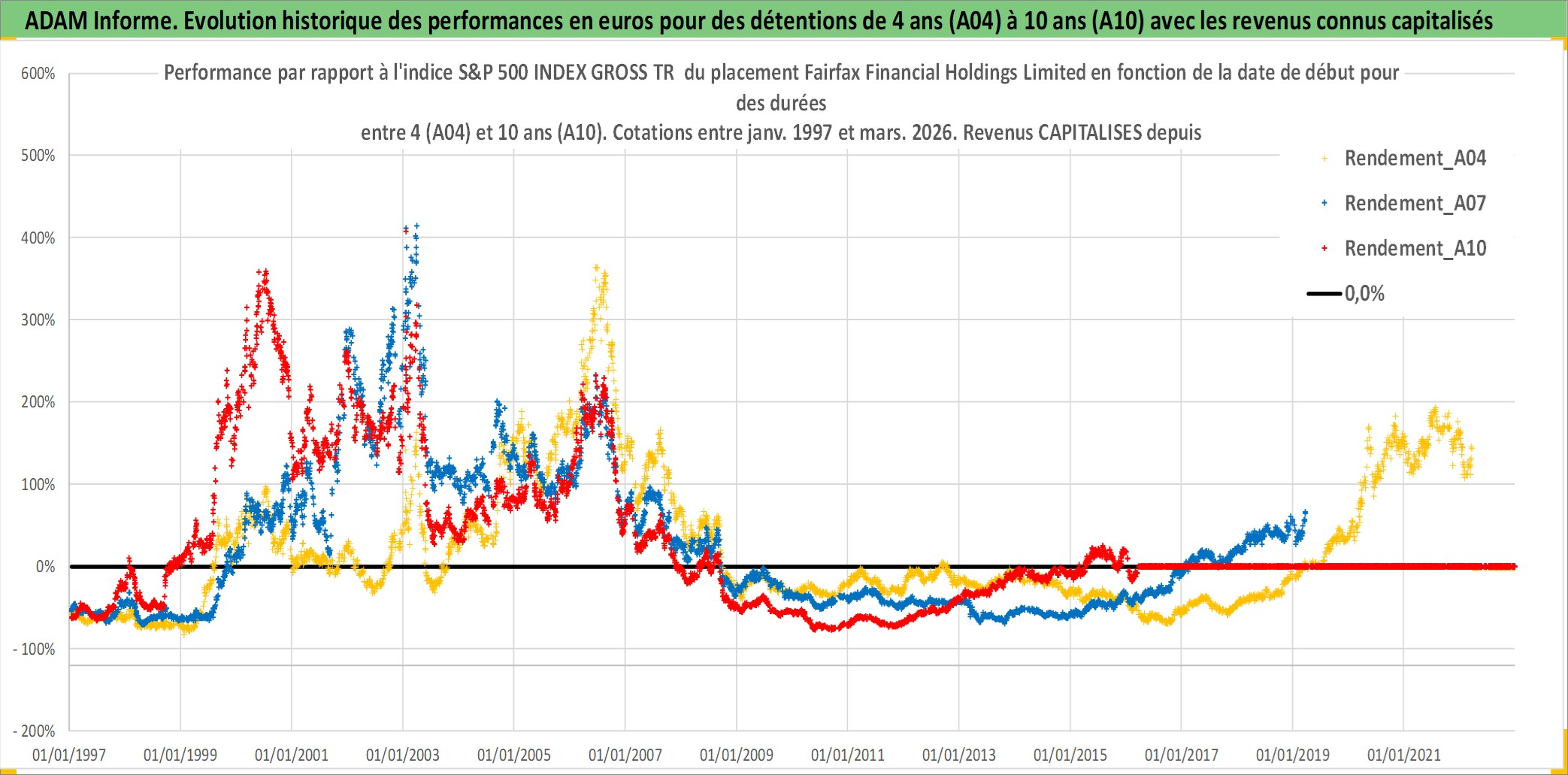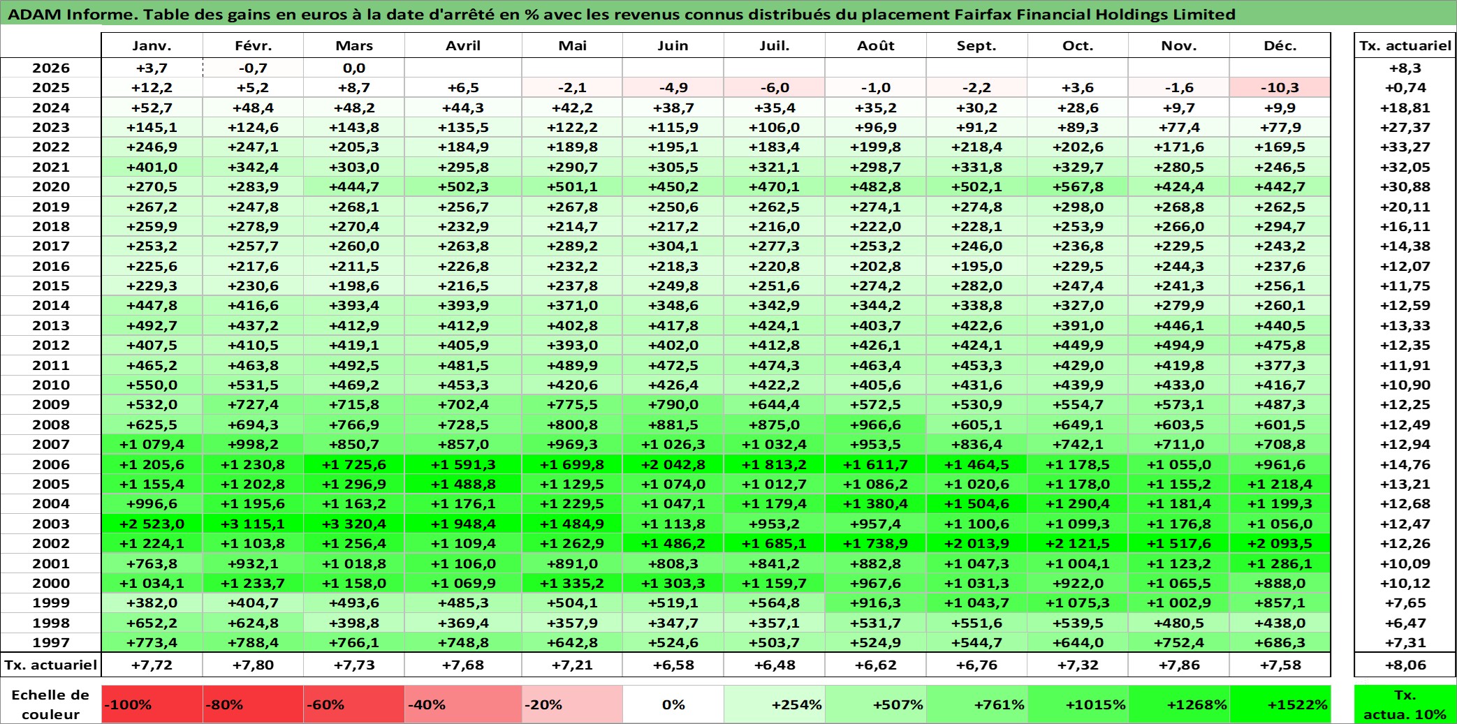 Site dédié aux investisseursPage dédiée sur site financeAnalyse des valorisations hebdomadaires de l'action Fairfax Financial Holdings Limited. Cet actif est cote en CAD. Les valorisations sont en contrevaleur EURO et couvrent les semaines 1997W01 a 2026W13. Les revenus de cet actif financier sont pris en compte depuis la semaine 2002W02. La note globale ESG de cet actif est estimee a 6.0 (apres rebasage entre 0 et 20).