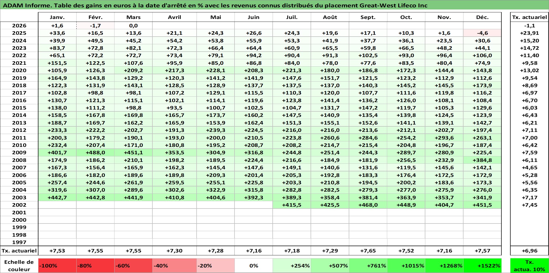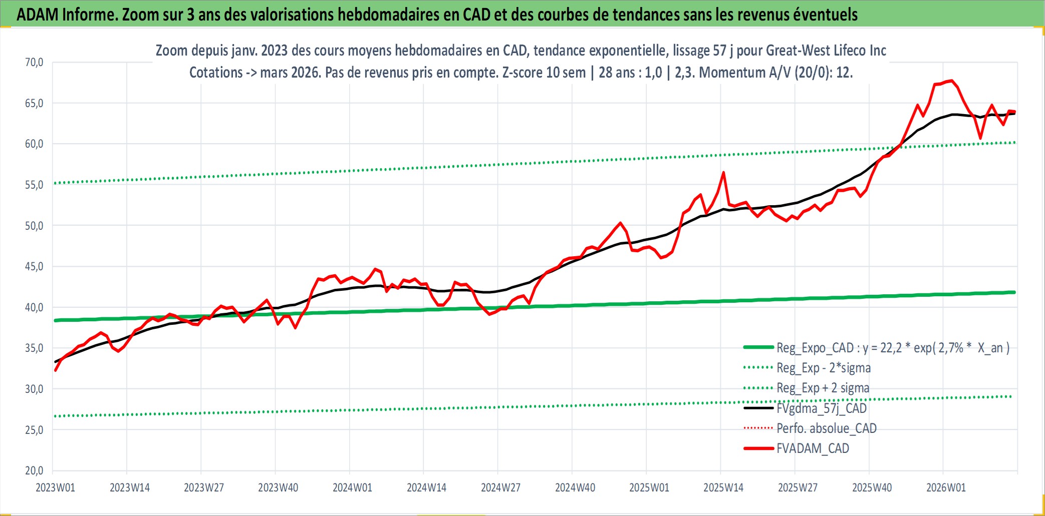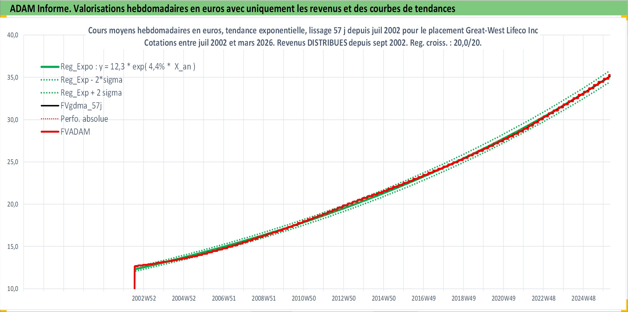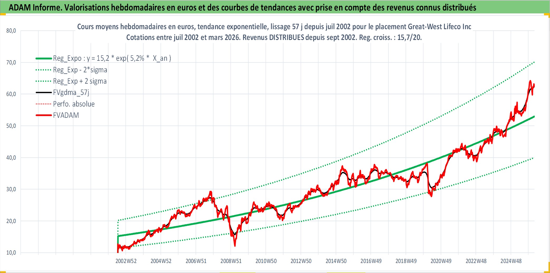 Site dédié aux investisseursPage dédiée sur site financeAnalyse des valorisations hebdomadaires de l'action Great-West Lifeco Inc. Cet actif est cote en CAD. Les valorisations sont en contrevaleur EURO et couvrent les semaines 2002W28 a 2026W13. Les revenus de cet actif financier sont pris en compte depuis la semaine 2002W37. La note globale ESG de cet actif est estimee a 8.0 (apres rebasage entre 0 et 20).