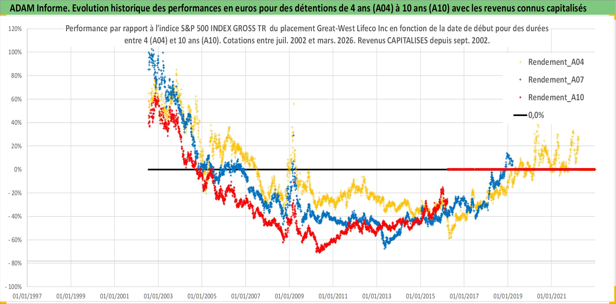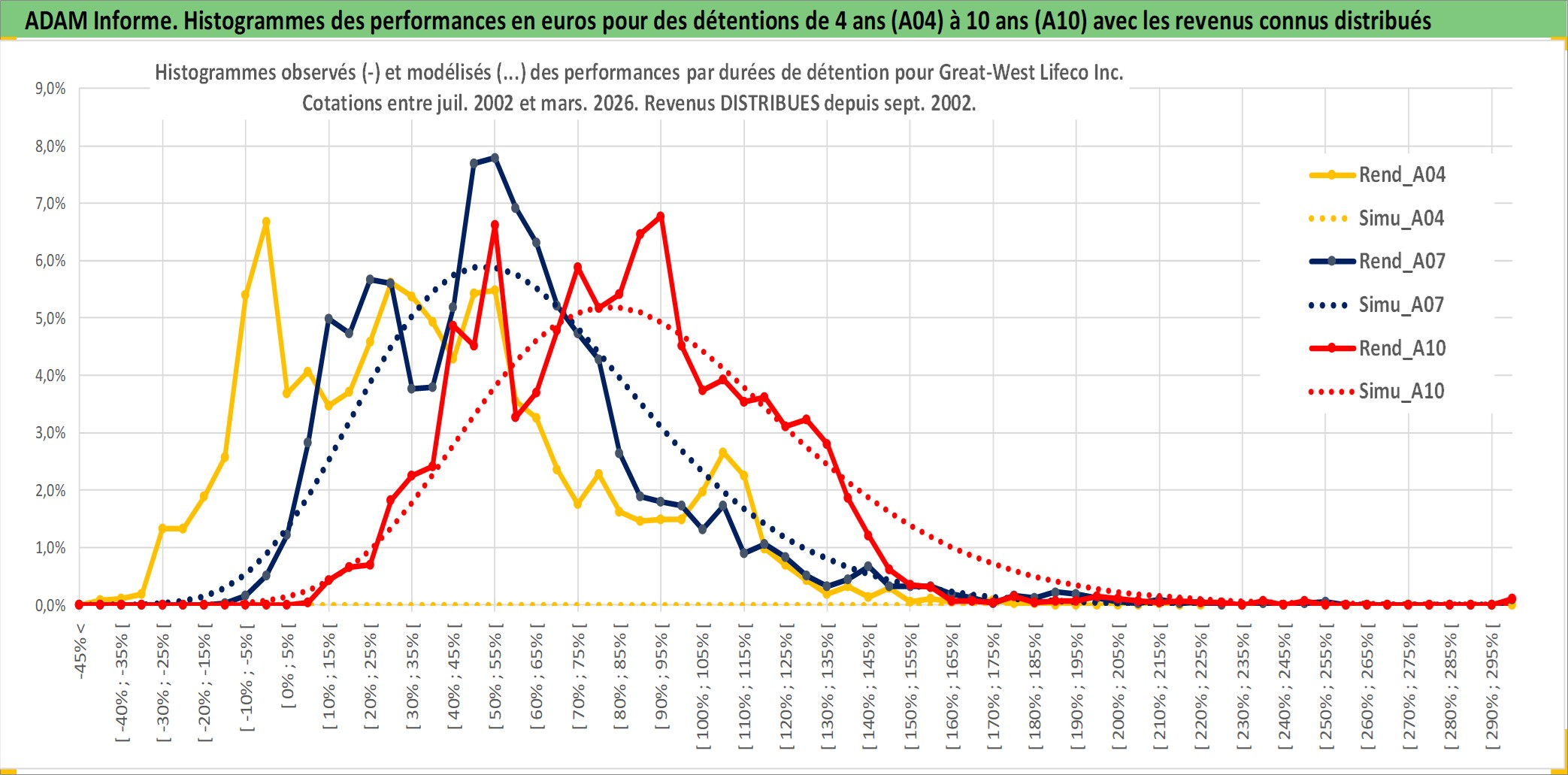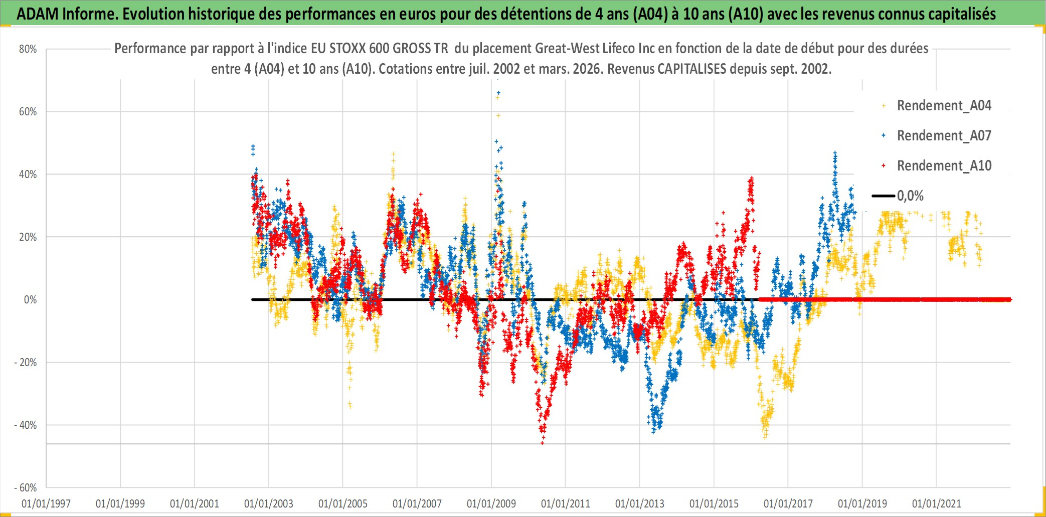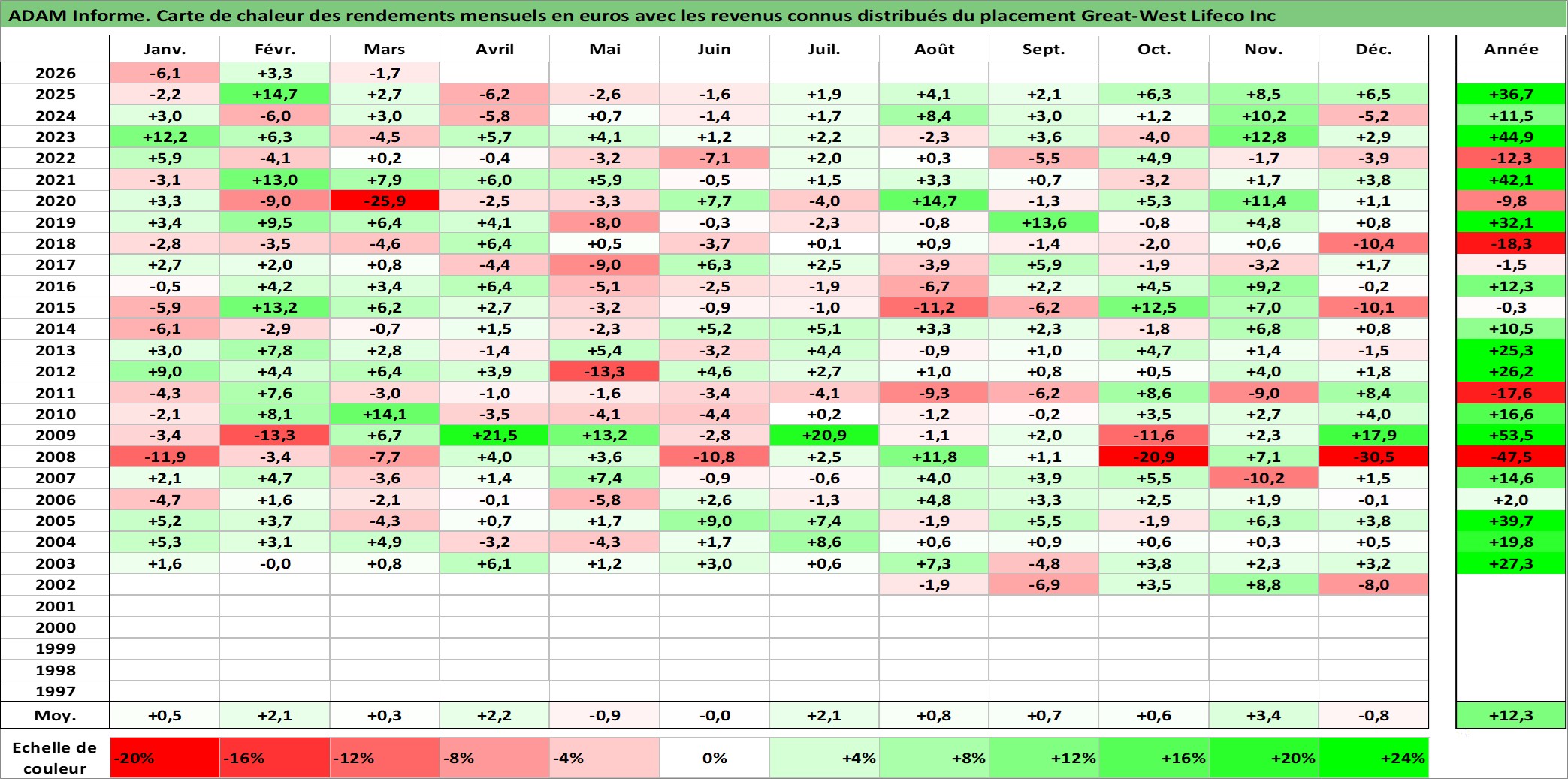 Site dédié aux investisseursPage dédiée sur site financeAnalyse des valorisations hebdomadaires de l'action Great-West Lifeco Inc. Cet actif est cote en CAD. Les valorisations sont en contrevaleur EURO et couvrent les semaines 2002W28 a 2026W13. Les revenus de cet actif financier sont pris en compte depuis la semaine 2002W37. La note globale ESG de cet actif est estimee a 8.0 (apres rebasage entre 0 et 20).