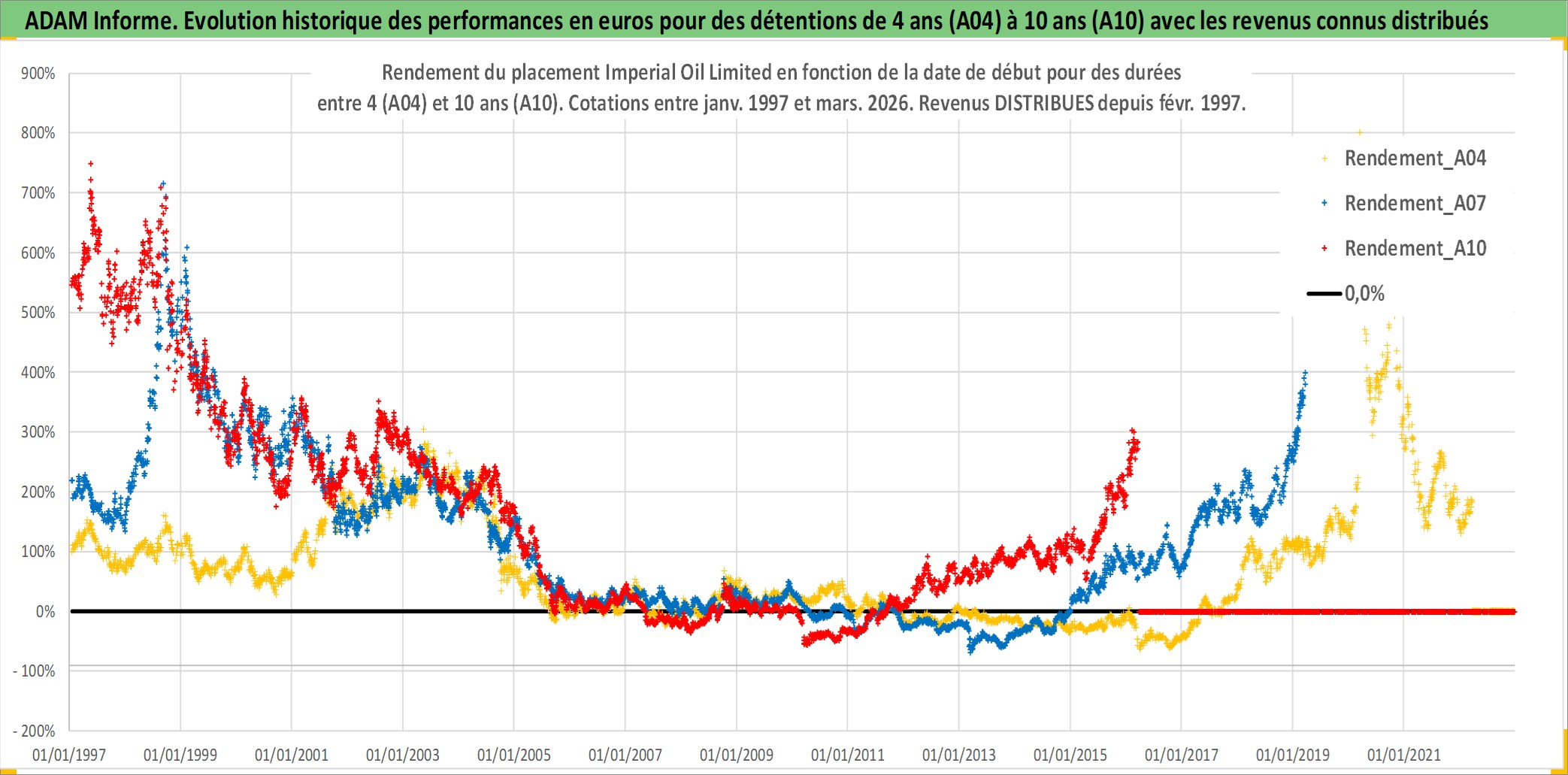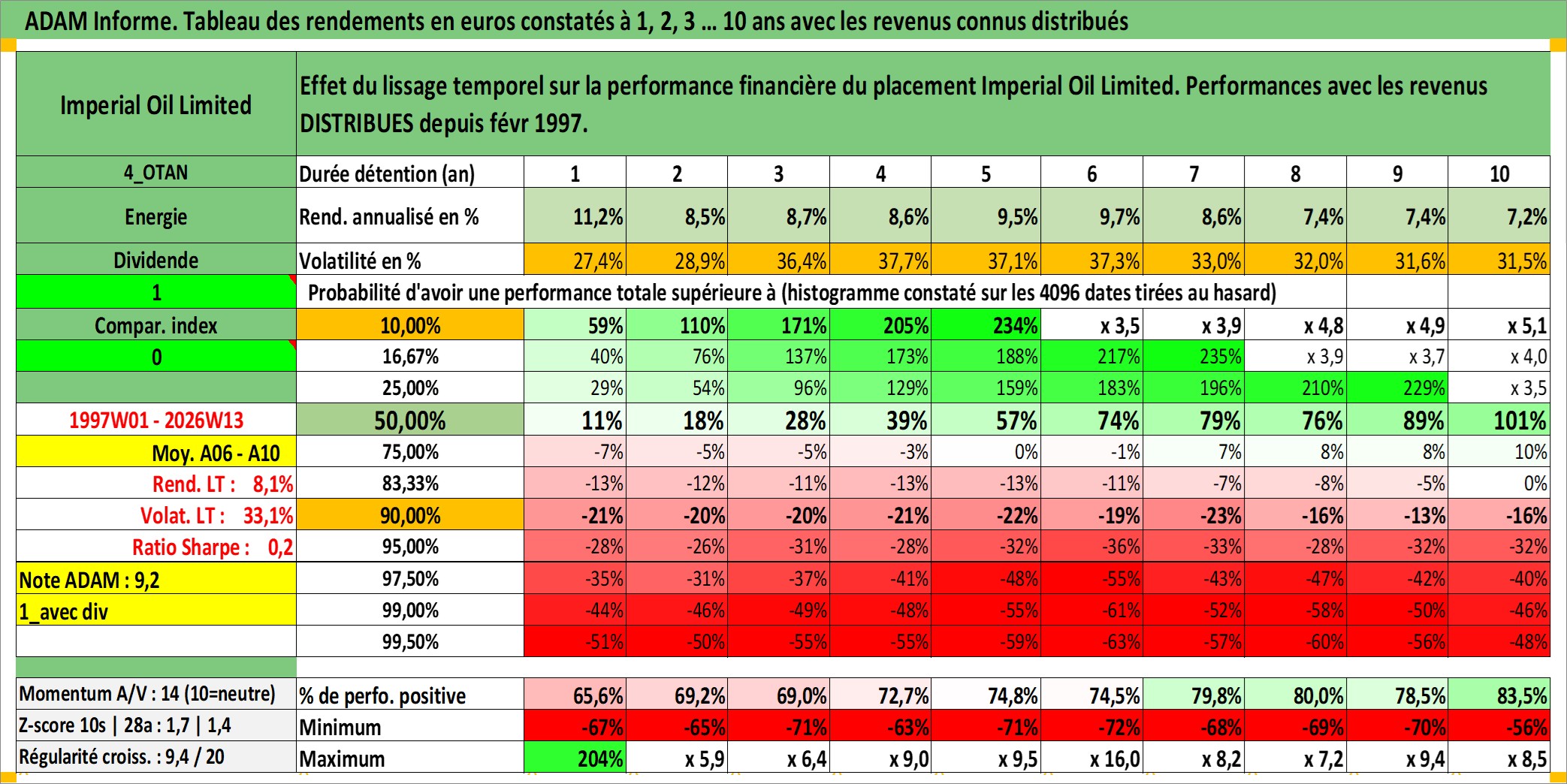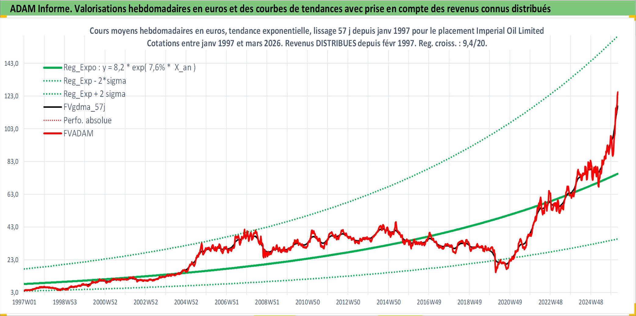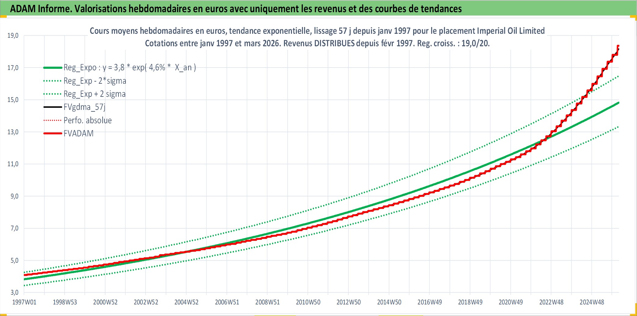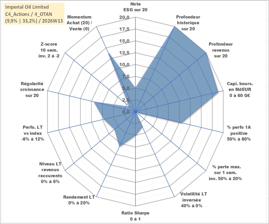 Site dédié aux investisseursPage dédiée sur site financeAnalyse des valorisations hebdomadaires de l'action Imperial Oil Limited. Cet actif est cote en CAD. Les valorisations sont en contrevaleur EURO et couvrent les semaines 1997W01 a 2026W13. Les revenus de cet actif financier sont pris en compte depuis la semaine 1997W09. La note globale ESG de cet actif est estimee a 5.0 (apres rebasage entre 0 et 20).