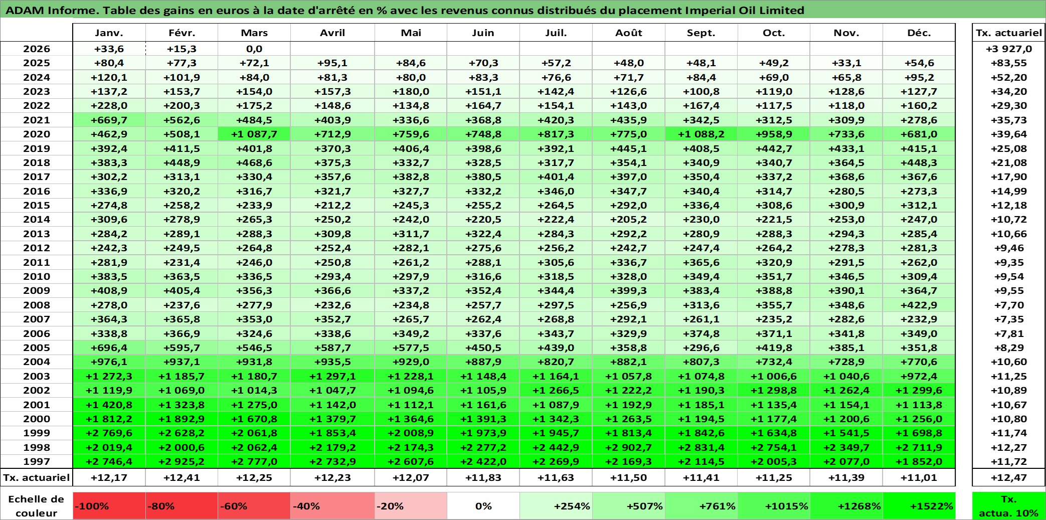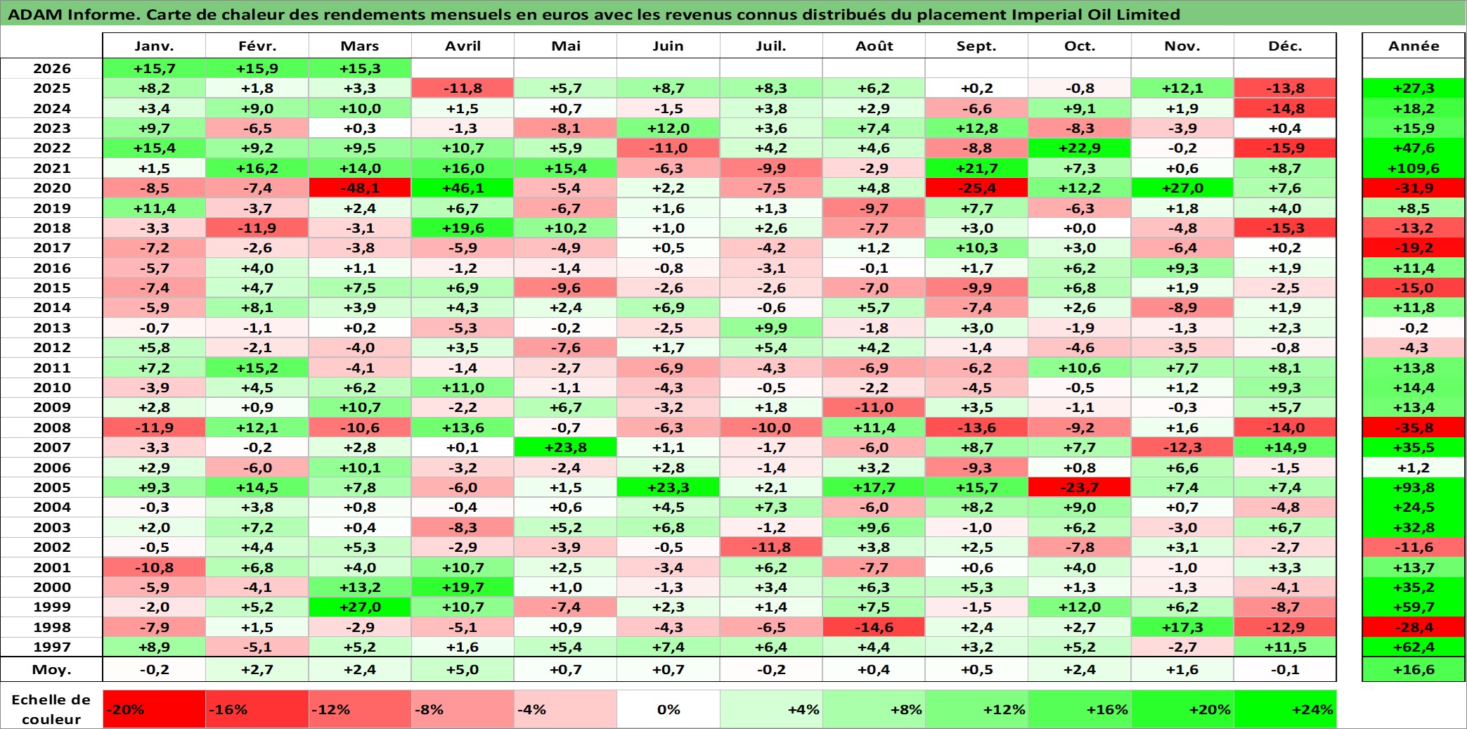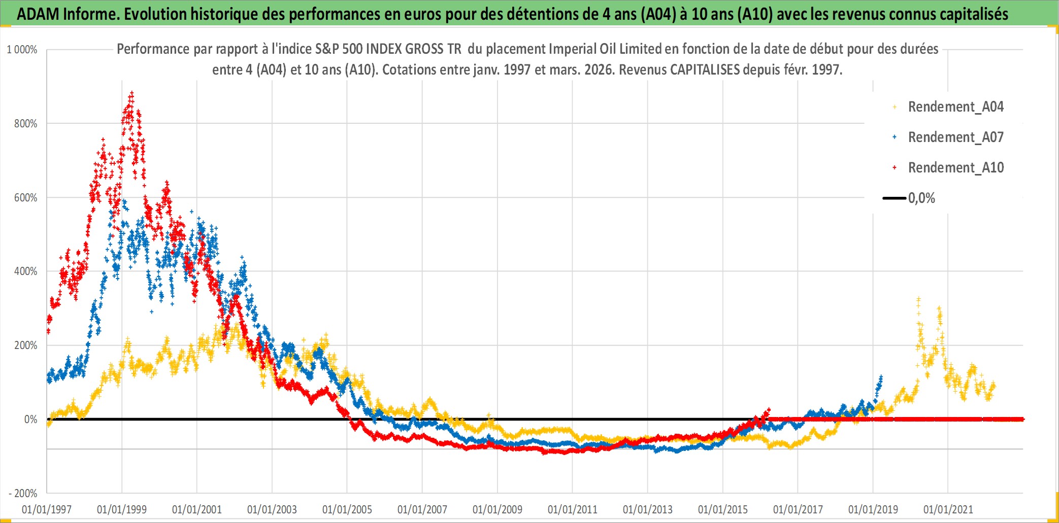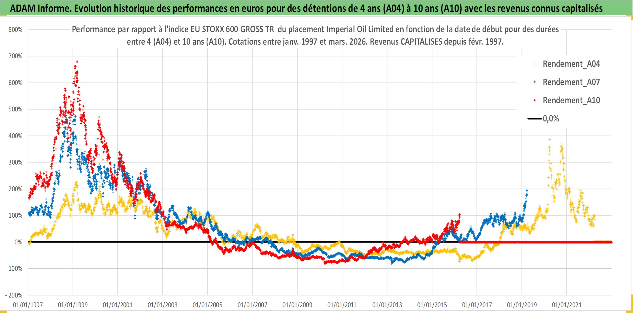 Site dédié aux investisseursPage dédiée sur site financeAnalyse des valorisations hebdomadaires de l'action Imperial Oil Limited. Cet actif est cote en CAD. Les valorisations sont en contrevaleur EURO et couvrent les semaines 1997W01 a 2026W13. Les revenus de cet actif financier sont pris en compte depuis la semaine 1997W09. La note globale ESG de cet actif est estimee a 5.0 (apres rebasage entre 0 et 20).