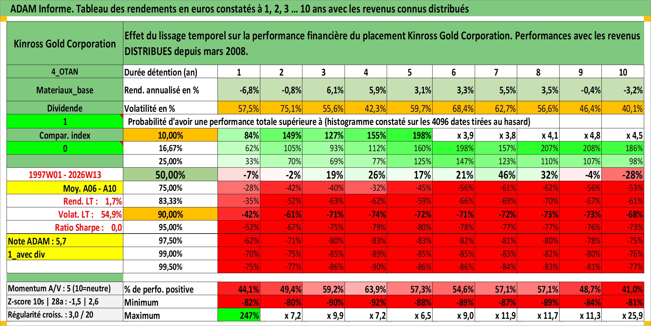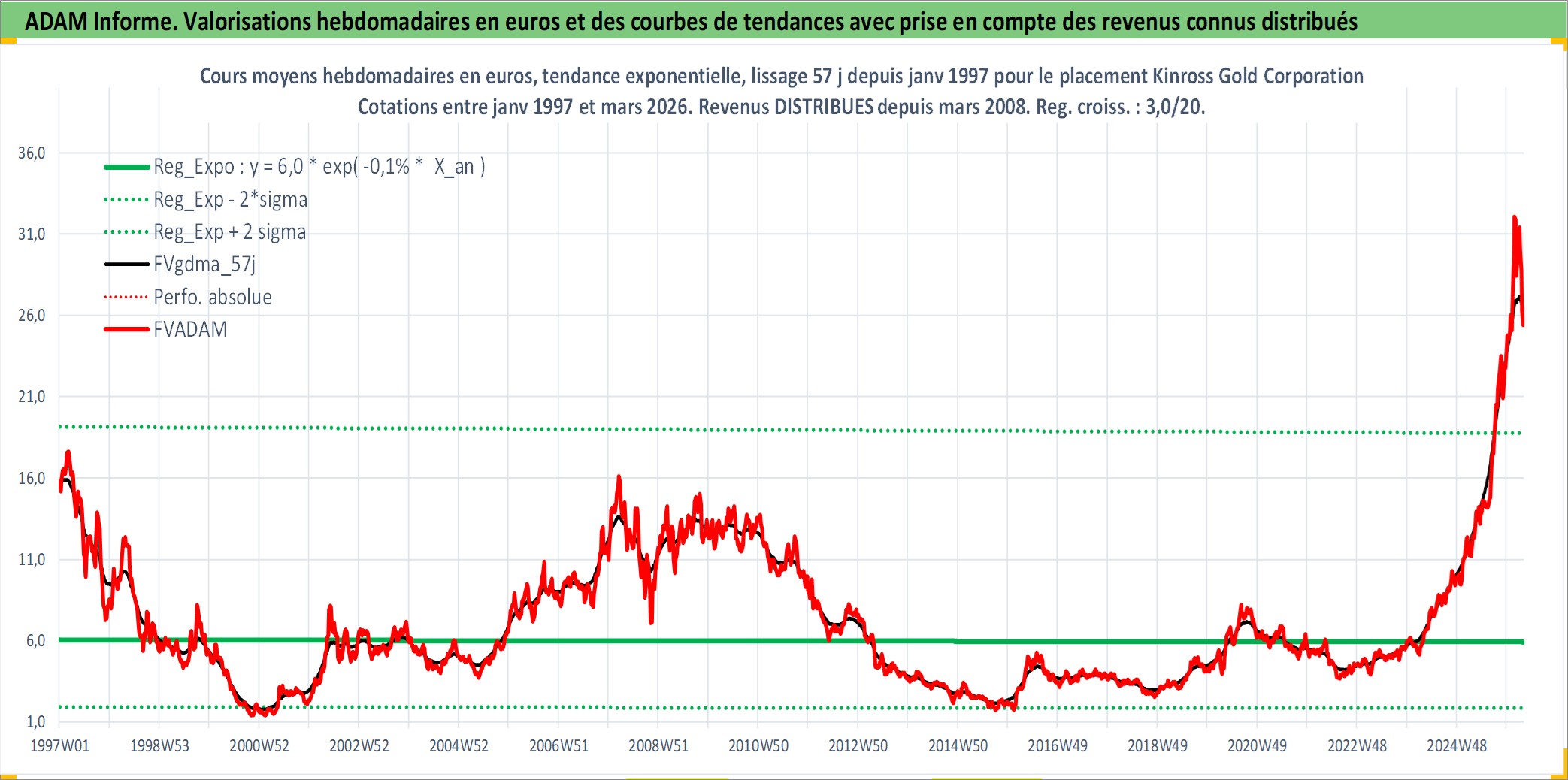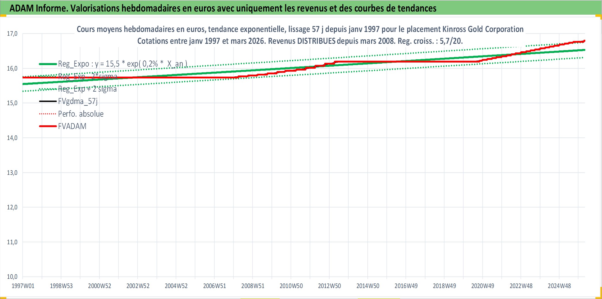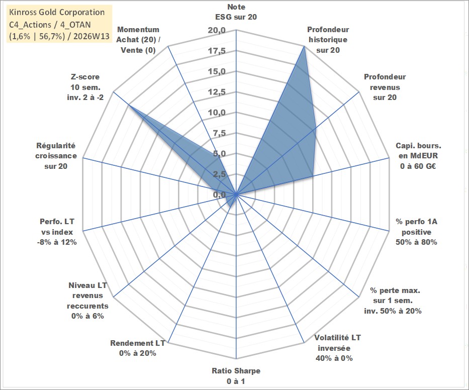 Site dédié aux investisseursPage dédiée sur site financeAnalyse des valorisations hebdomadaires de l'action Kinross Gold Corporation. Cet actif est cote en USD. Les valorisations sont en contrevaleur EURO et couvrent les semaines 1997W01 a 2026W13. Les revenus de cet actif financier sont pris en compte depuis la semaine 2008W12. La note ESG de cet actif n'est pas connue.