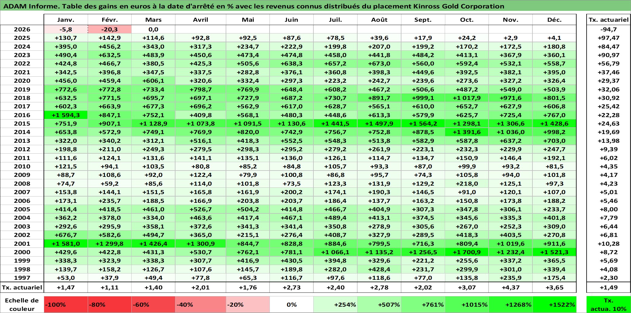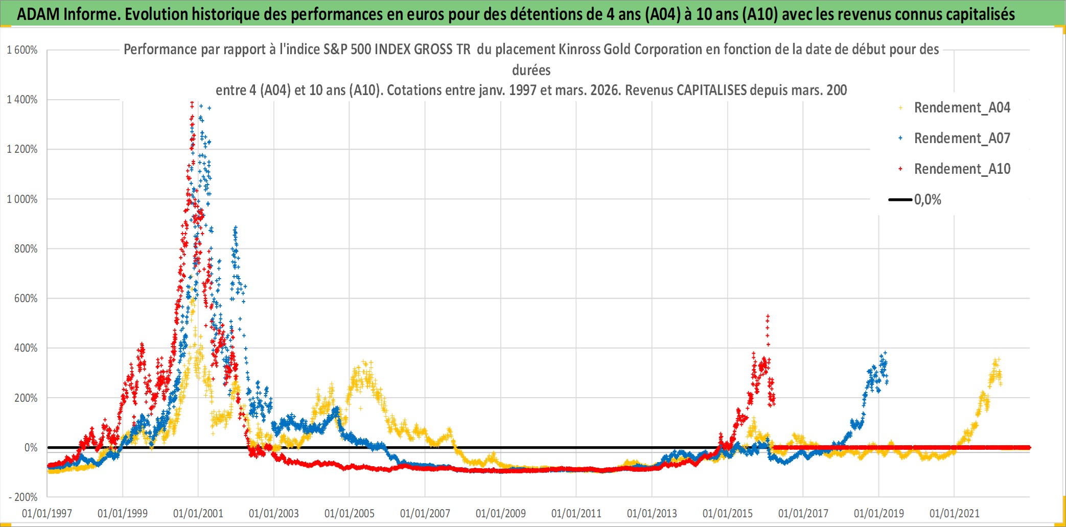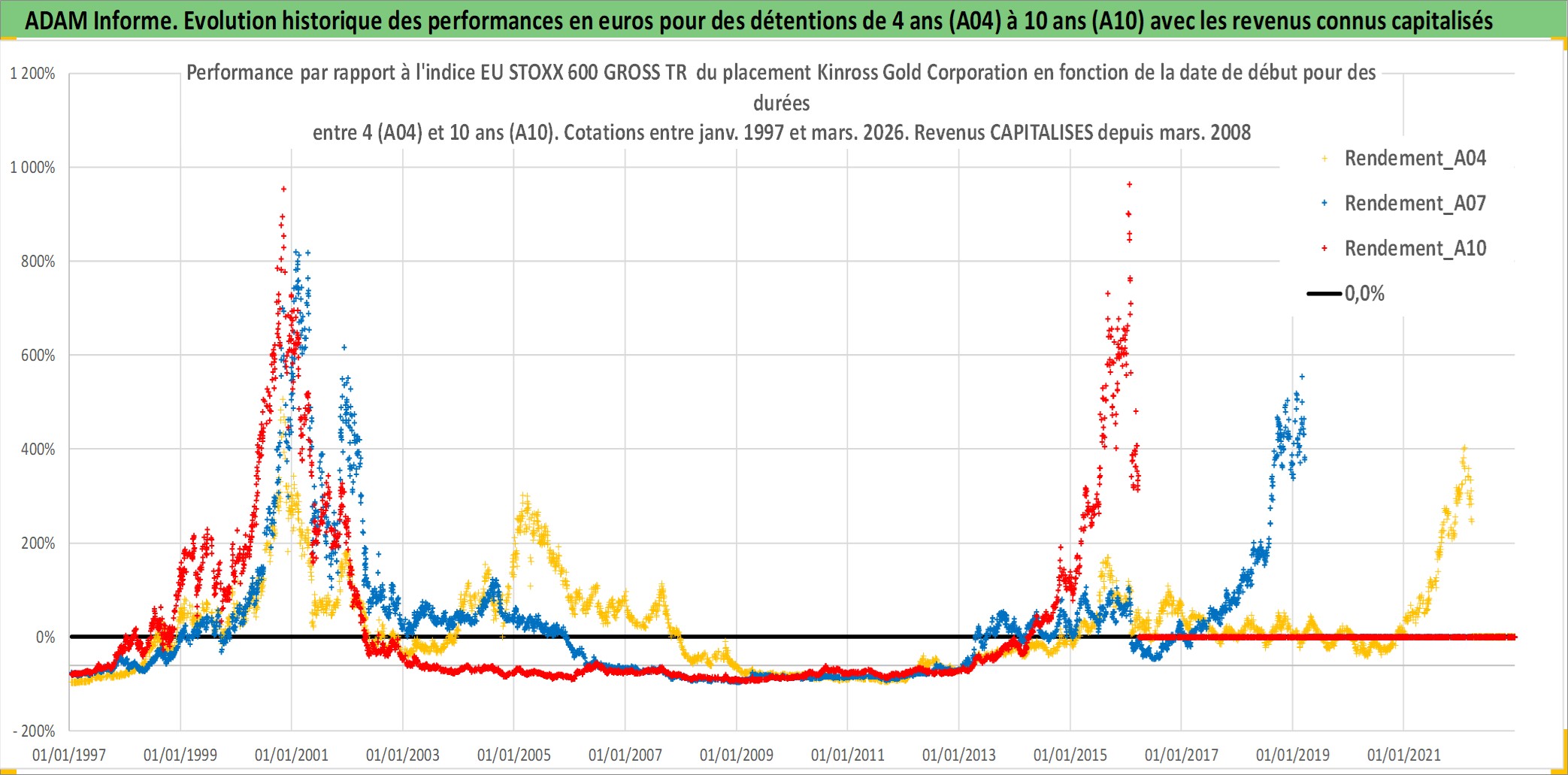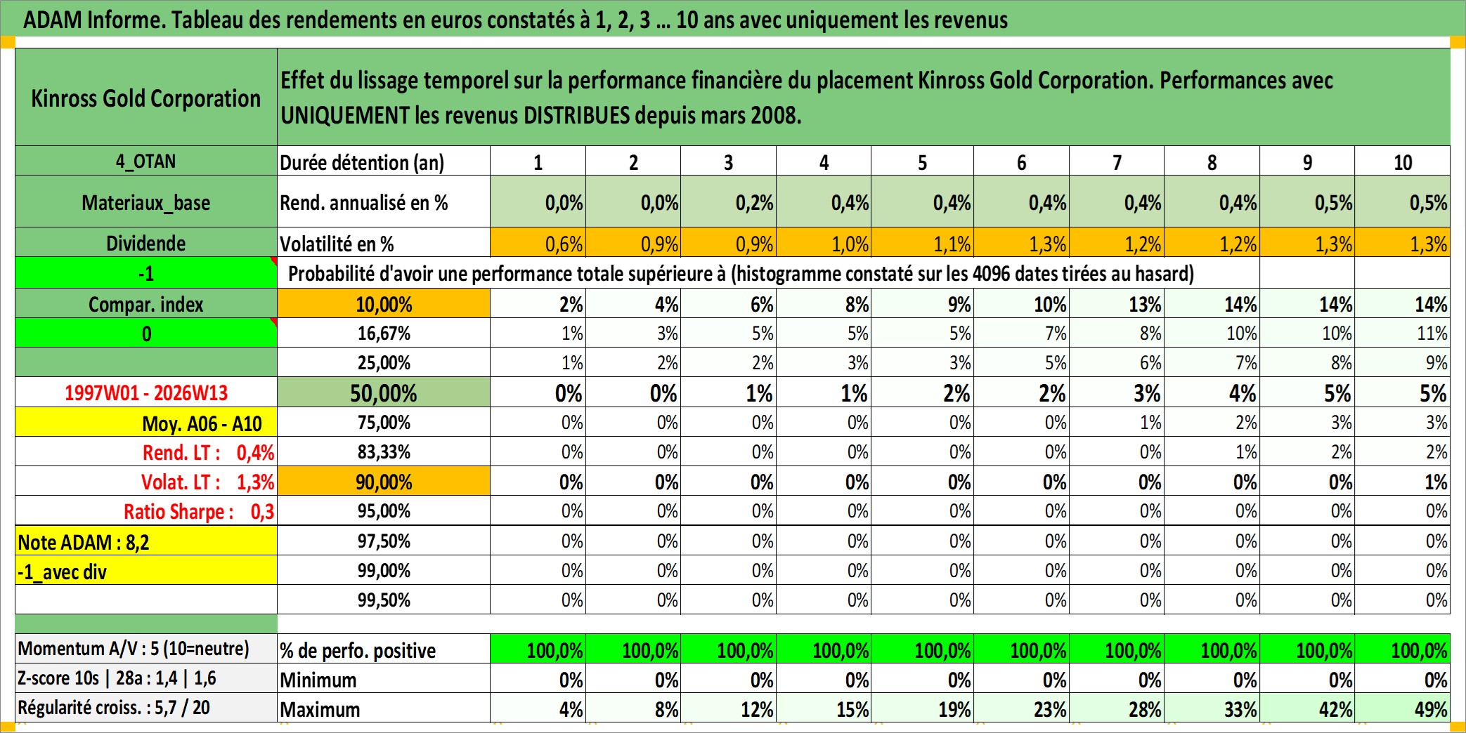 Site dédié aux investisseursPage dédiée sur site financeAnalyse des valorisations hebdomadaires de l'action Kinross Gold Corporation. Cet actif est cote en USD. Les valorisations sont en contrevaleur EURO et couvrent les semaines 1997W01 a 2026W13. Les revenus de cet actif financier sont pris en compte depuis la semaine 2008W12. La note ESG de cet actif n'est pas connue.