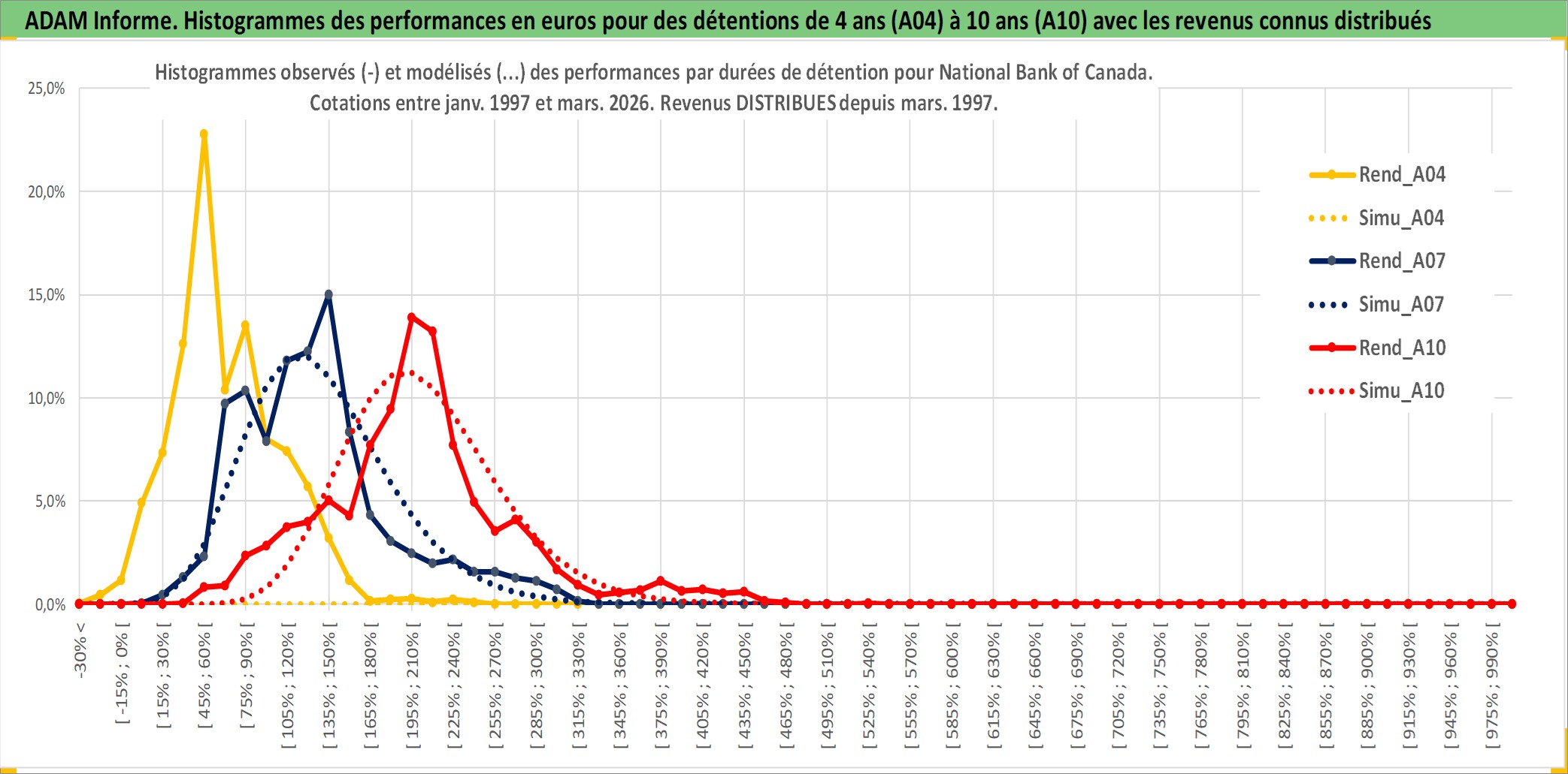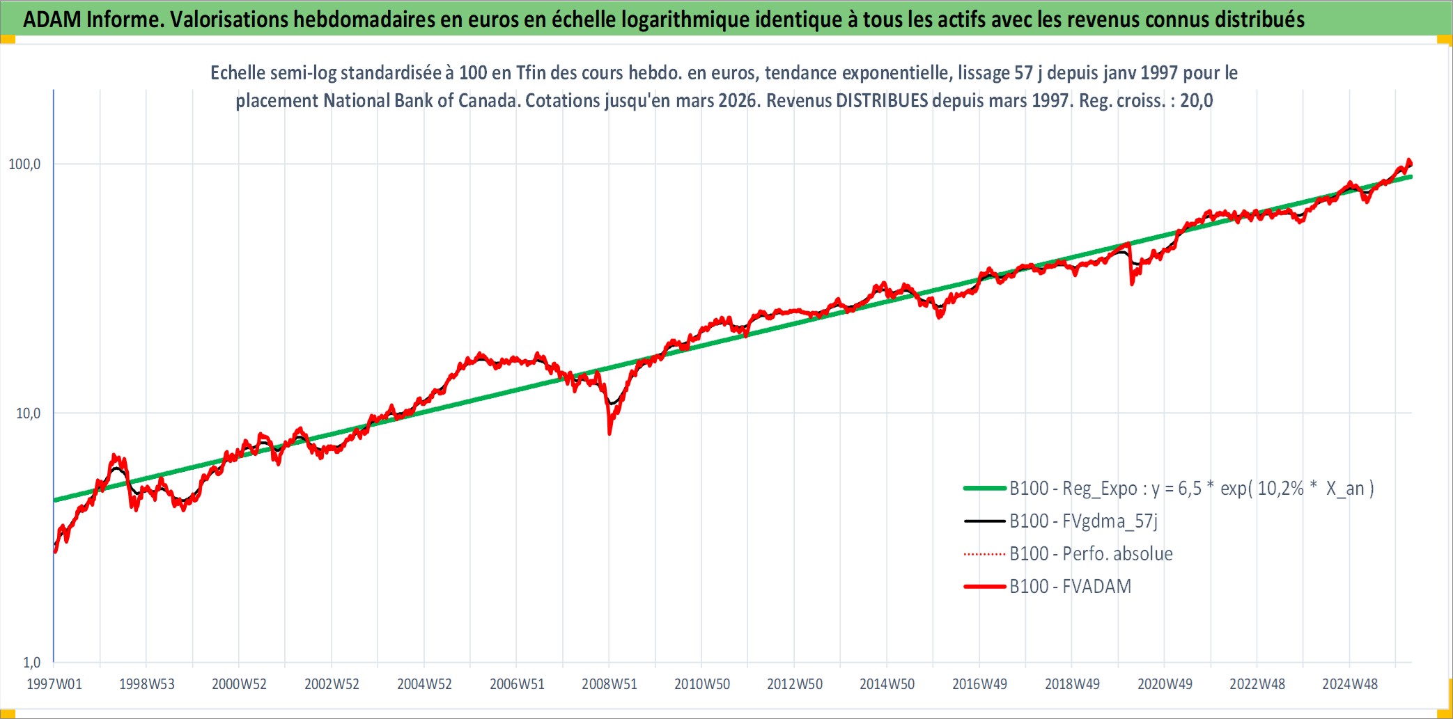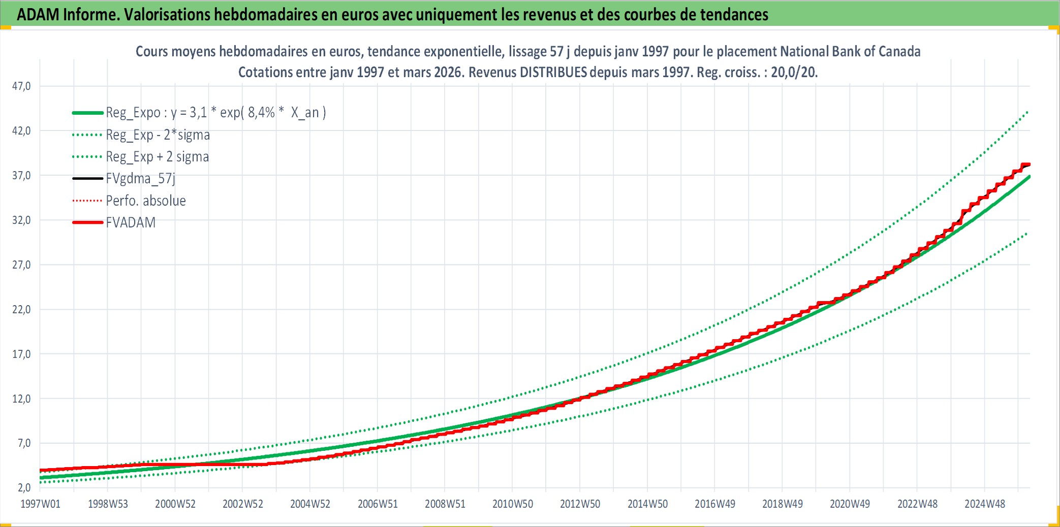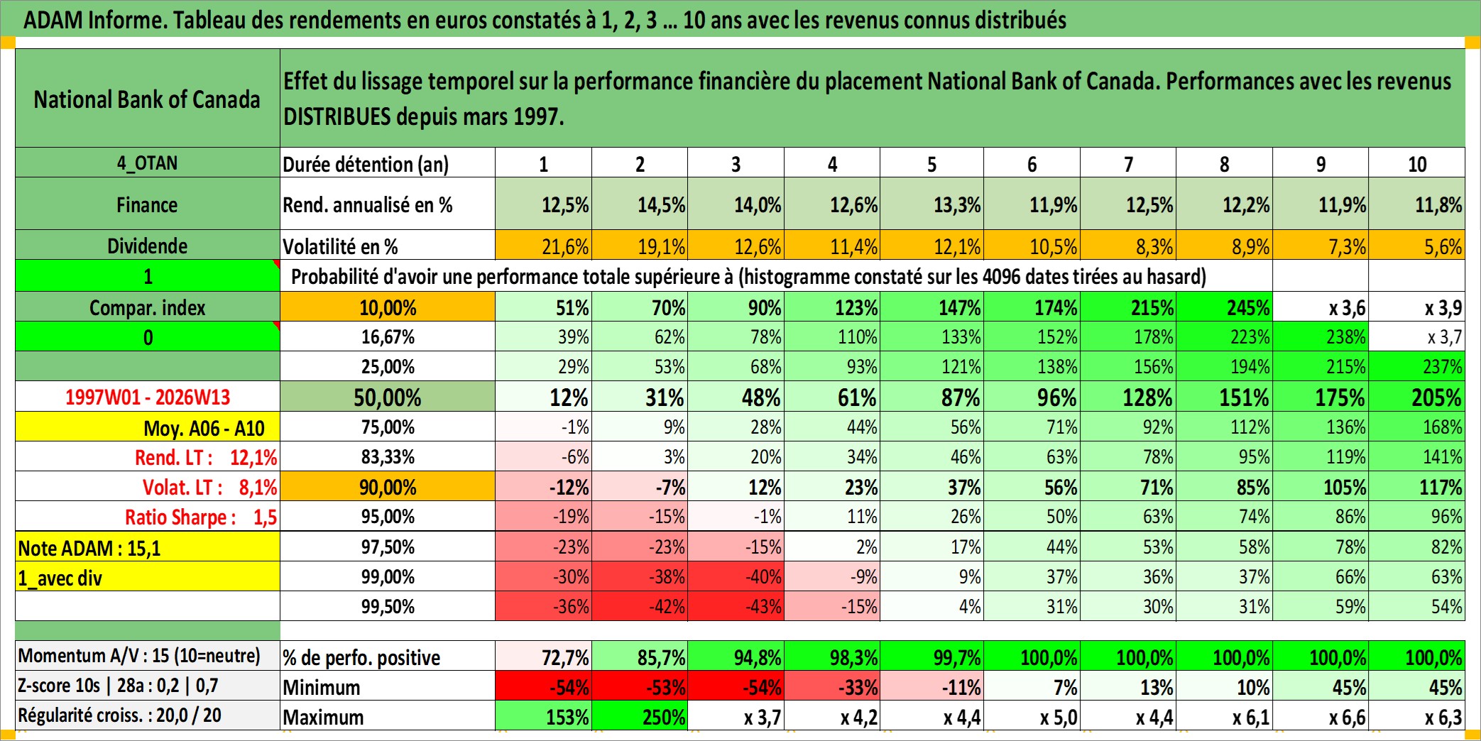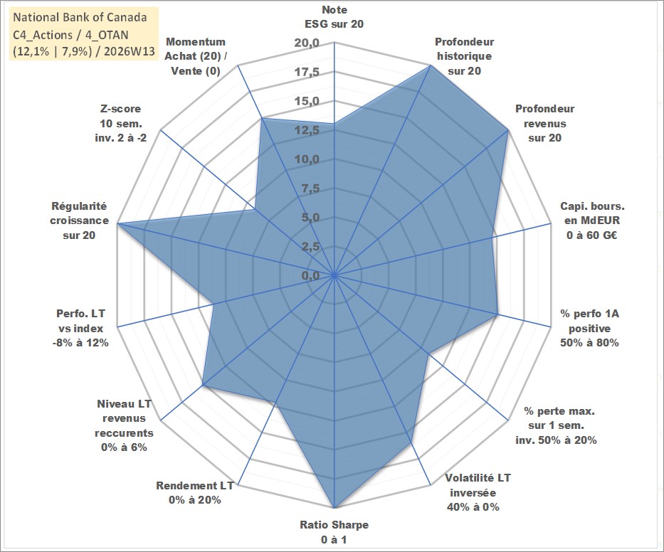 Site dédié aux investisseursPage dédiée sur site financeAnalyse des valorisations hebdomadaires de l'action National Bank of Canada. Cet actif est cote en CAD. Les valorisations sont en contrevaleur EURO et couvrent les semaines 1997W01 a 2026W13. Les revenus de cet actif financier sont pris en compte depuis la semaine 1997W13. La note globale ESG de cet actif est estimee a 13.0 (apres rebasage entre 0 et 20).