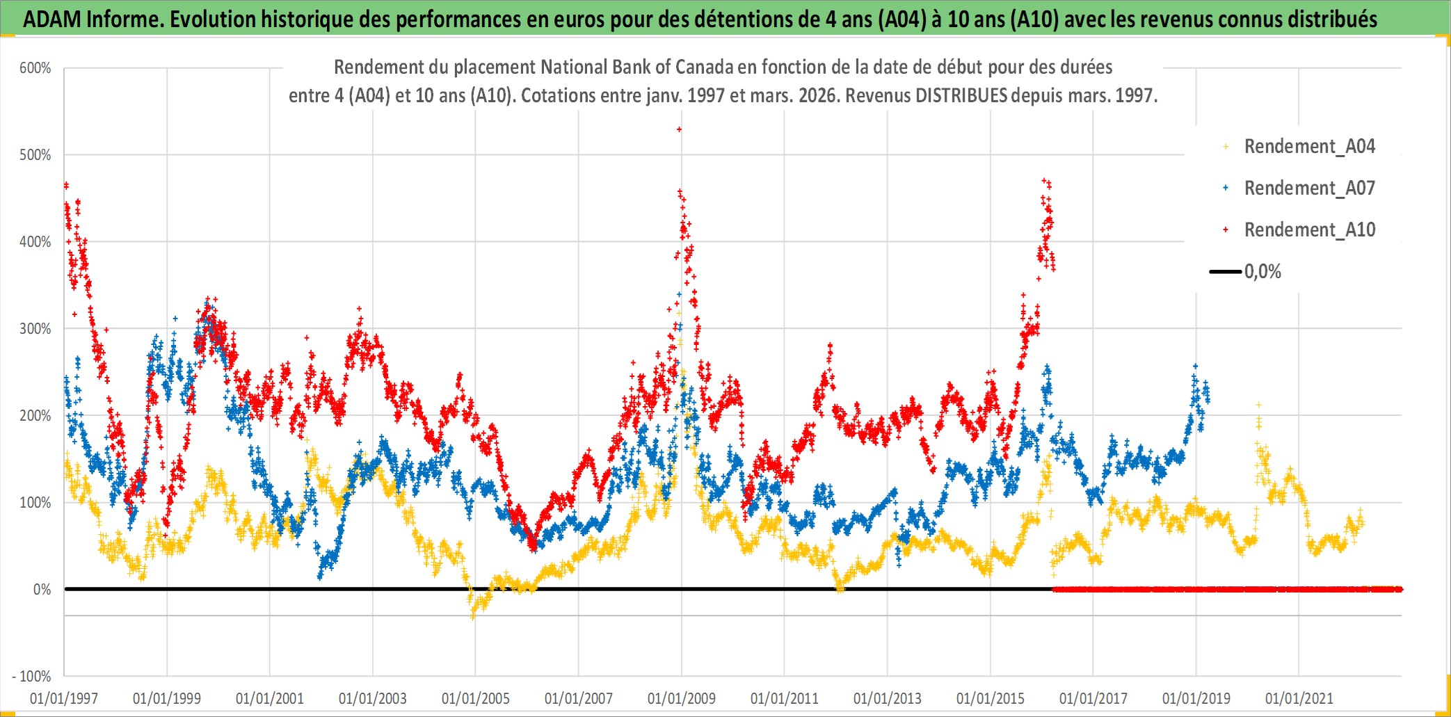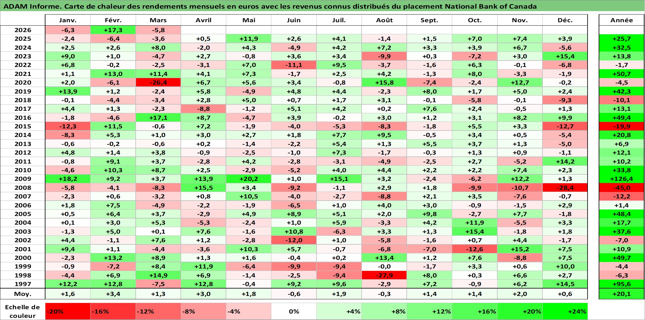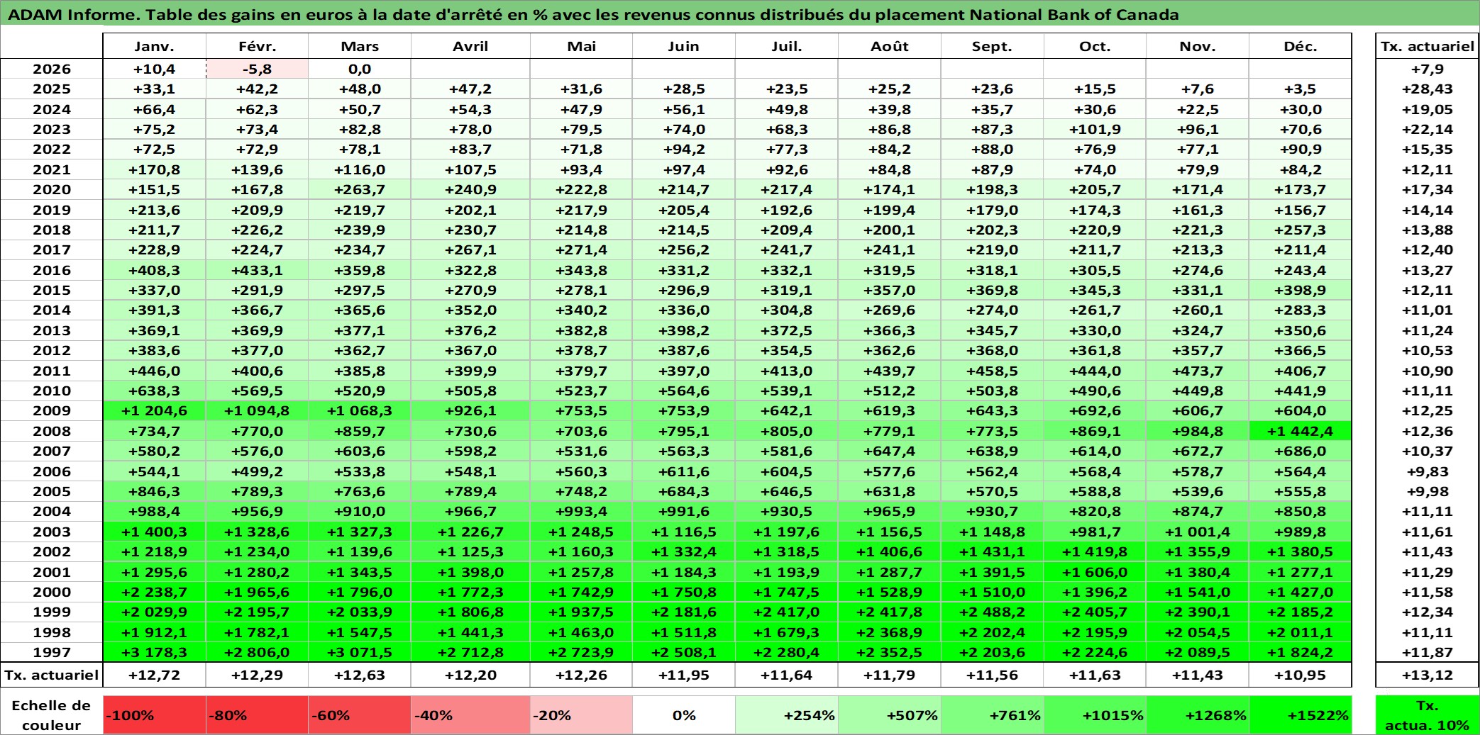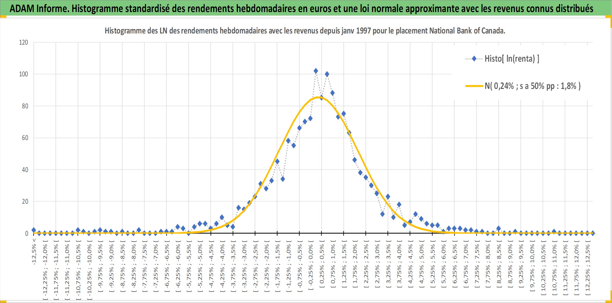 Site dédié aux investisseursPage dédiée sur site financeAnalyse des valorisations hebdomadaires de l'action National Bank of Canada. Cet actif est cote en CAD. Les valorisations sont en contrevaleur EURO et couvrent les semaines 1997W01 a 2026W13. Les revenus de cet actif financier sont pris en compte depuis la semaine 1997W13. La note globale ESG de cet actif est estimee a 13.0 (apres rebasage entre 0 et 20).
