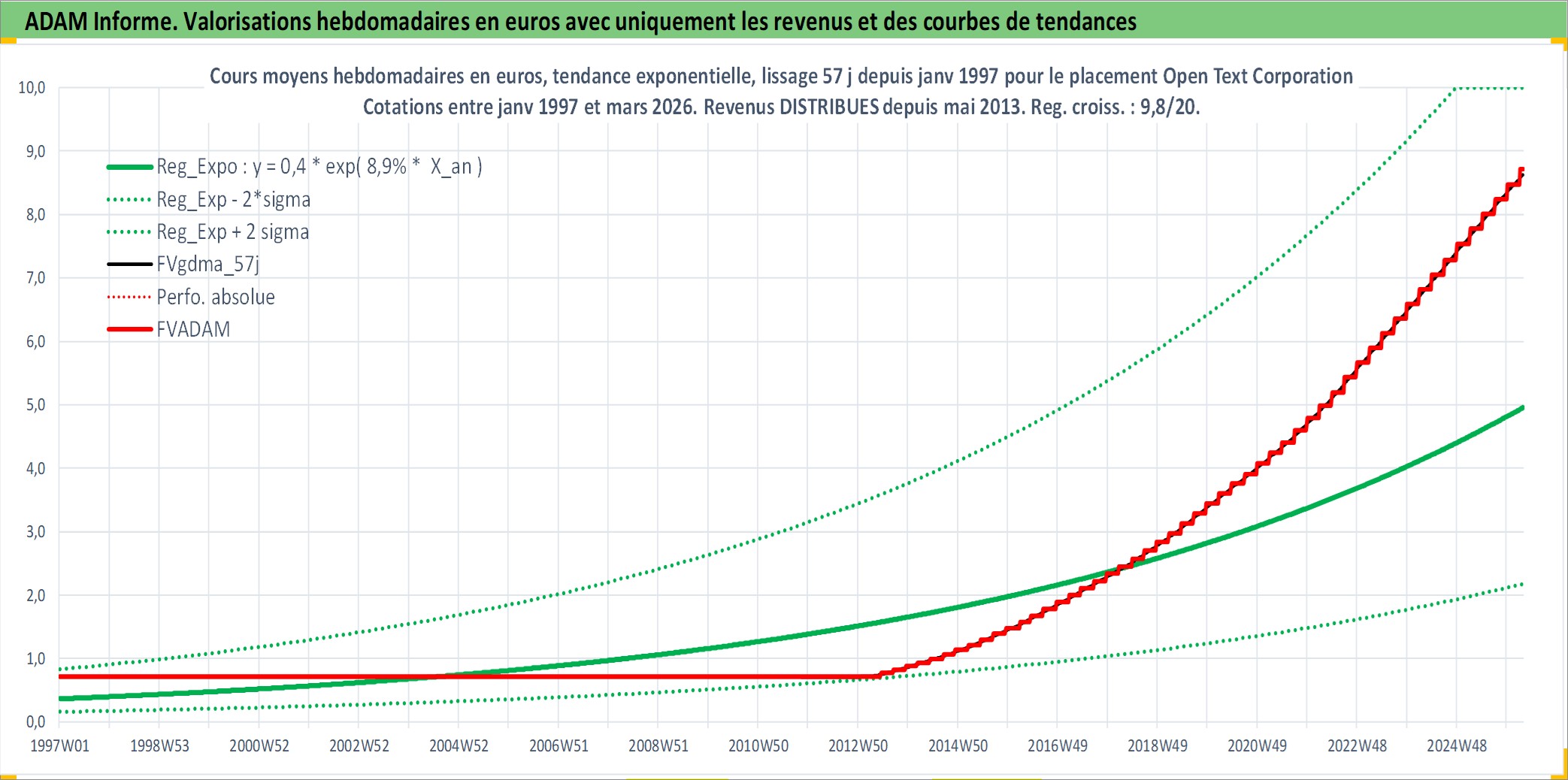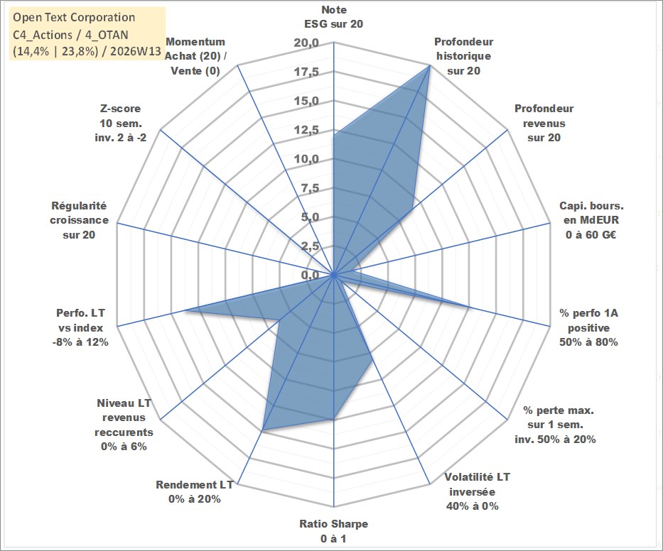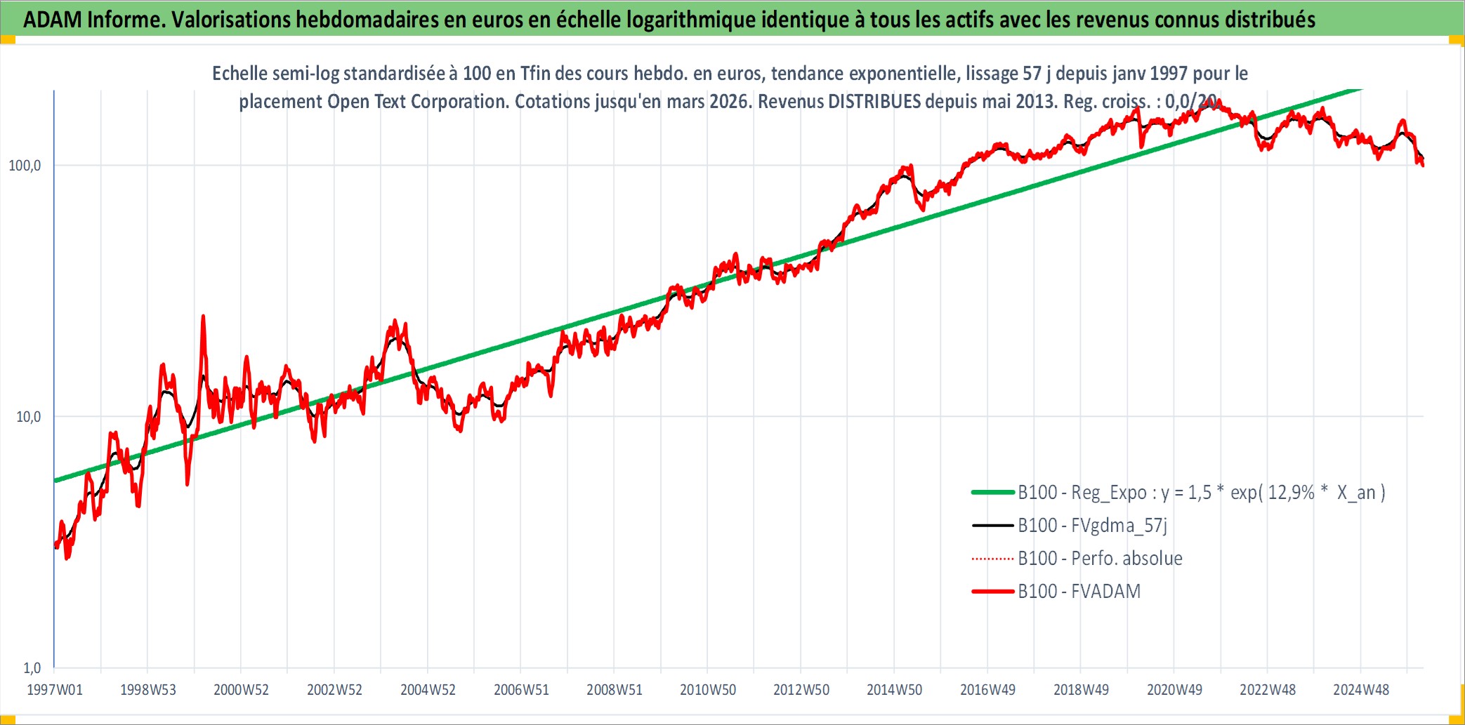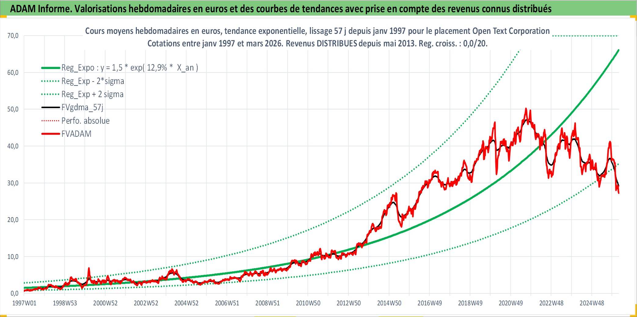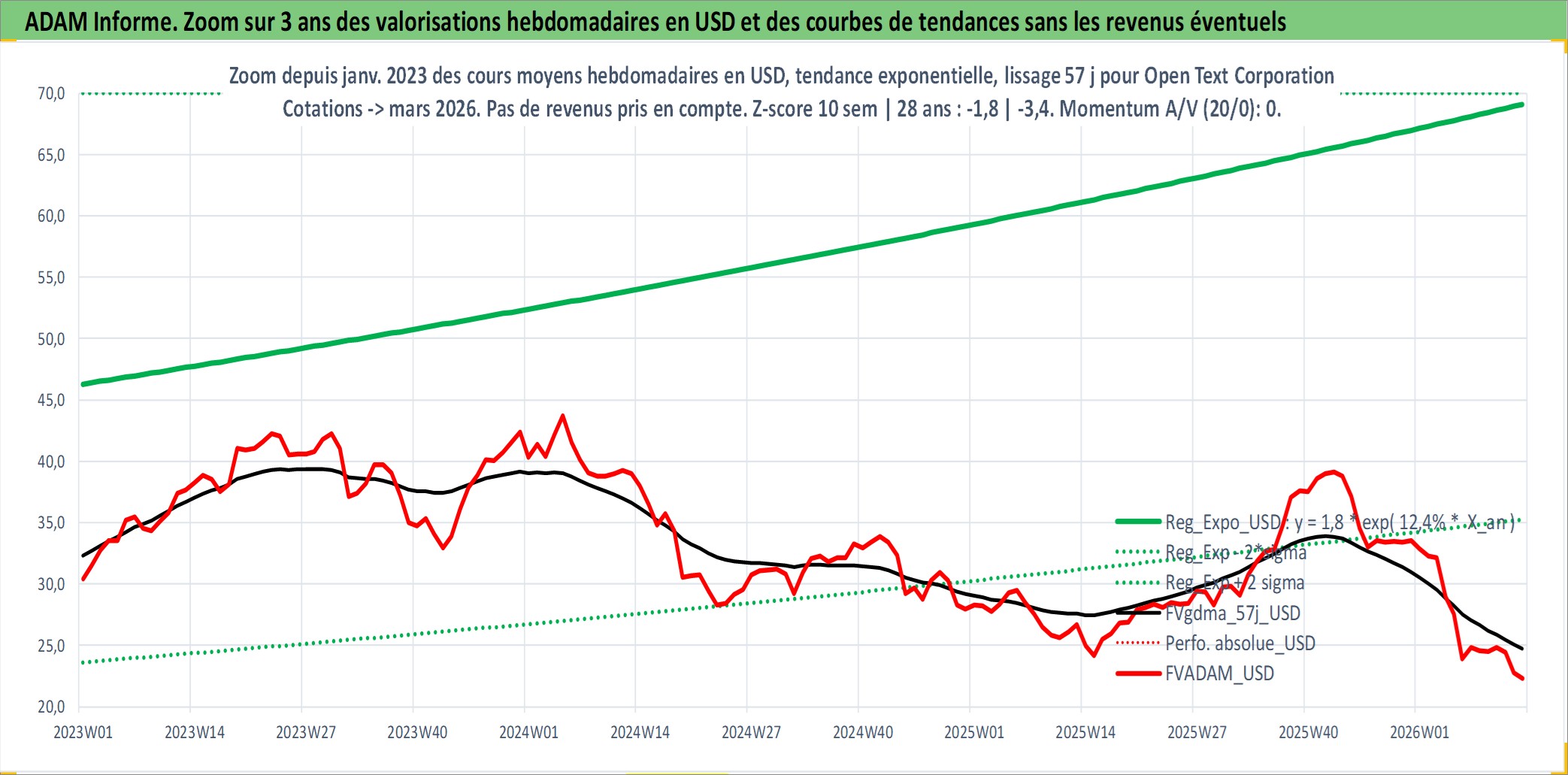 Site dédié aux investisseursPage dédiée sur site financeAnalyse des valorisations hebdomadaires de l'action Open Text Corporation. Cet actif est cote en USD. Les valorisations sont en contrevaleur EURO et couvrent les semaines 1997W01 a 2026W13. Les revenus de cet actif financier sont pris en compte depuis la semaine 2013W22. La note globale ESG de cet actif est estimee a 12.0 (apres rebasage entre 0 et 20).