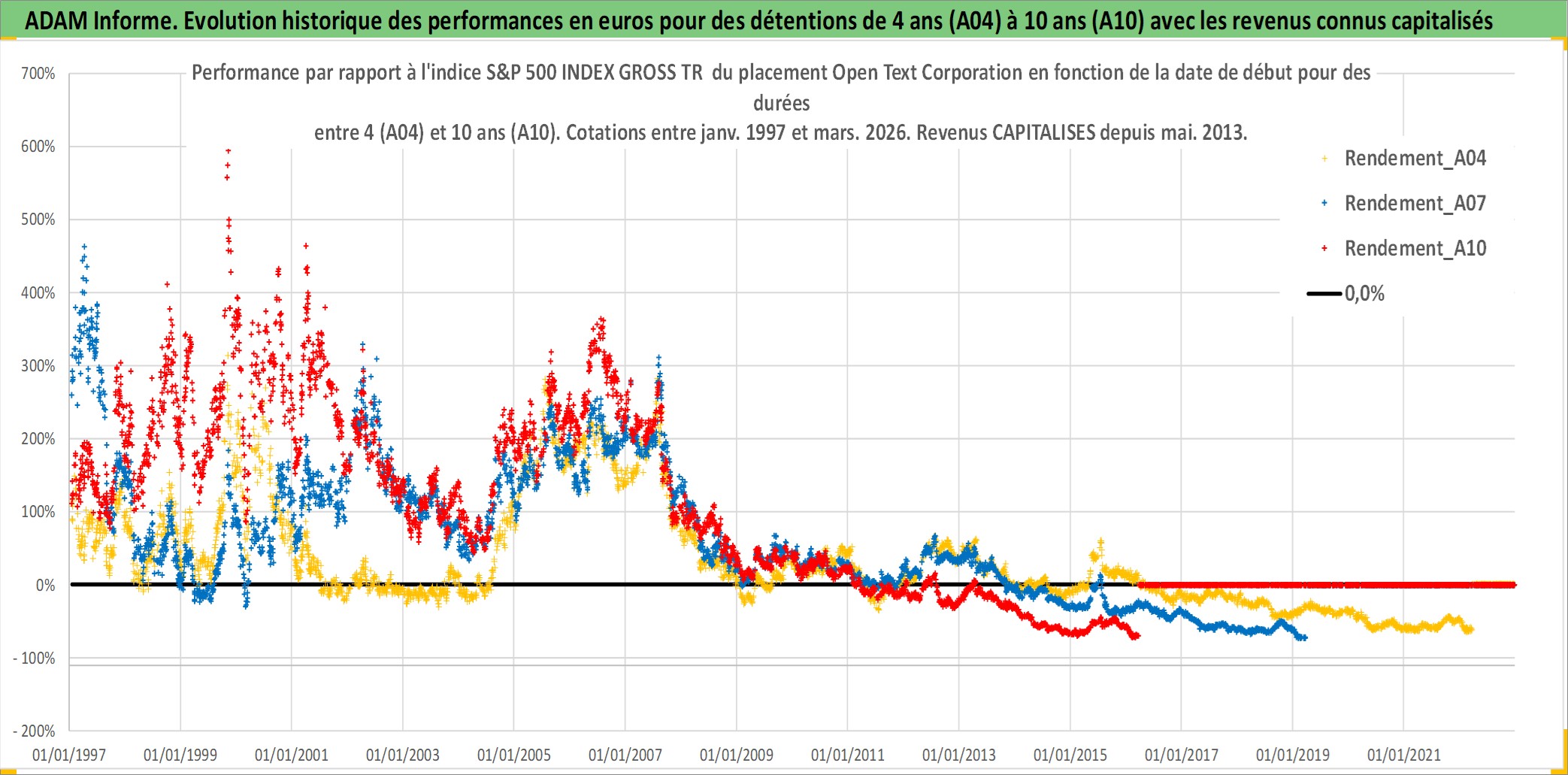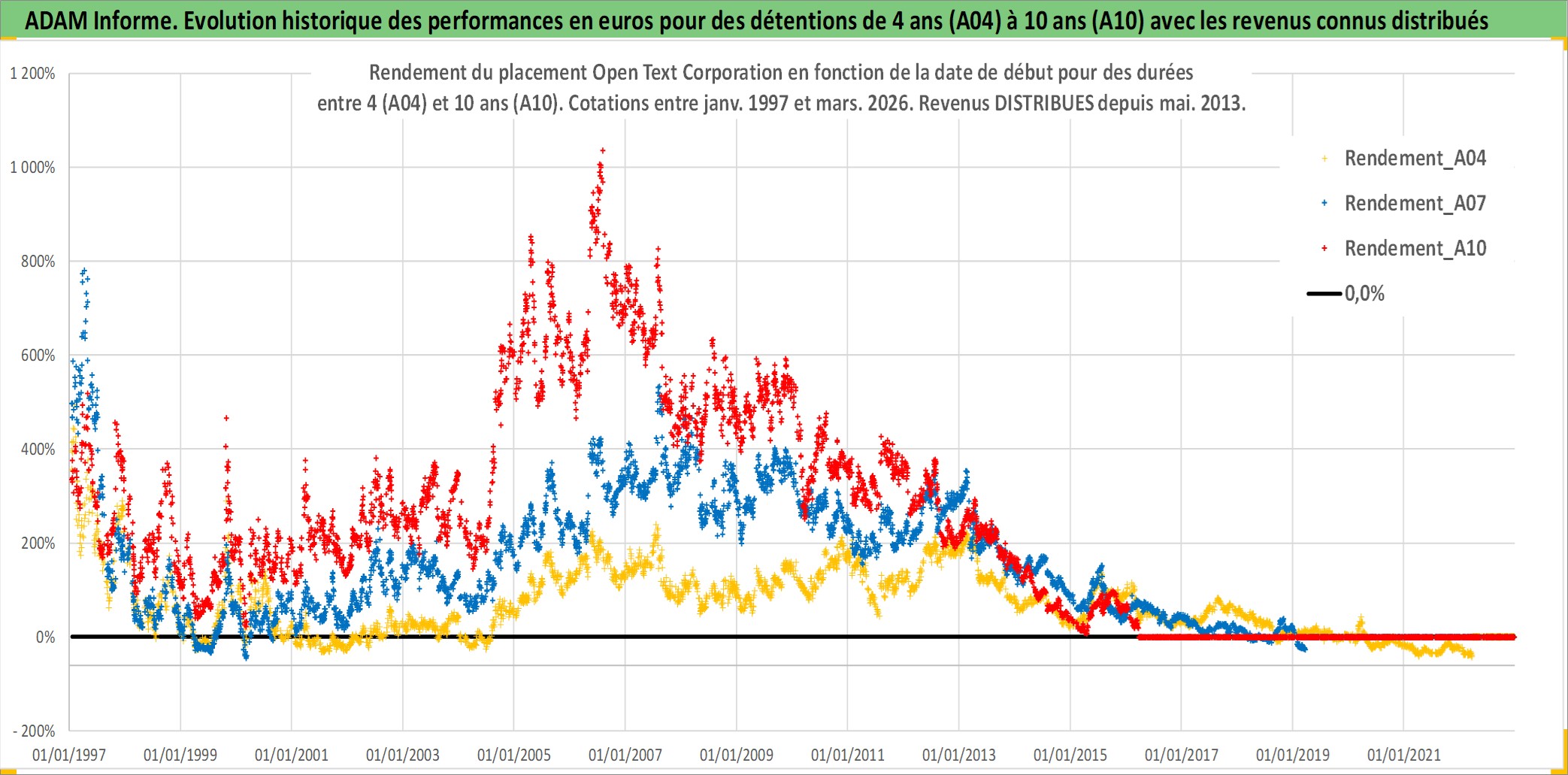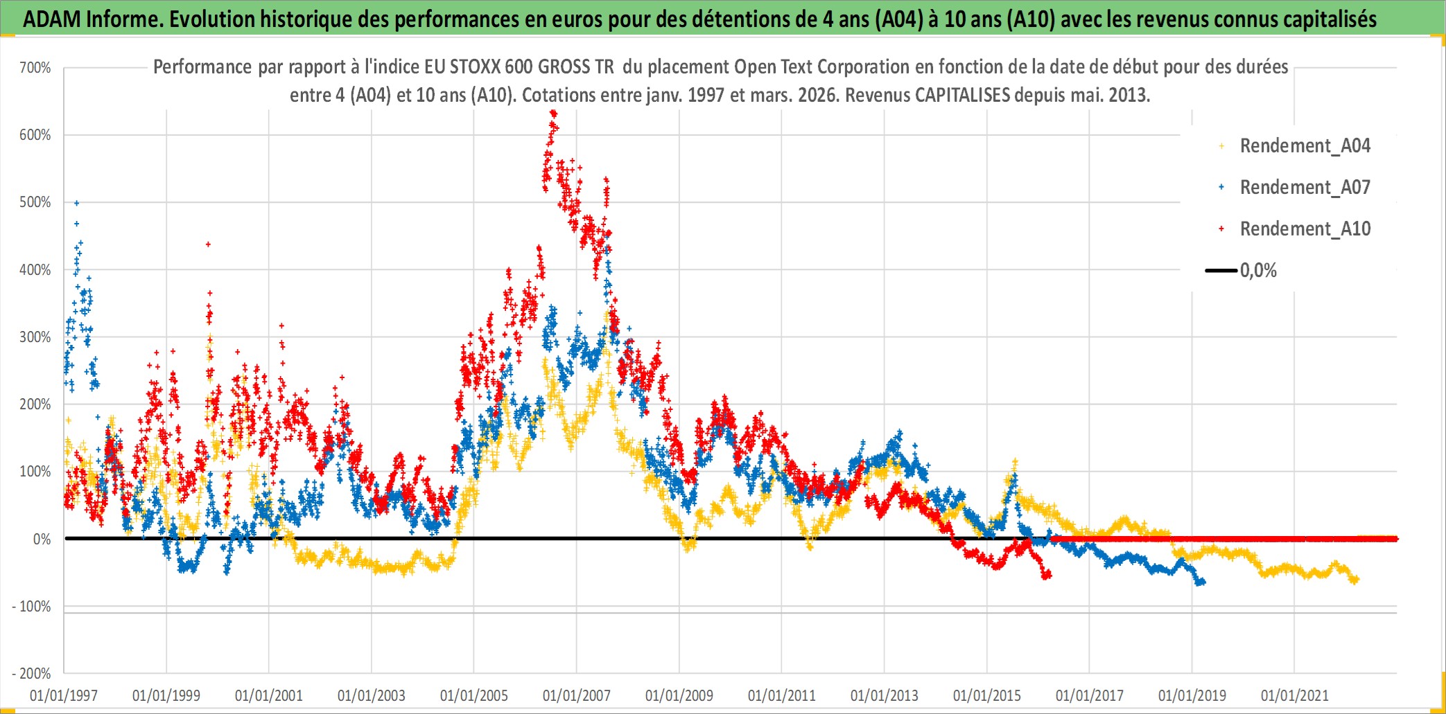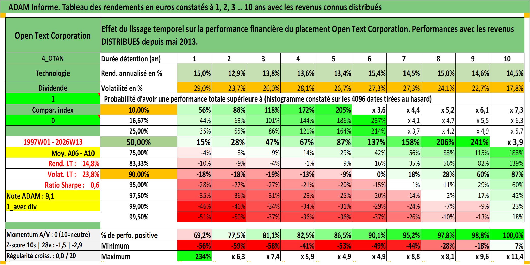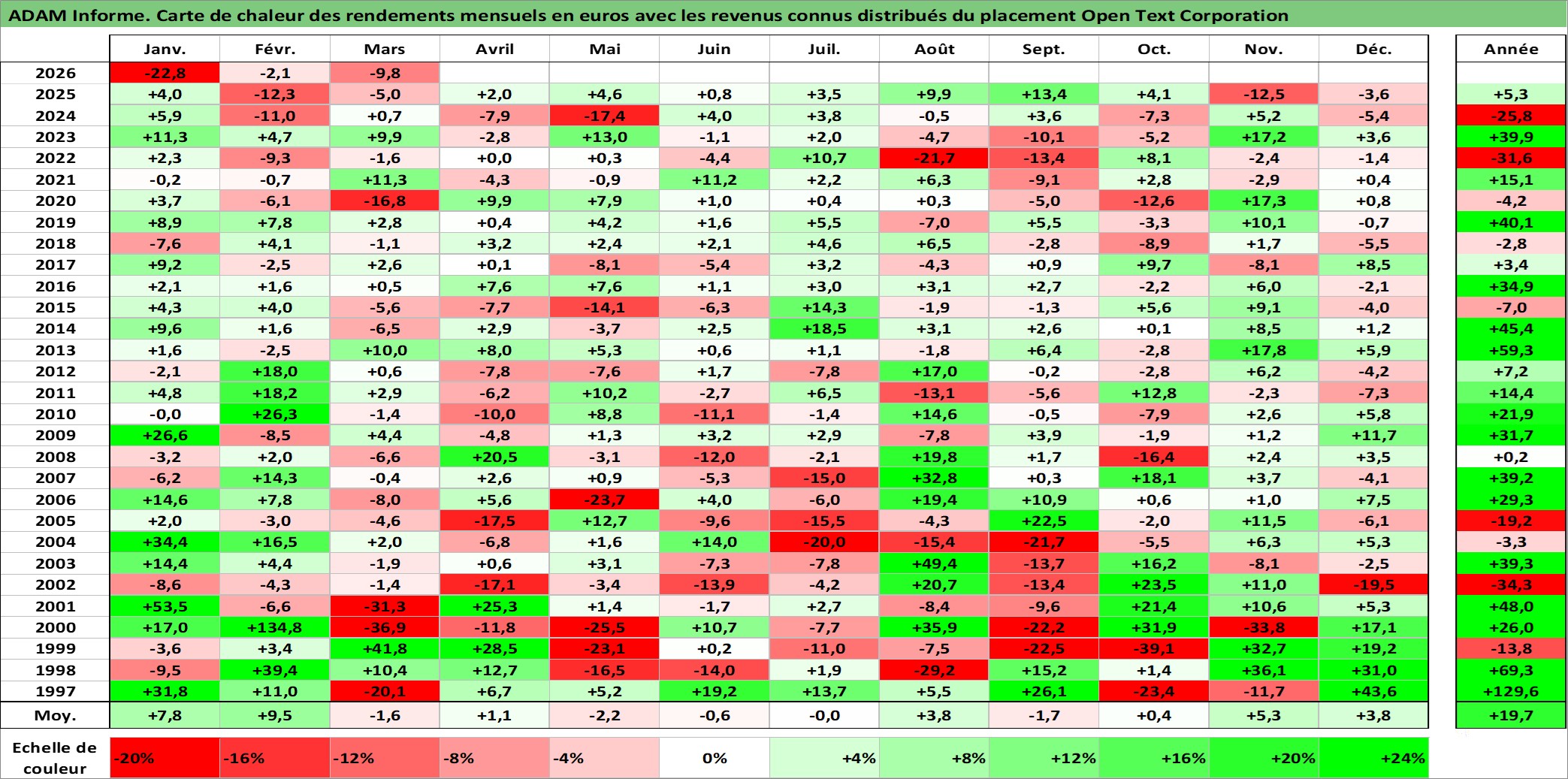 Site dédié aux investisseursPage dédiée sur site financeAnalyse des valorisations hebdomadaires de l'action Open Text Corporation. Cet actif est cote en USD. Les valorisations sont en contrevaleur EURO et couvrent les semaines 1997W01 a 2026W13. Les revenus de cet actif financier sont pris en compte depuis la semaine 2013W22. La note globale ESG de cet actif est estimee a 12.0 (apres rebasage entre 0 et 20).