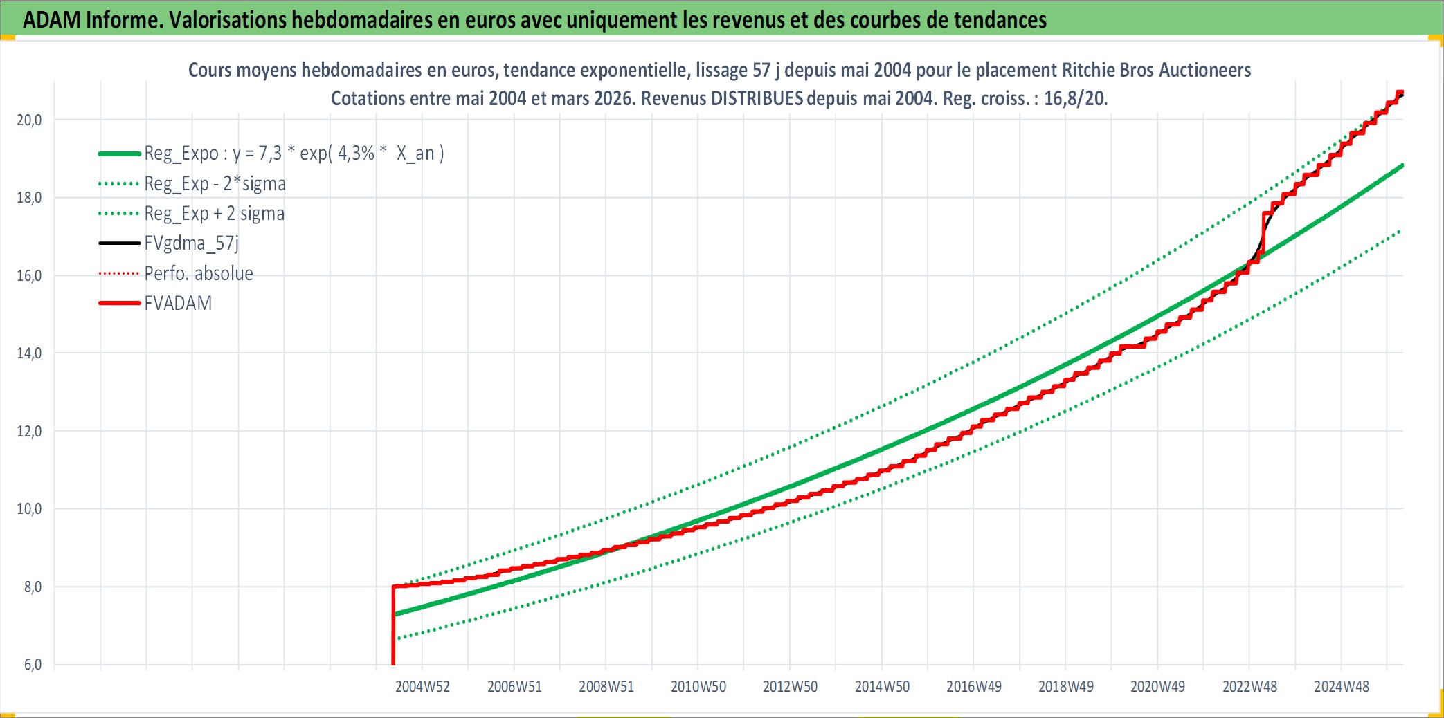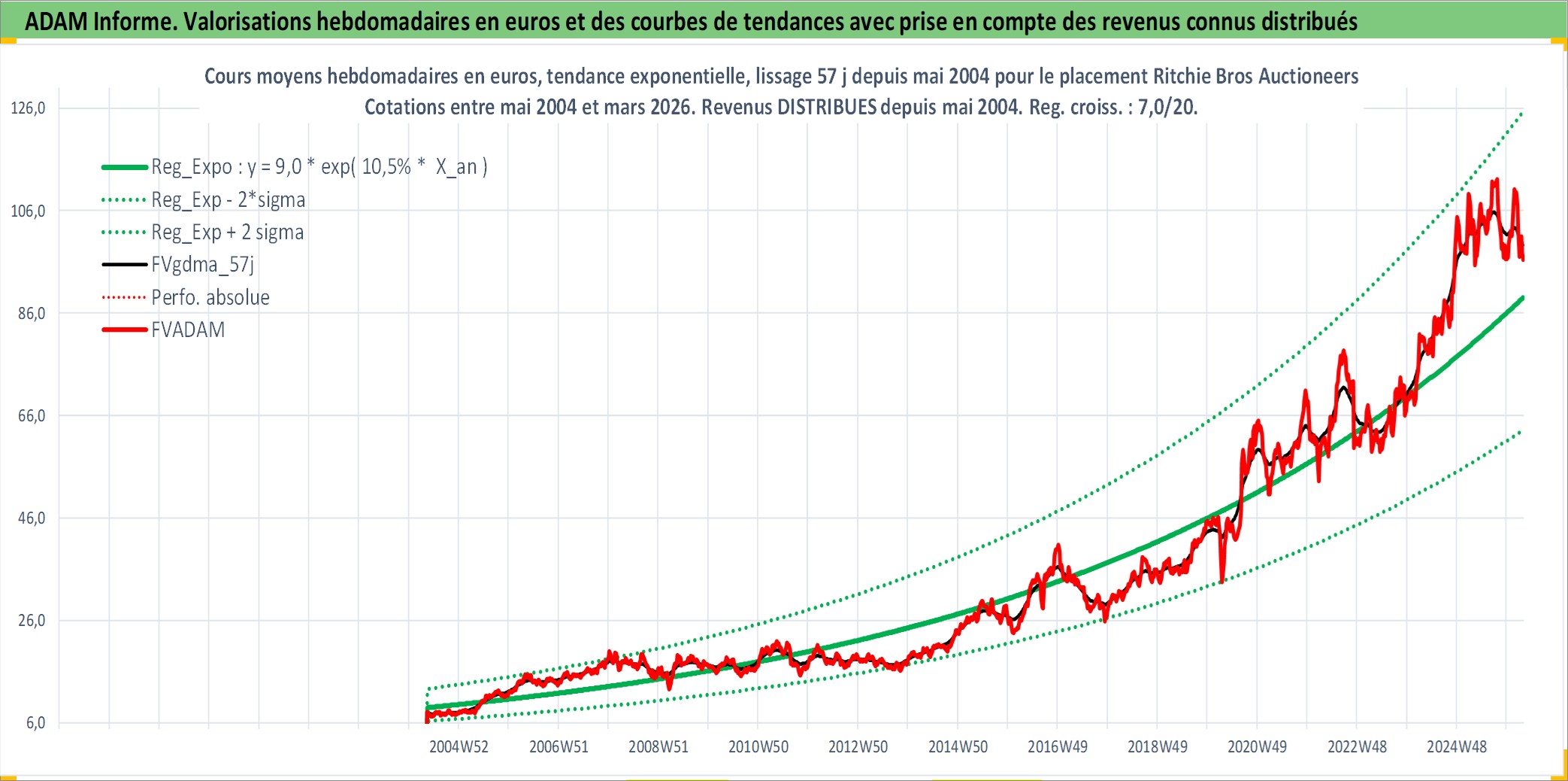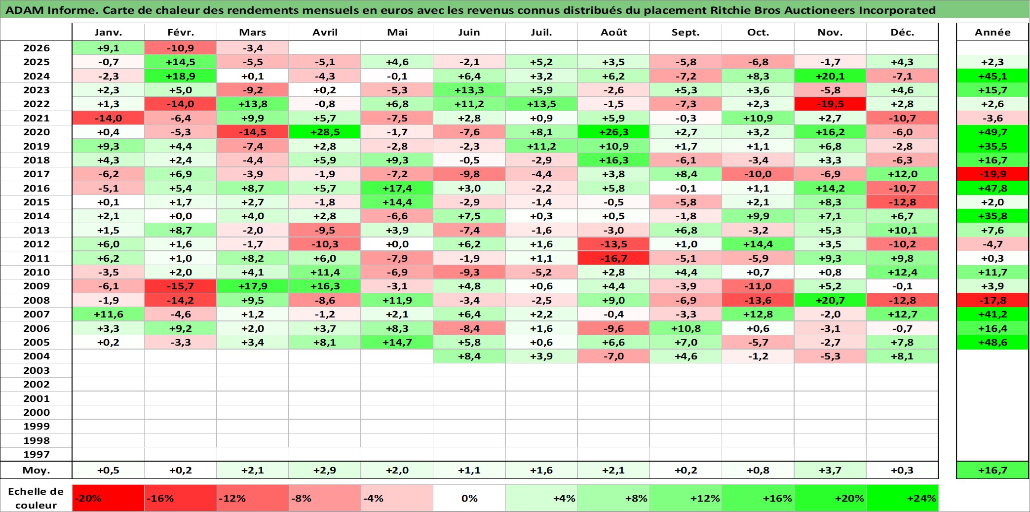 Site dédié aux investisseursPage dédiée sur site financeAnalyse des valorisations hebdomadaires de l'action Ritchie Bros Auctioneers Incorporated. Cet actif est cote en CAD. Les valorisations sont en contrevaleur EURO et couvrent les semaines 2004W19 a 2026W13. Les revenus de cet actif financier sont pris en compte depuis la semaine 2004W22. La note ESG de cet actif n'est pas connue.