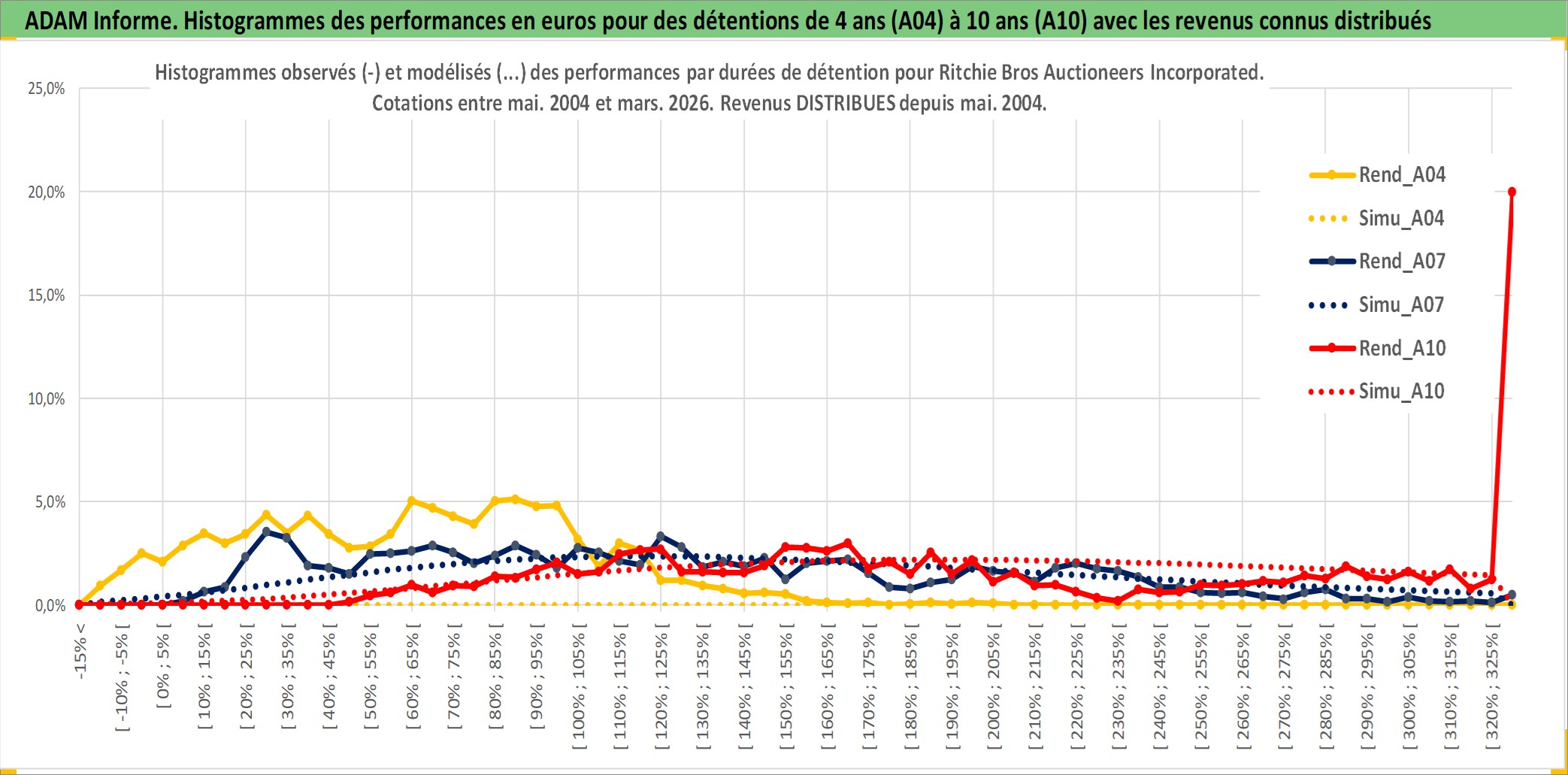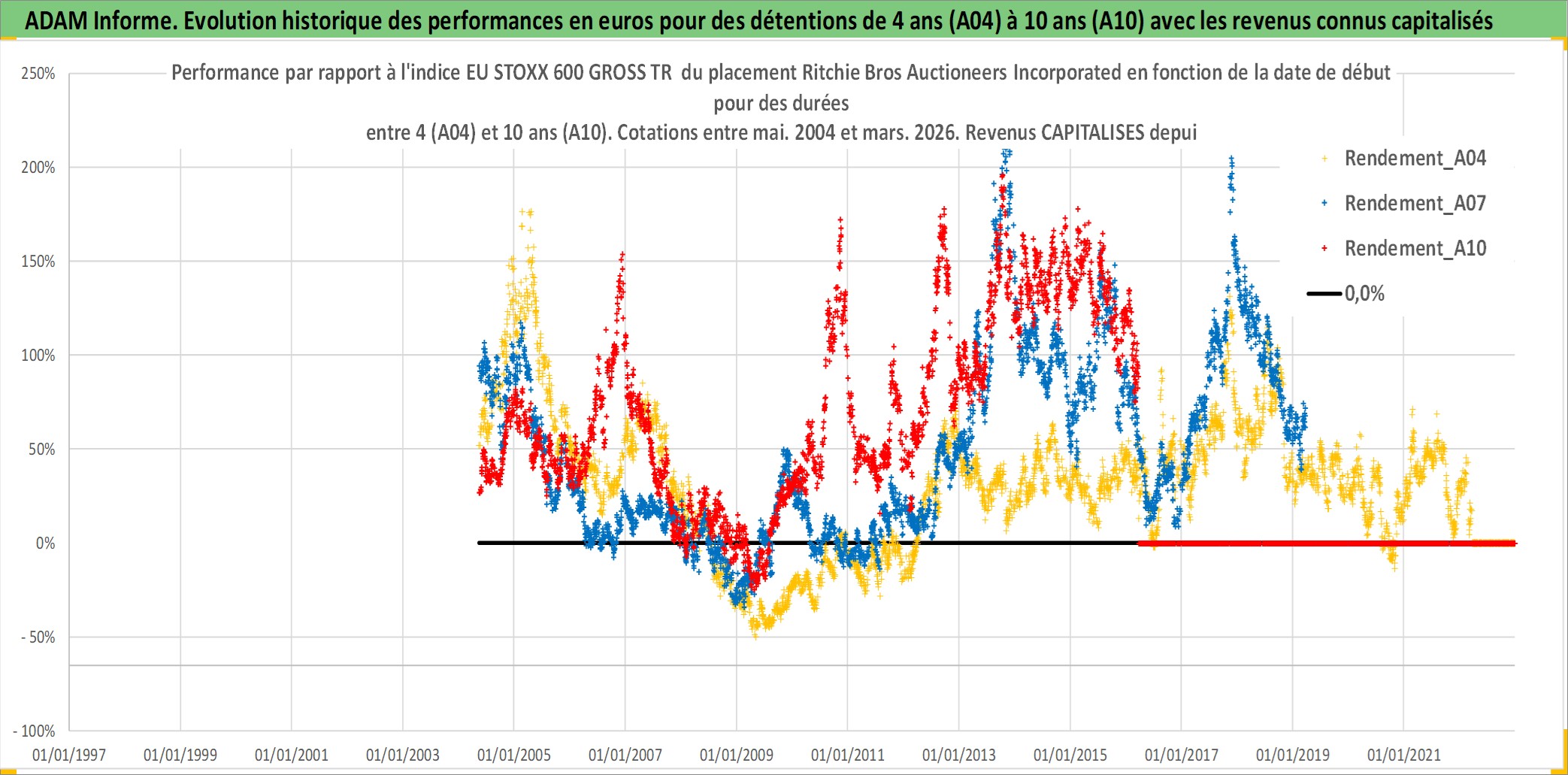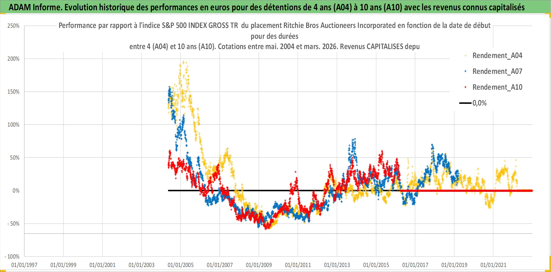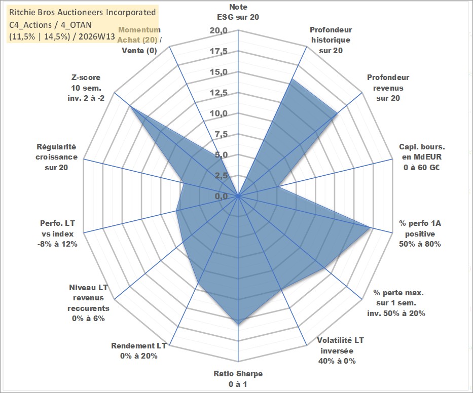 Site dédié aux investisseursPage dédiée sur site financeAnalyse des valorisations hebdomadaires de l'action Ritchie Bros Auctioneers Incorporated. Cet actif est cote en CAD. Les valorisations sont en contrevaleur EURO et couvrent les semaines 2004W19 a 2026W13. Les revenus de cet actif financier sont pris en compte depuis la semaine 2004W22. La note ESG de cet actif n'est pas connue.