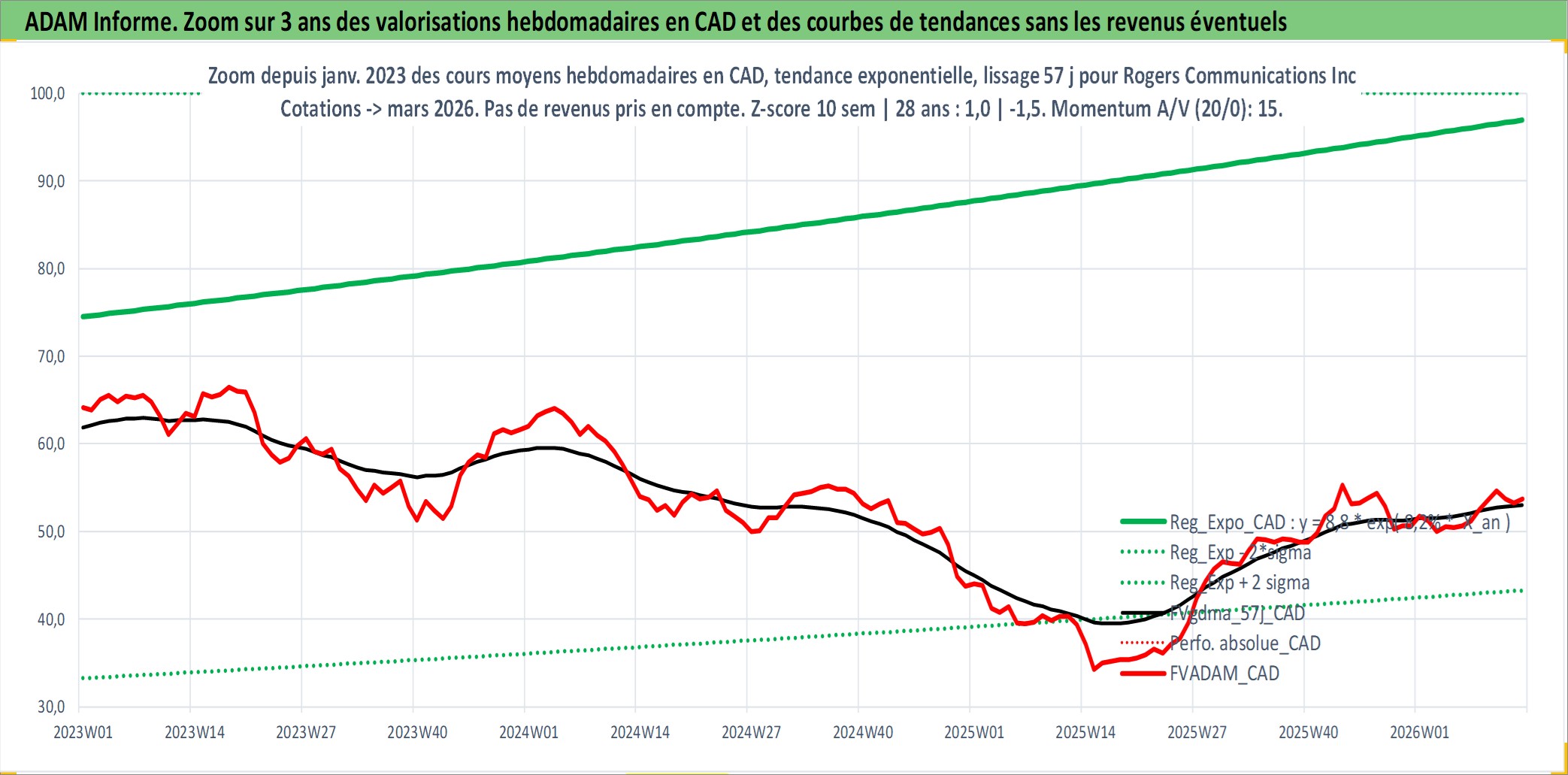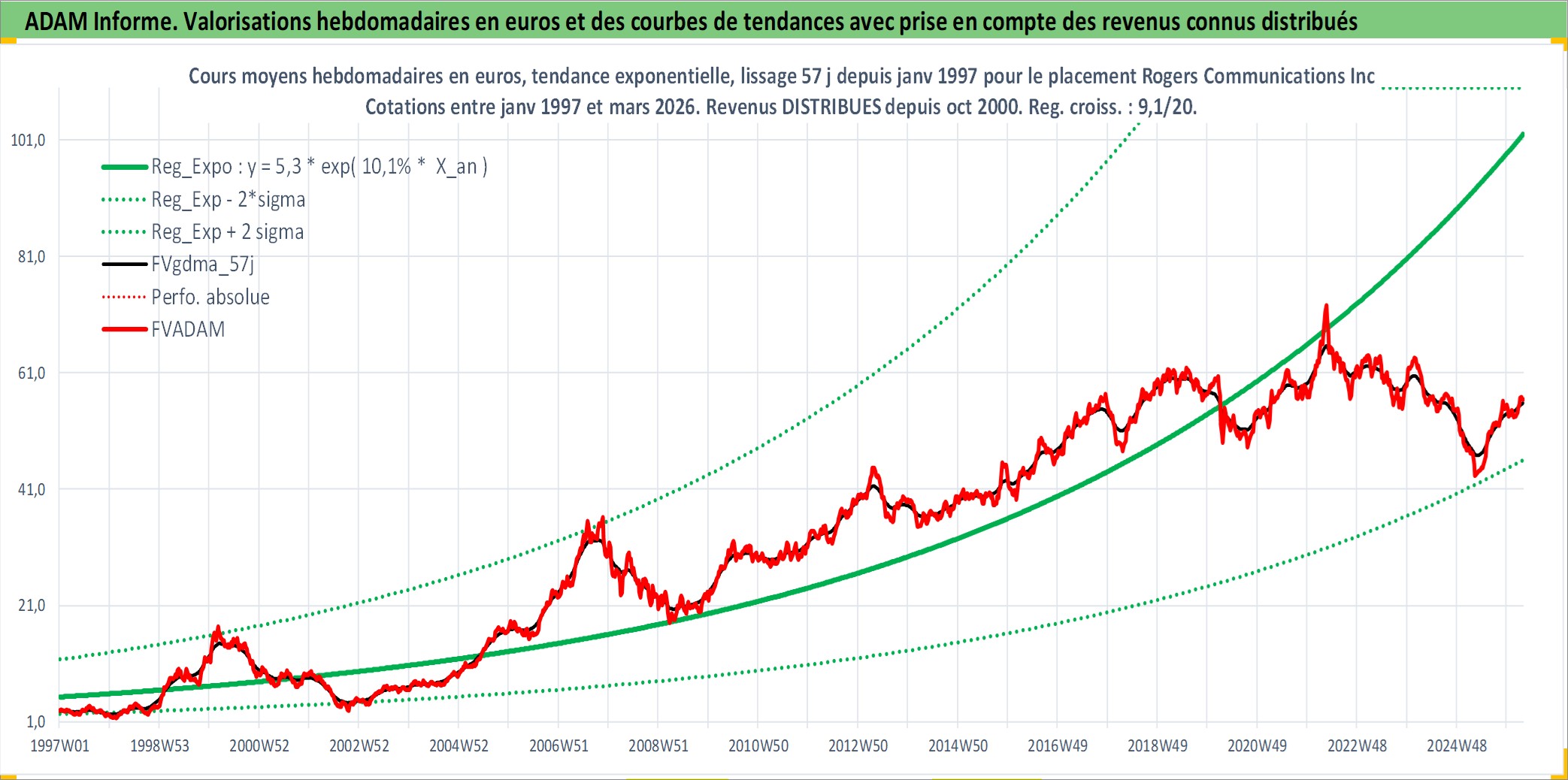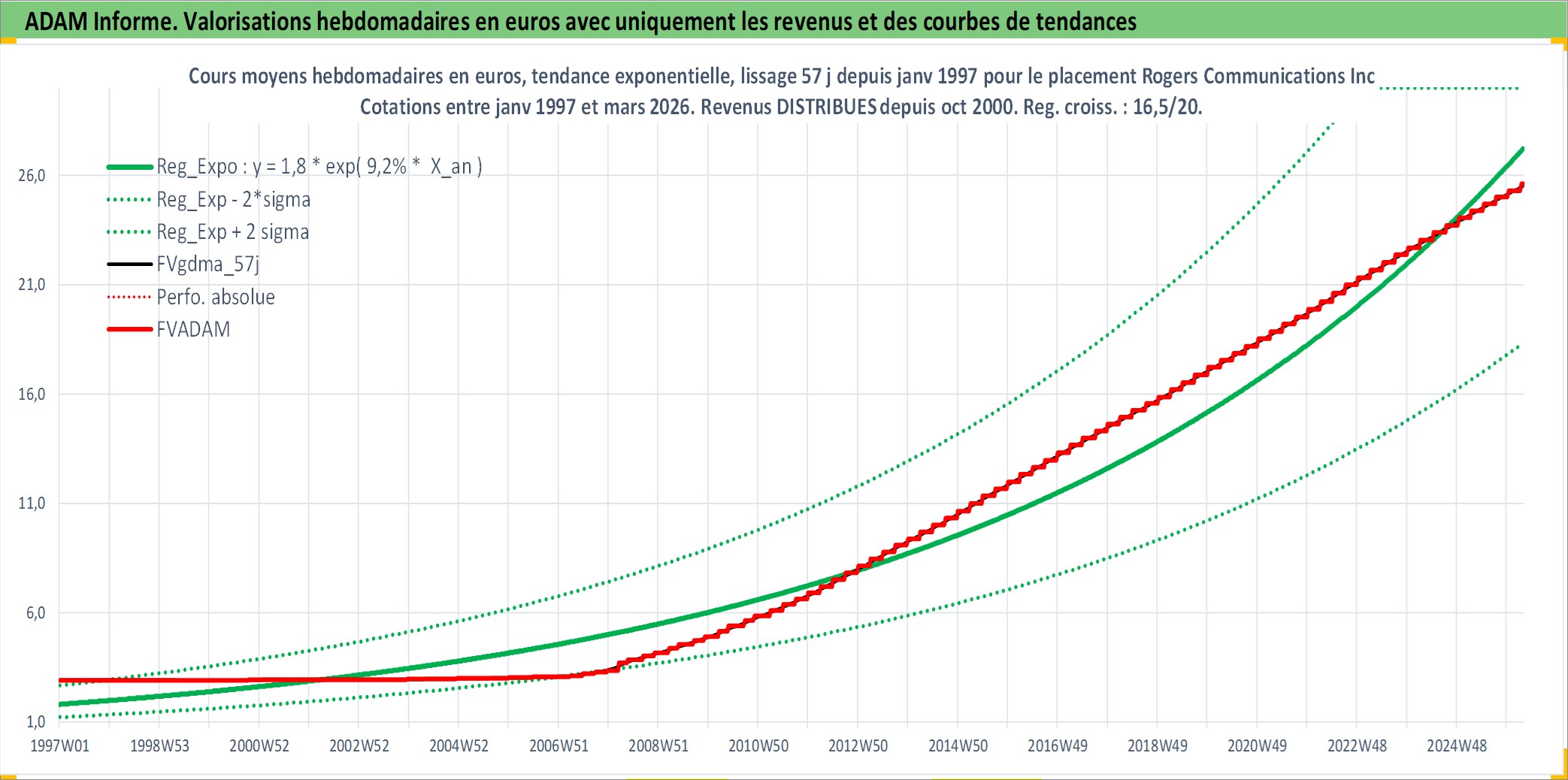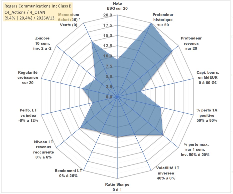 Site dédié aux investisseursPage dédiée sur site financeAnalyse des valorisations hebdomadaires de l'action Rogers Communications Inc Class B. Cet actif est cote en CAD. Les valorisations sont en contrevaleur EURO et couvrent les semaines 1997W01 a 2026W13. Les revenus de cet actif financier sont pris en compte depuis la semaine 2000W41. La note globale ESG de cet actif est estimee a 9.0 (apres rebasage entre 0 et 20).