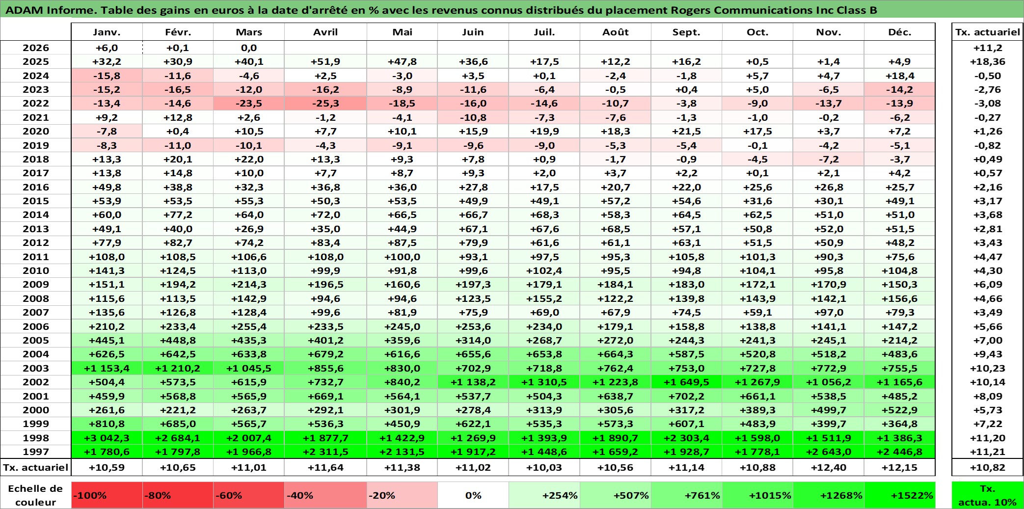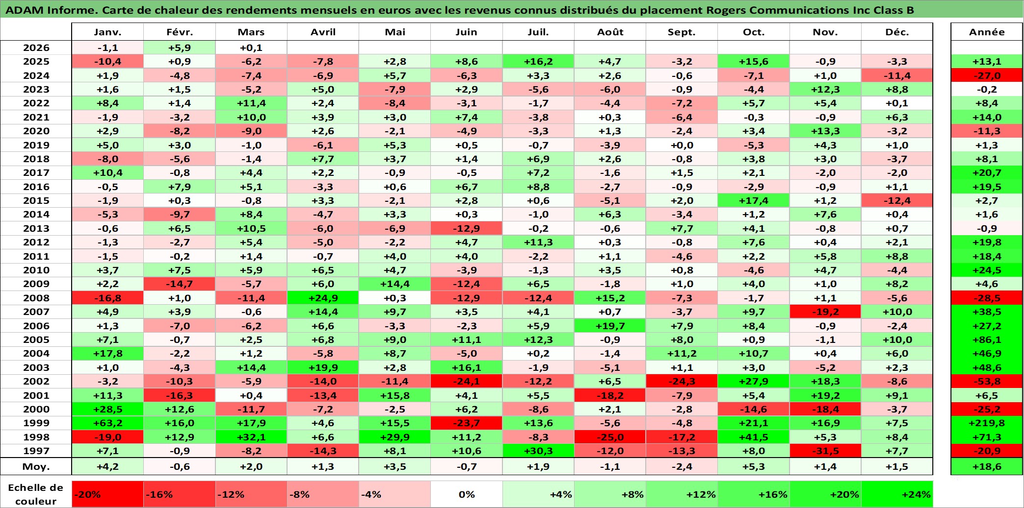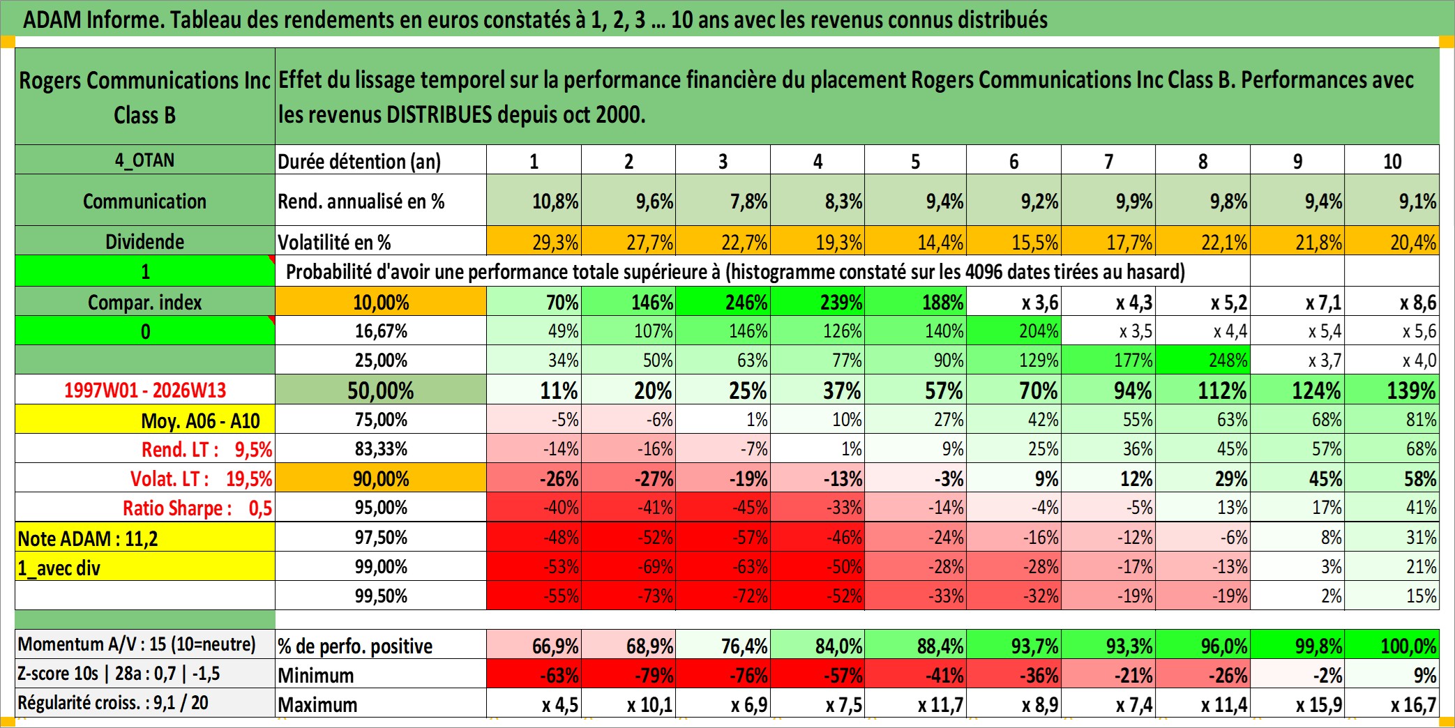 Site dédié aux investisseursPage dédiée sur site financeAnalyse des valorisations hebdomadaires de l'action Rogers Communications Inc Class B. Cet actif est cote en CAD. Les valorisations sont en contrevaleur EURO et couvrent les semaines 1997W01 a 2026W13. Les revenus de cet actif financier sont pris en compte depuis la semaine 2000W41. La note globale ESG de cet actif est estimee a 9.0 (apres rebasage entre 0 et 20).