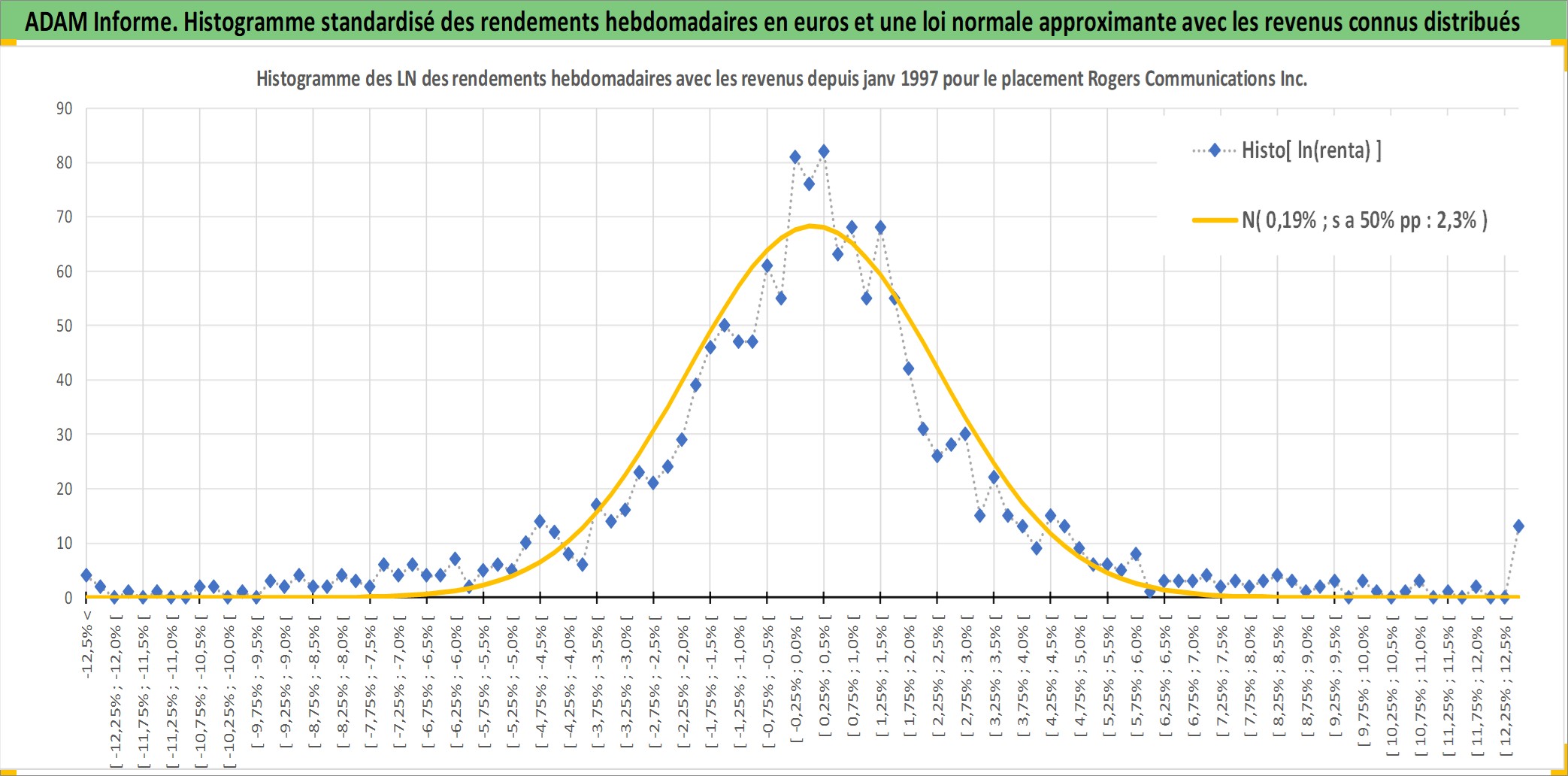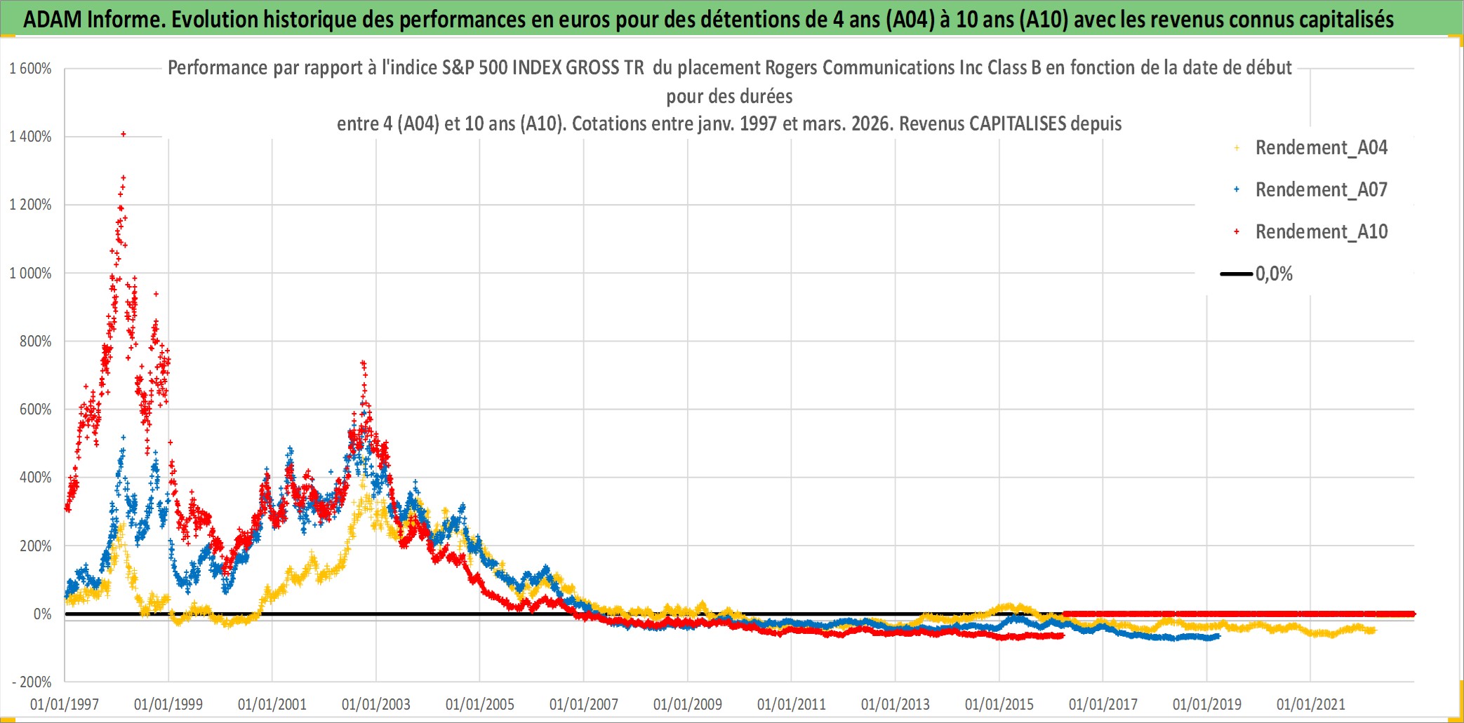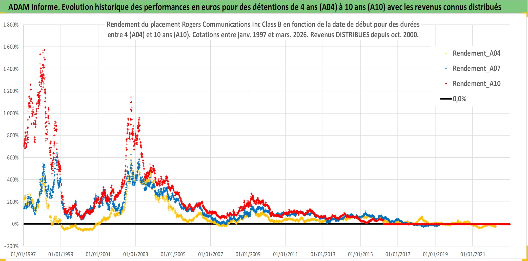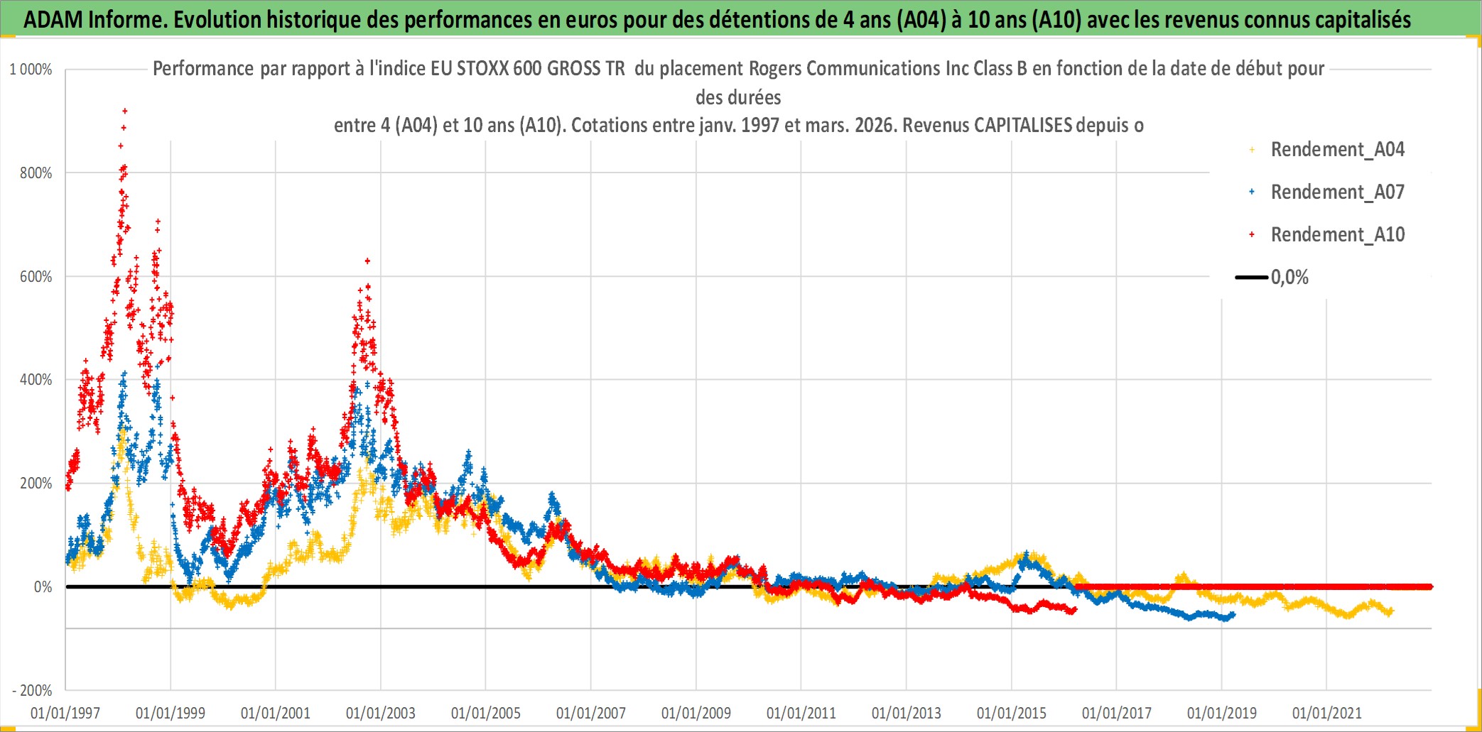 Site dédié aux investisseursPage dédiée sur site financeAnalyse des valorisations hebdomadaires de l'action Rogers Communications Inc Class B. Cet actif est cote en CAD. Les valorisations sont en contrevaleur EURO et couvrent les semaines 1997W01 a 2026W13. Les revenus de cet actif financier sont pris en compte depuis la semaine 2000W41. La note globale ESG de cet actif est estimee a 9.0 (apres rebasage entre 0 et 20).