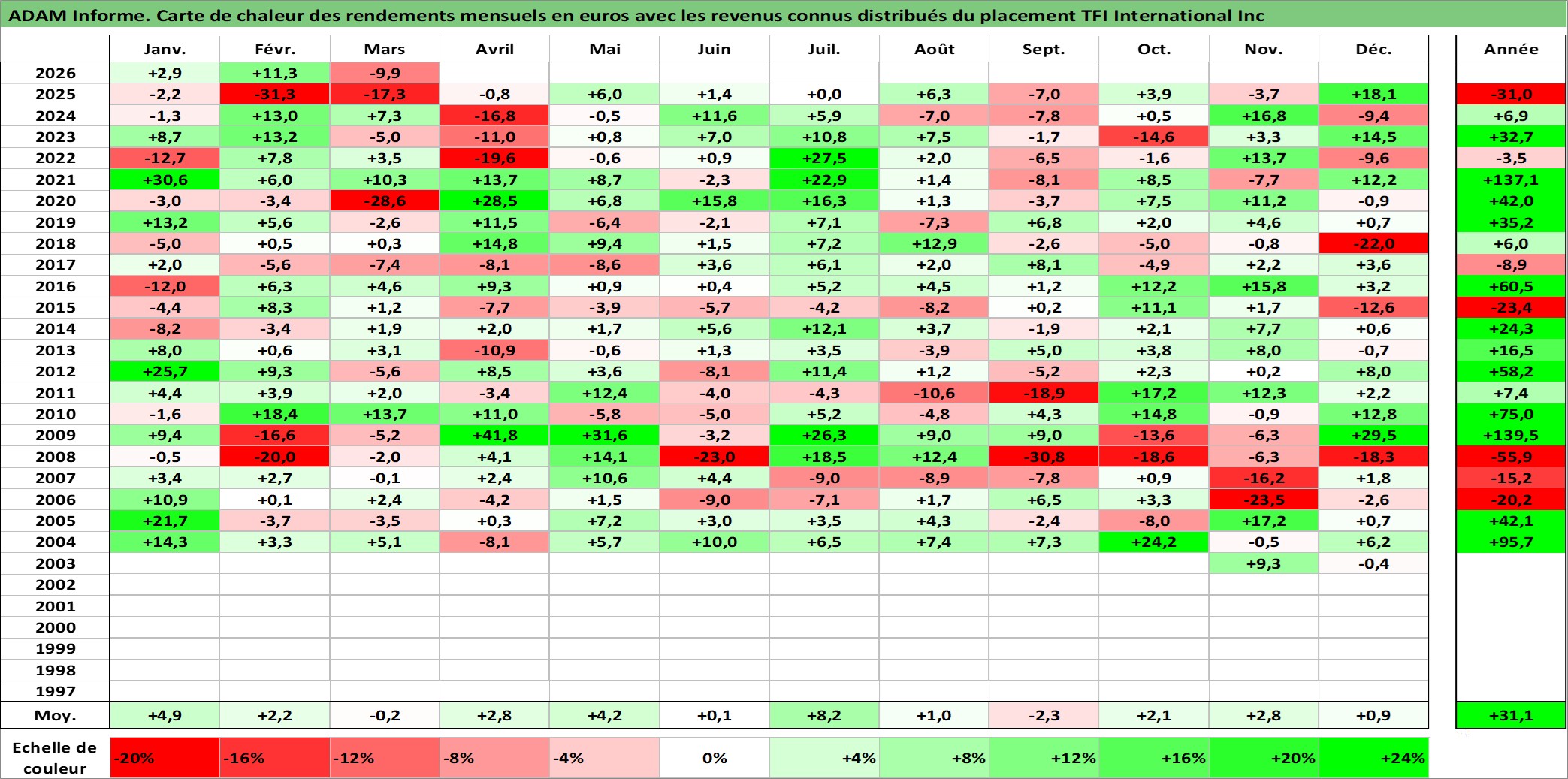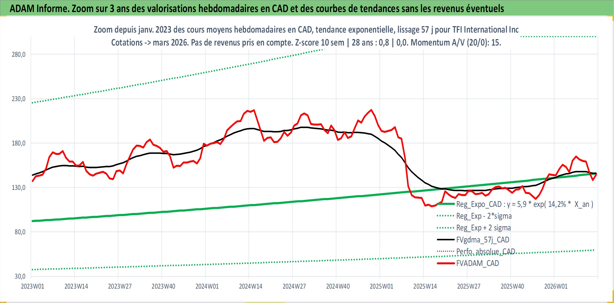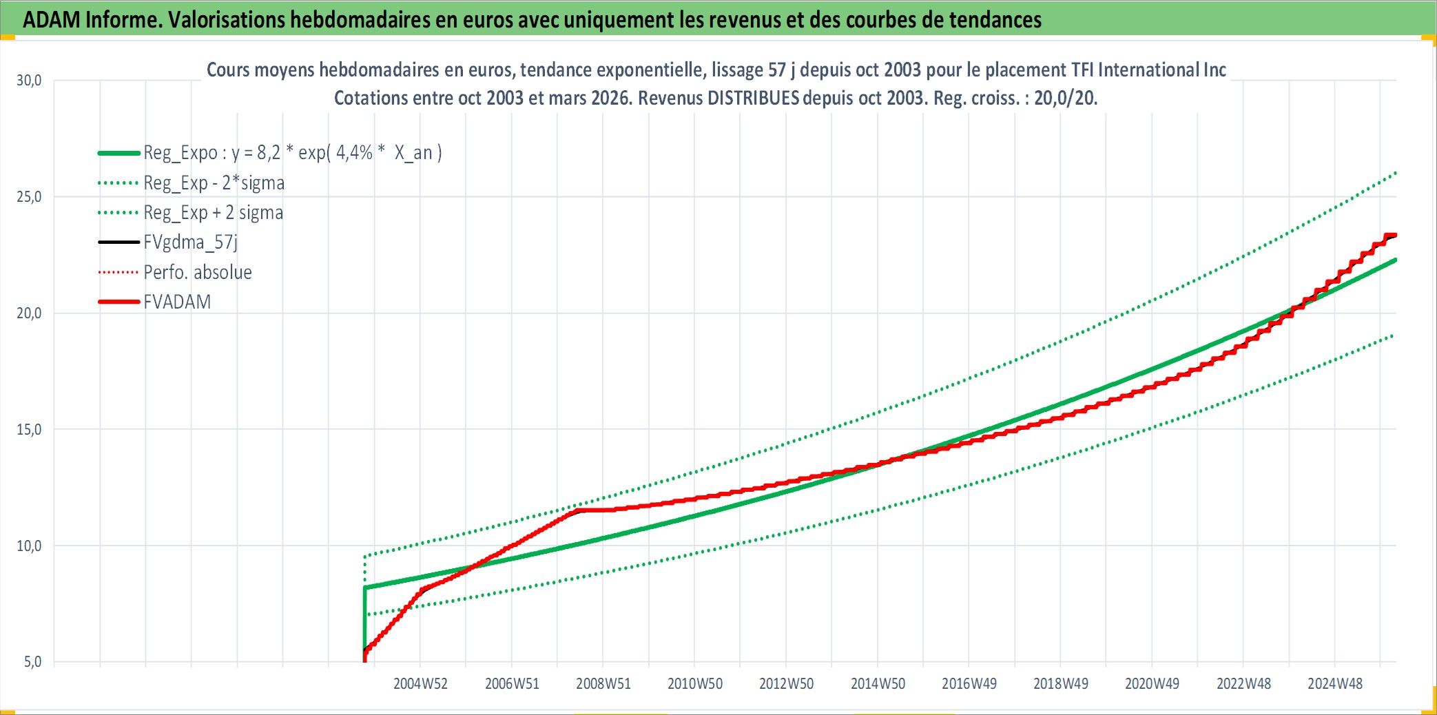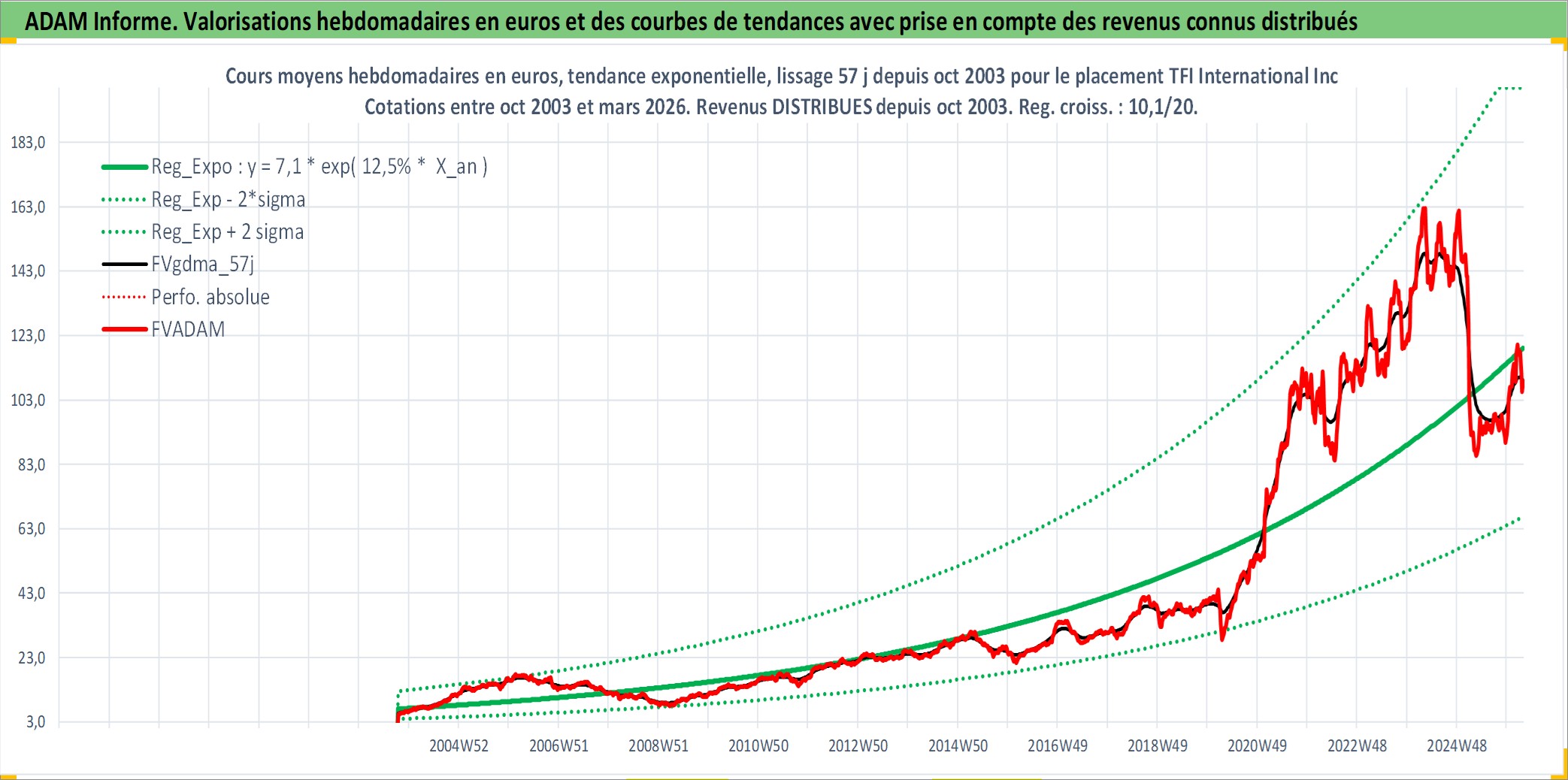 Site dédié aux investisseursPage dédiée sur site financeAnalyse des valorisations hebdomadaires de l'action TFI International Inc. Cet actif est cote en CAD. Les valorisations sont en contrevaleur EURO et couvrent les semaines 2003W41 a 2026W13. Les revenus de cet actif financier sont pris en compte depuis la semaine 2003W44. La note ESG de cet actif n'est pas connue.