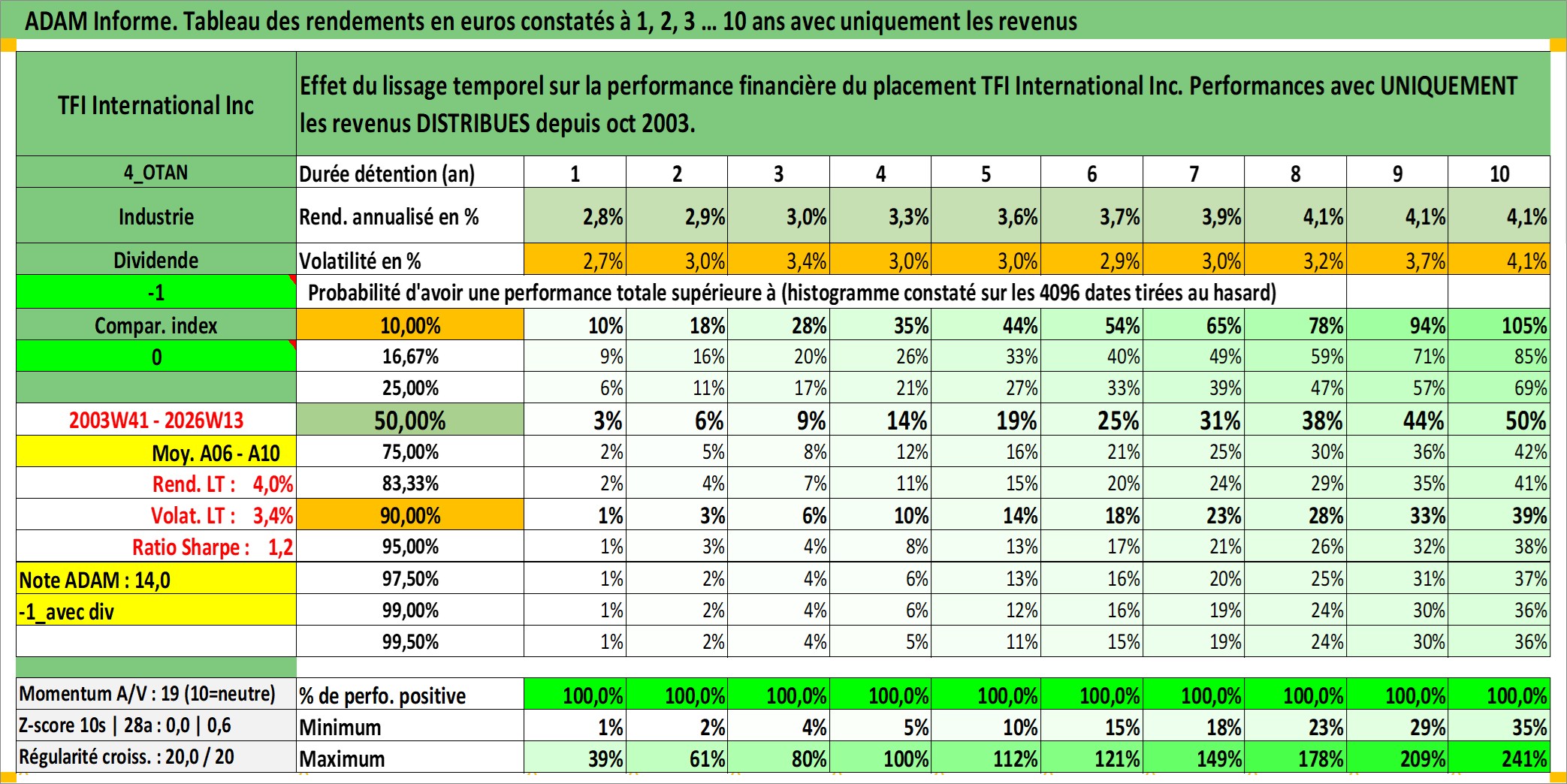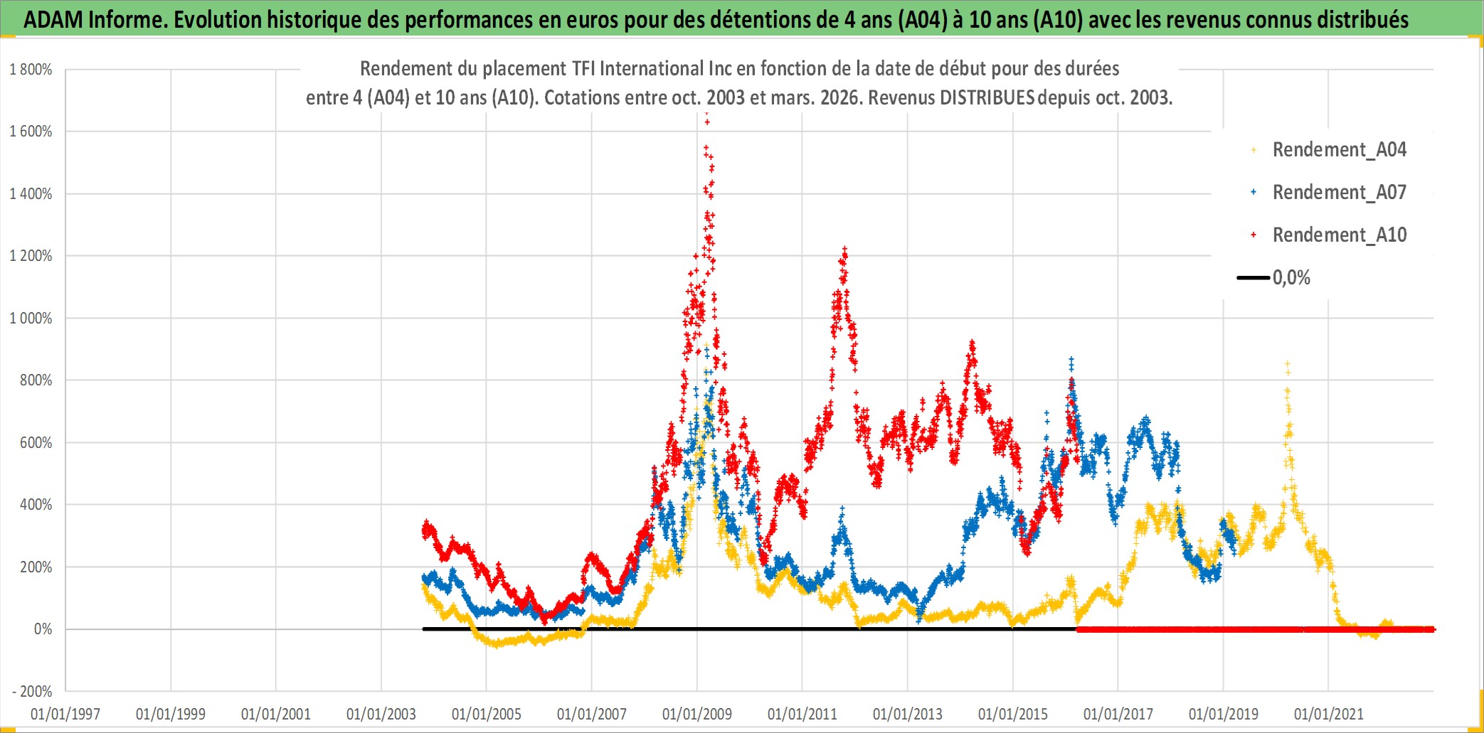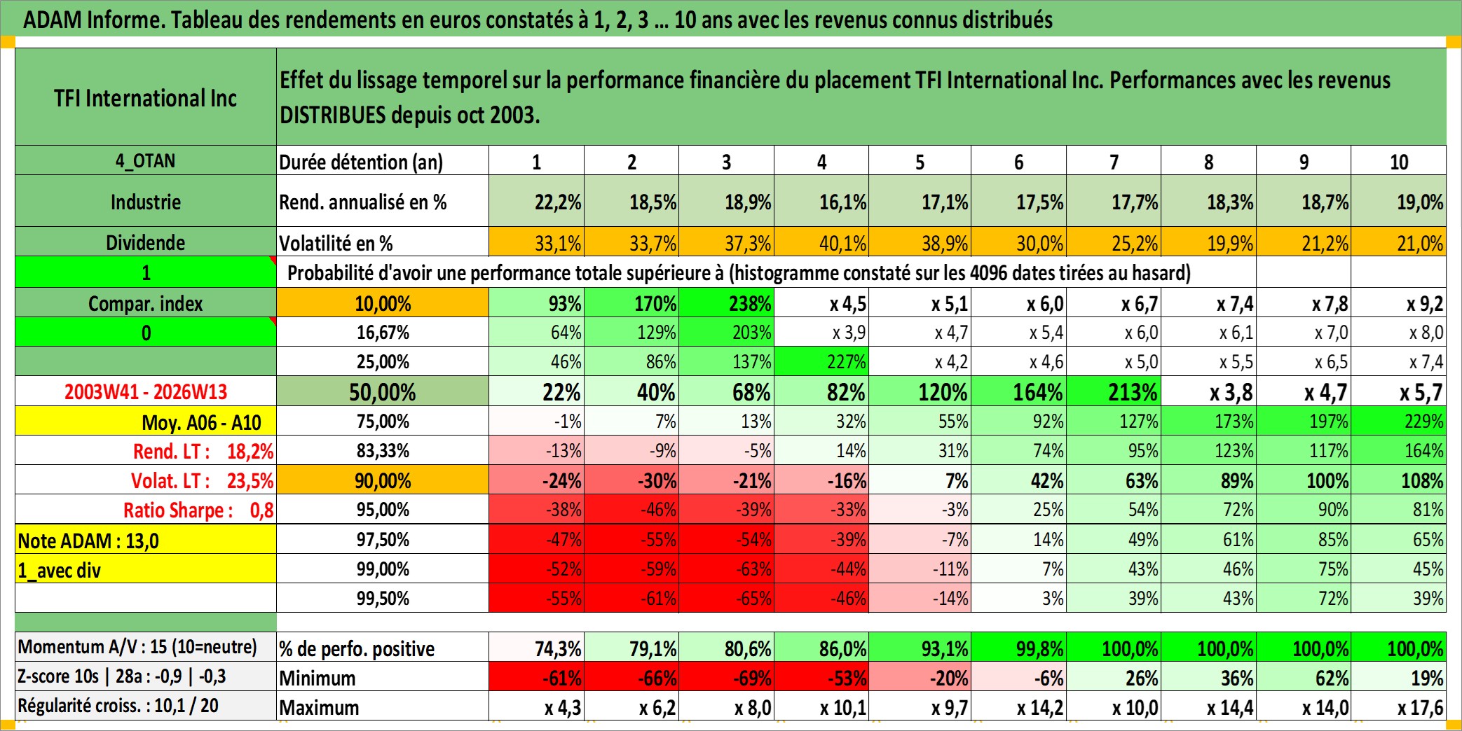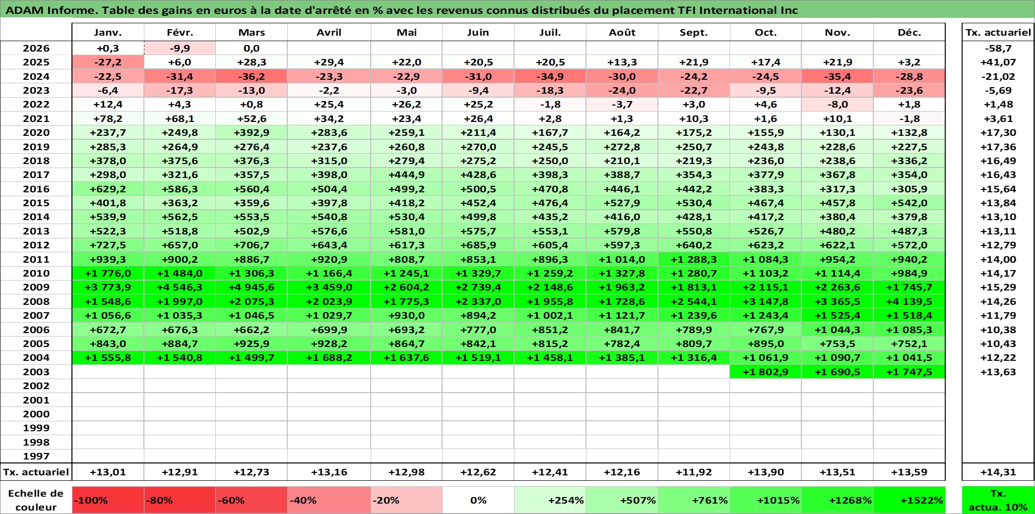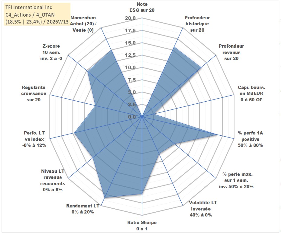 Site dédié aux investisseursPage dédiée sur site financeAnalyse des valorisations hebdomadaires de l'action TFI International Inc. Cet actif est cote en CAD. Les valorisations sont en contrevaleur EURO et couvrent les semaines 2003W41 a 2026W13. Les revenus de cet actif financier sont pris en compte depuis la semaine 2003W44. La note ESG de cet actif n'est pas connue.