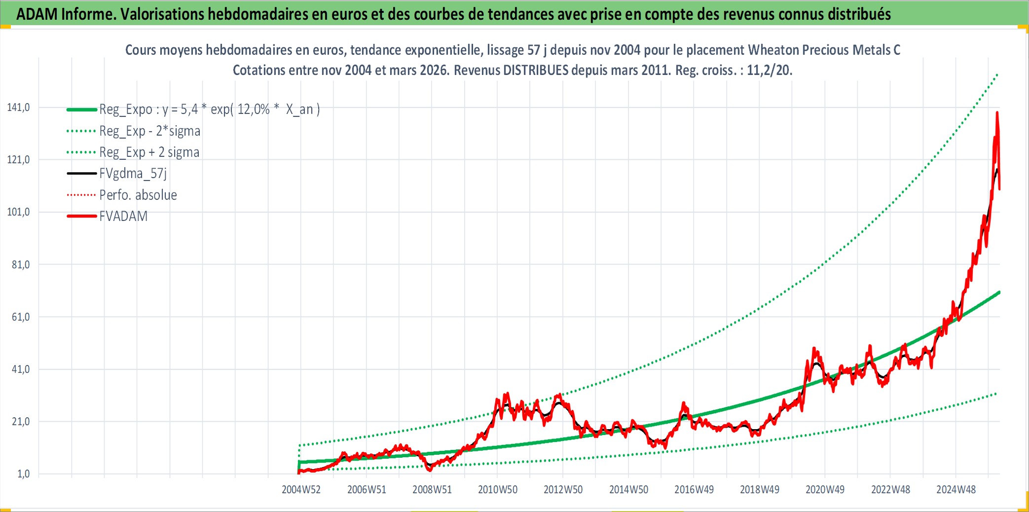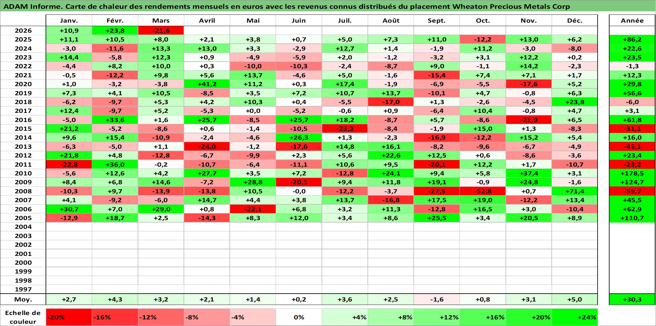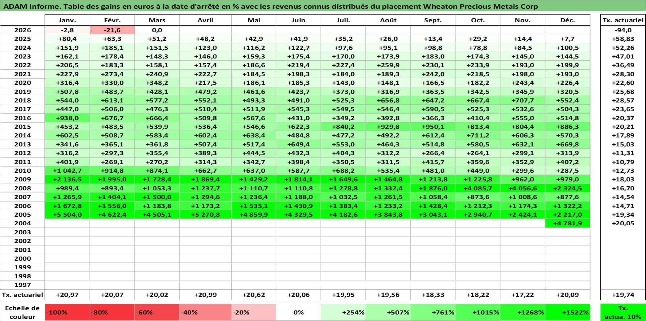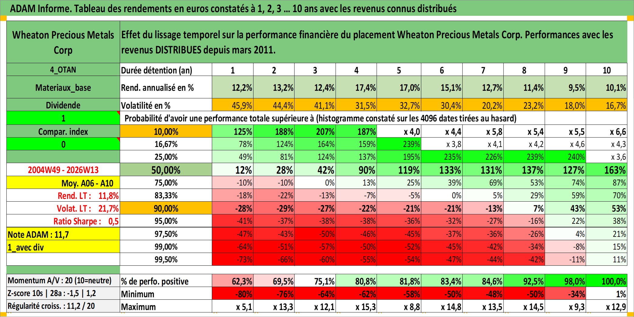 Site dédié aux investisseursPage dédiée sur site financeAnalyse des valorisations hebdomadaires de l'action Wheaton Precious Metals Corp. Cet actif est cote en CAD. Les valorisations sont en contrevaleur EURO et couvrent les semaines 2004W49 a 2026W13. Les revenus de cet actif financier sont pris en compte depuis la semaine 2011W11. La note globale ESG de cet actif est estimee a 19.0 (apres rebasage entre 0 et 20).