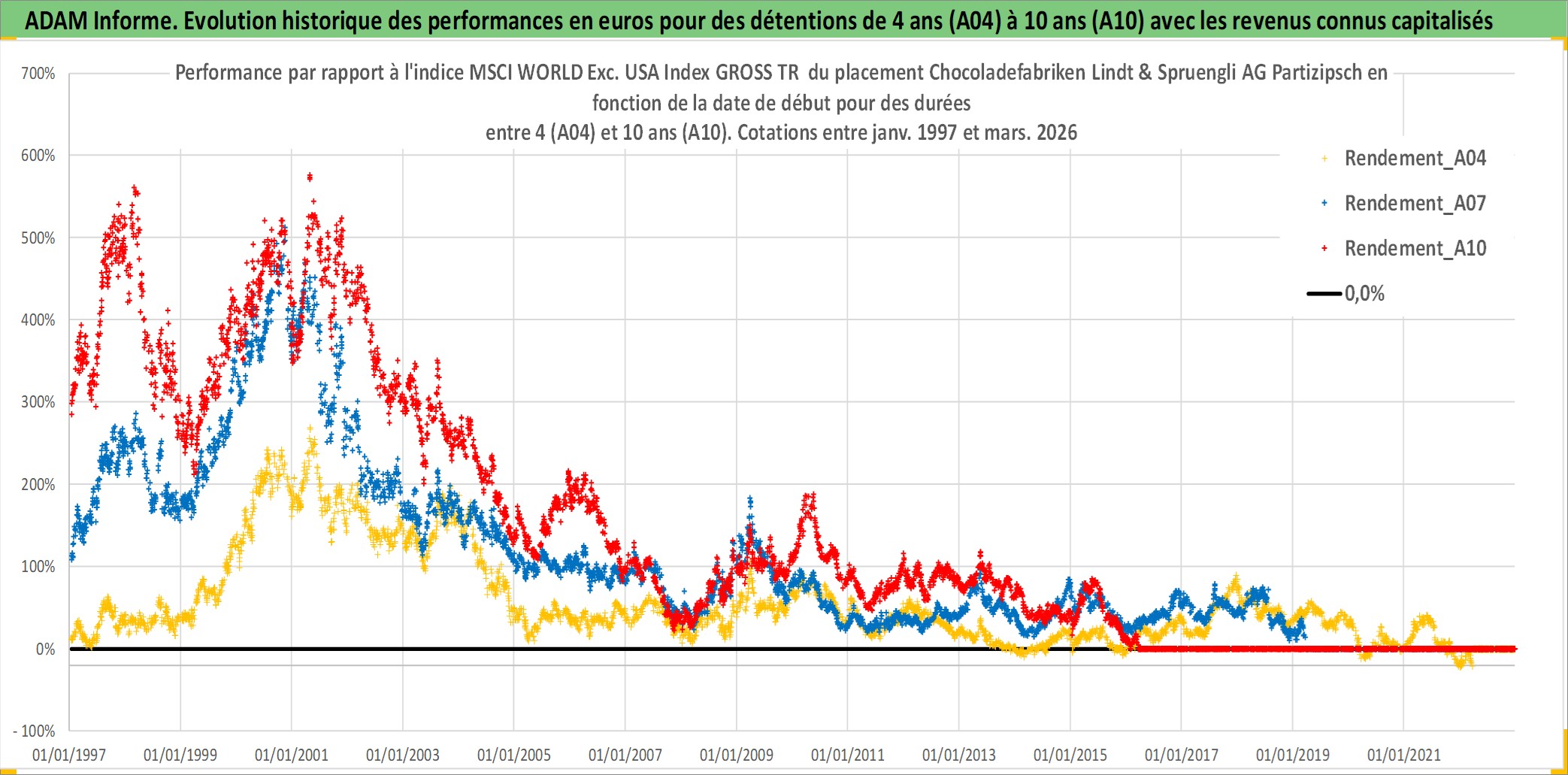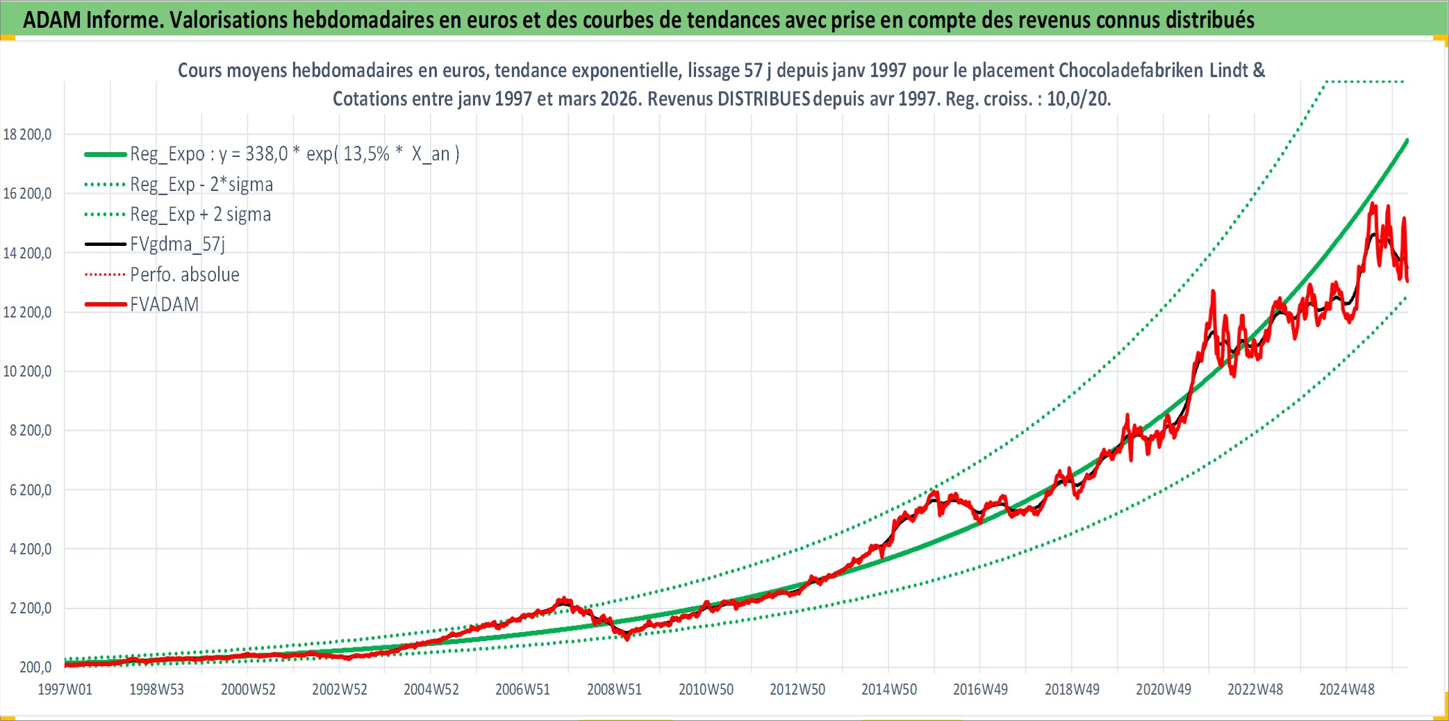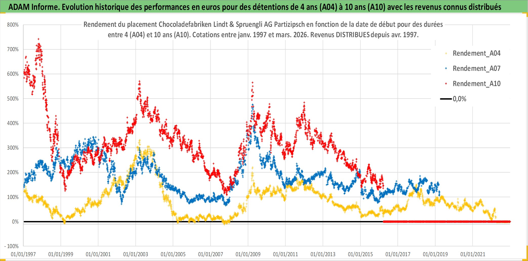 Site dédié aux investisseursPage dédiée sur site financeAnalyse des valorisations hebdomadaires de l'action Chocoladefabriken Lindt & Spruengli AG Partizipsch. Cet actif est cote en CHF. Les valorisations sont en contrevaleur EURO et couvrent les semaines 1997W01 a 2026W13. Les revenus de cet actif financier sont pris en compte depuis la semaine 1997W18. La note ESG de cet actif n'est pas connue.