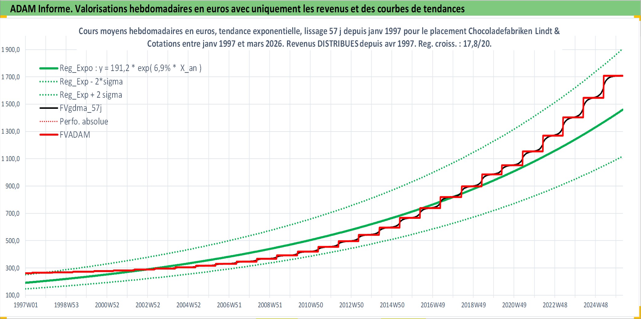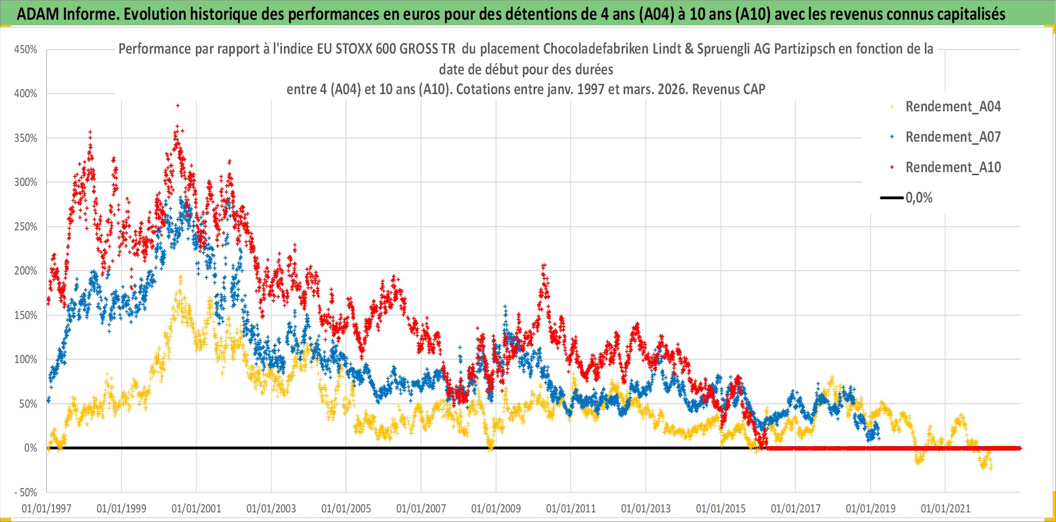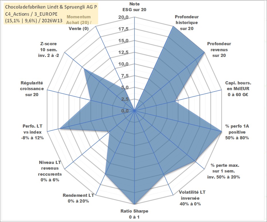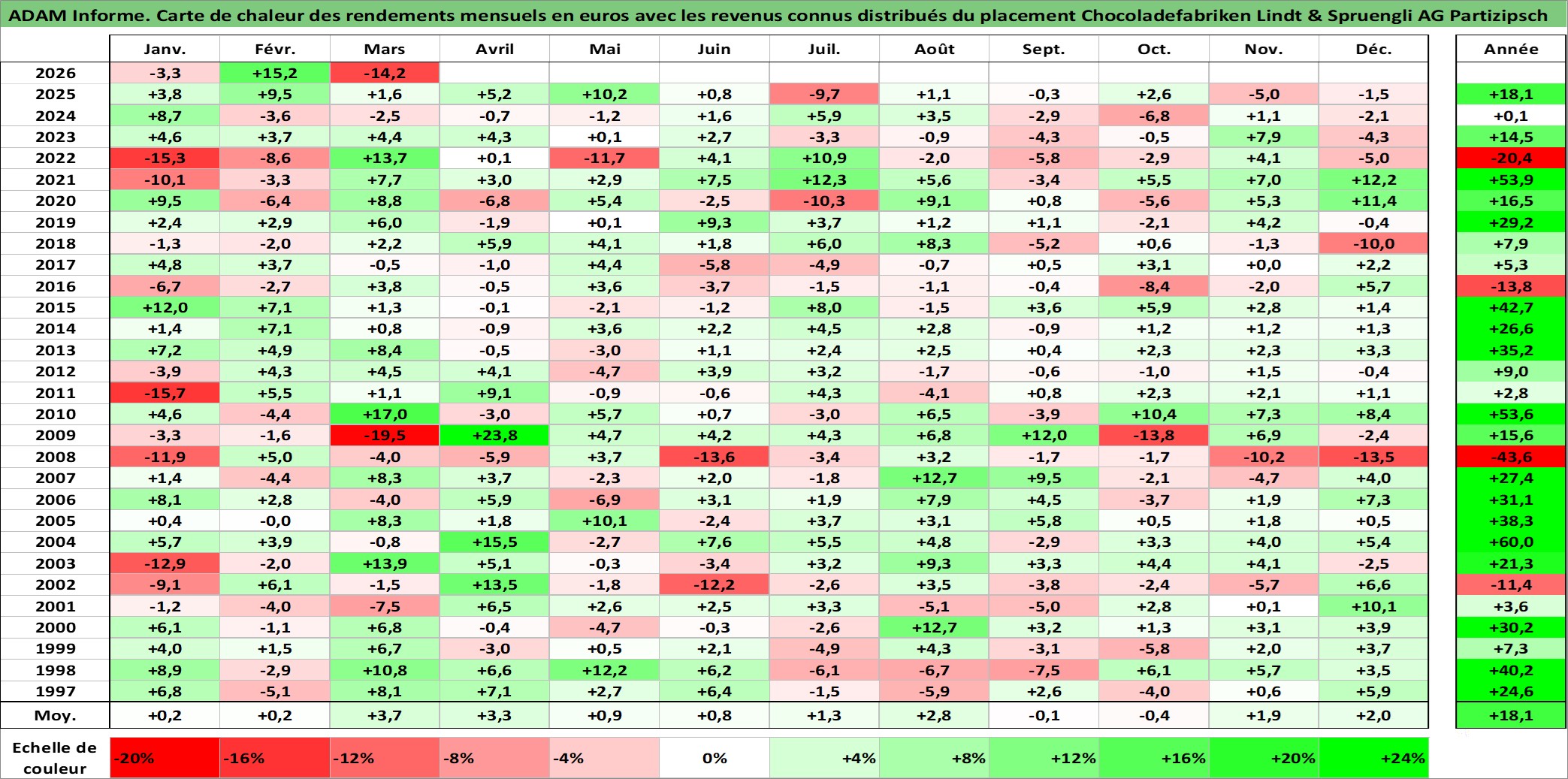 Site dédié aux investisseursPage dédiée sur site financeAnalyse des valorisations hebdomadaires de l'action Chocoladefabriken Lindt & Spruengli AG Partizipsch. Cet actif est cote en CHF. Les valorisations sont en contrevaleur EURO et couvrent les semaines 1997W01 a 2026W13. Les revenus de cet actif financier sont pris en compte depuis la semaine 1997W18. La note ESG de cet actif n'est pas connue.