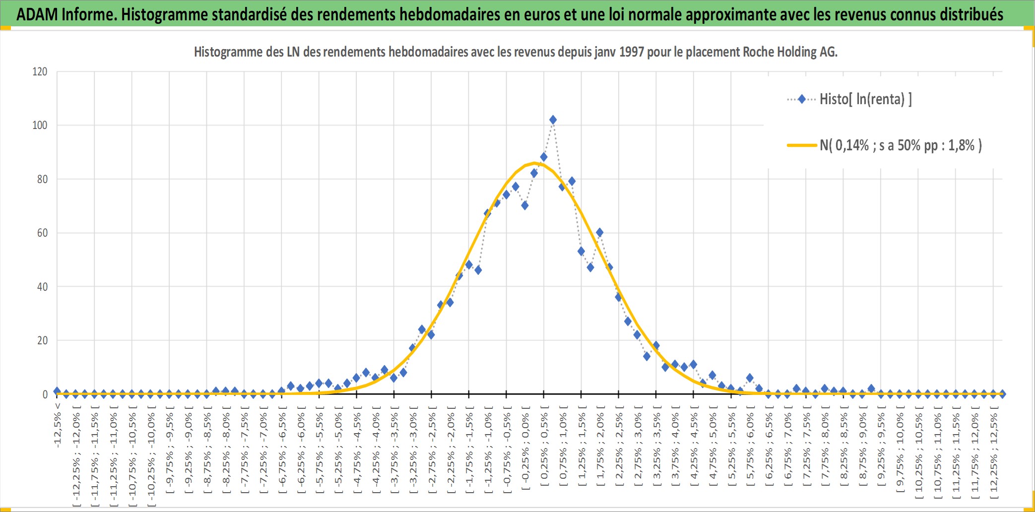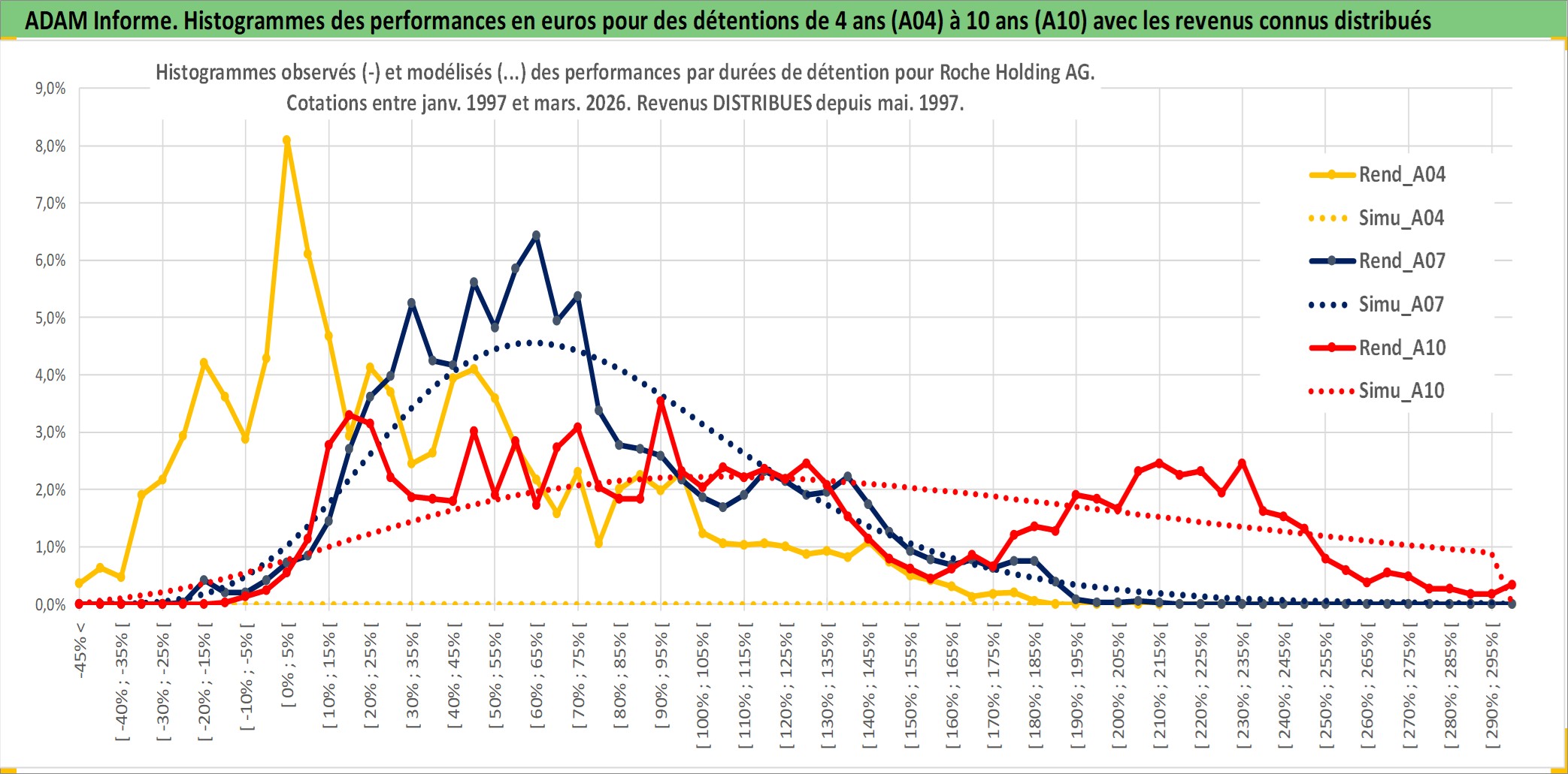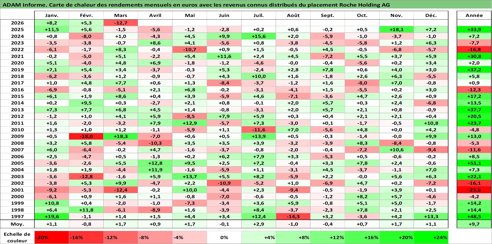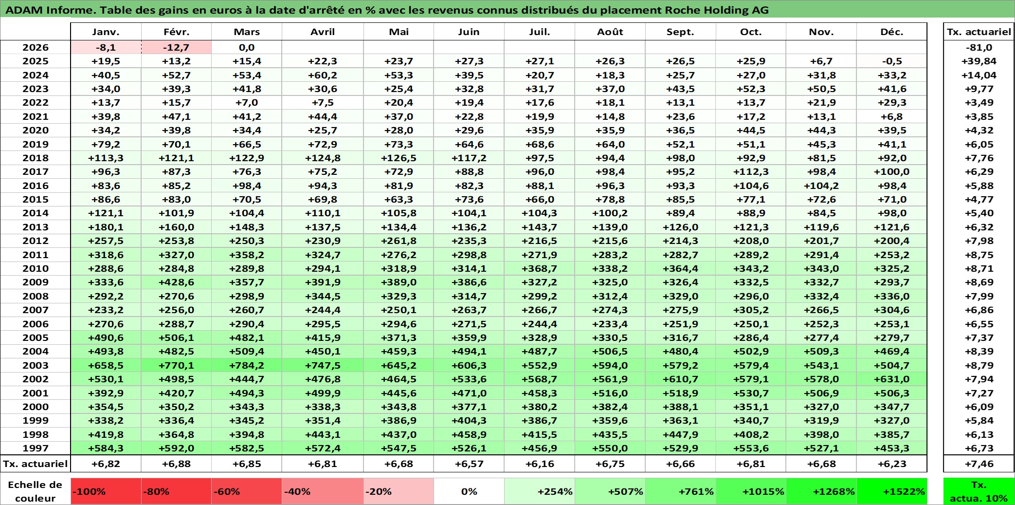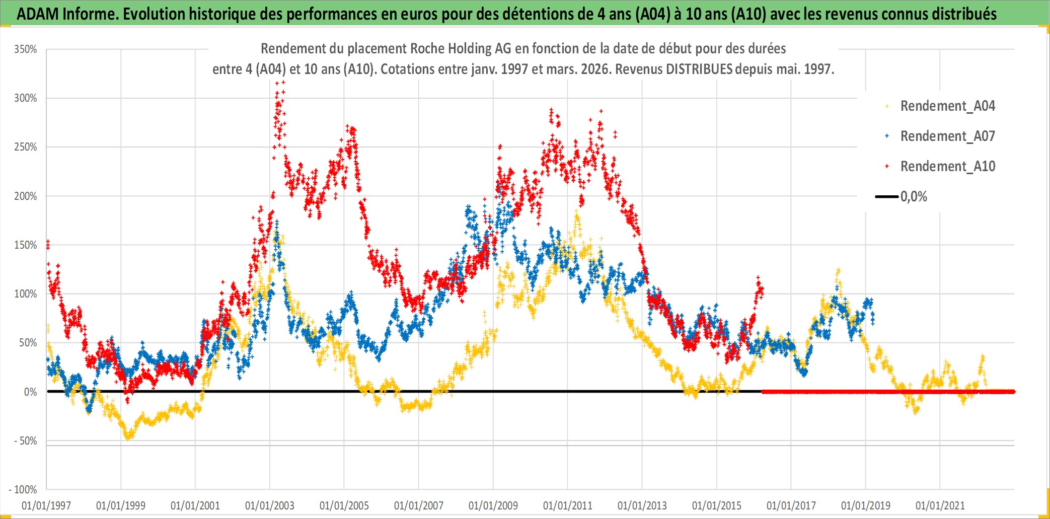 Site dédié aux investisseursPage dédiée sur site financeAnalyse des valorisations hebdomadaires de l'action Roche Holding AG. Cet actif est cote en CHF. Les valorisations sont en contrevaleur EURO et couvrent les semaines 1997W01 a 2026W13. Les revenus de cet actif financier sont pris en compte depuis la semaine 1997W19. La note globale ESG de cet actif est estimee a 8.0 (apres rebasage entre 0 et 20).