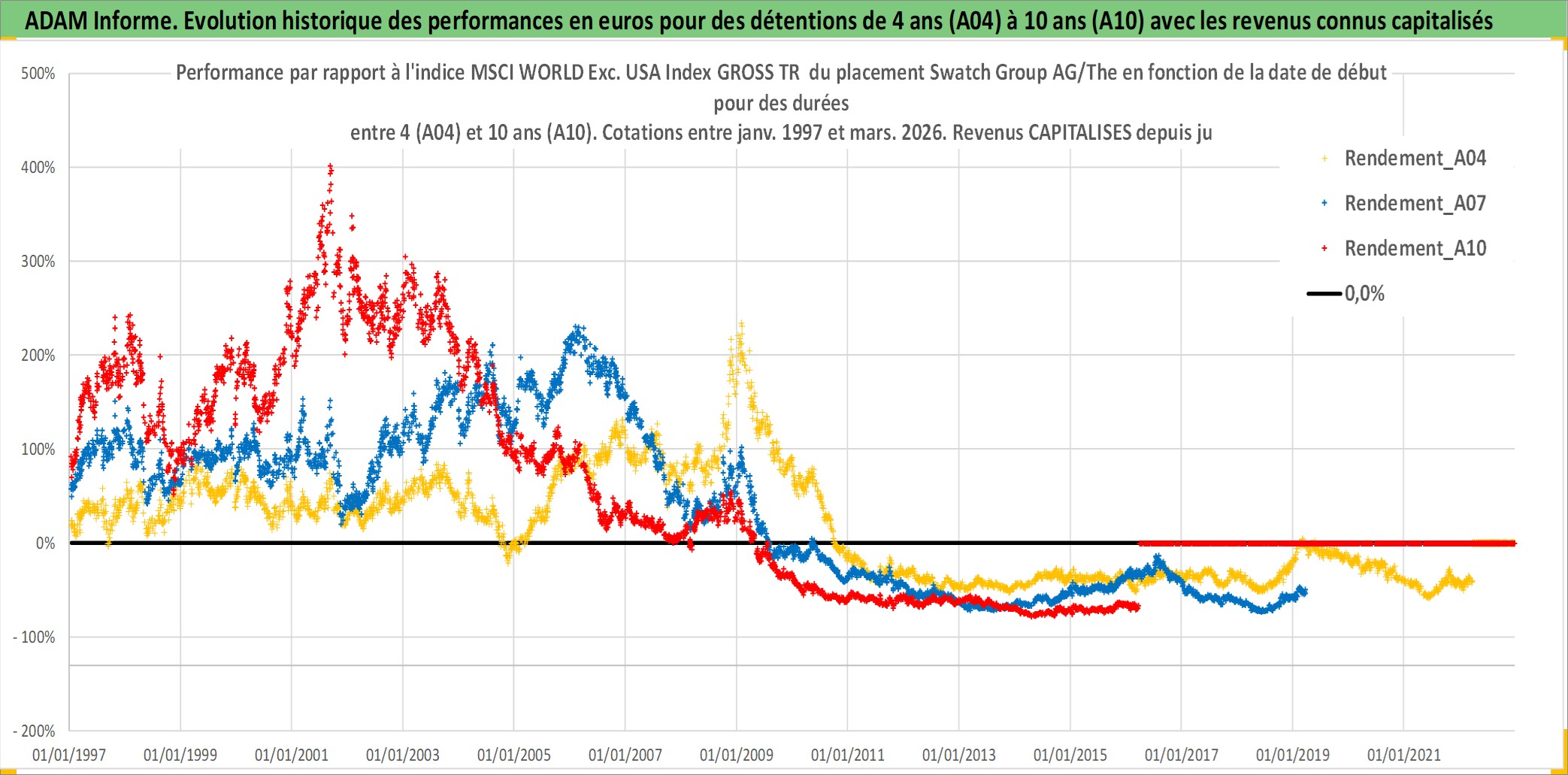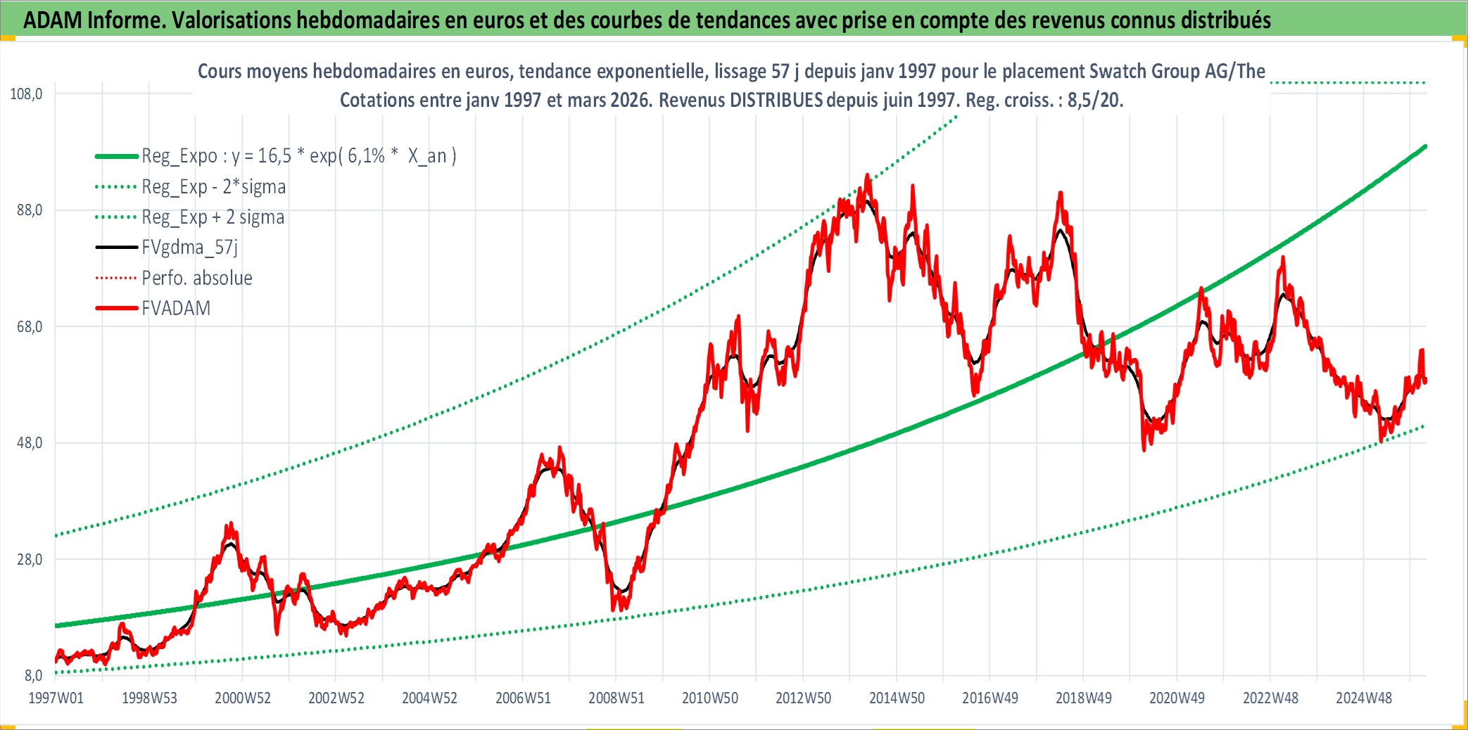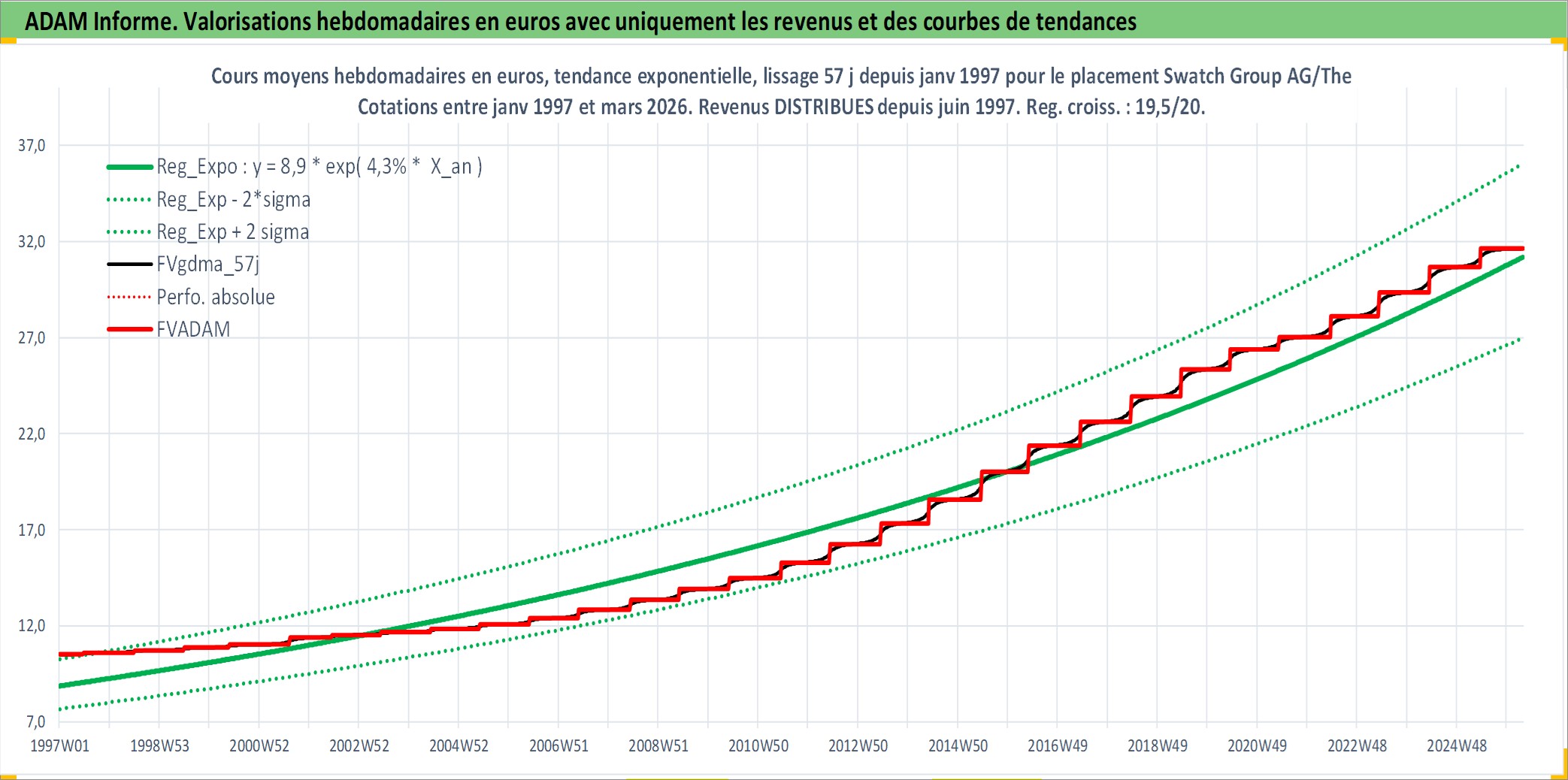 Site dédié aux investisseursPage dédiée sur site financeAnalyse des valorisations hebdomadaires de l'action Swatch Group AG/The. Cet actif est cote en CHF. Les valorisations sont en contrevaleur EURO et couvrent les semaines 1997W01 a 2026W13. Les revenus de cet actif financier sont pris en compte depuis la semaine 1997W26. La note ESG de cet actif n'est pas connue.