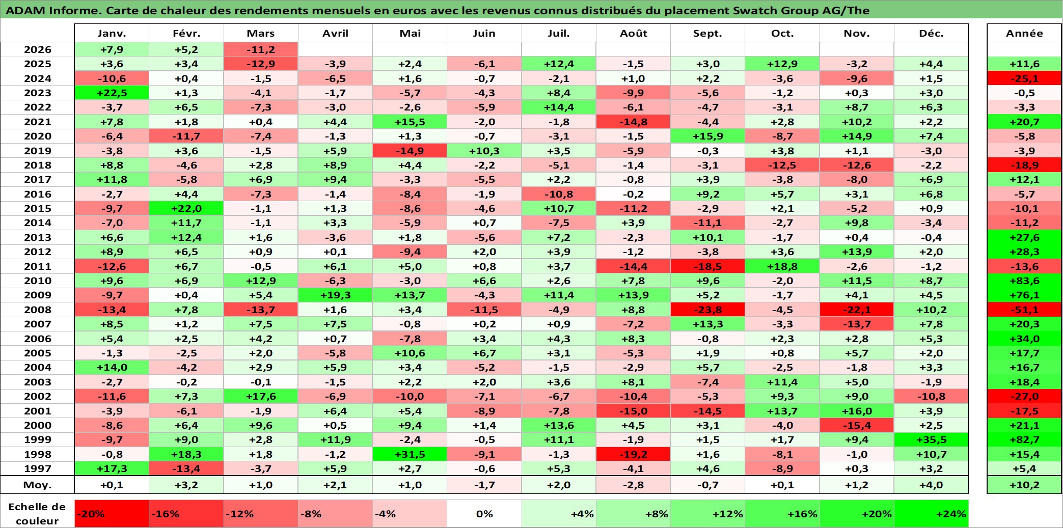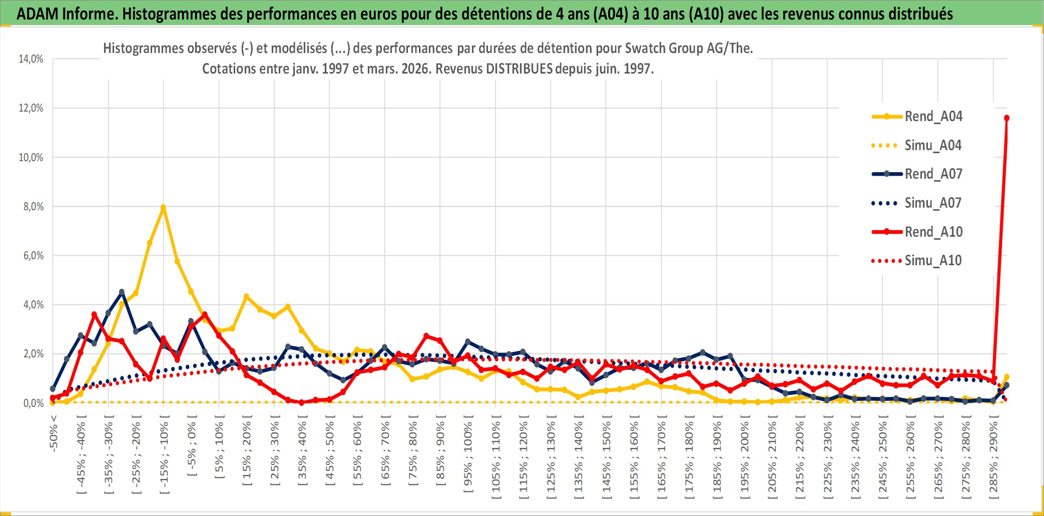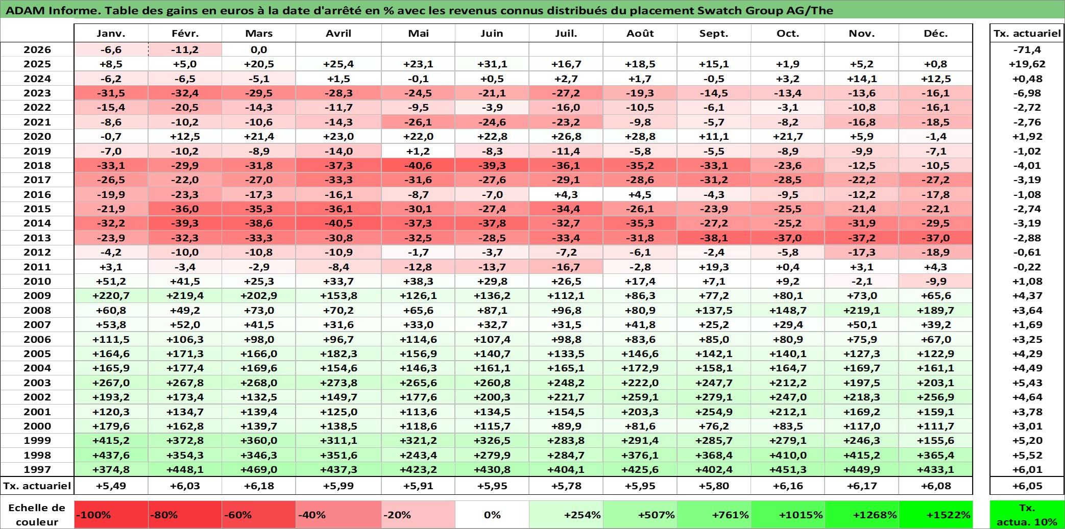 Site dédié aux investisseursPage dédiée sur site financeAnalyse des valorisations hebdomadaires de l'action Swatch Group AG/The. Cet actif est cote en CHF. Les valorisations sont en contrevaleur EURO et couvrent les semaines 1997W01 a 2026W13. Les revenus de cet actif financier sont pris en compte depuis la semaine 1997W26. La note ESG de cet actif n'est pas connue.