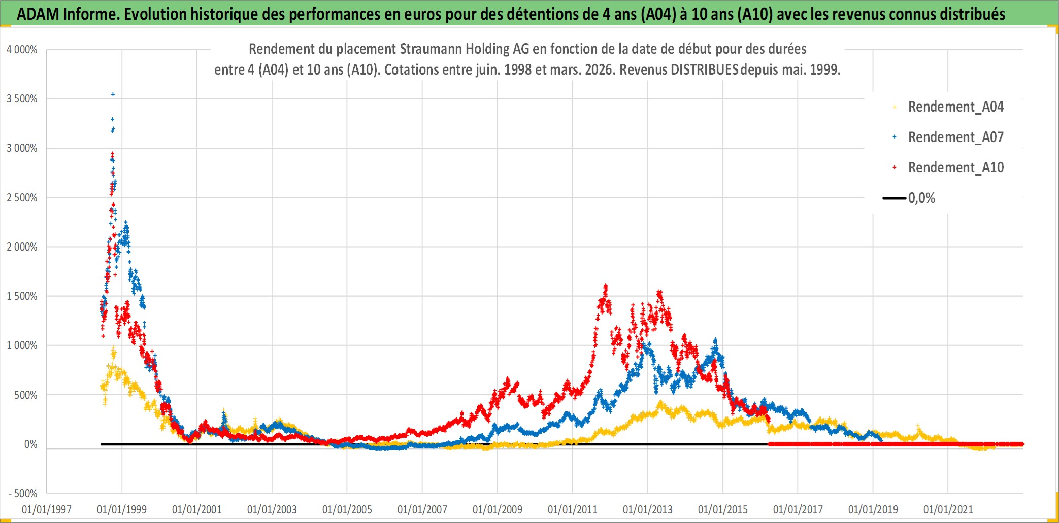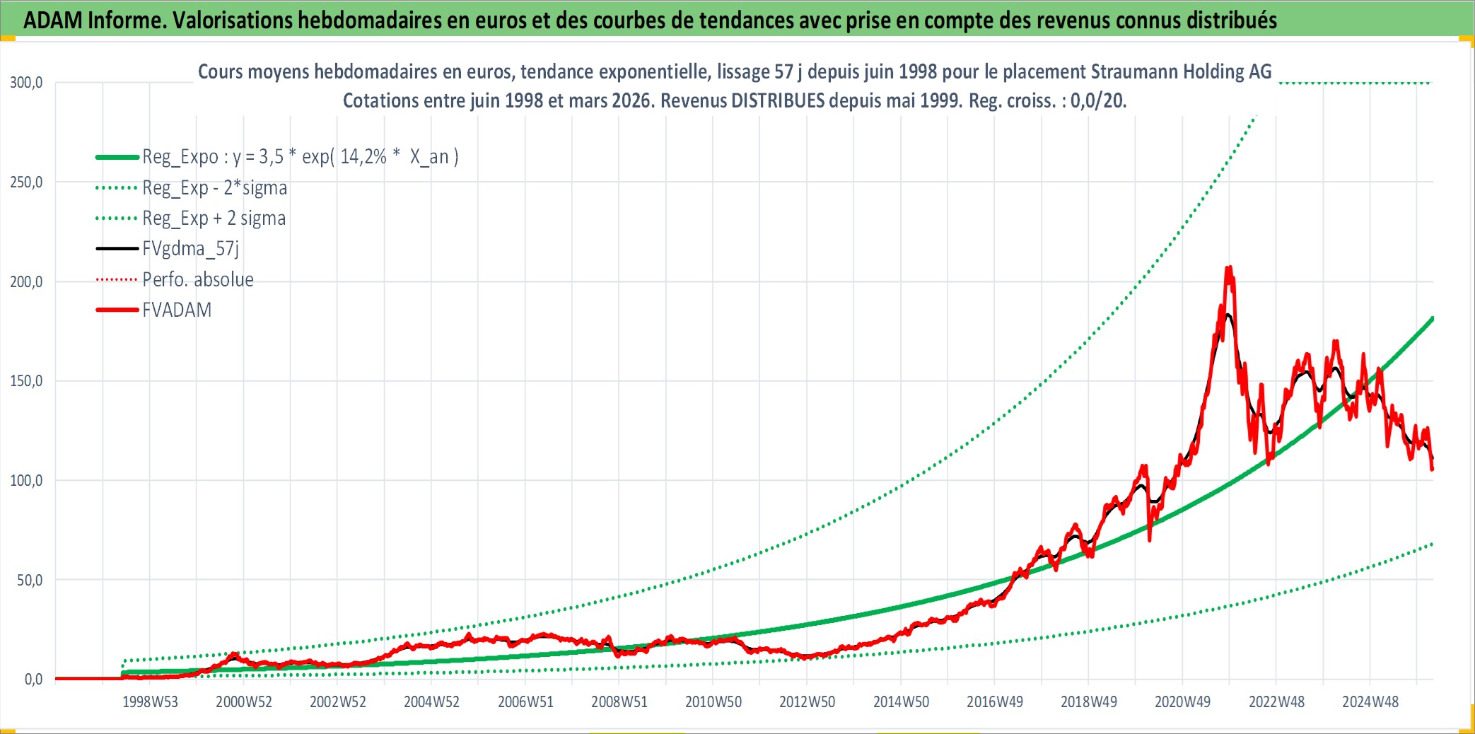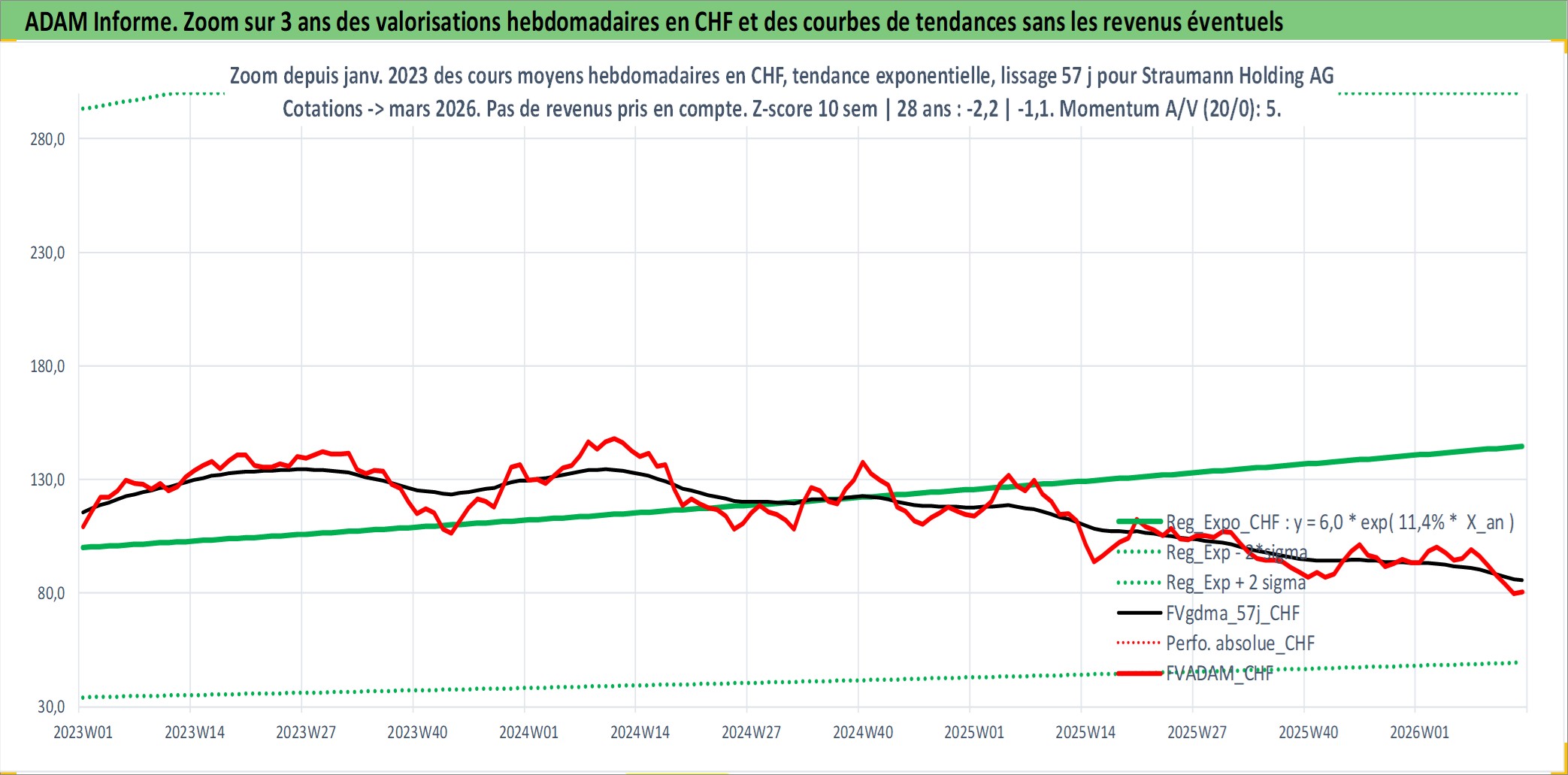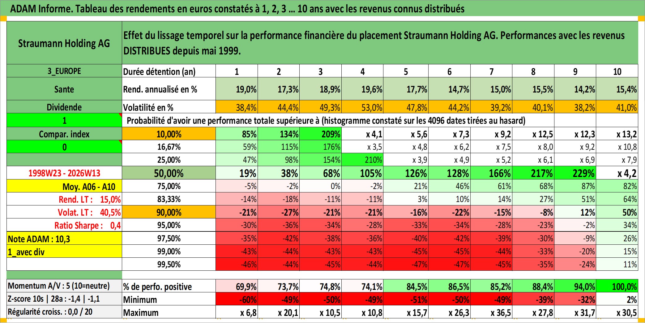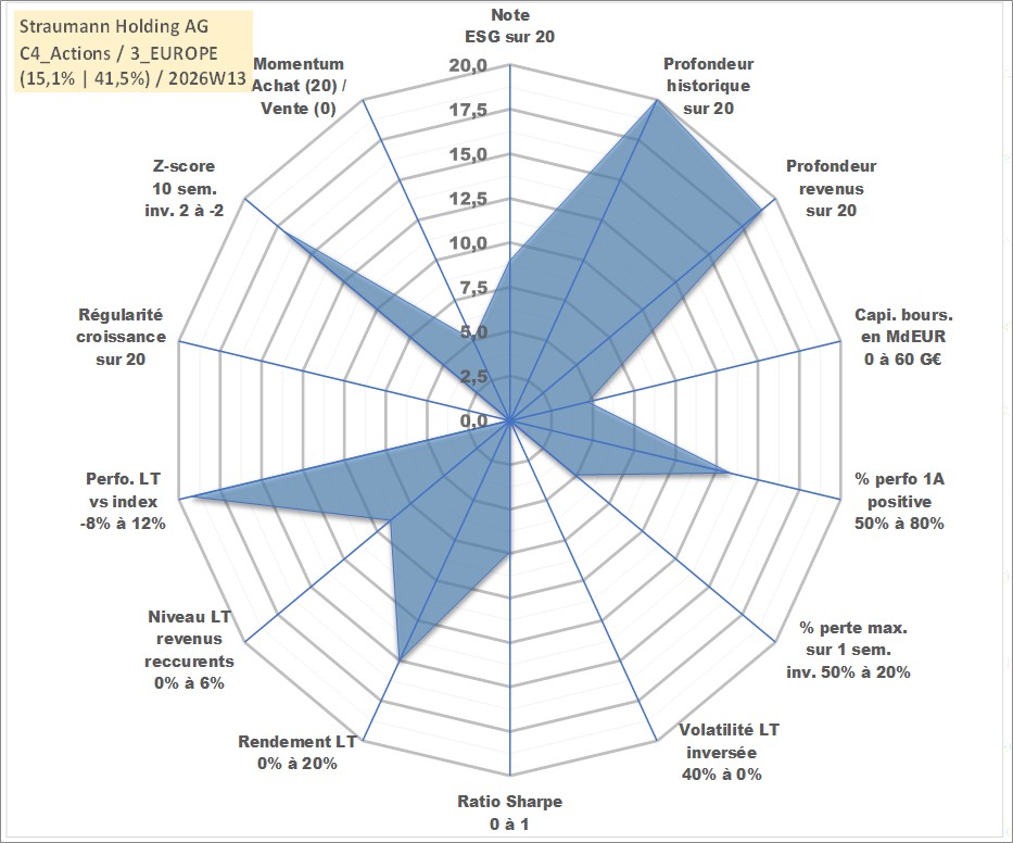 Site dédié aux investisseursPage dédiée sur site financeAnalyse des valorisations hebdomadaires de l'action Straumann Holding AG. Cet actif est cote en CHF. Les valorisations sont en contrevaleur EURO et couvrent les semaines 1998W23 a 2026W13. Les revenus de cet actif financier sont pris en compte depuis la semaine 1999W21. La note globale ESG de cet actif est estimee a 9.0 (apres rebasage entre 0 et 20).