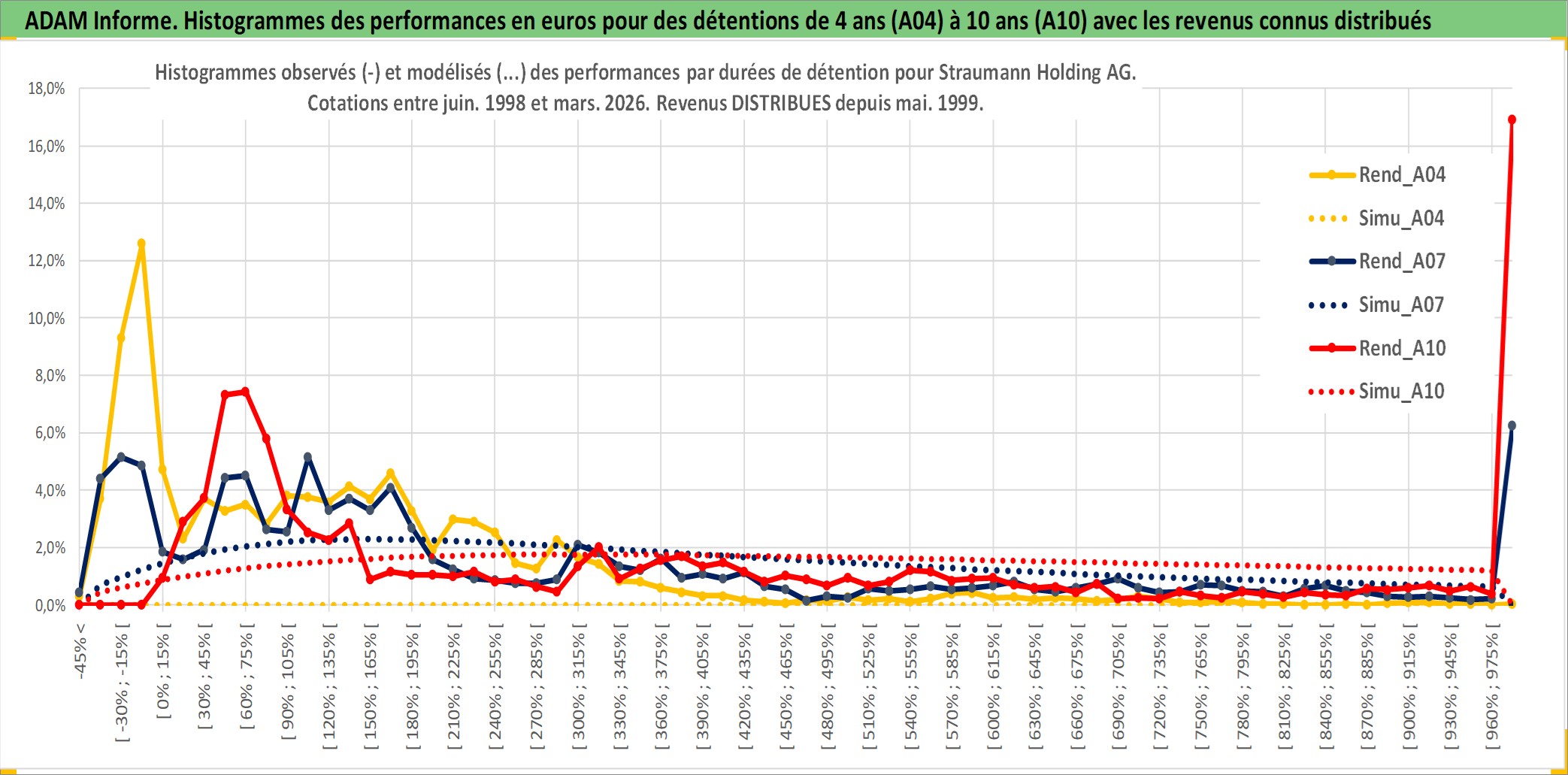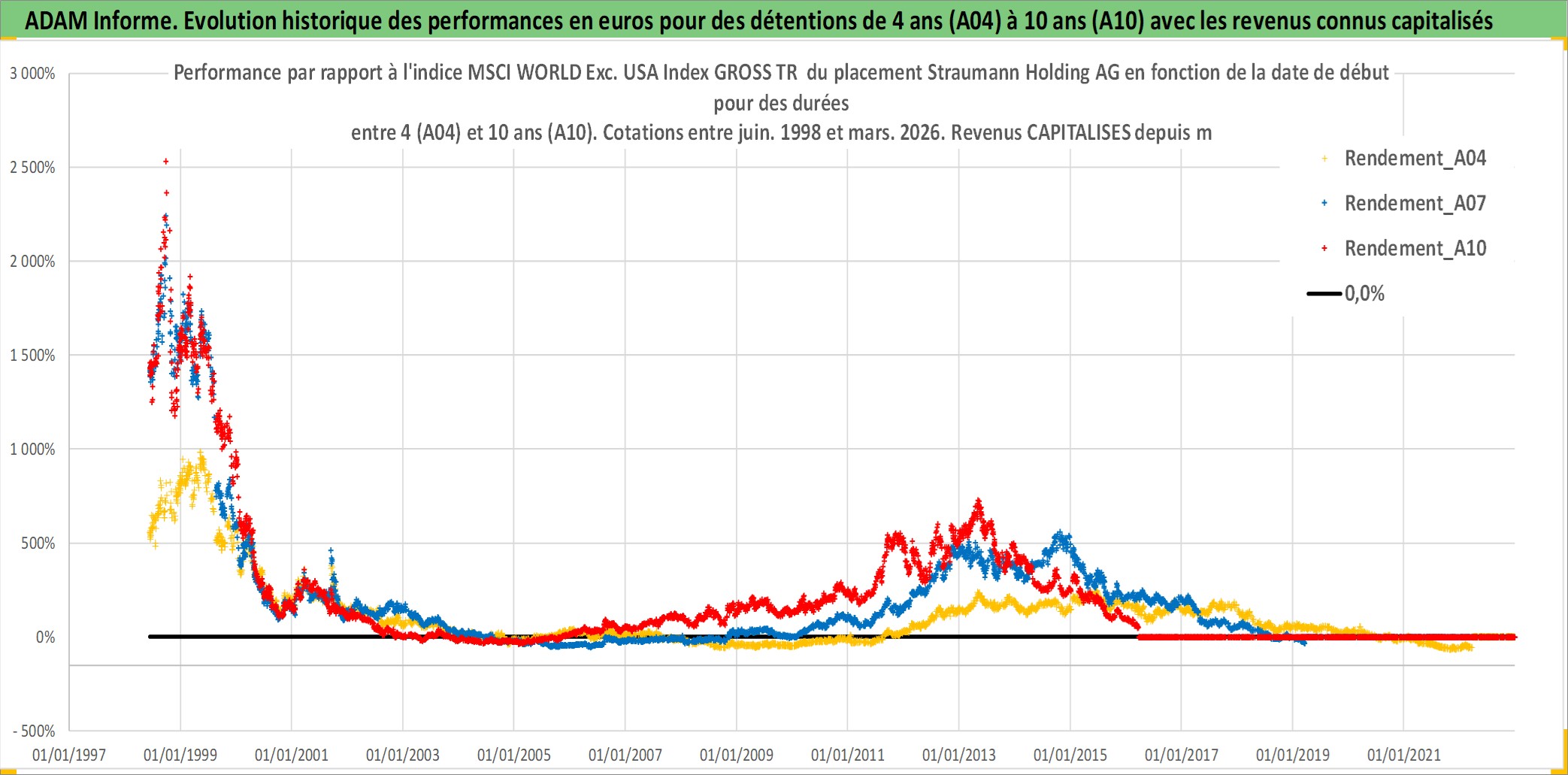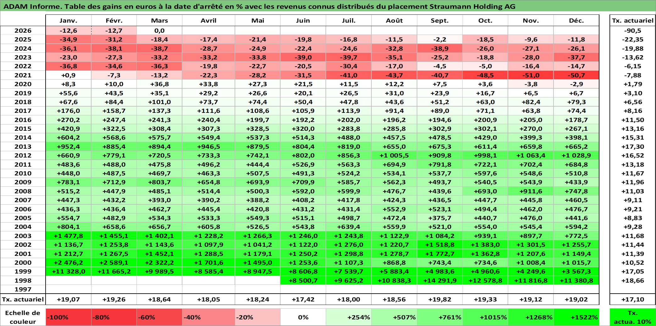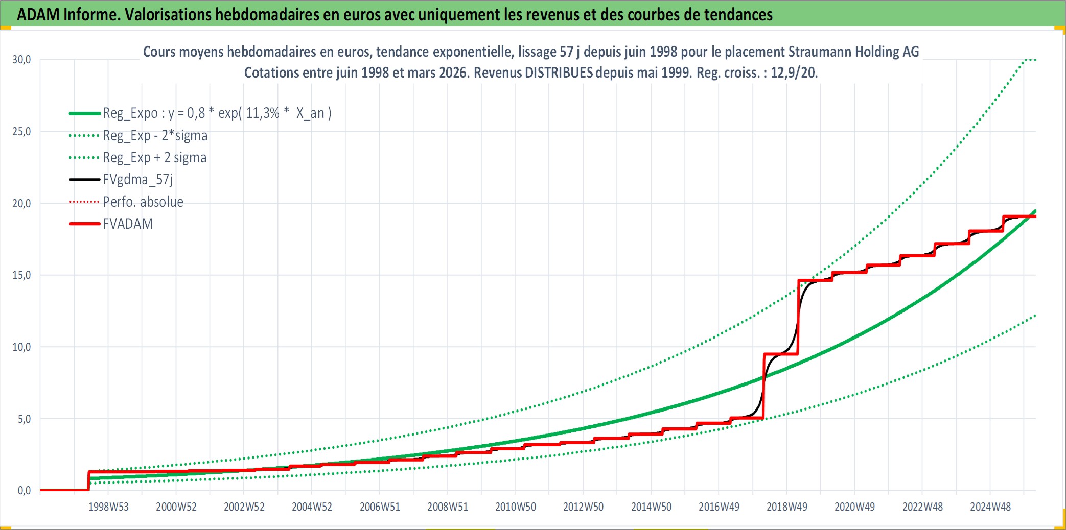 Site dédié aux investisseursPage dédiée sur site financeAnalyse des valorisations hebdomadaires de l'action Straumann Holding AG. Cet actif est cote en CHF. Les valorisations sont en contrevaleur EURO et couvrent les semaines 1998W23 a 2026W13. Les revenus de cet actif financier sont pris en compte depuis la semaine 1999W21. La note globale ESG de cet actif est estimee a 9.0 (apres rebasage entre 0 et 20).